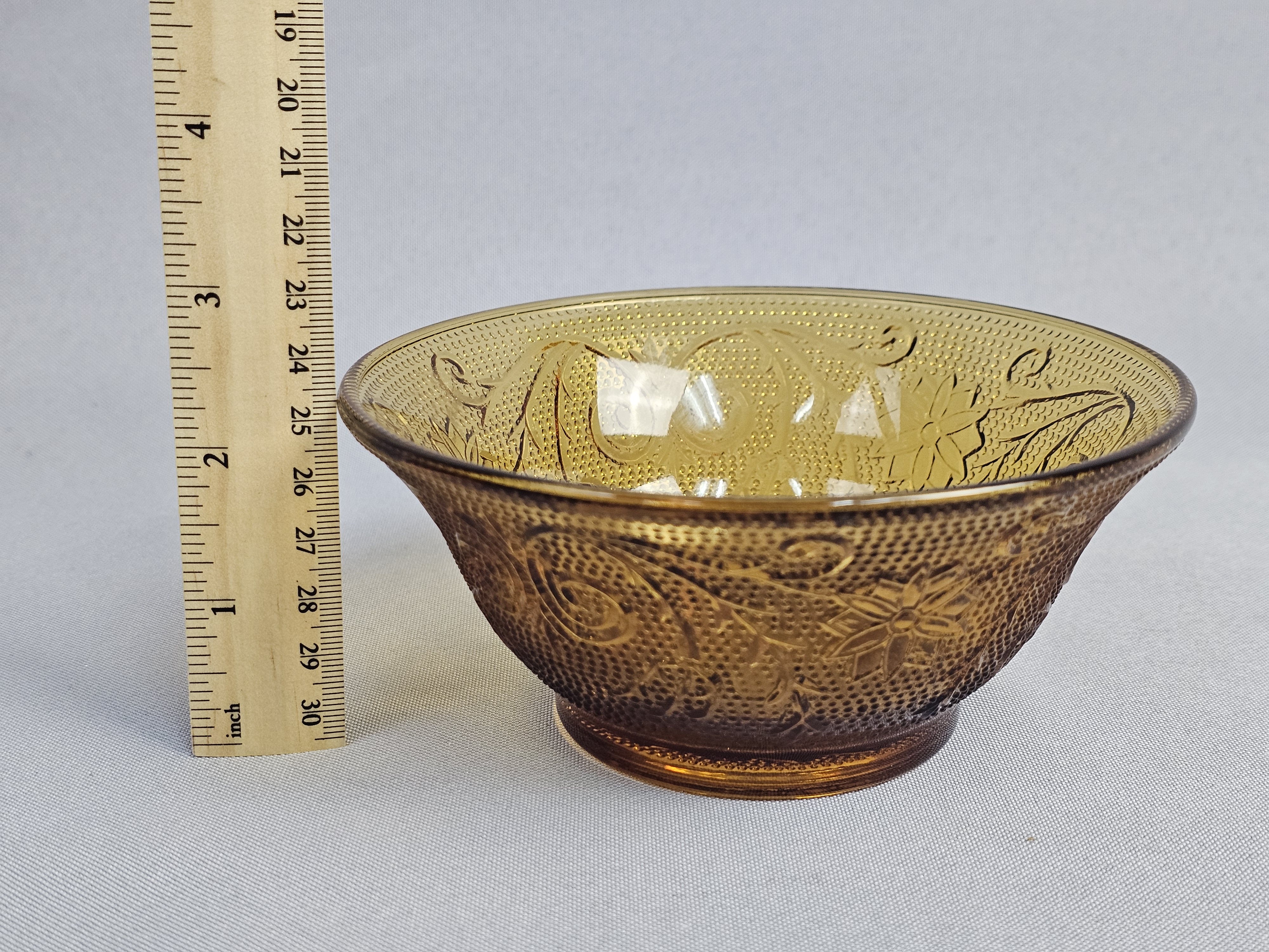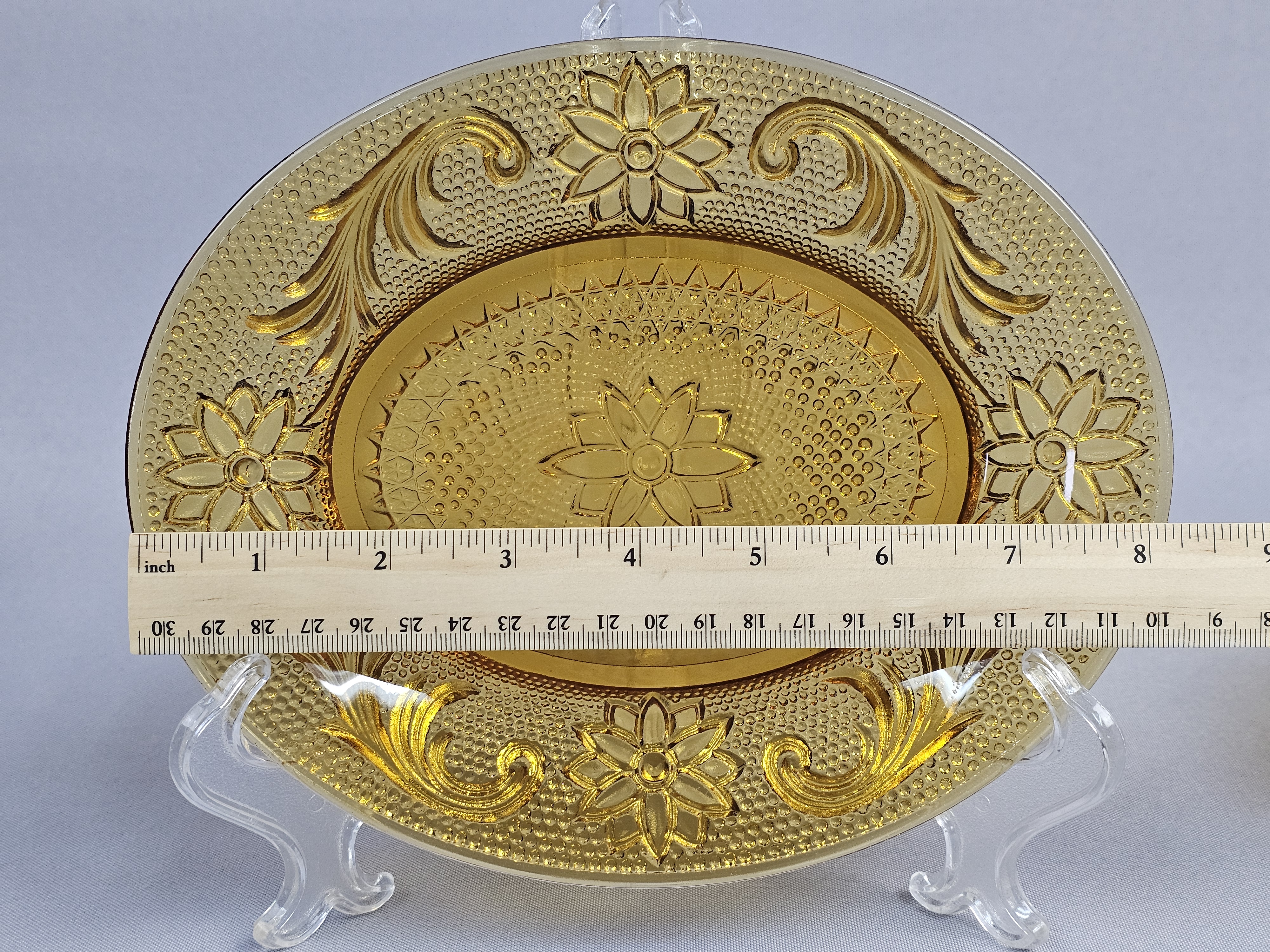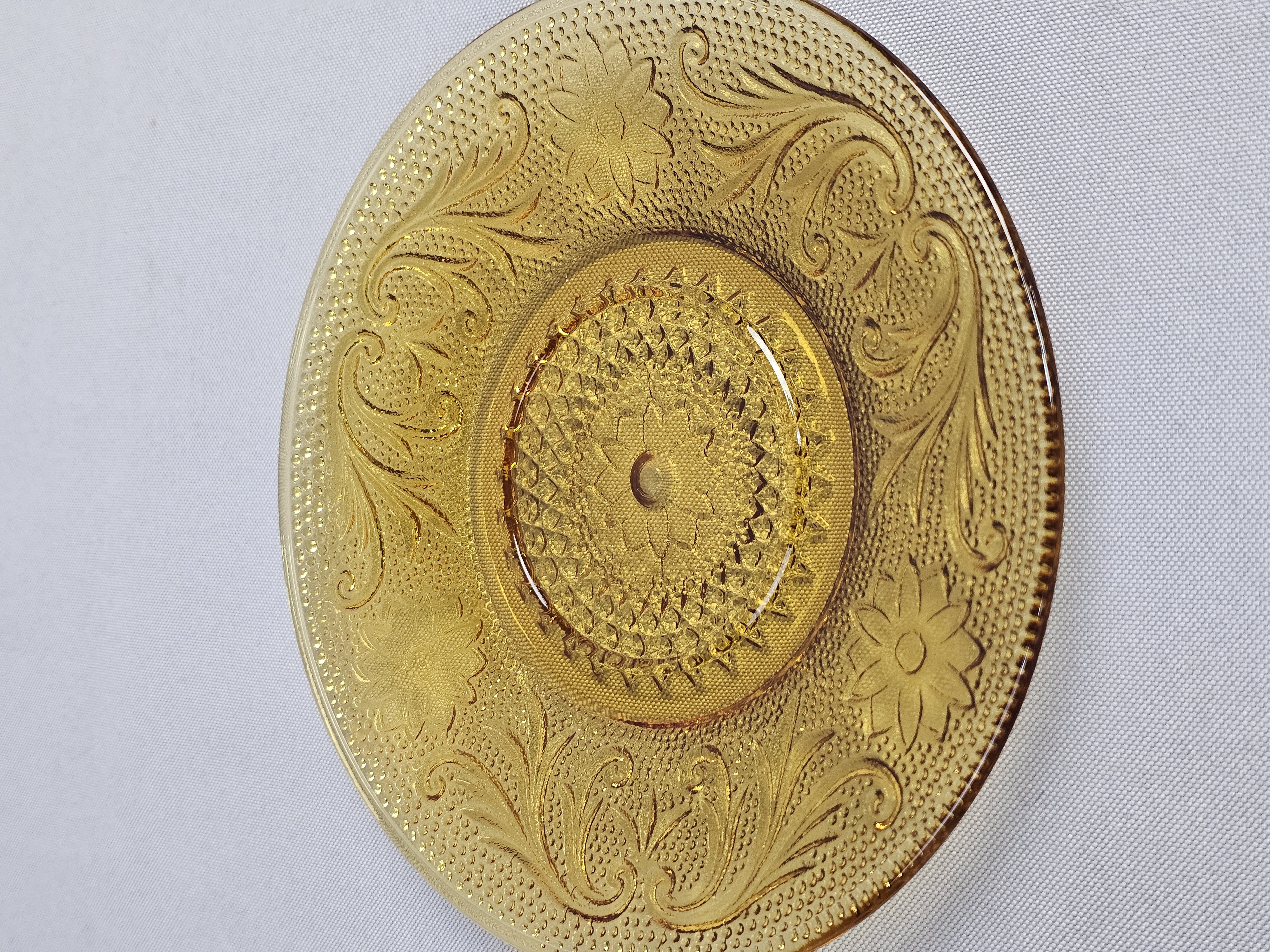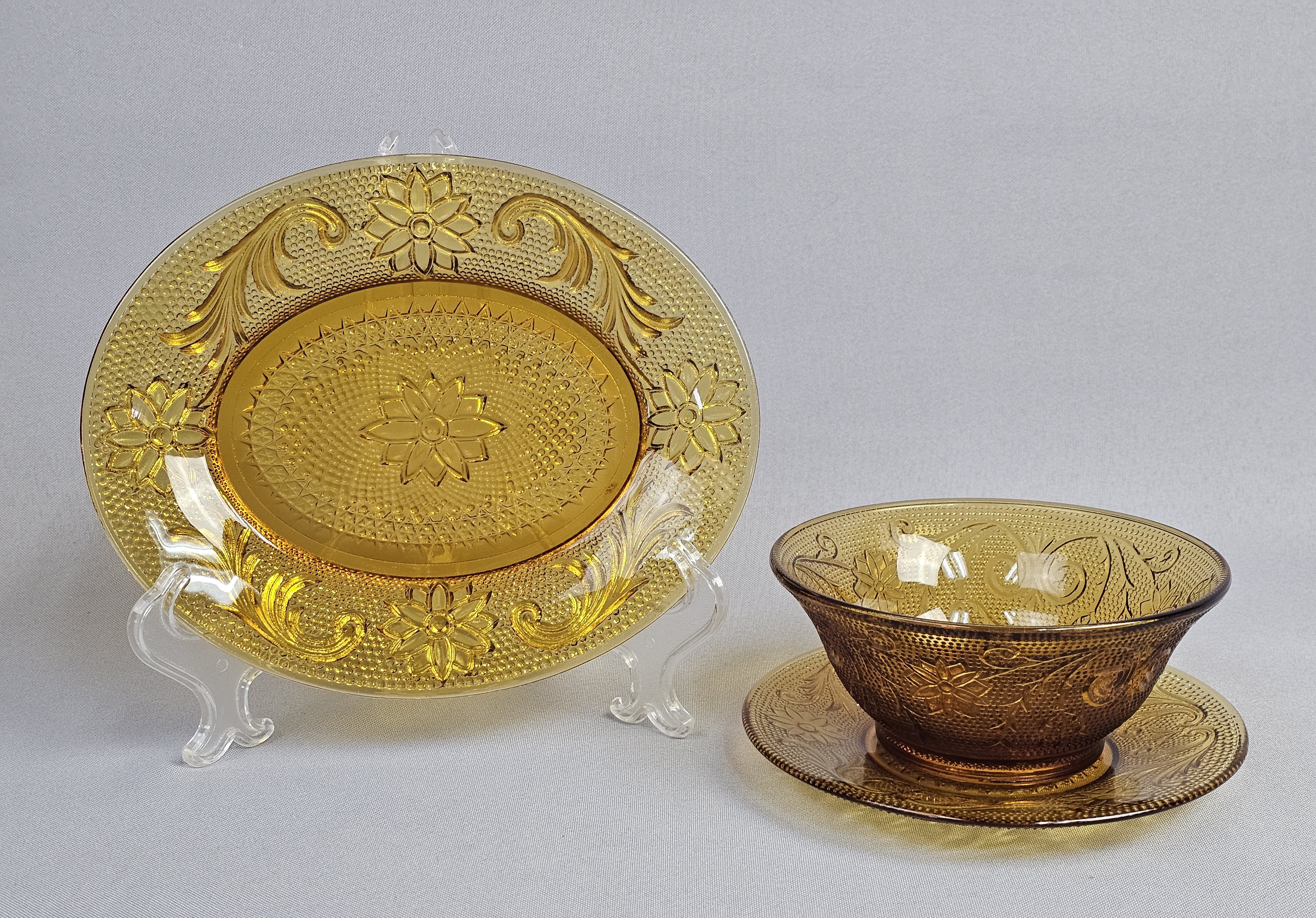This collection consists of three pieces of amber-colored pressed glass in the Sandwich pattern, produced by the Indiana Glass Company for Tiara Exclusives. The set includes an oval serving platter, a small round plate, and a small bowl. Oval platter: 8 inches in length Round plate: 6 inches in diameter Bowl: 2.25 inches tall The items are in excellent vintage condition. No chips, cracks, or significant surface abrasions are visible upon inspection.
