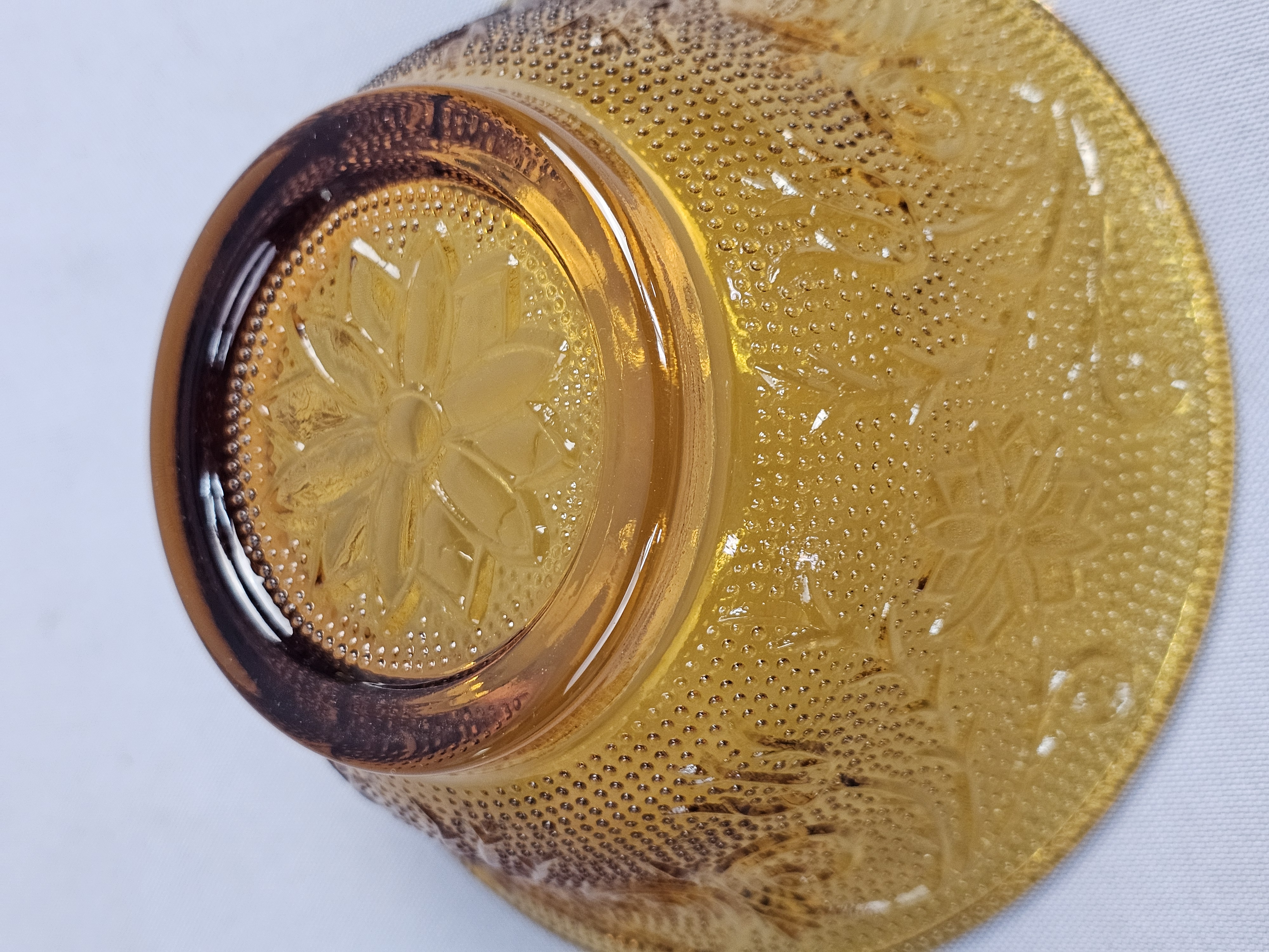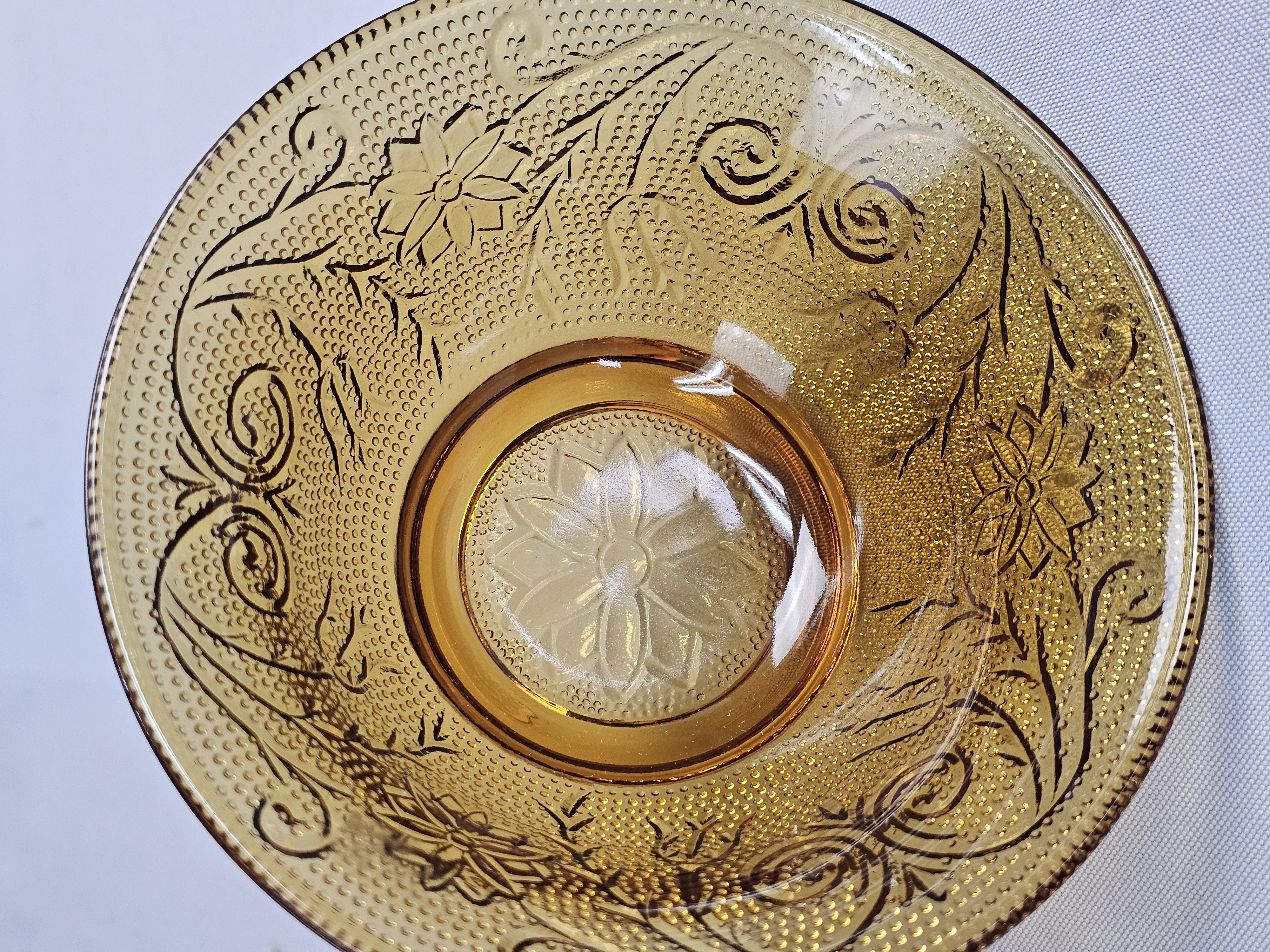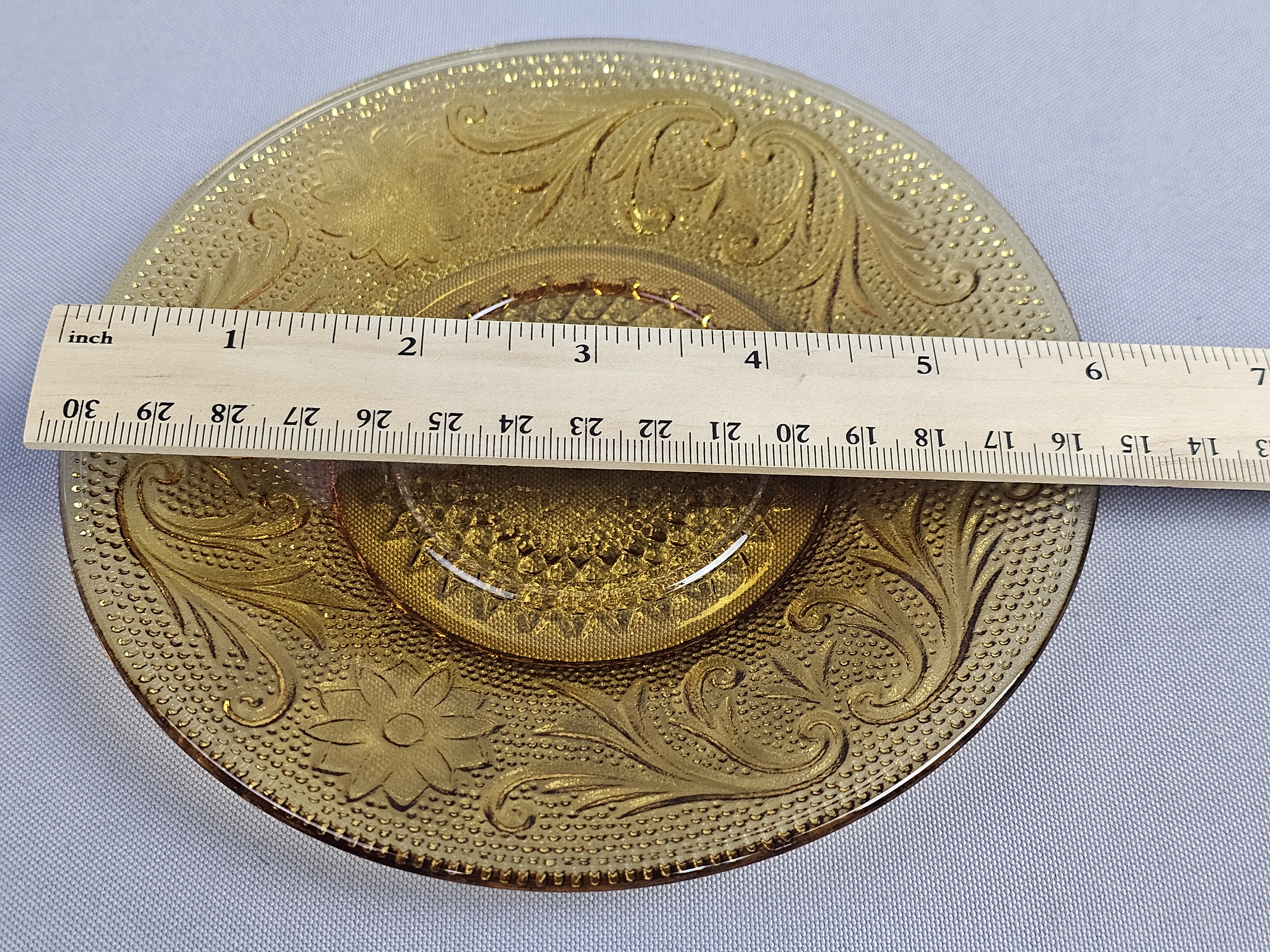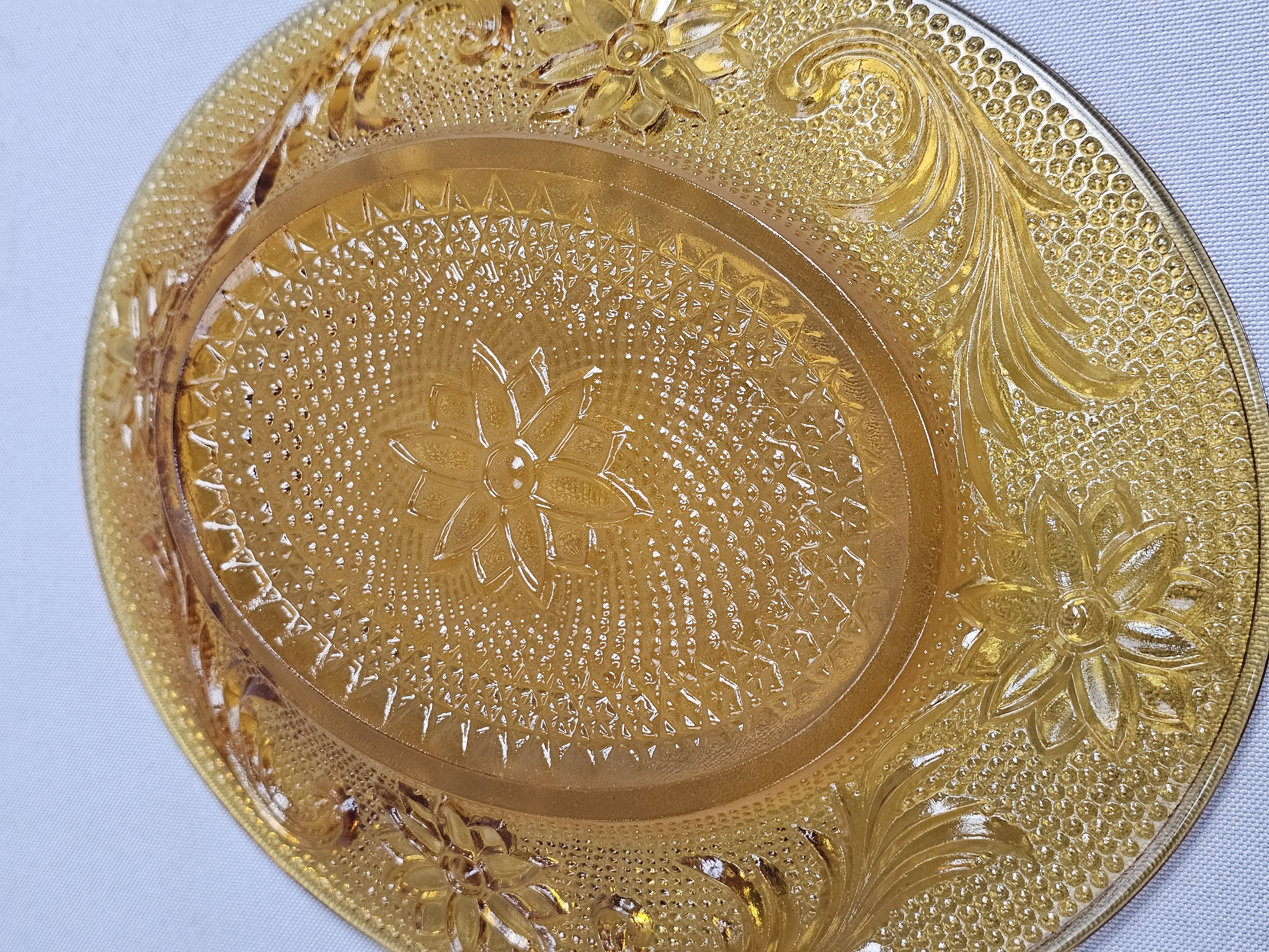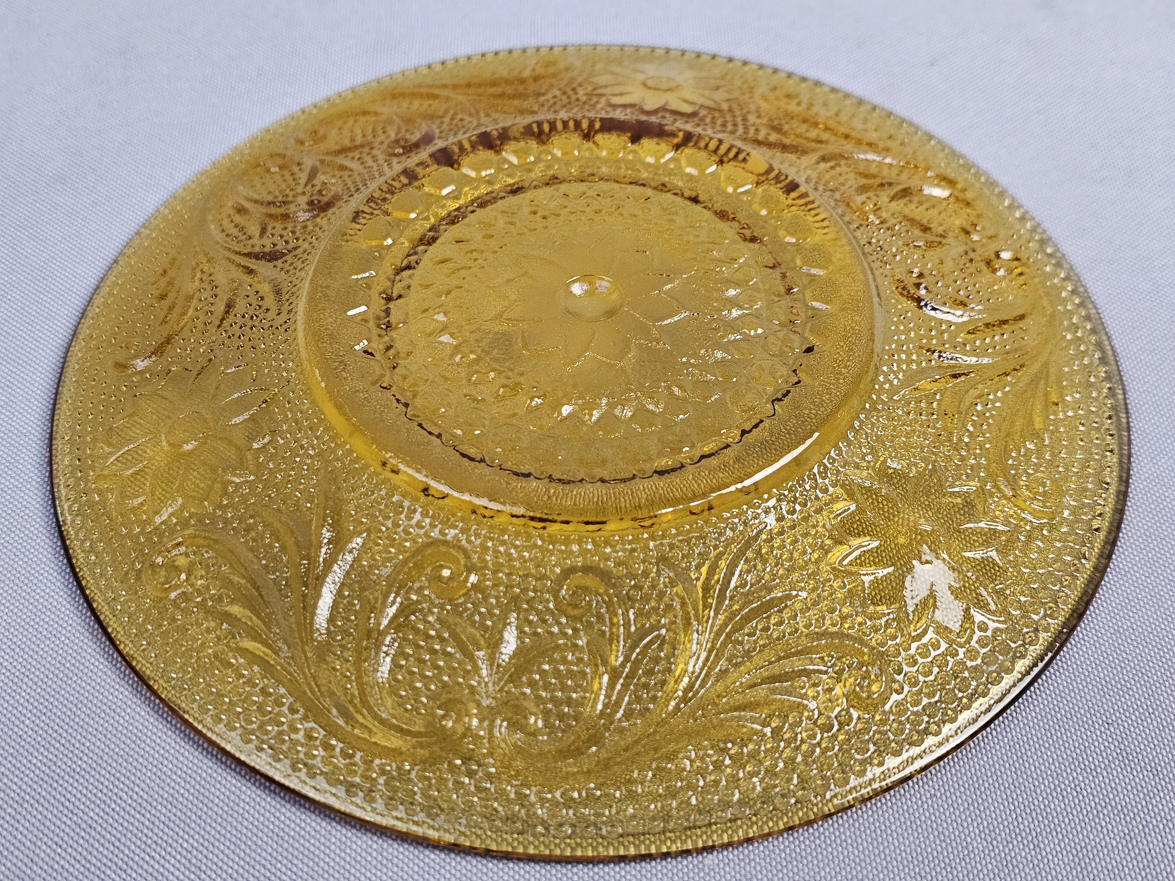 This collection consists of three pieces of amber-colored pressed glass in the Sandwich pattern, produced by the Indiana Glass Company for Tiara Exclusives. The set includes an oval serving platter, a small round plate, and a small bowl. Oval platter: 8 inches in length Round plate: 6 inches in diameter Bowl: 2.25 inches tall The items are in excellent vintage condition. No chips, cracks, or significant surface abrasions are visible upon inspection.