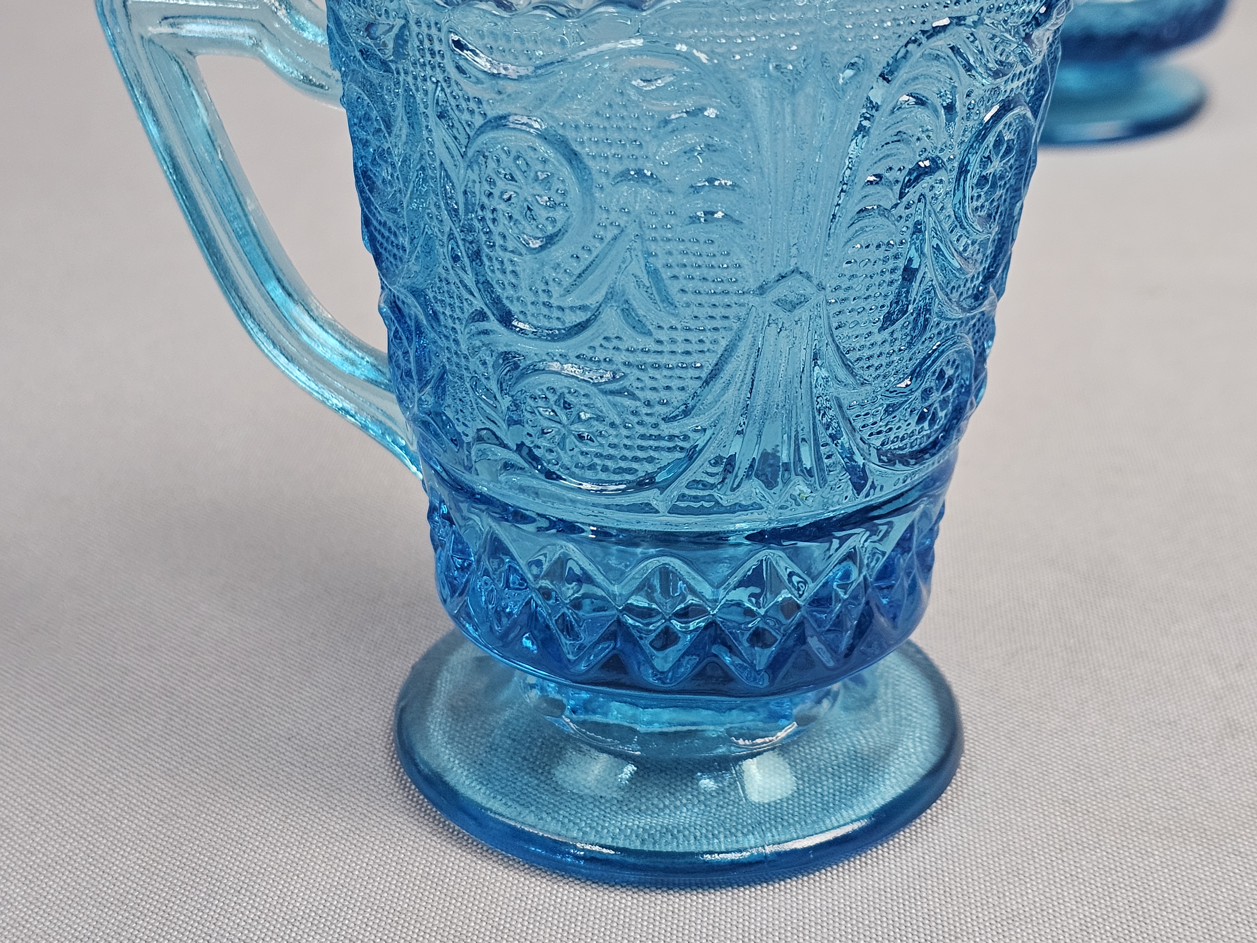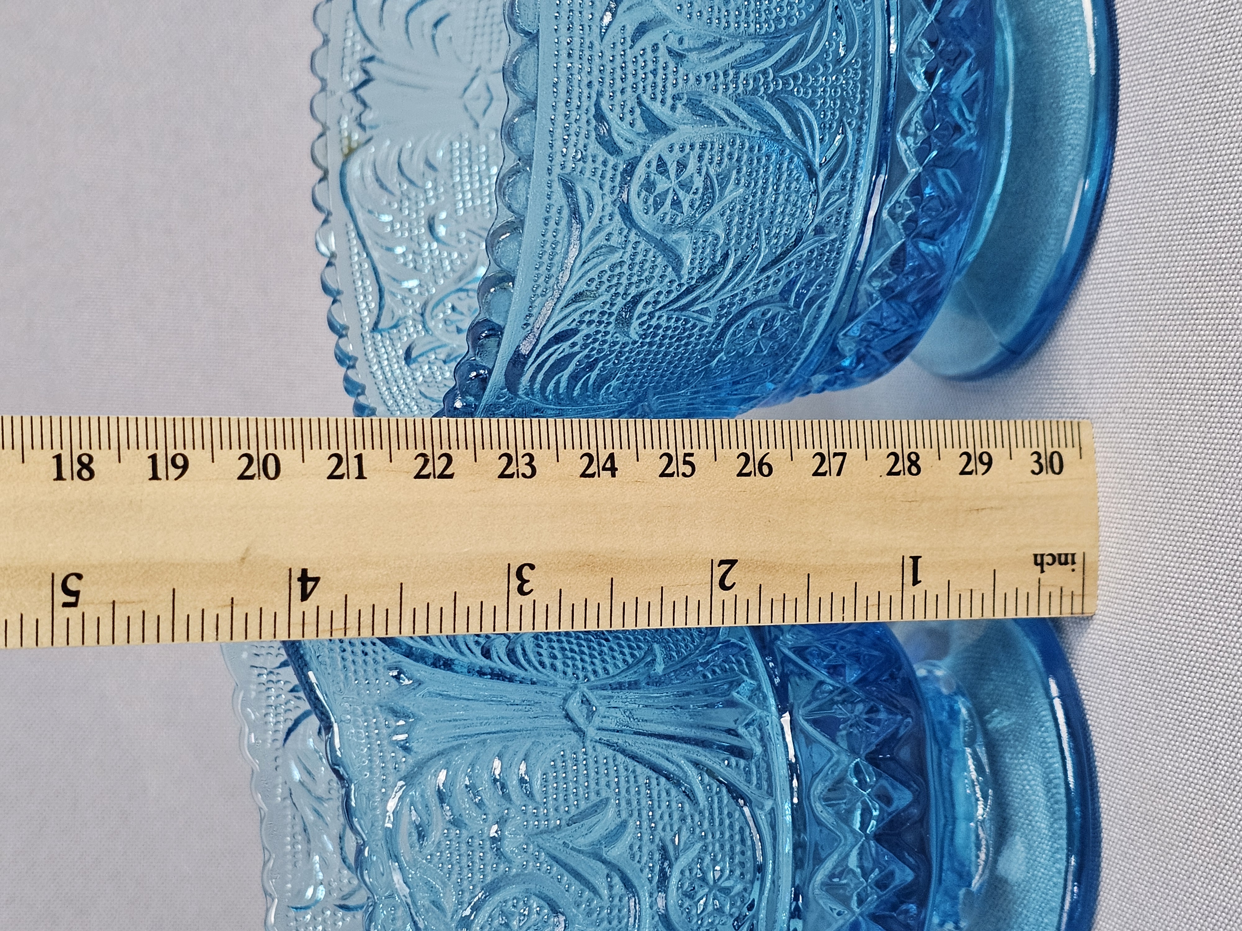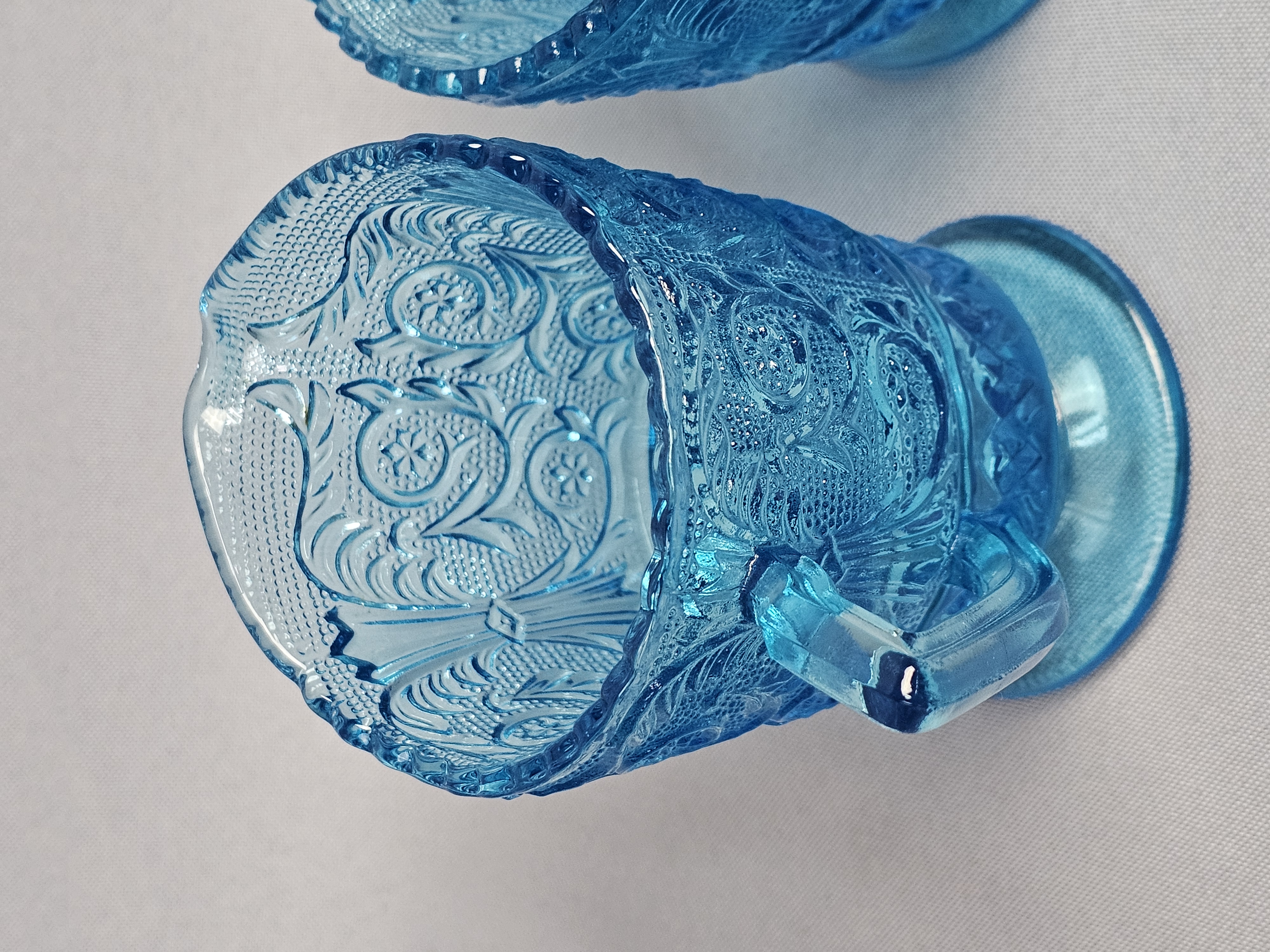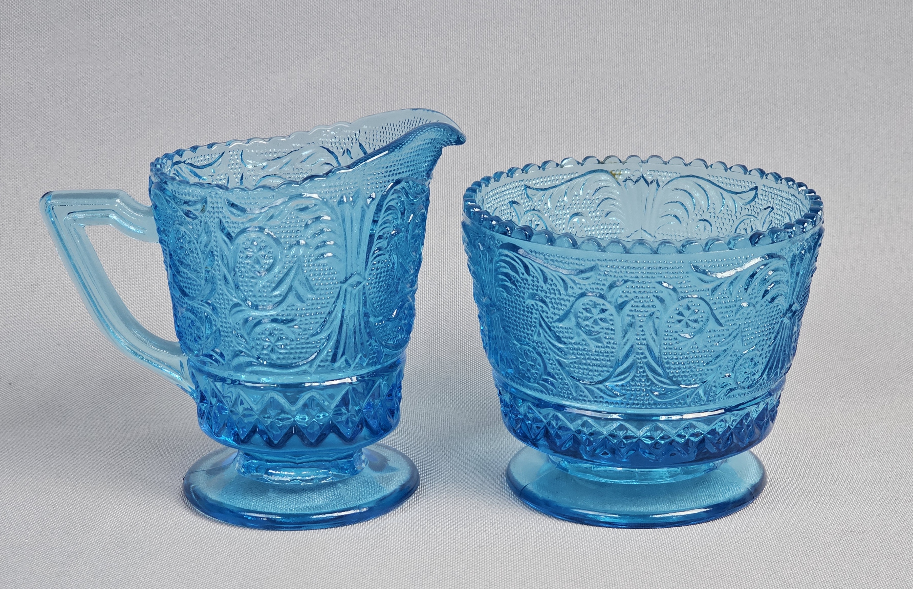 A two-piece set comprising a creamer and an open sugar bowl crafted from translucent blue pressed glass. Creamer: 4 inches tall Sugar Bowl: 3.5 inches tall The items are in excellent vintage condition. No chips, cracks, or restorations are visible.