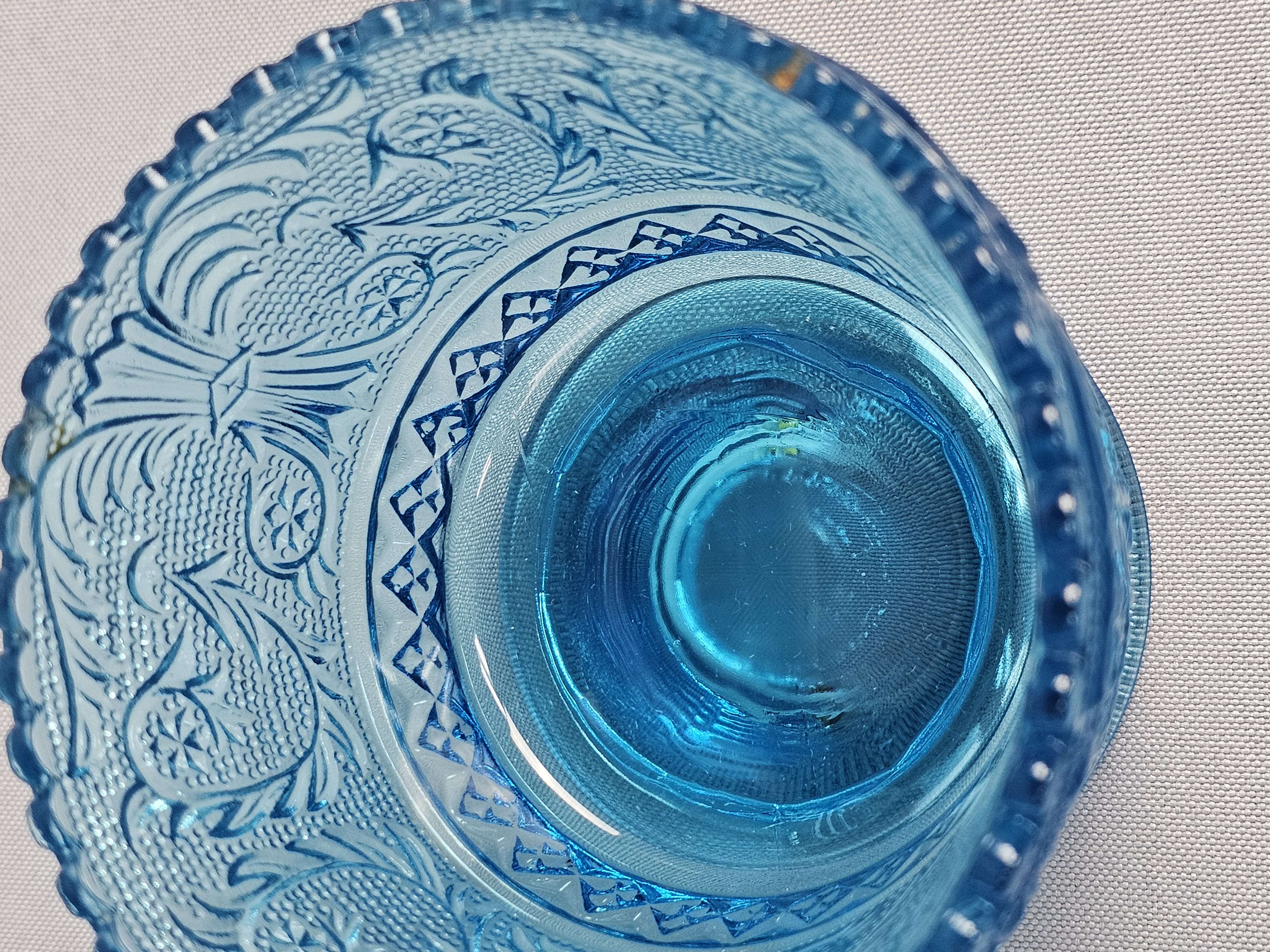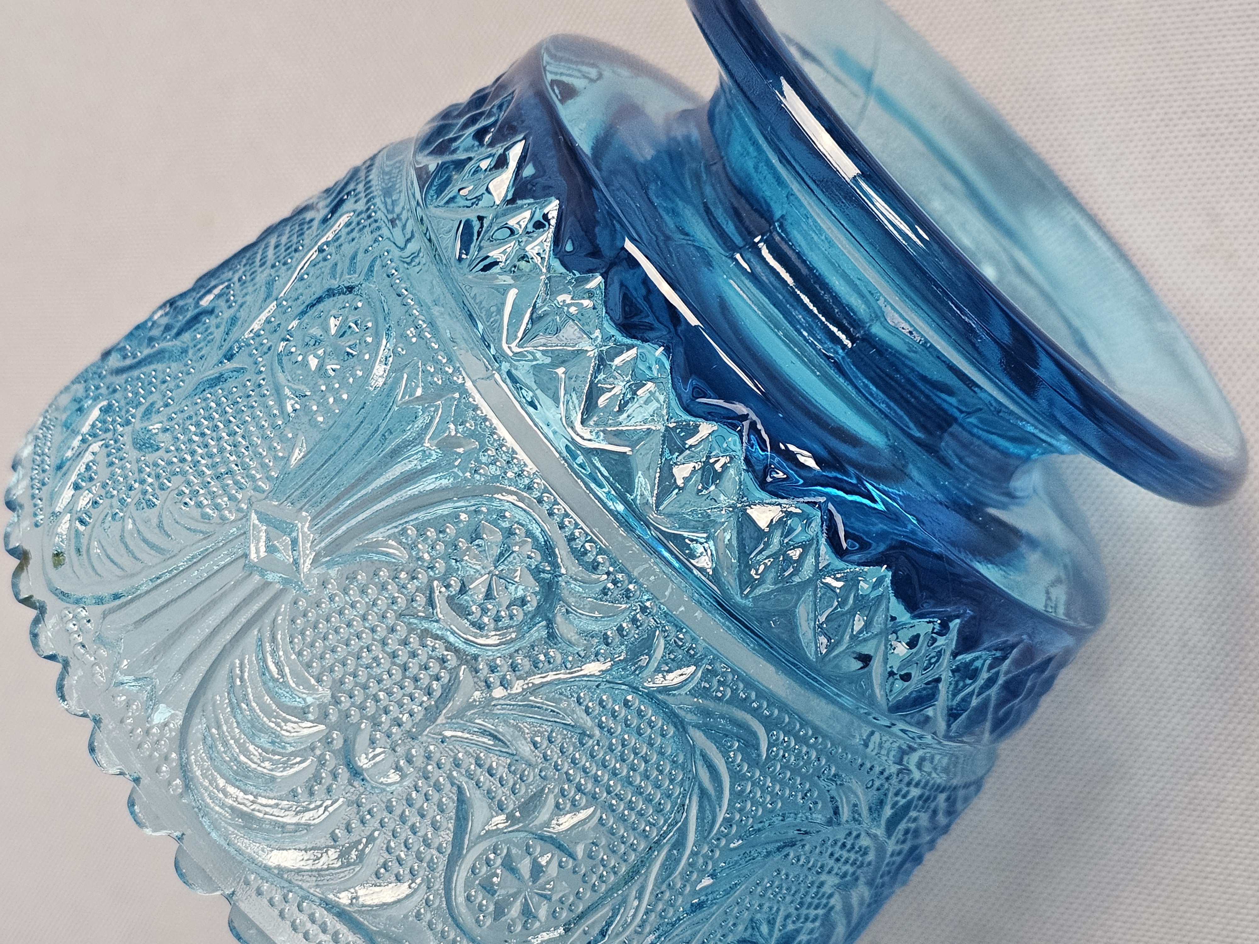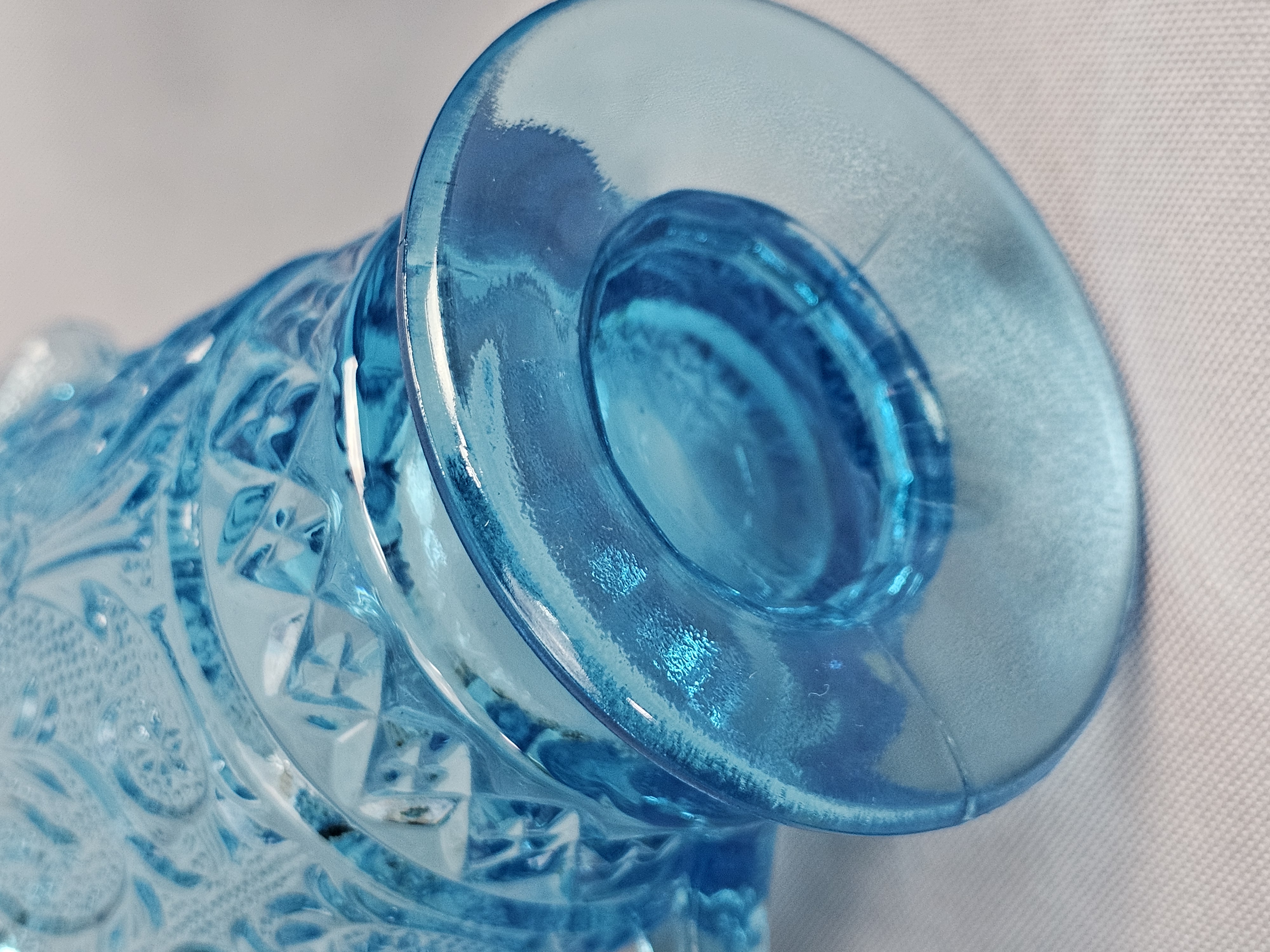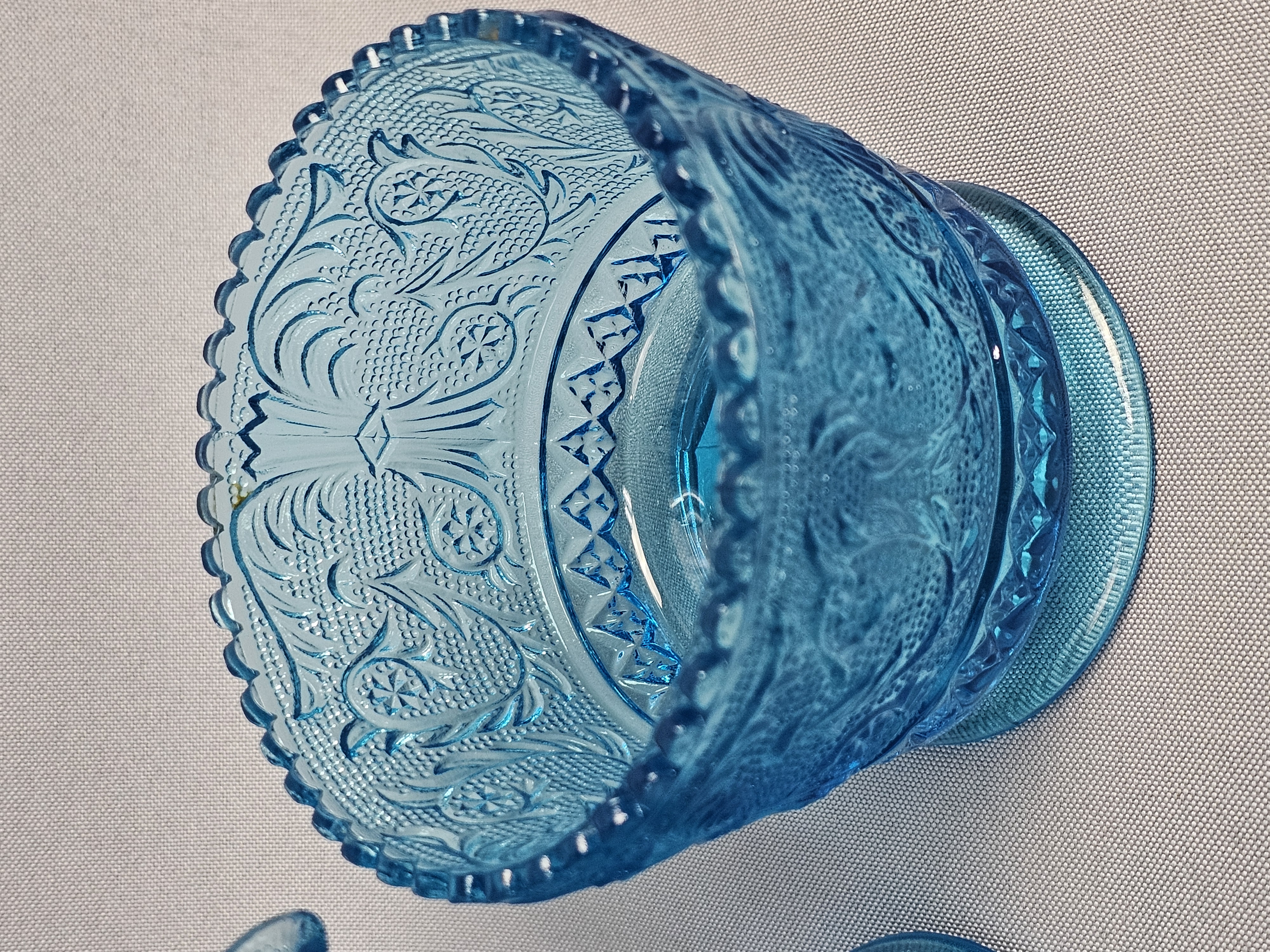 A two-piece set comprising a creamer and an open sugar bowl crafted from translucent blue pressed glass. Creamer: 4 inches tall Sugar Bowl: 3.5 inches tall The items are in excellent vintage condition. No chips, cracks, or restorations are visible.