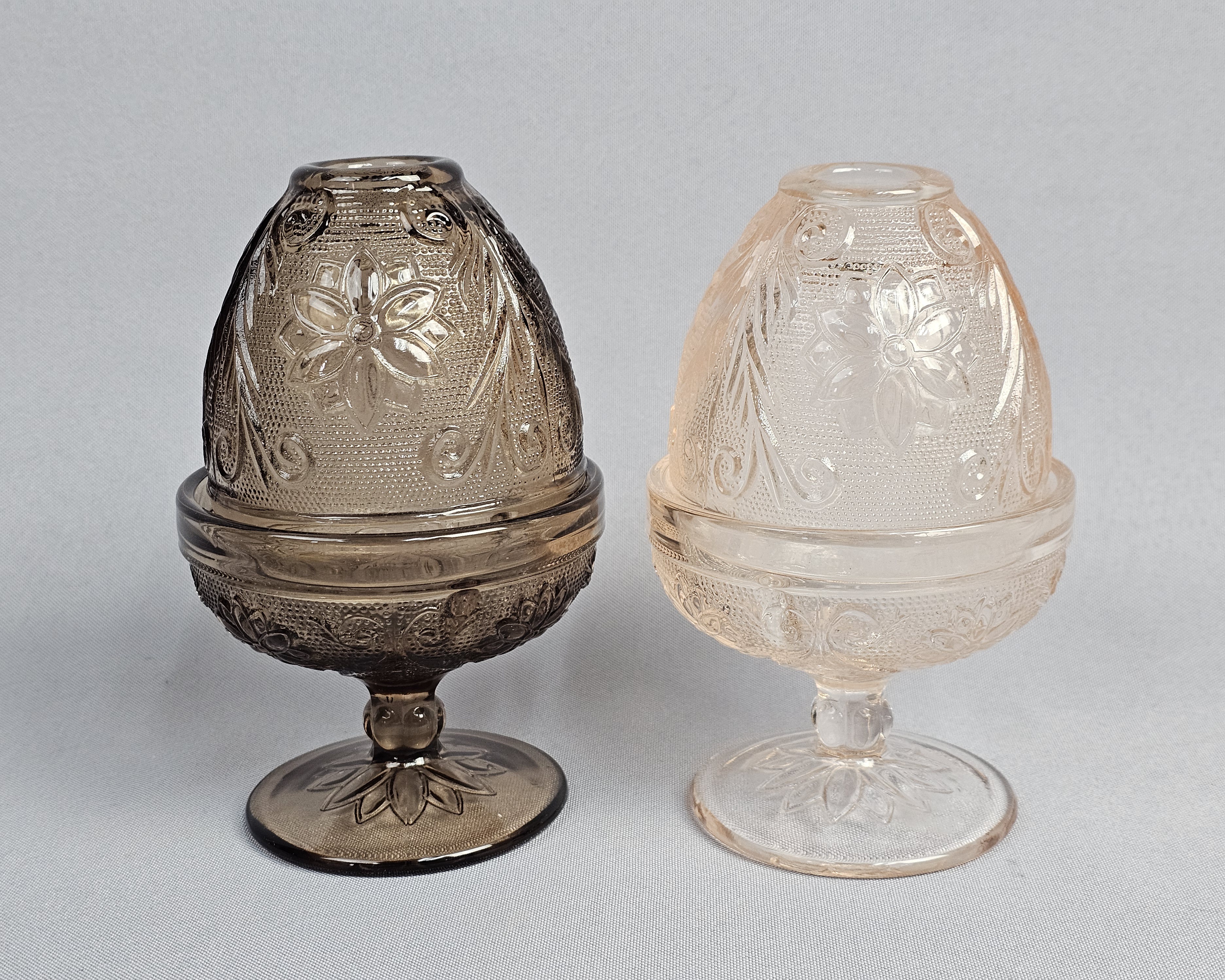 A pair of two-piece pressed glass fairy lamps in the Sandwich pattern, produced by Indiana Glass for Tiara Exclusives. The set includes one smoky topaz brown lamp and one pale rosaline pink lamp. Each lamp comprises a domed shade with a circular top opening and a matching pedestal base. Height: 6 inches. Overall good condition. The darker one has a chip on the bottom of the base near edge.