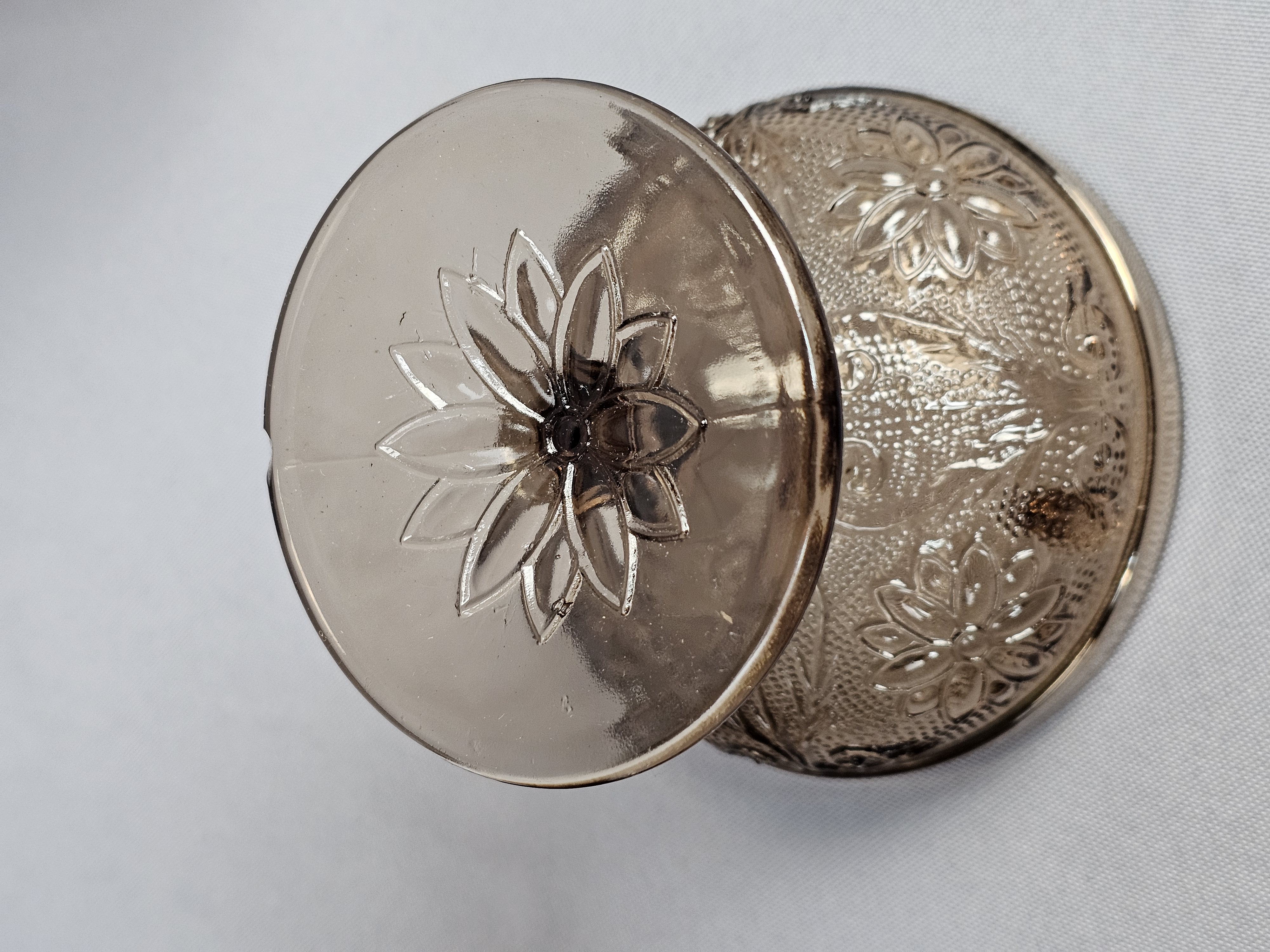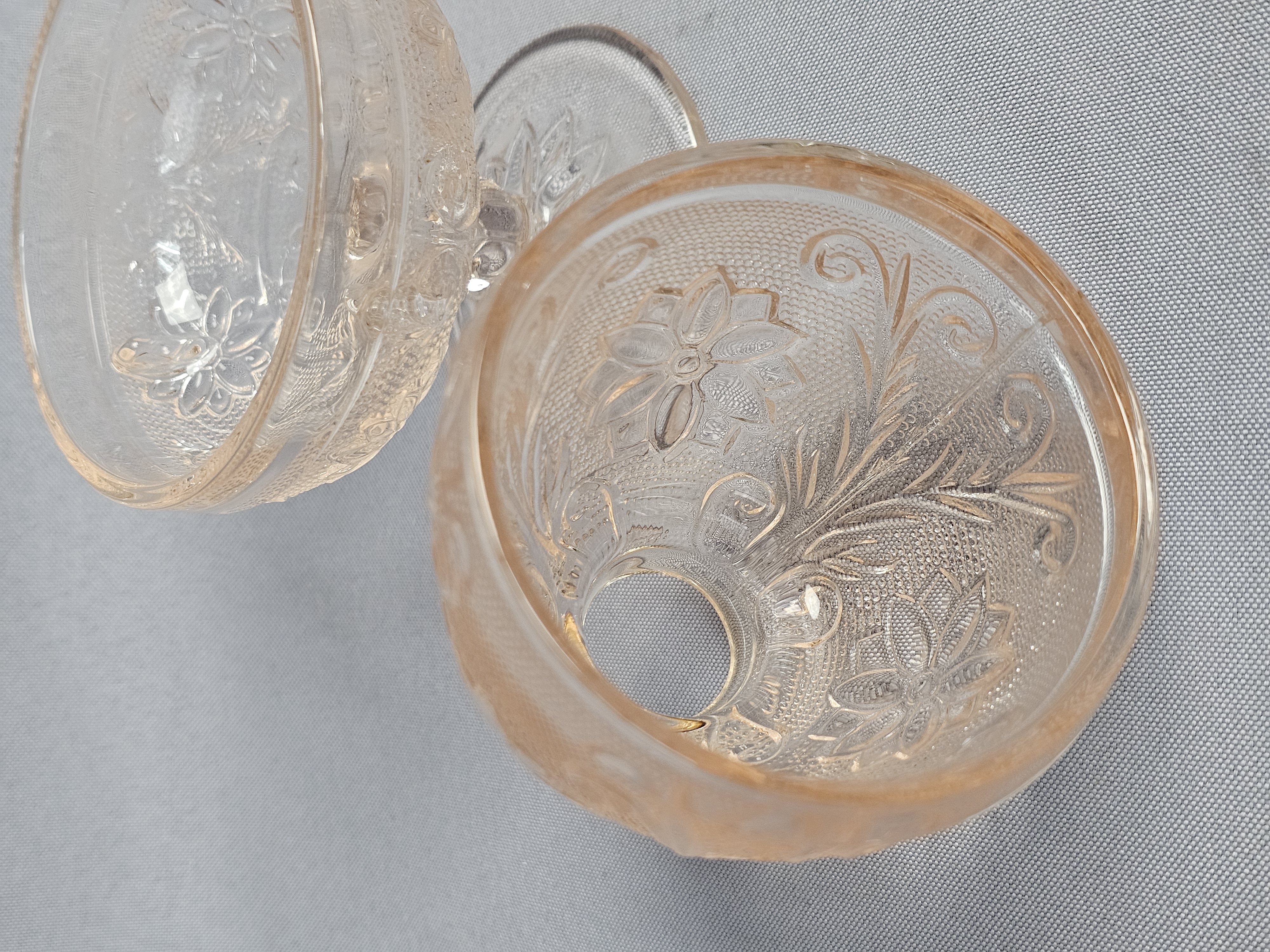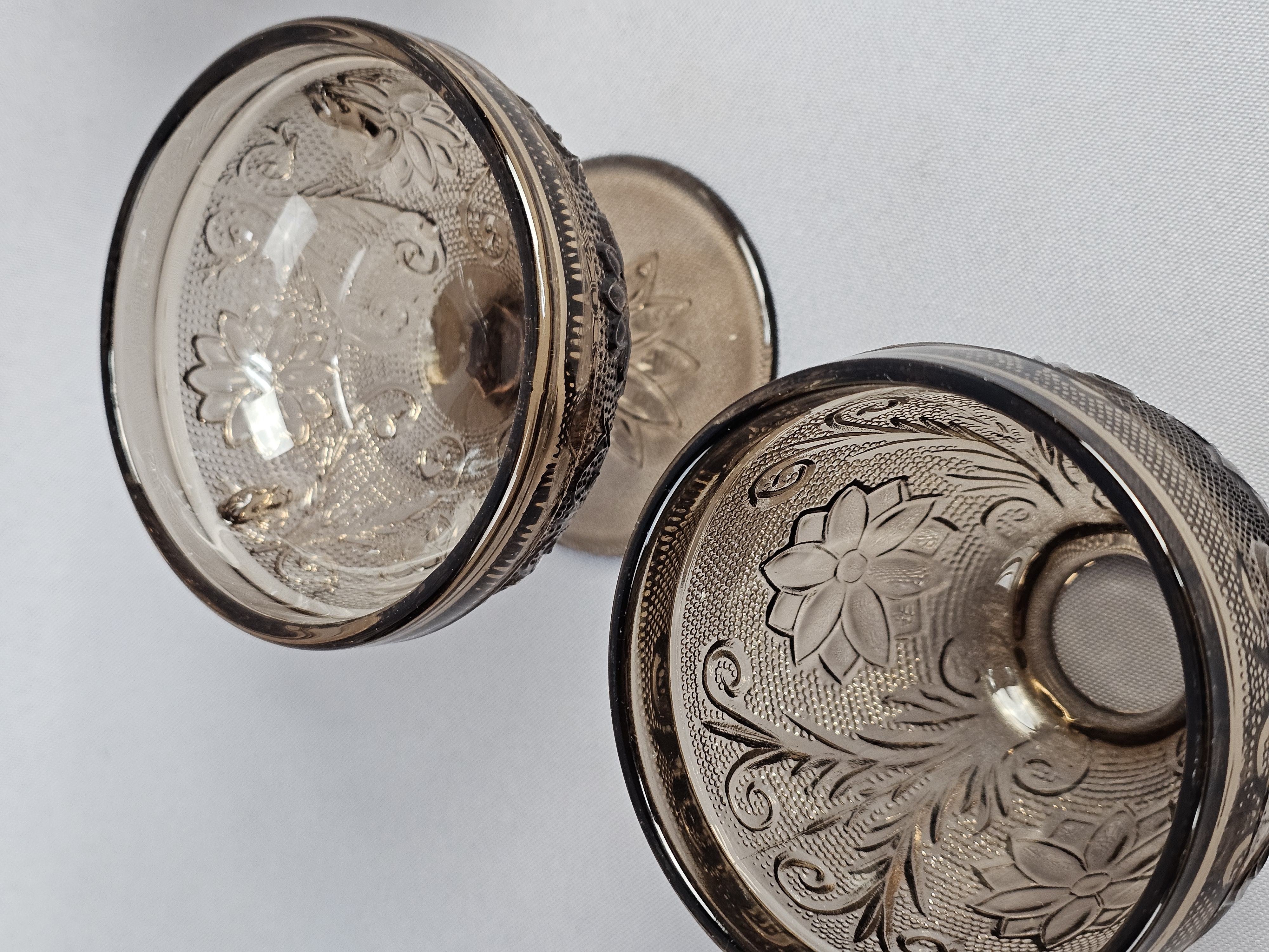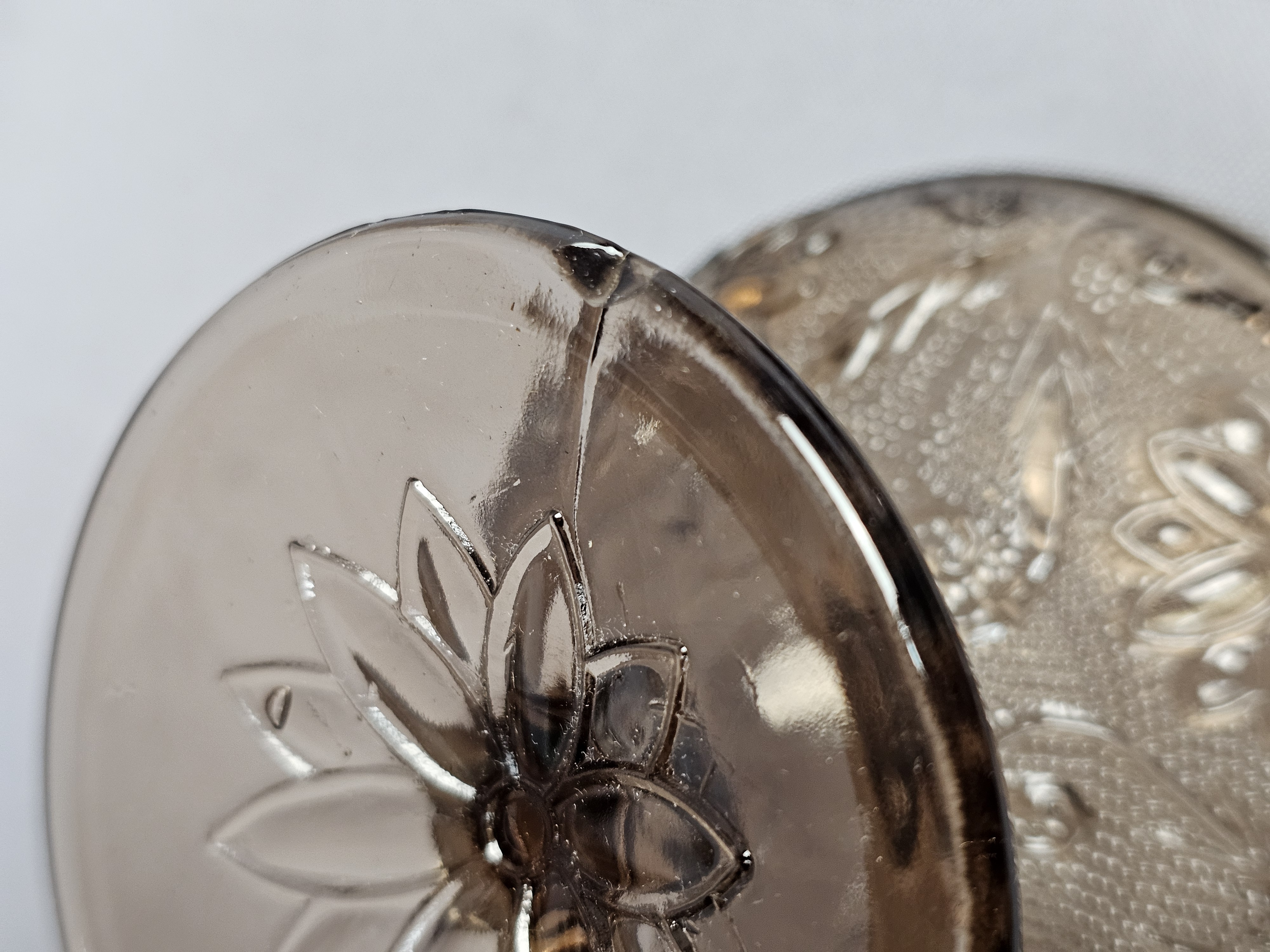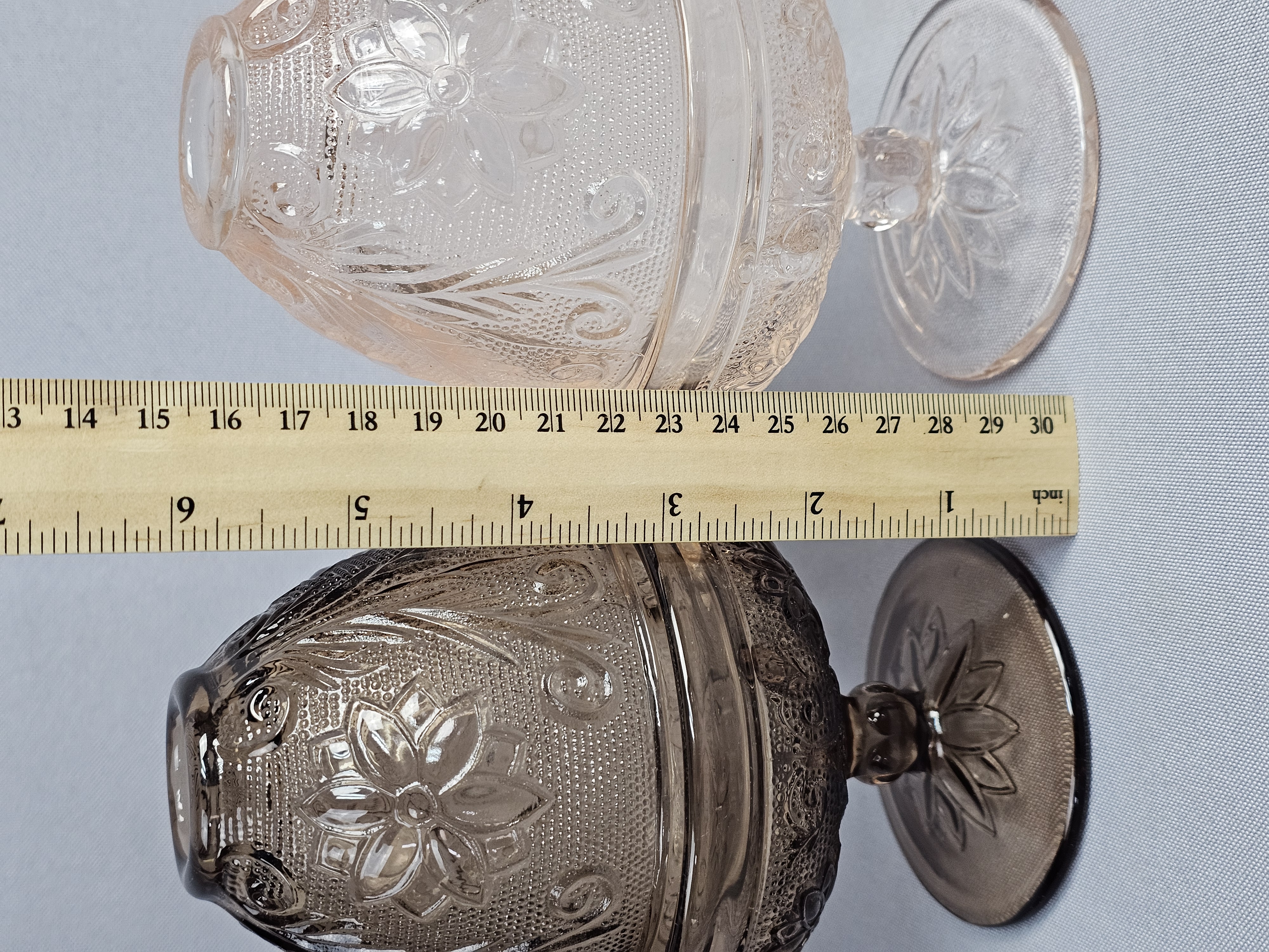Overall good condition. The darker one has a chip on the bottom of the base near edge.