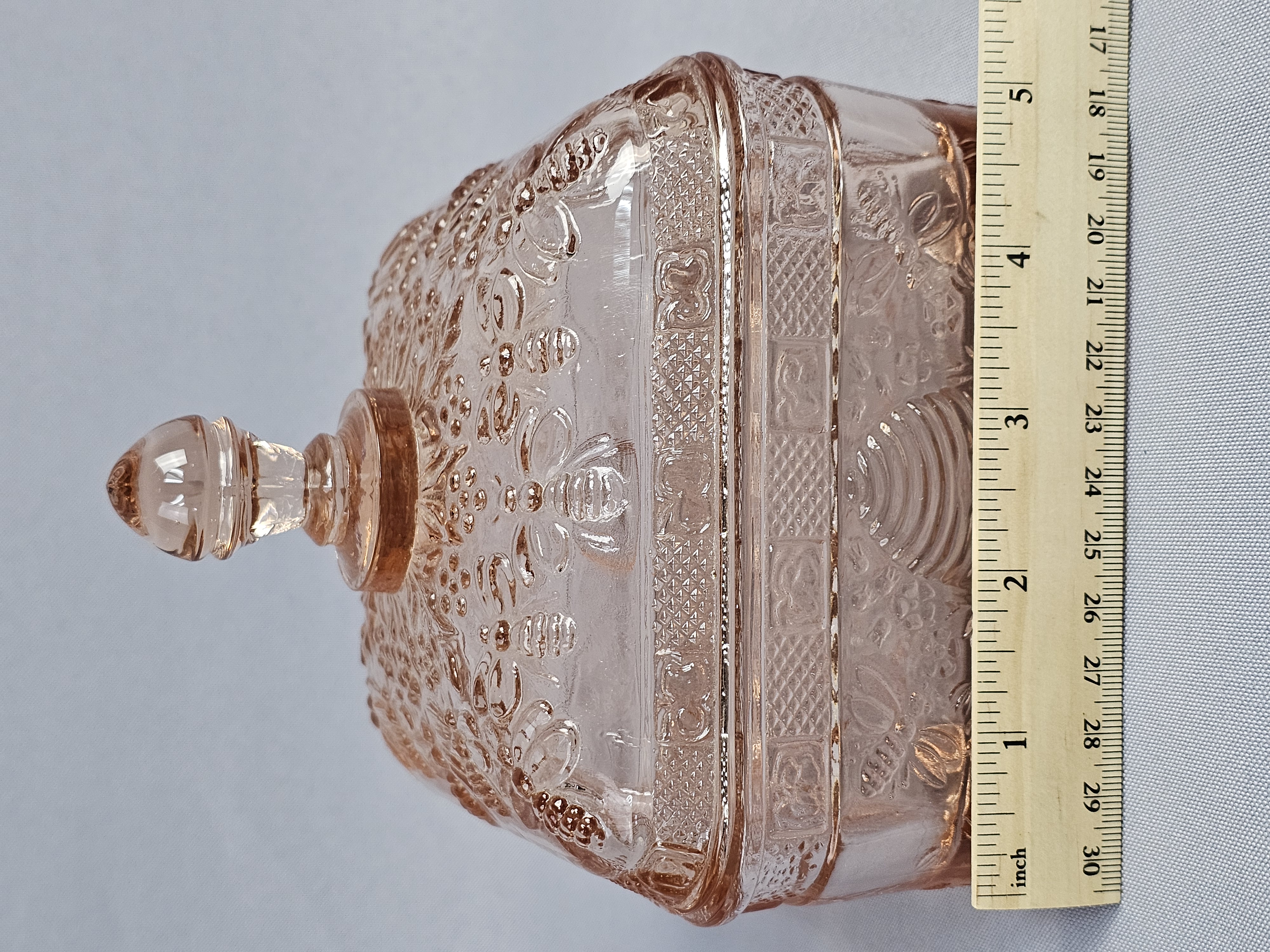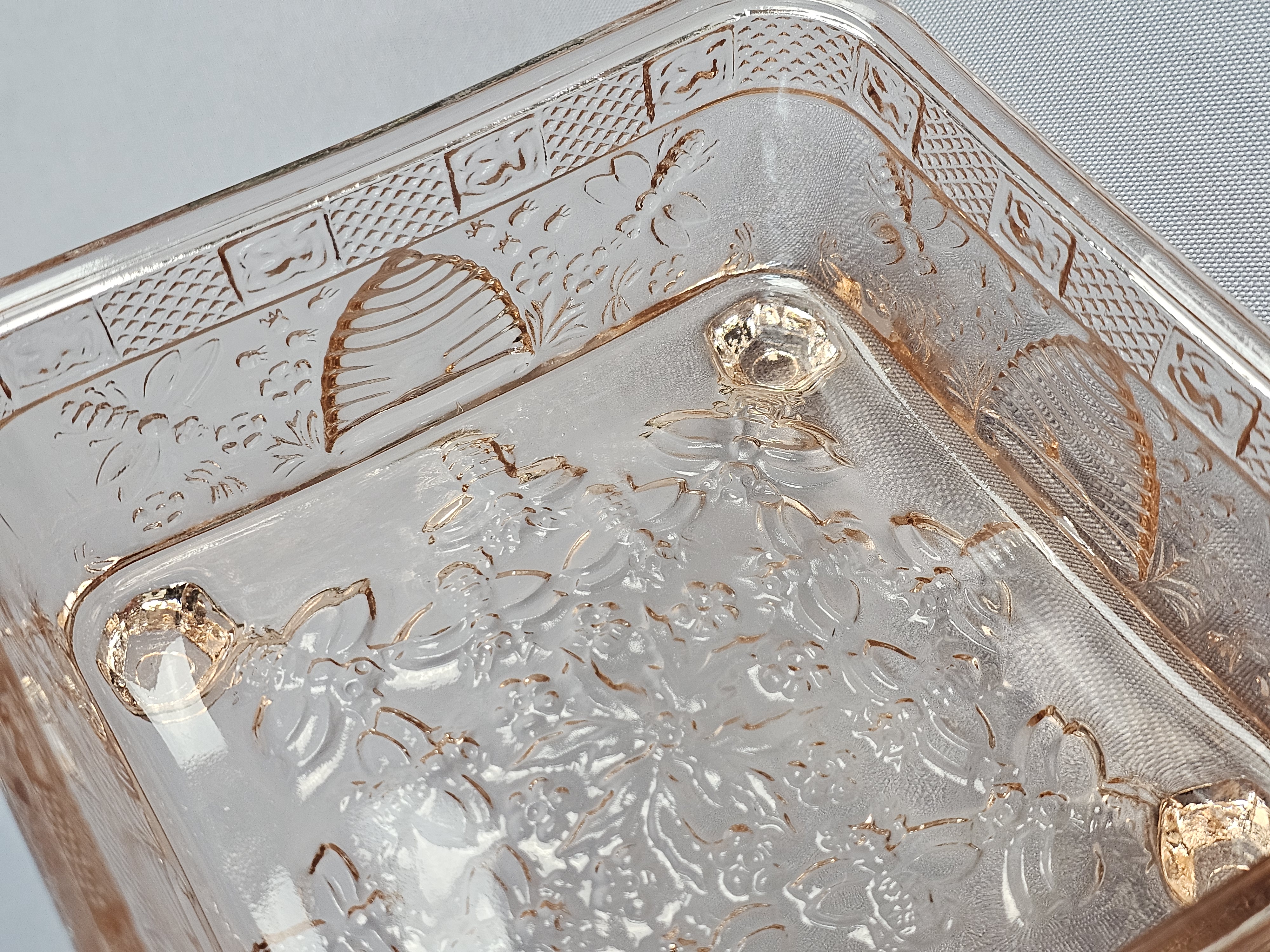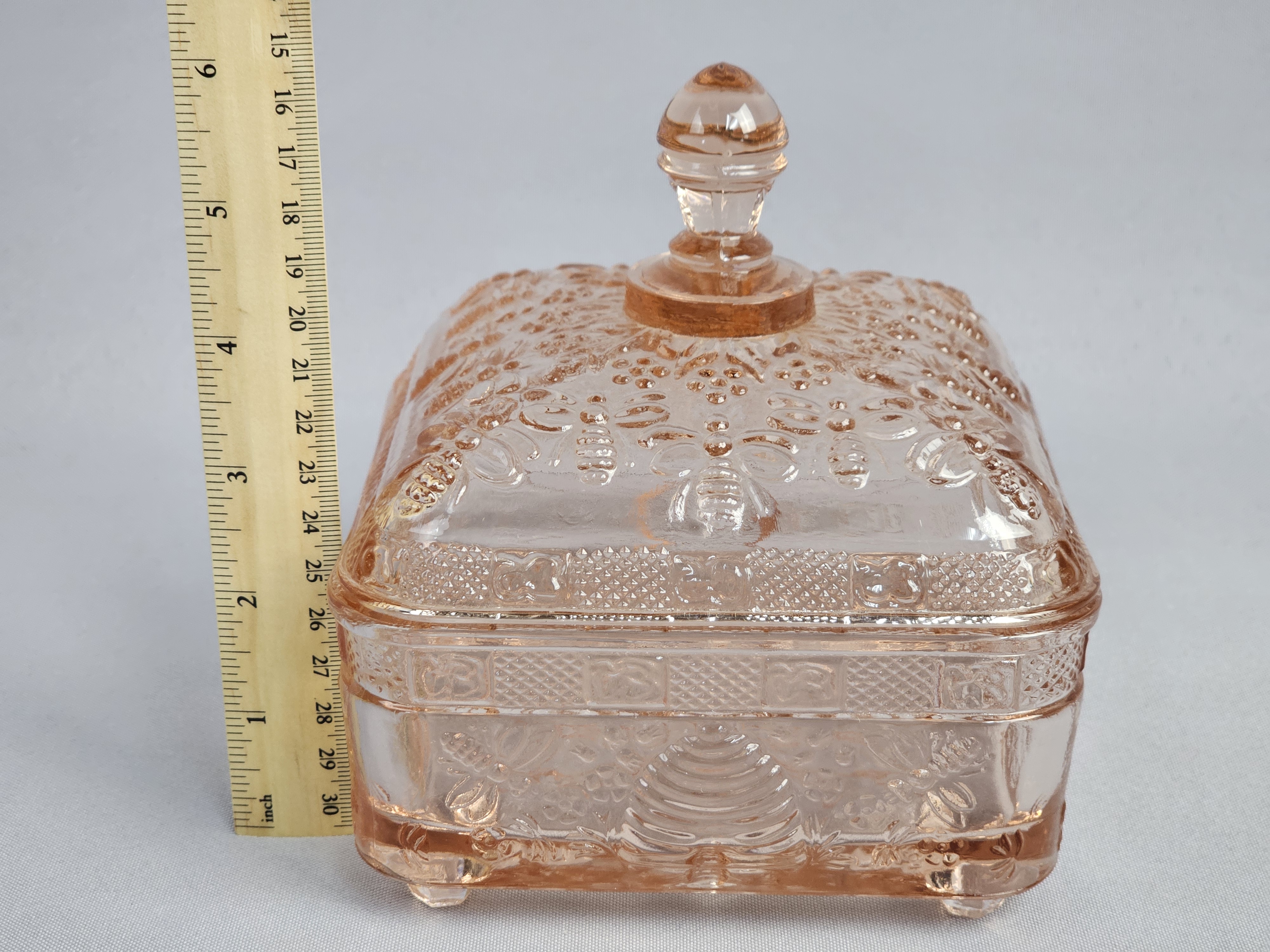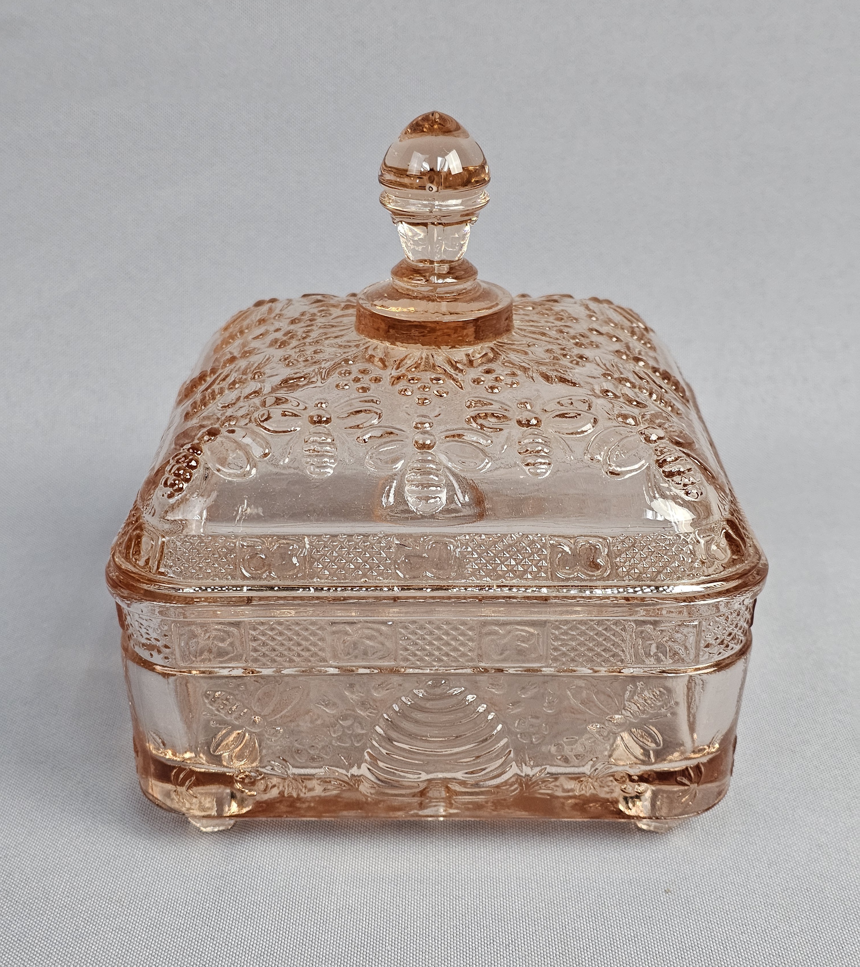 A pink pressed glass covered honey dish in the Honey Bee pattern, produced by Indiana Glass for Tiara Exclusives. The two-piece utility dish is square in form and rests on four molded feet. The lid features a tiered, globular finial. The exterior surfaces of both the lid and base are decorated with high-relief molded imagery including bumblebees in flight, traditional beehive skeps, and small floral sprays. No maker marks are present on the glass. Height: 6 inches Width: 5 inches The item is in good vintage condition. Small chips are present on the base or bottom piece around the rim where the lid sits on it.