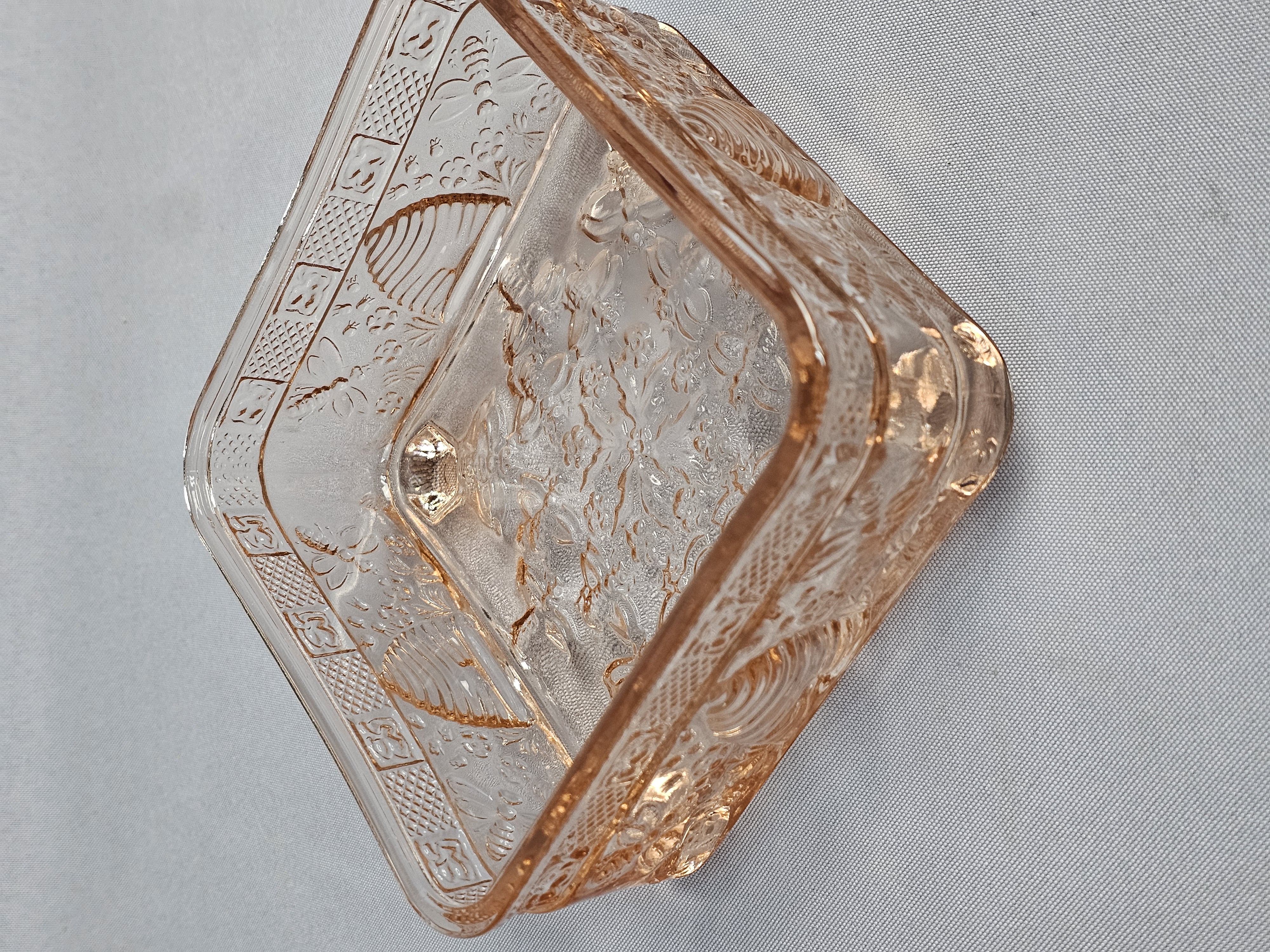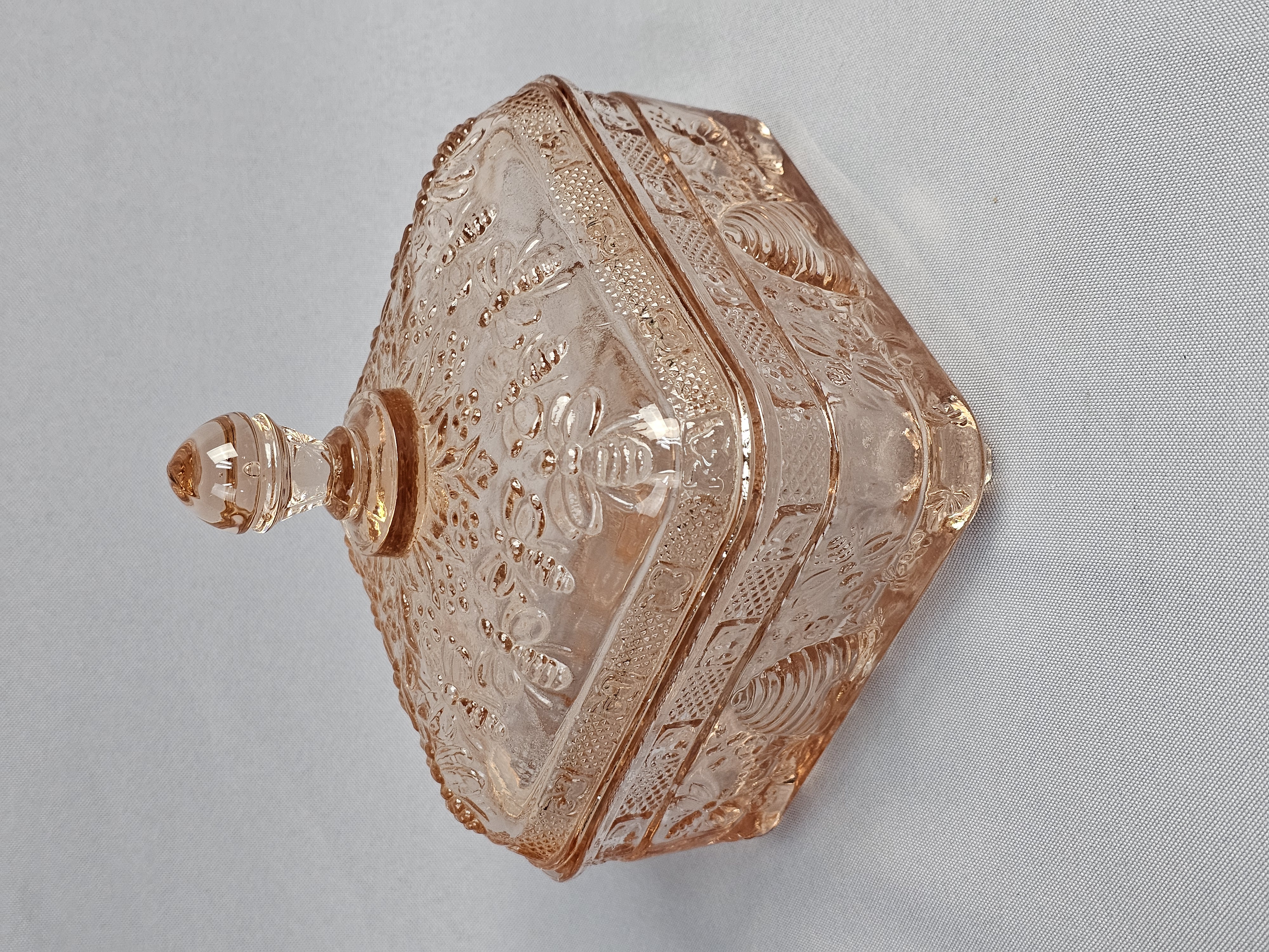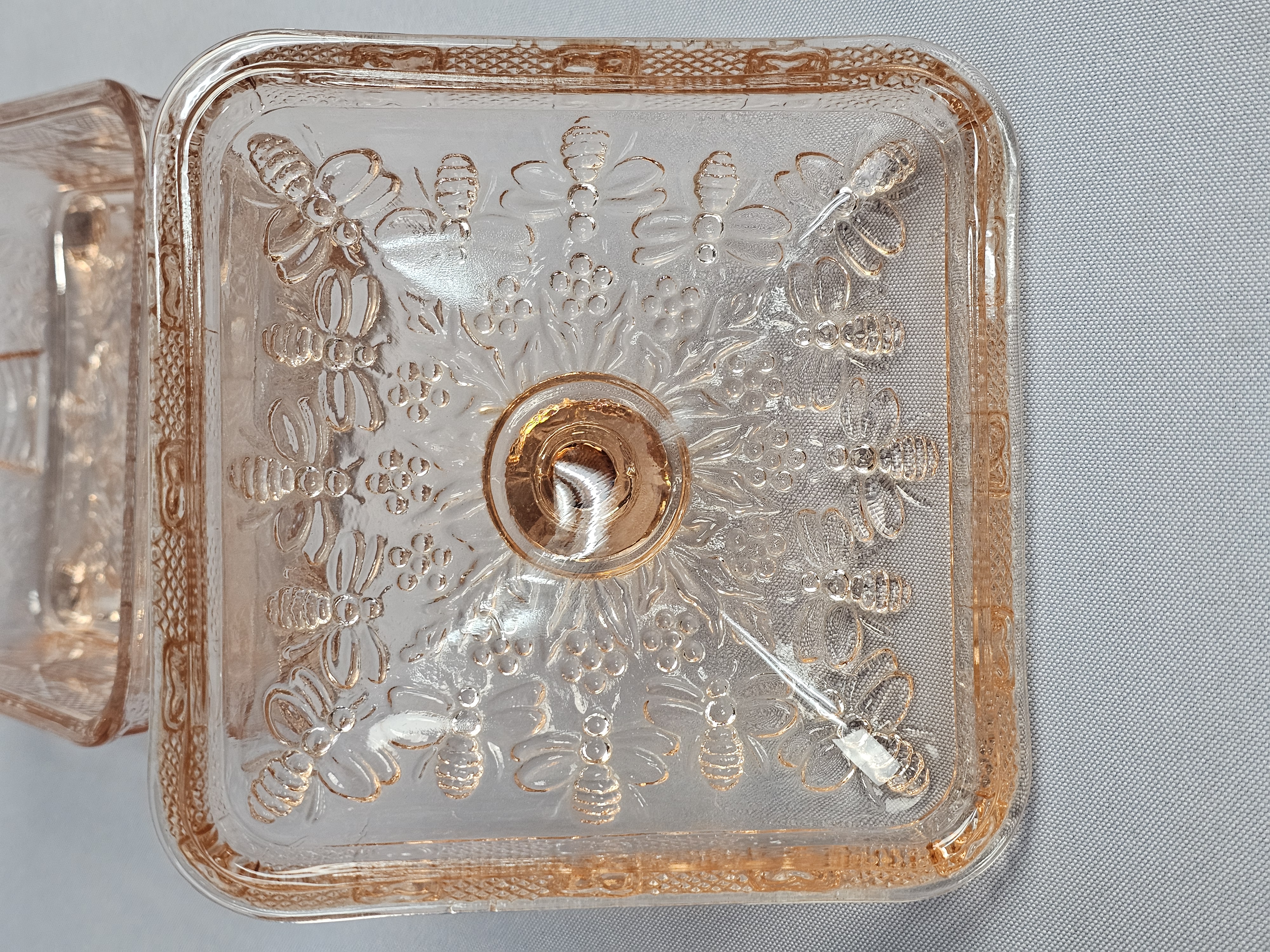 A pink pressed glass covered honey dish in the Honey Bee pattern, produced by Indiana Glass for Tiara Exclusives. The two-piece utility dish is square in form and rests on four molded feet. The lid features a tiered, globular finial. The exterior surfaces of both the lid and base are decorated with high-relief molded imagery including bumblebees in flight, traditional beehive skeps, and small floral sprays. No maker marks are present on the glass. Height: 6 inches Width: 5 inches The item is in good vintage condition. Small chips are present on the base or bottom piece around the rim where the lid sits on it.