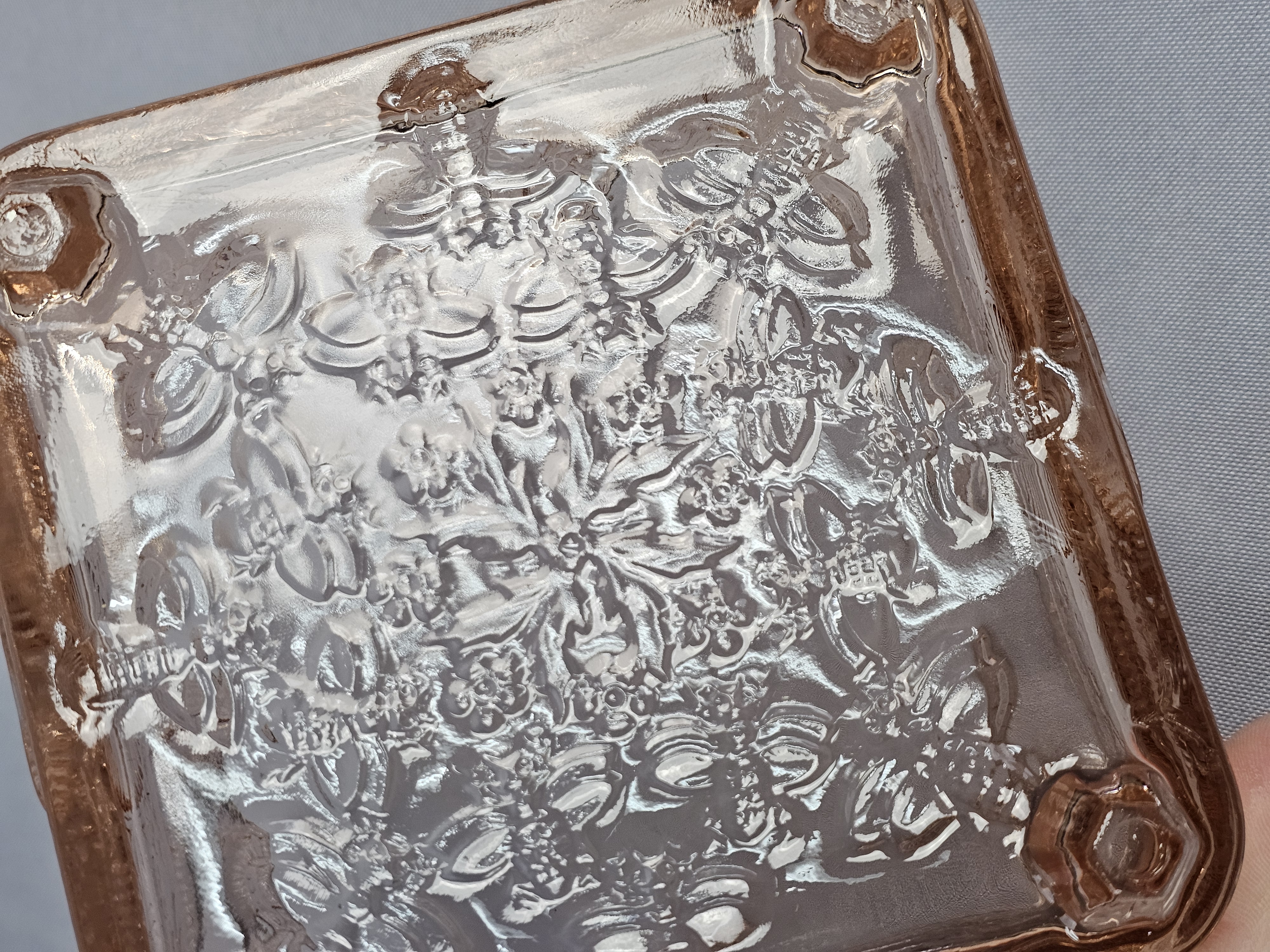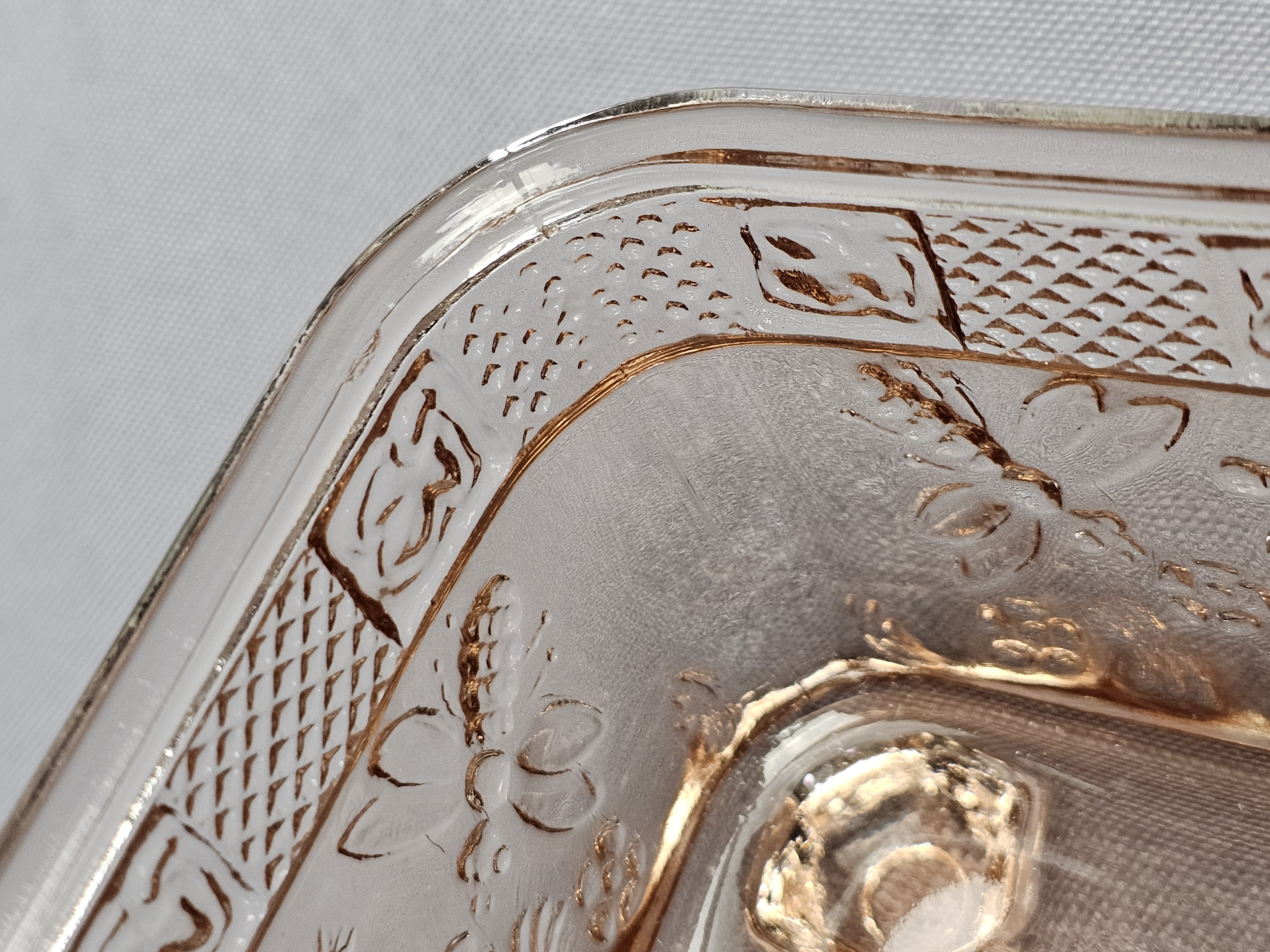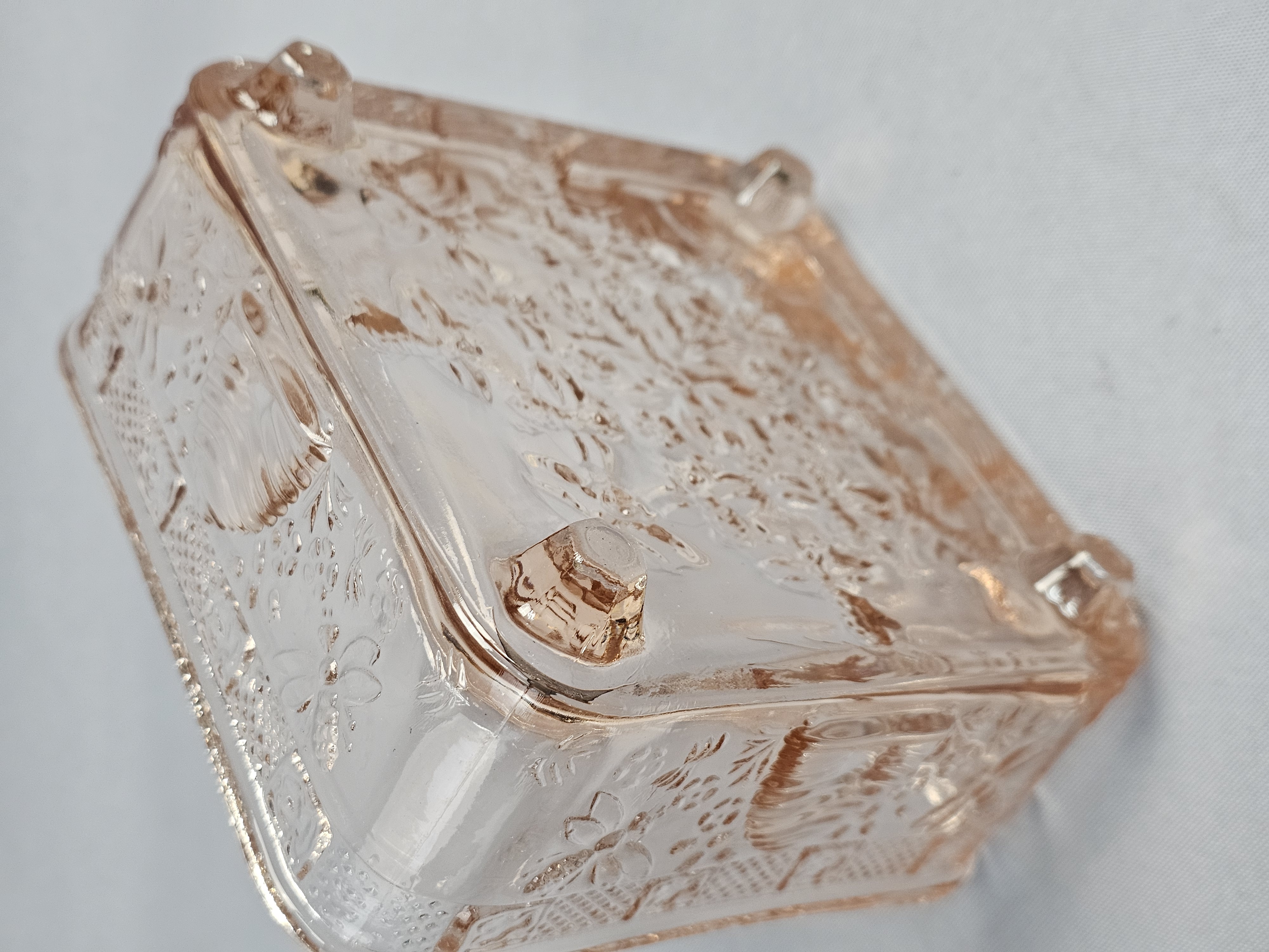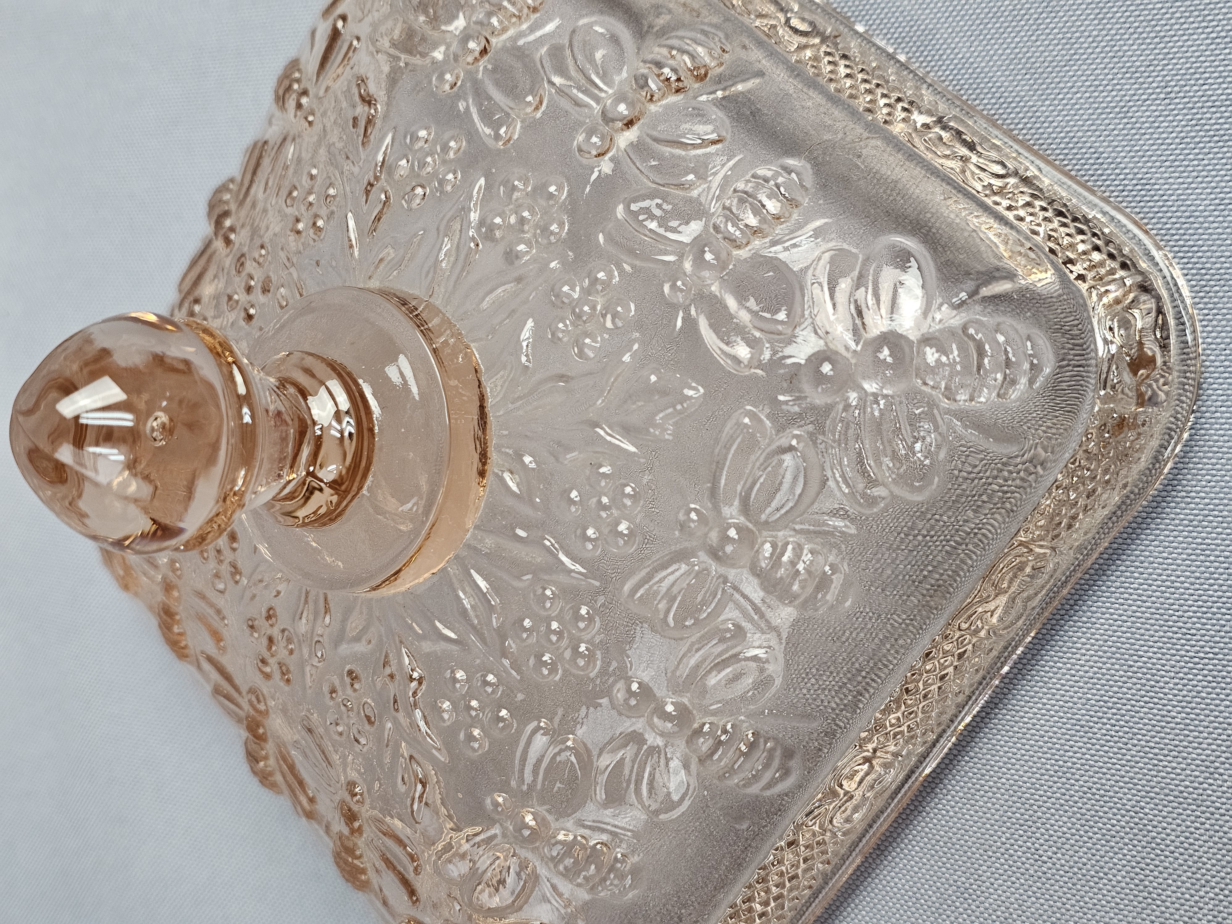 A pink pressed glass covered honey dish in the Honey Bee pattern, produced by Indiana Glass for Tiara Exclusives. The two-piece utility dish is square in form and rests on four molded feet. The lid features a tiered, globular finial. The exterior surfaces of both the lid and base are decorated with high-relief molded imagery including bumblebees in flight, traditional beehive skeps, and small floral sprays. No maker marks are present on the glass. Height: 6 inches Width: 5 inches The item is in good vintage condition. Small chips are present on the base or bottom piece around the rim where the lid sits on it.