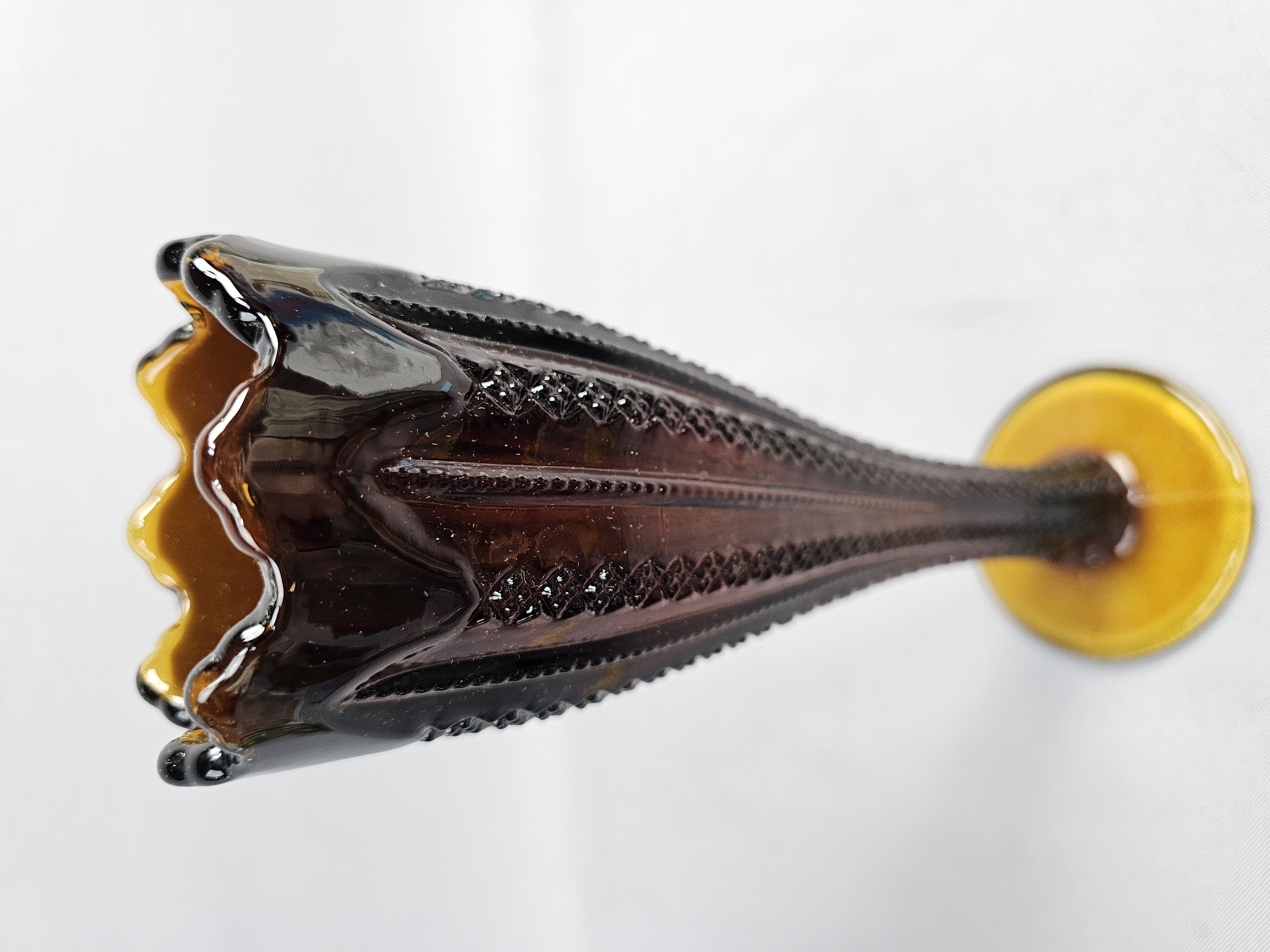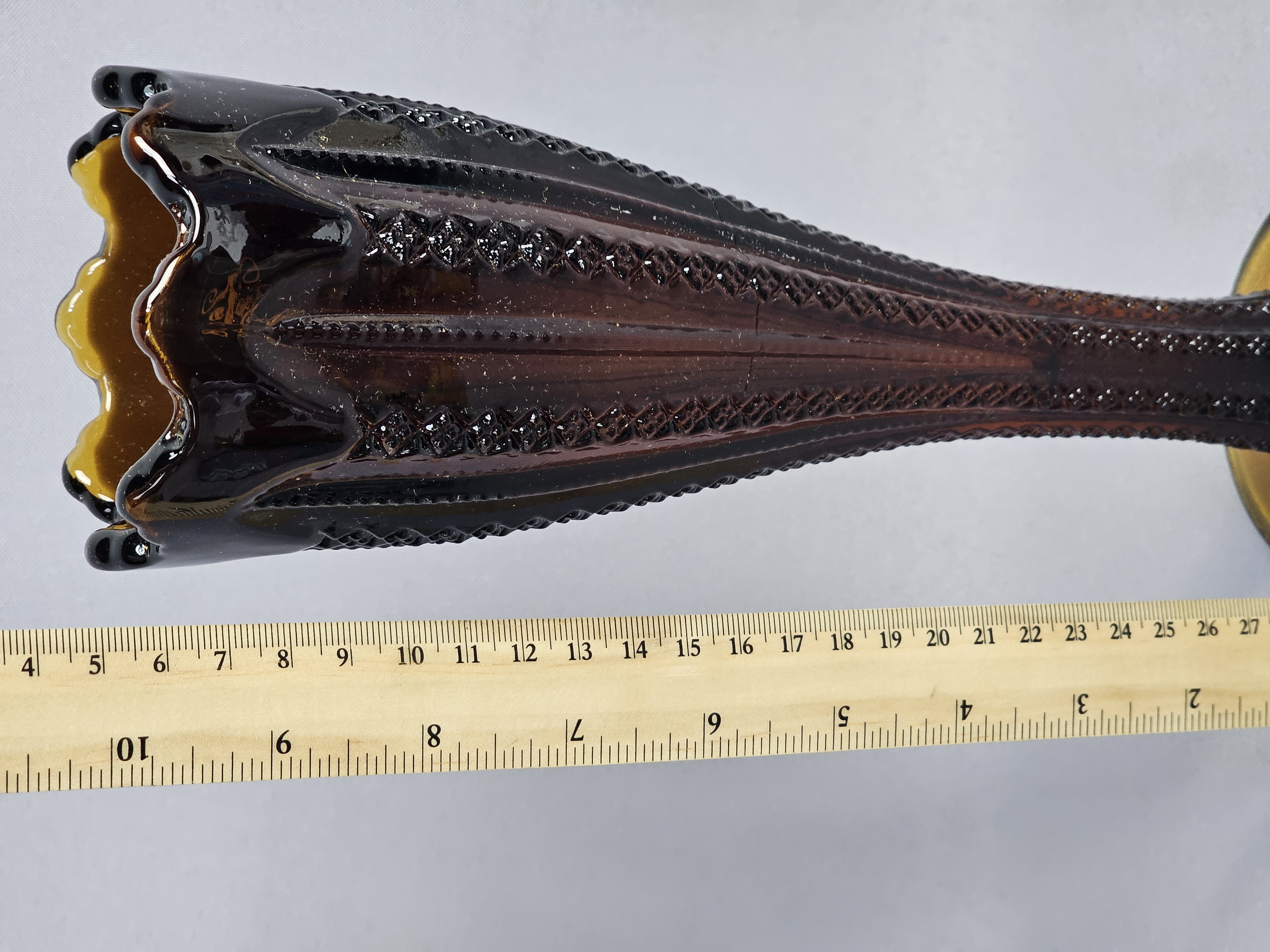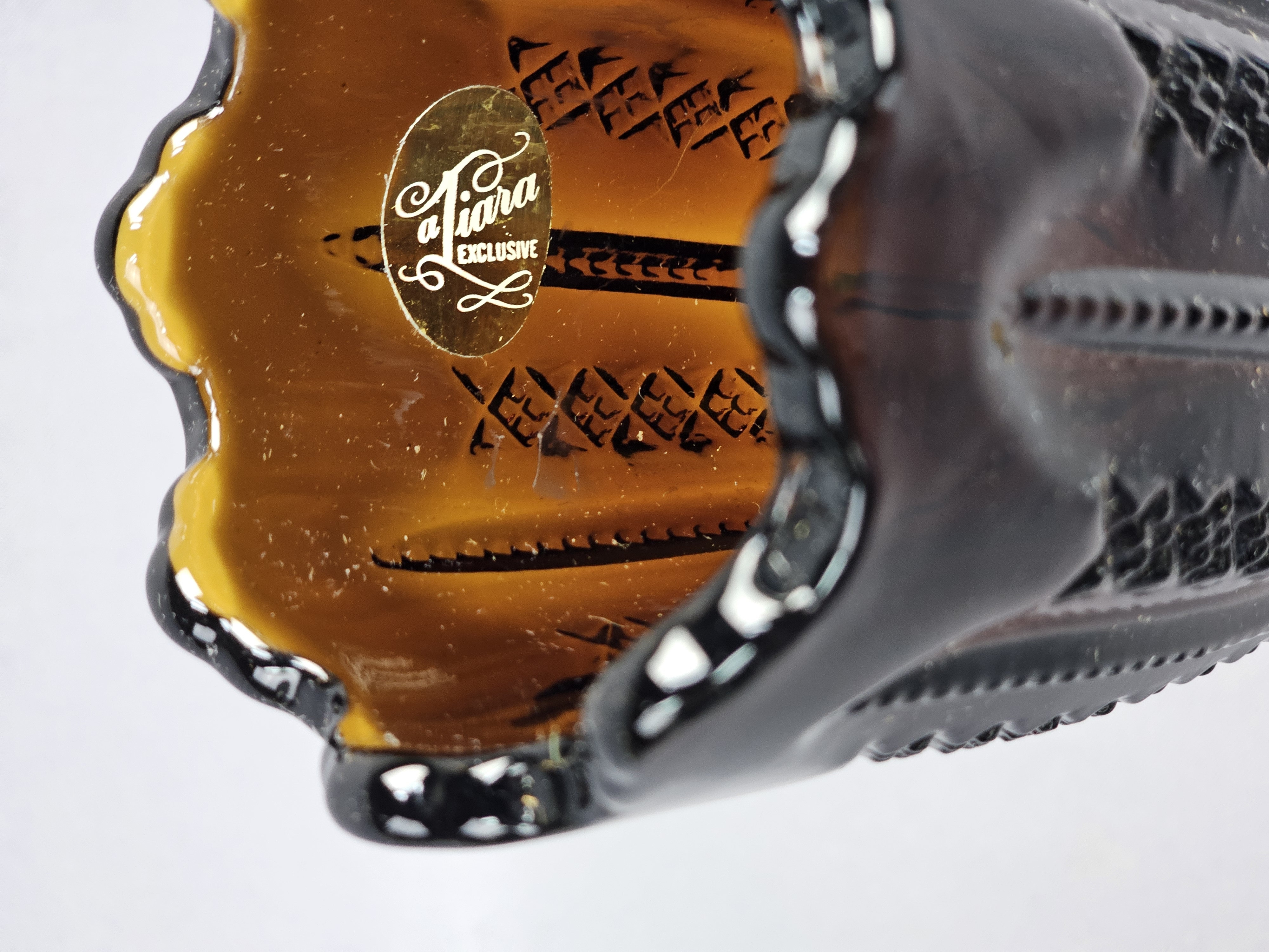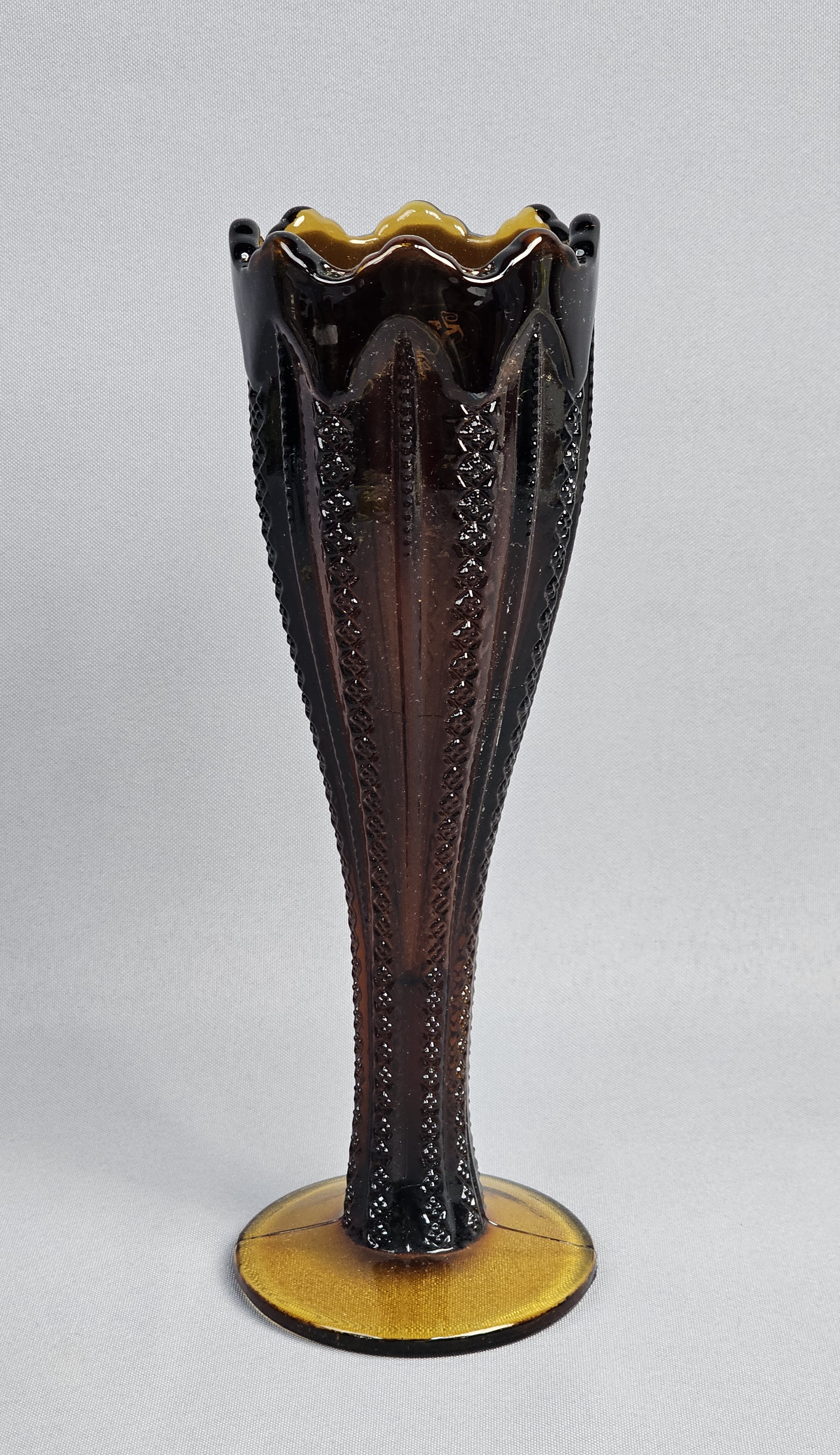 A tall pressed glass vase produced by Tiara Glass. The item is identified by a gold foil label on the interior rim reading a Tiara EXCLUSIVE. The vase is made of deep amber glass and features a pattern of alternating vertical smooth ribs and diamond-point textured bands. Height: 10 inches Minor surface wear and internal seeds are present. No chips or restorations are noted.
