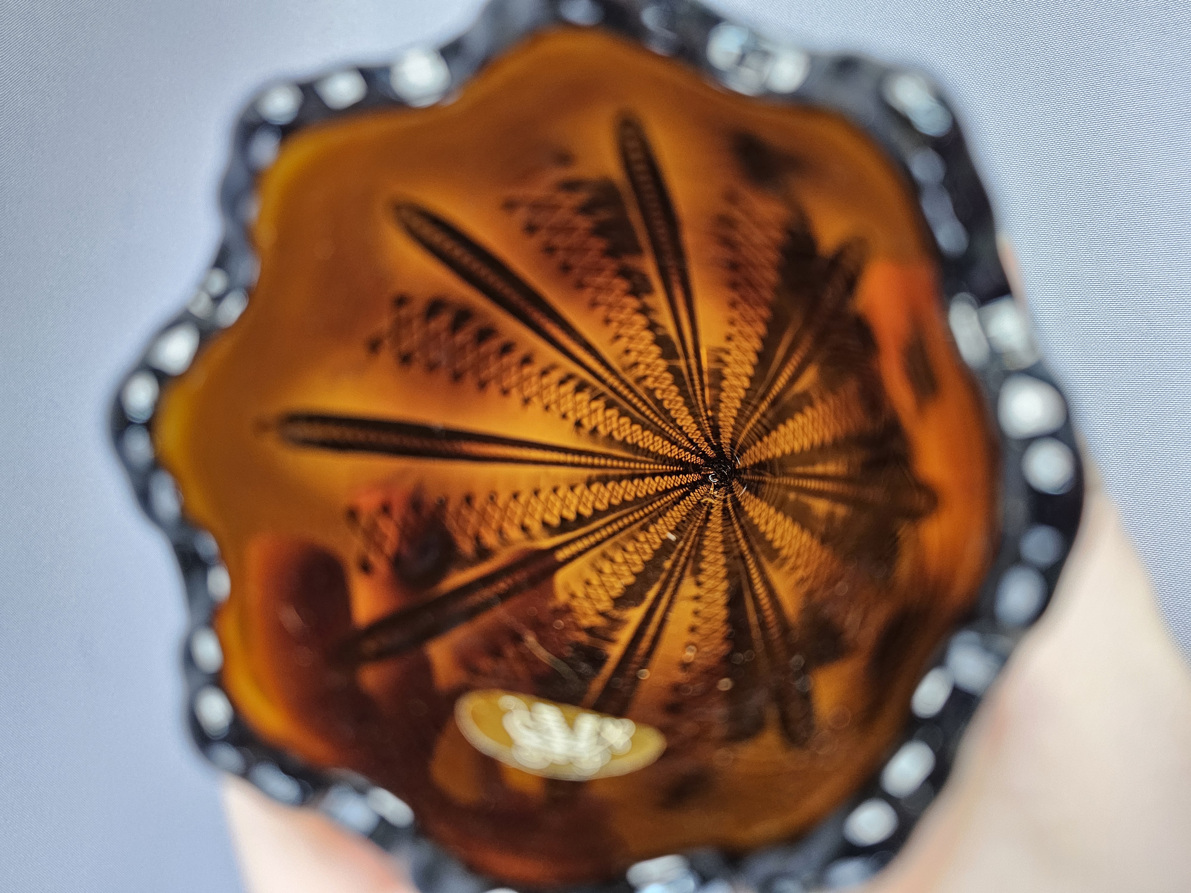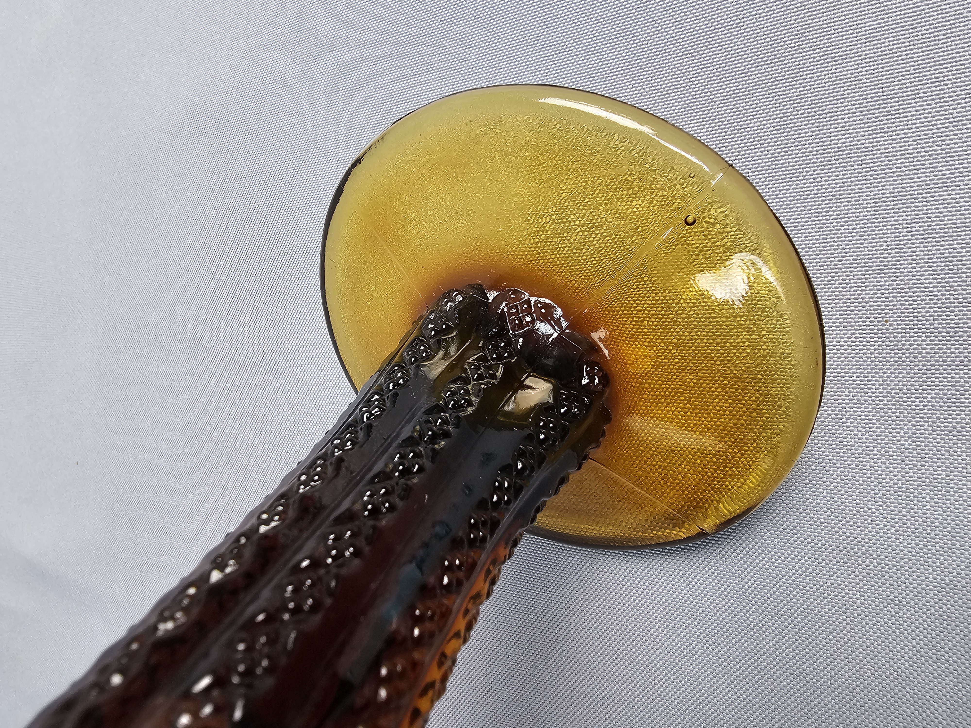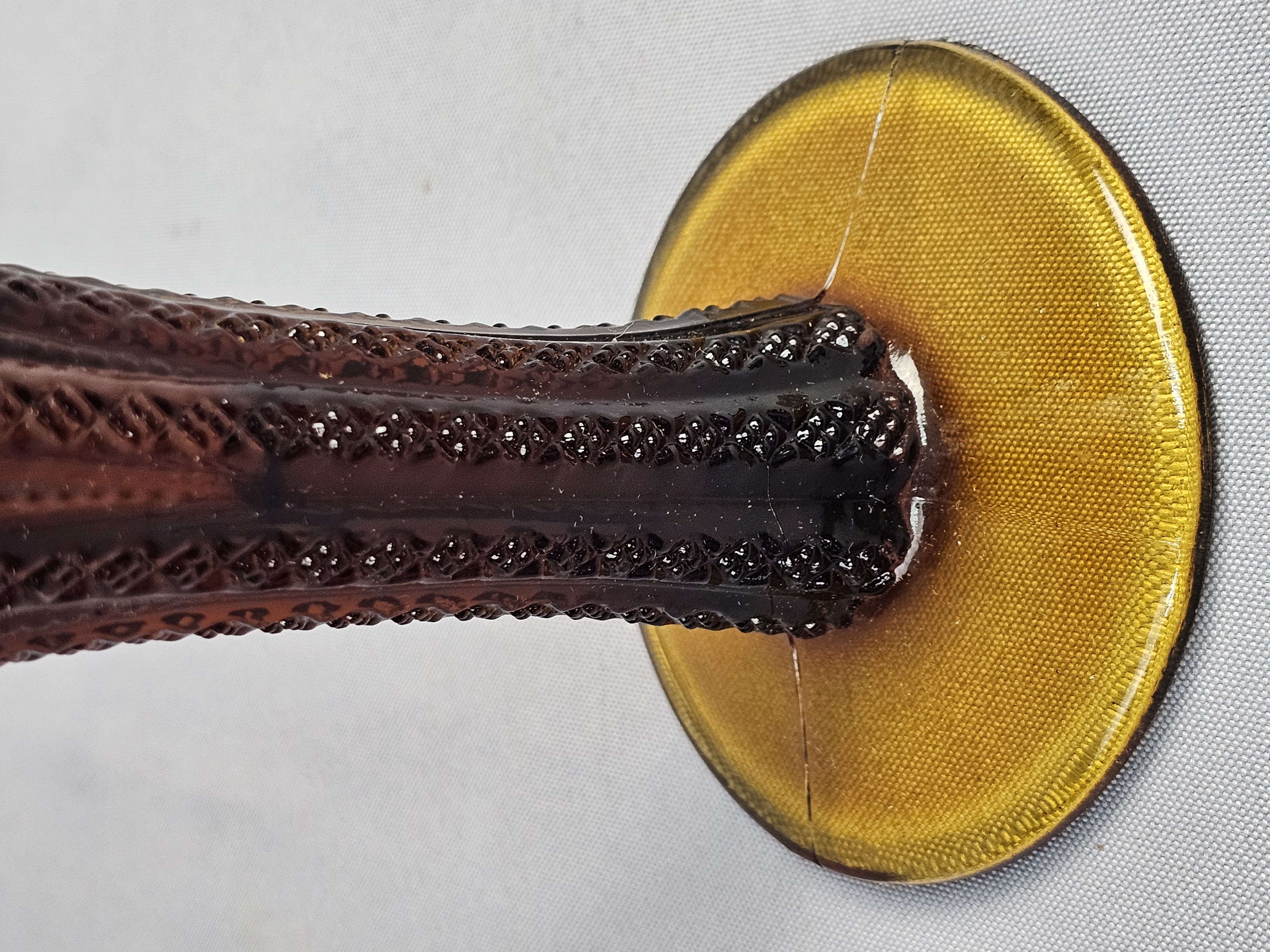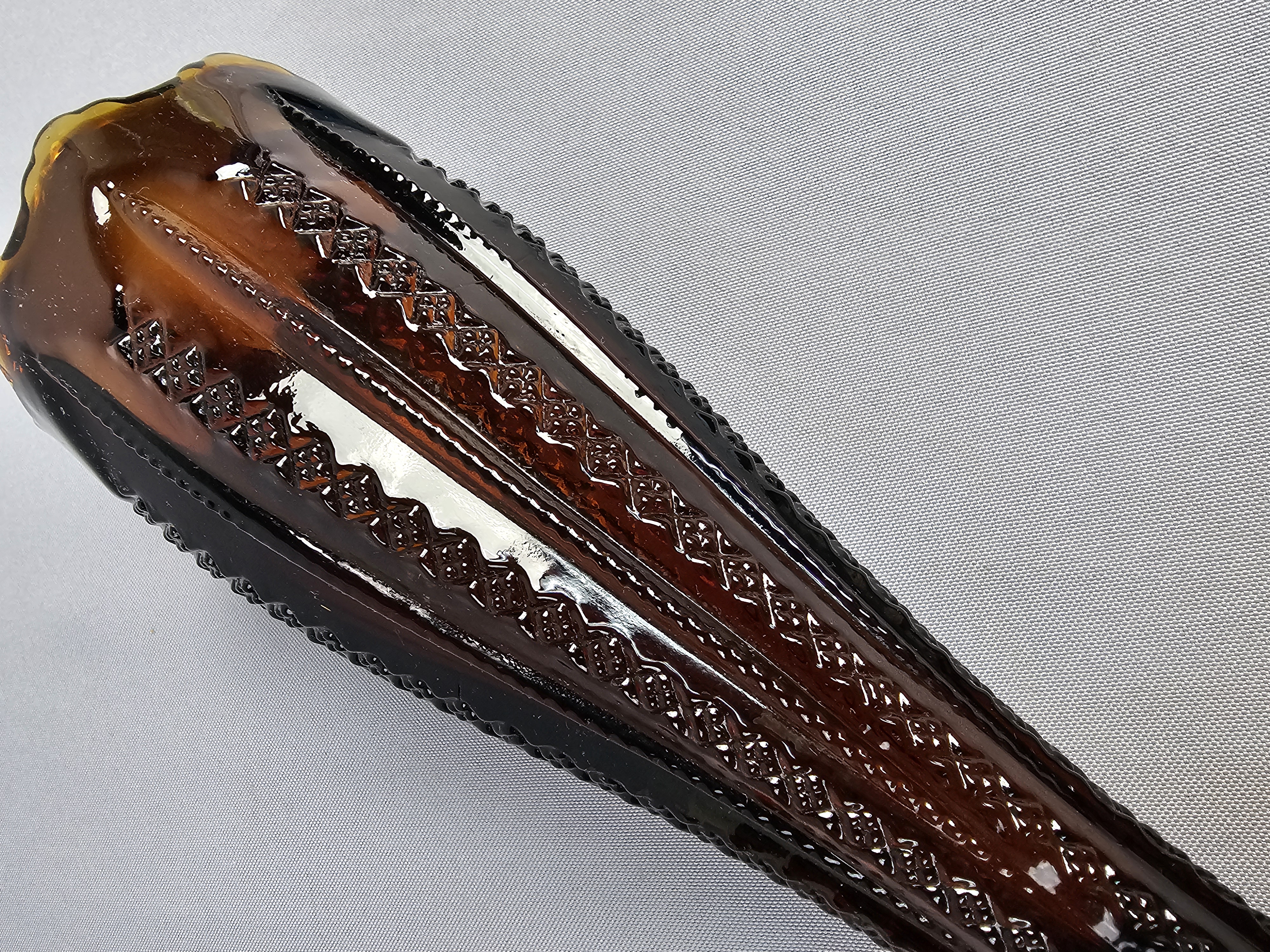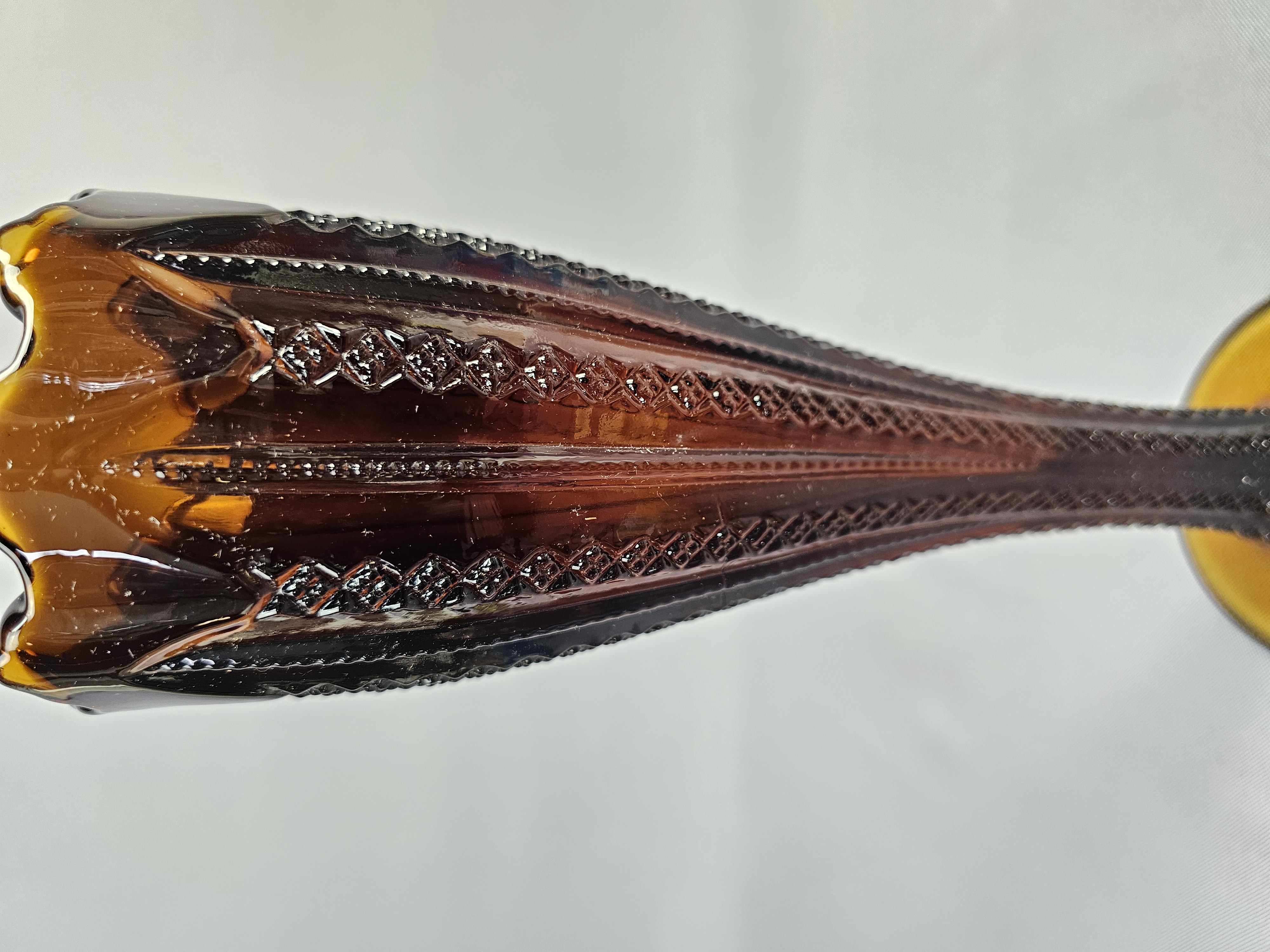A tall pressed glass vase produced by Tiara Glass. The item is identified by a gold foil label on the interior rim reading a Tiara EXCLUSIVE. The vase is made of deep amber glass and features a pattern of alternating vertical smooth ribs and diamond-point textured bands. Height: 10 inches Minor surface wear and internal seeds are present. No chips or restorations are noted.