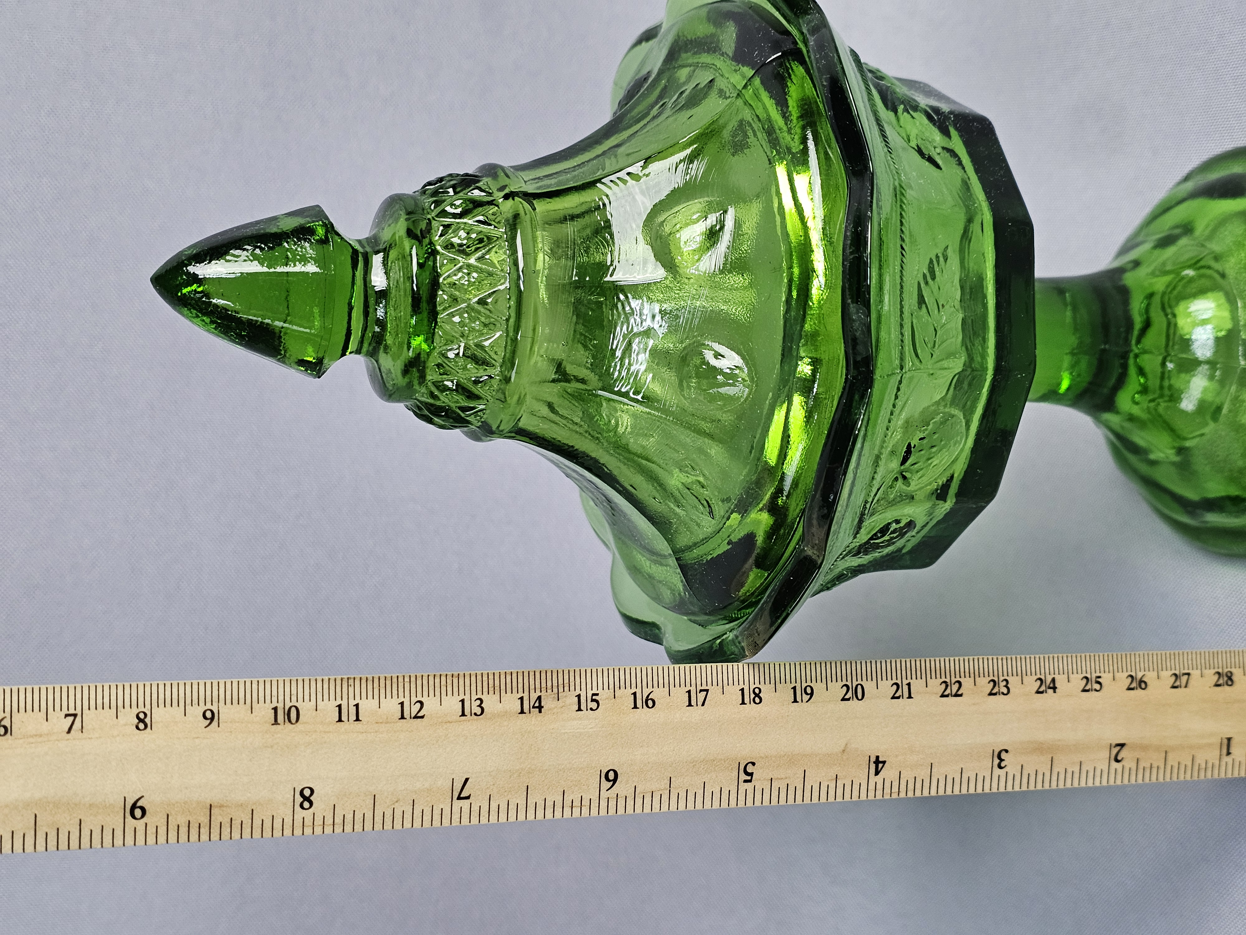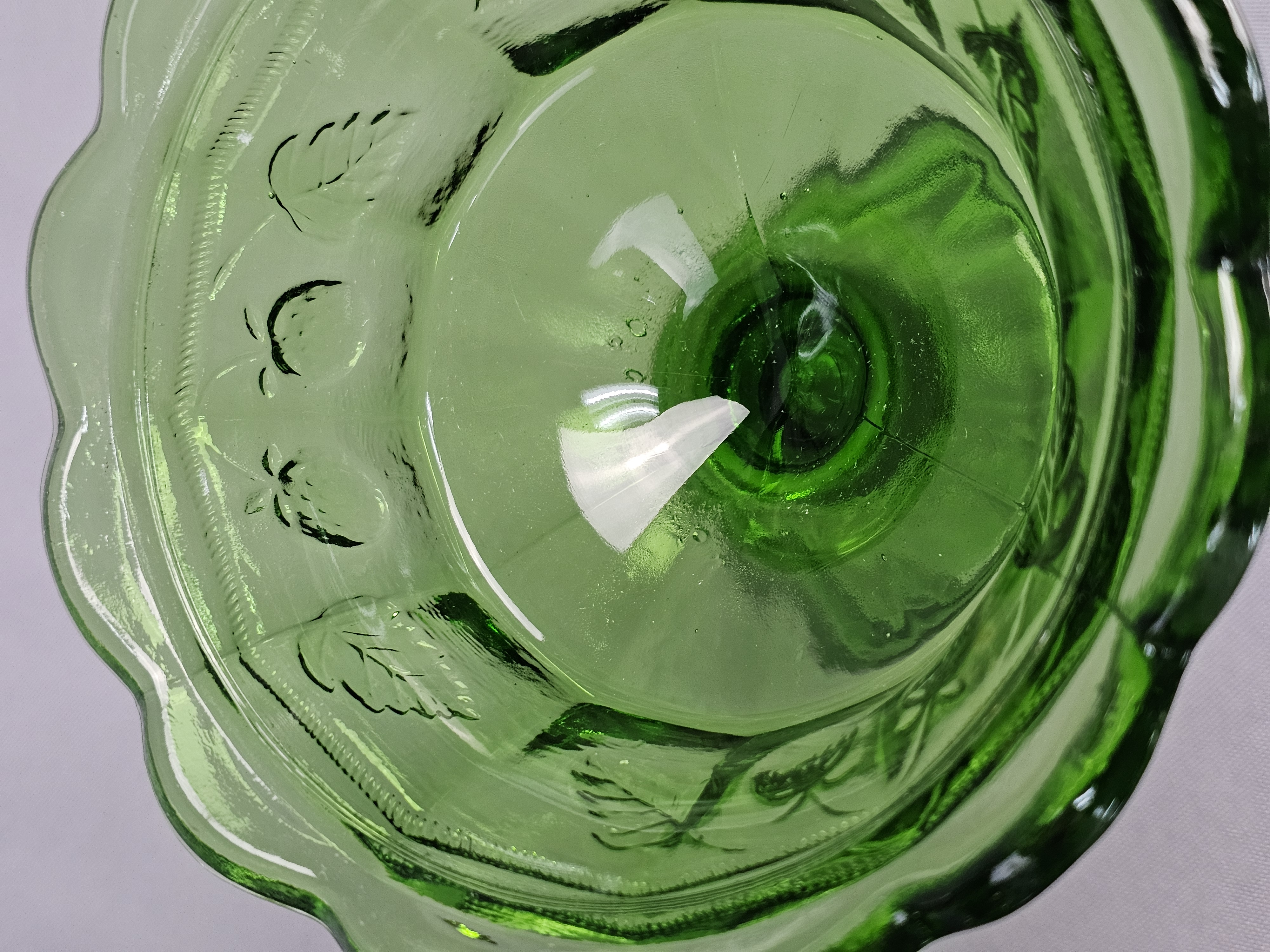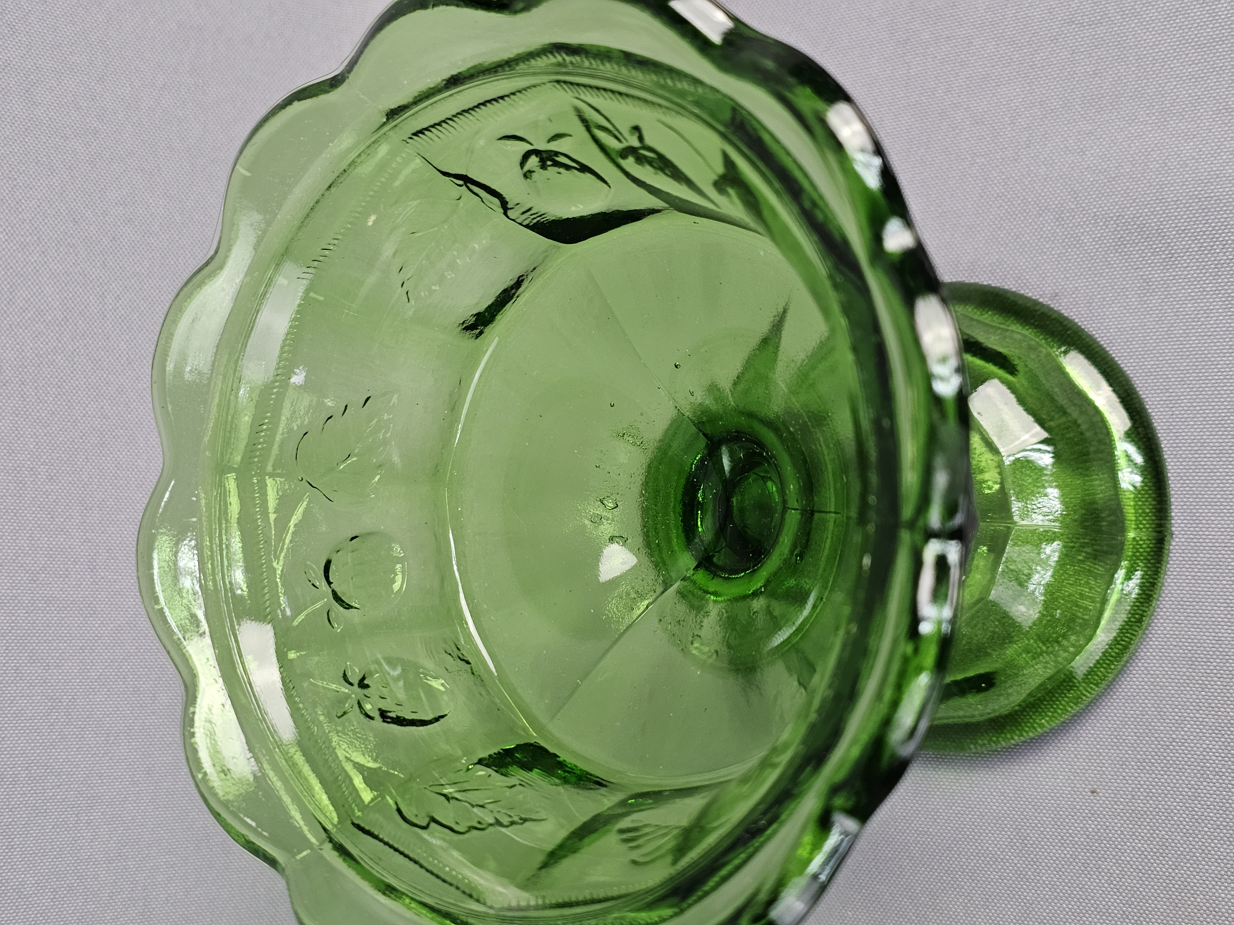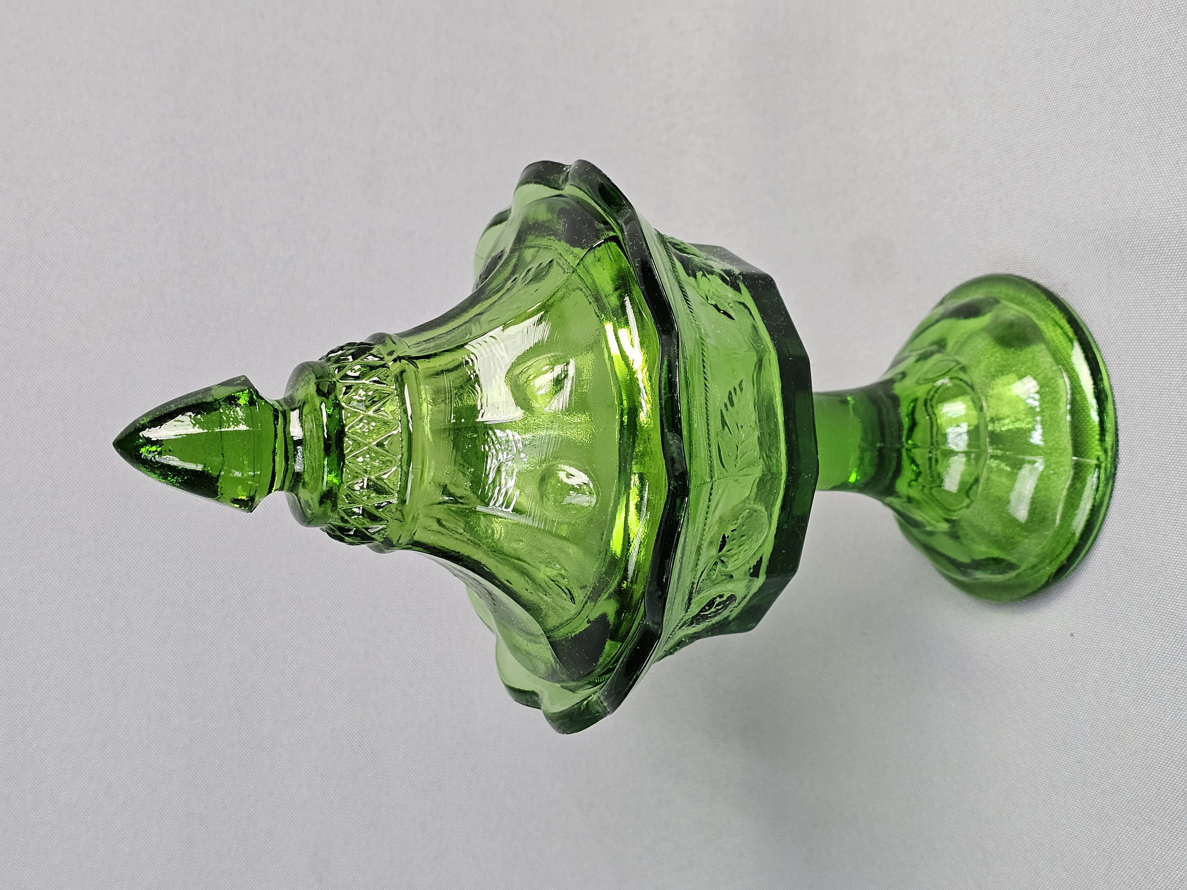 A vintage green pressed glass covered compote. Total Height: Approximately 9 inches Small chips are present on the rim where the lid sits. The surface shows light wear consistent with age.