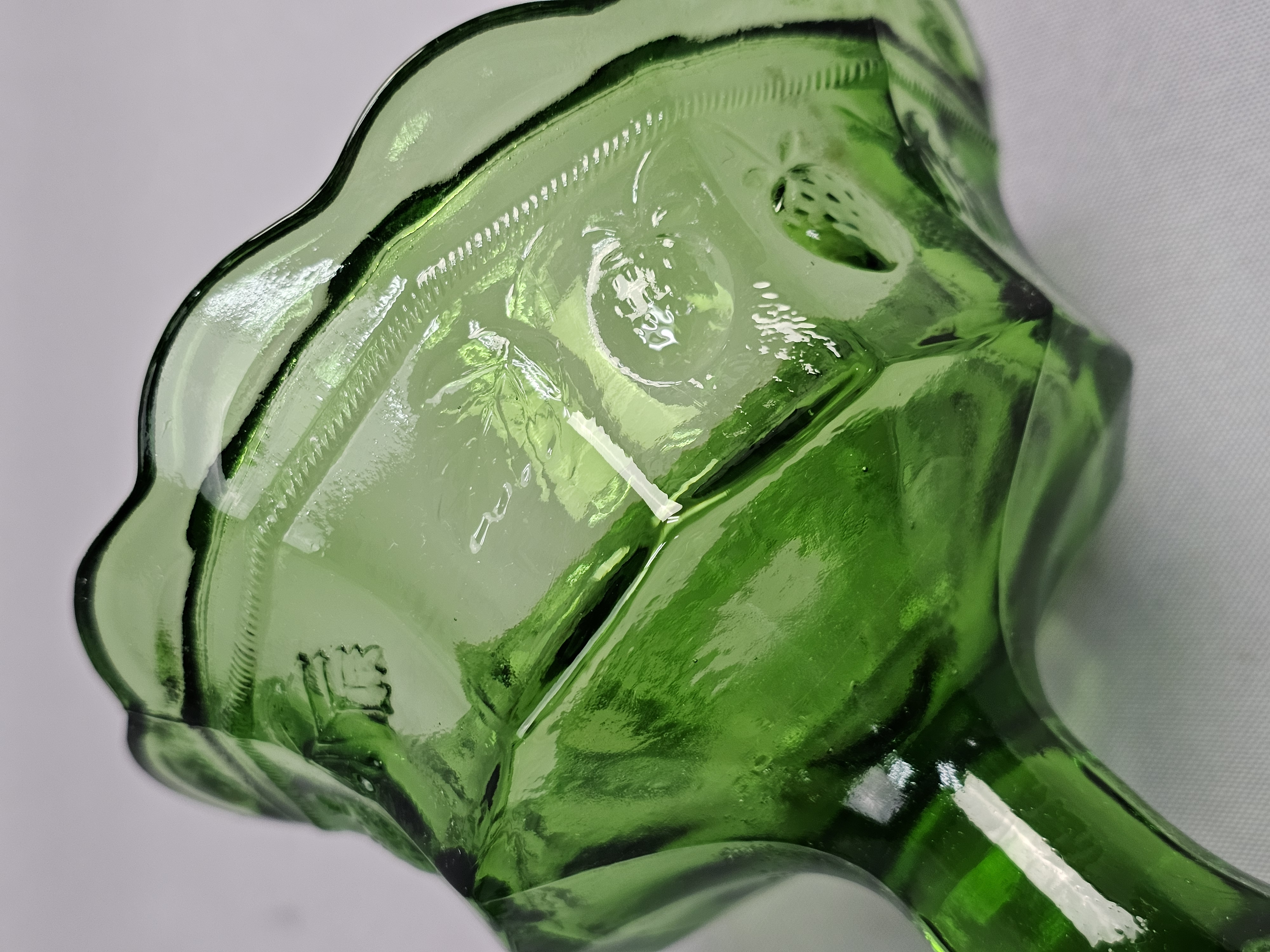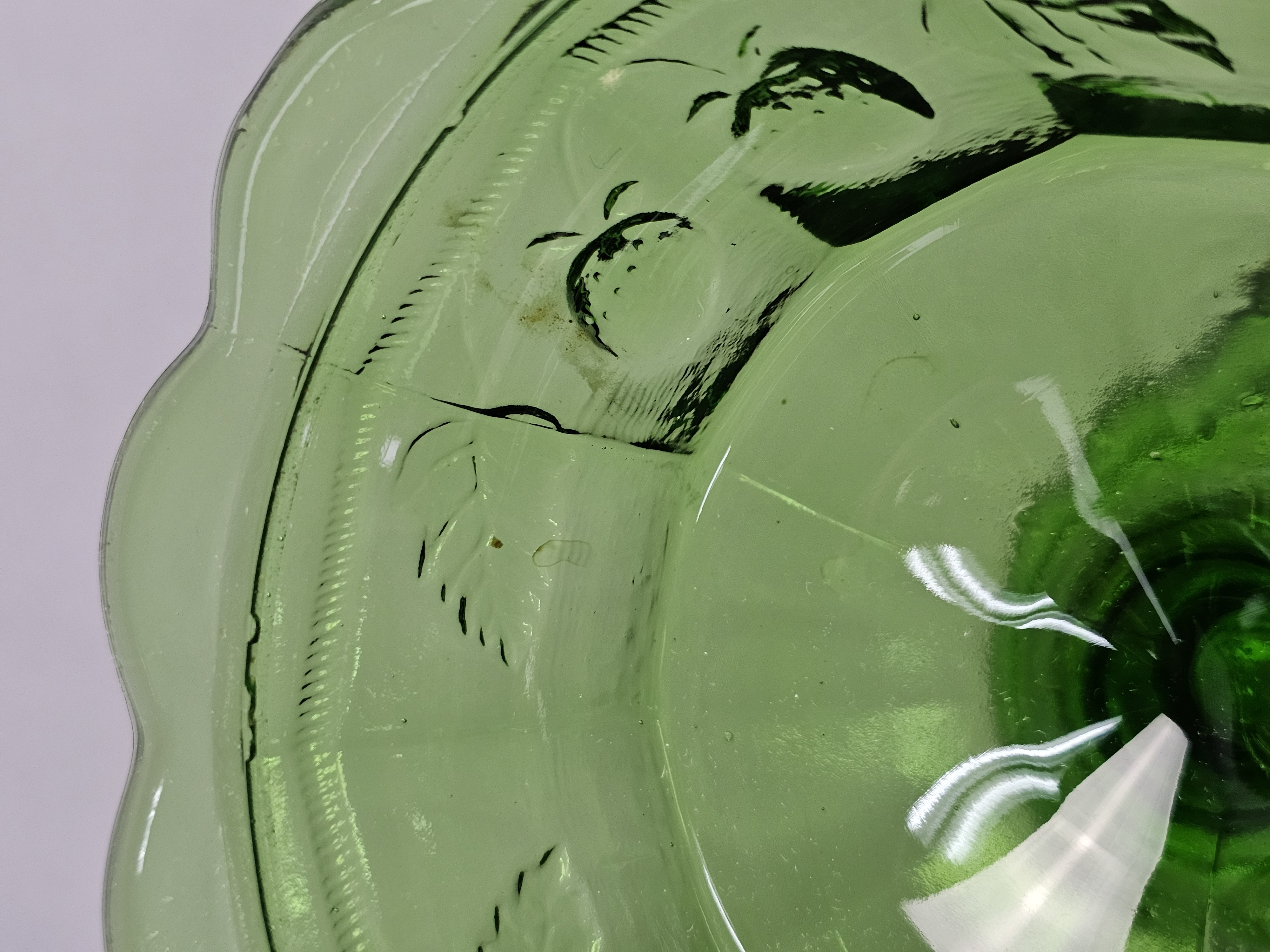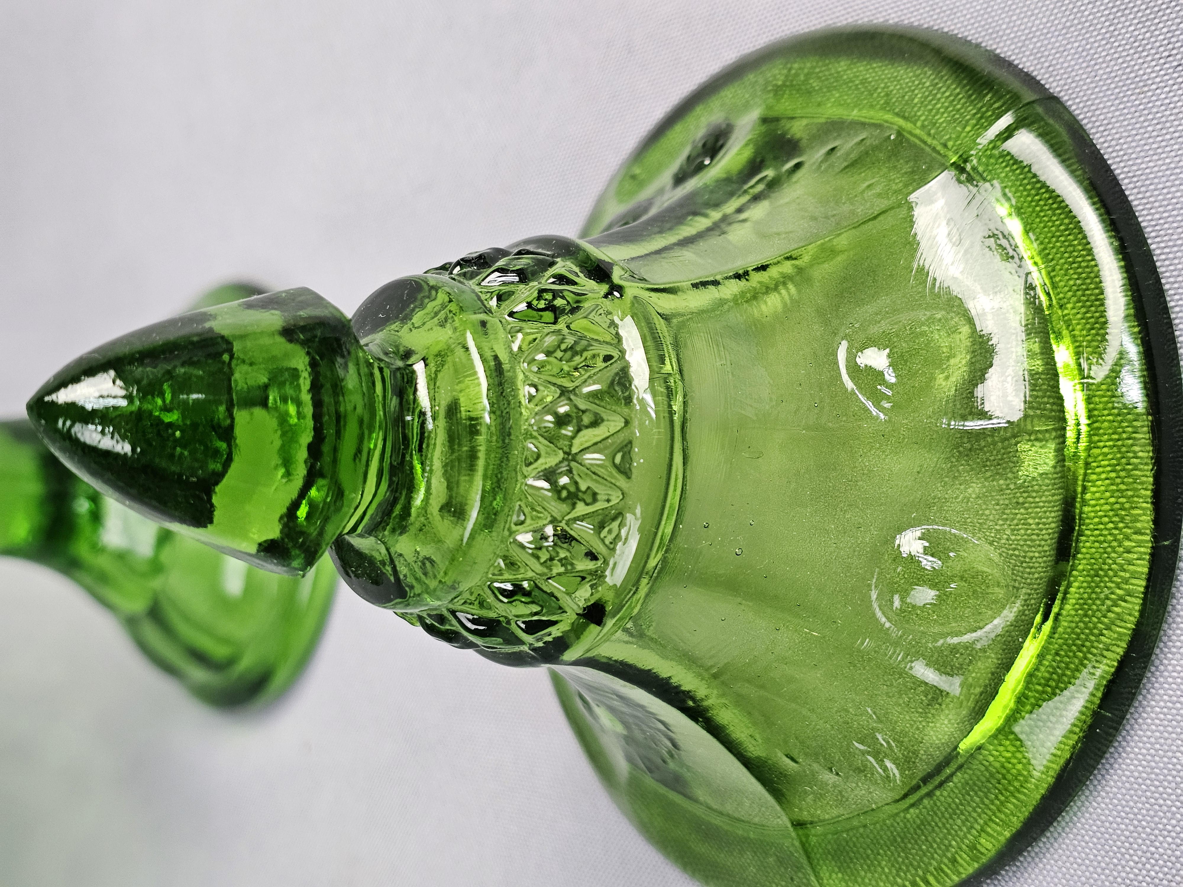 A vintage green pressed glass covered compote. Total Height: Approximately 9 inches Small chips are present on the rim where the lid sits. The surface shows light wear consistent with age.