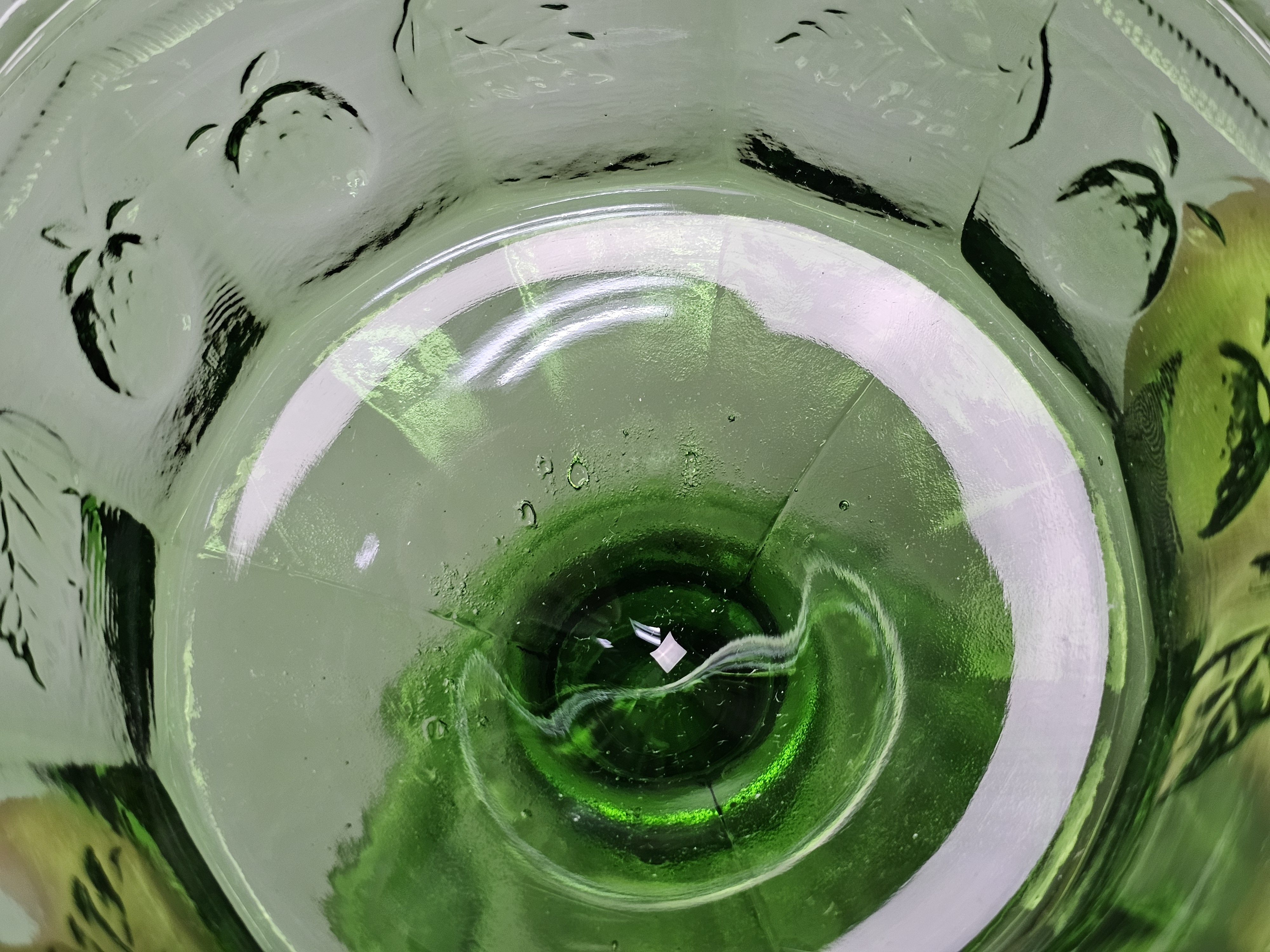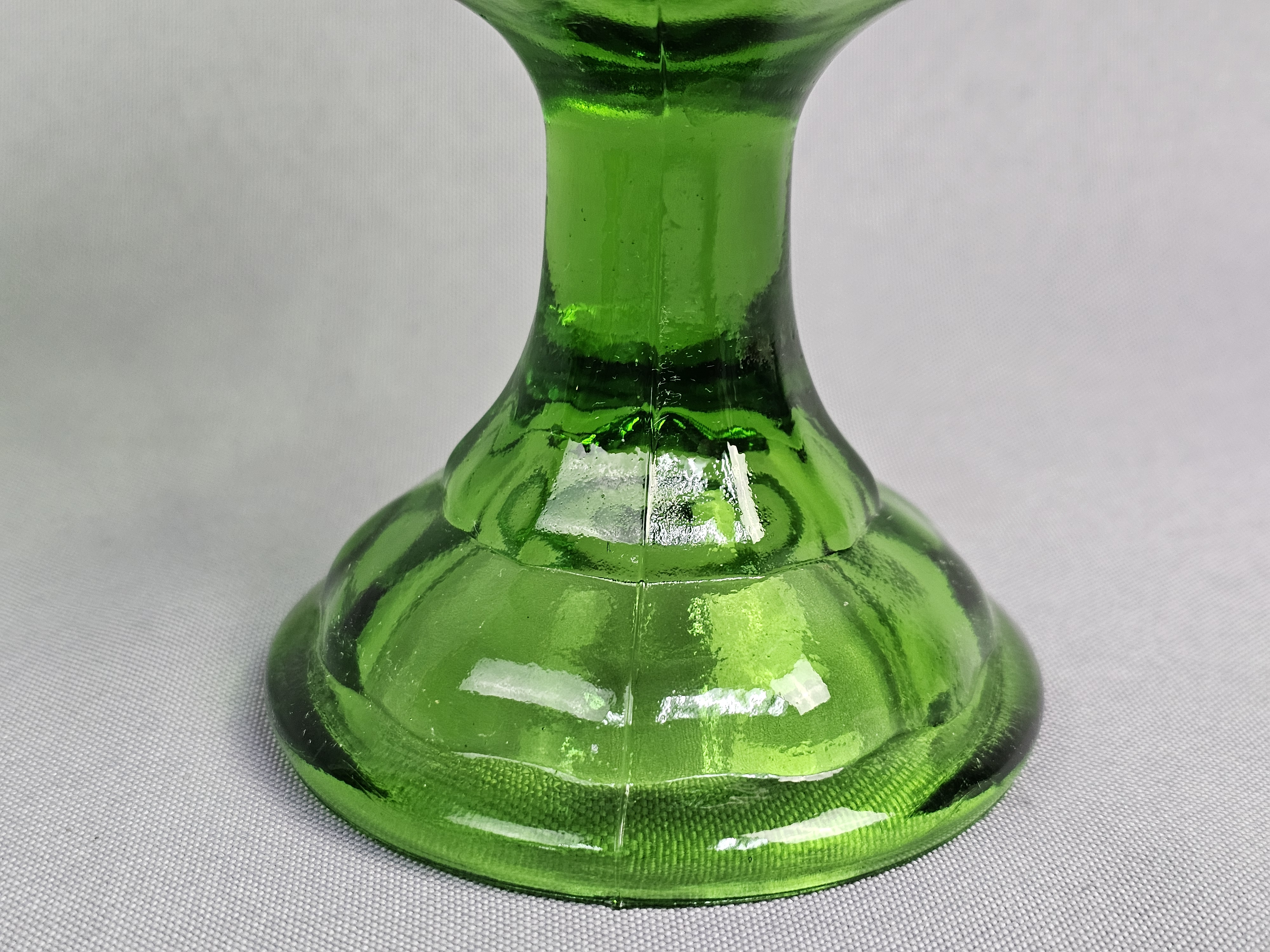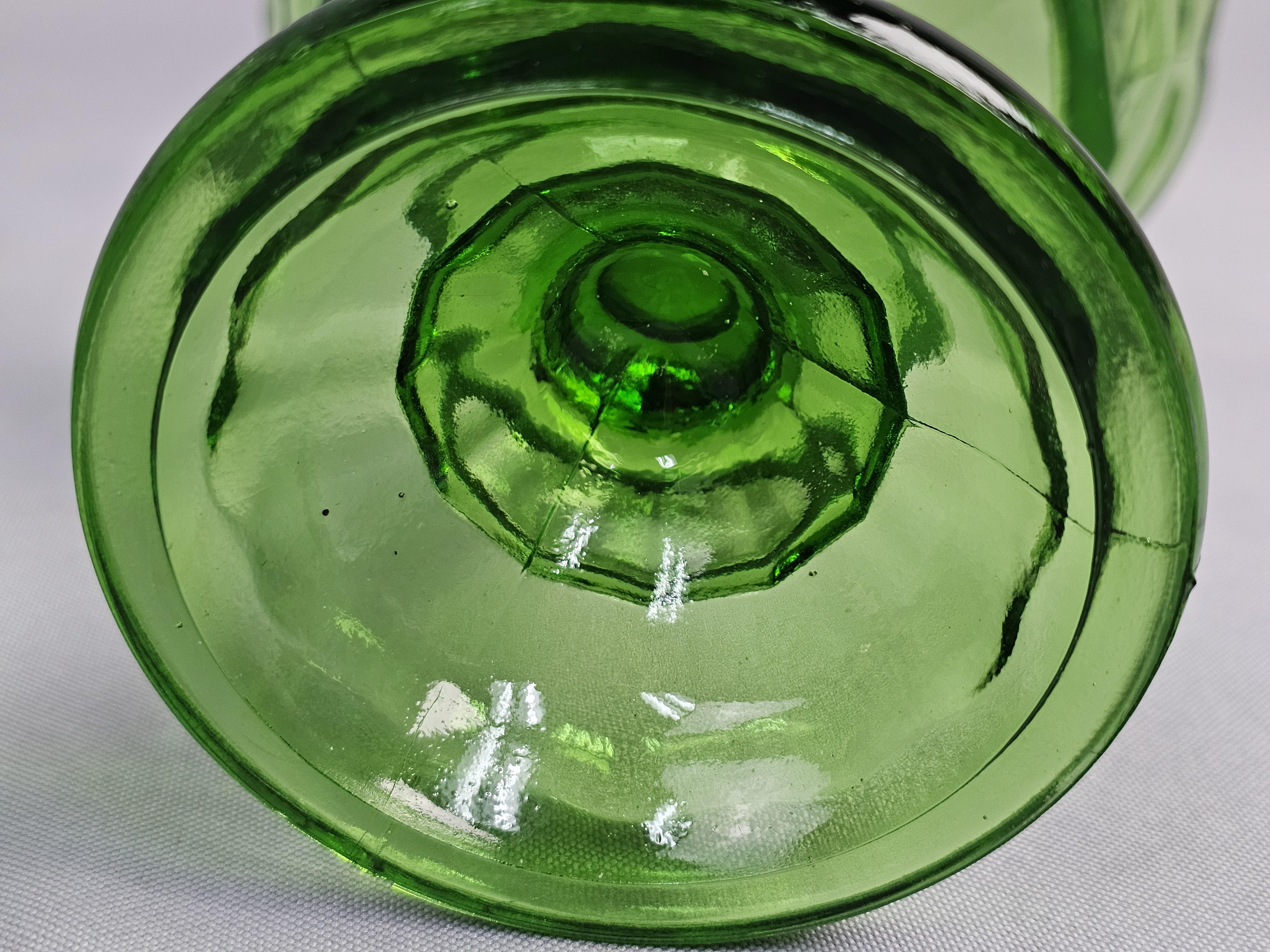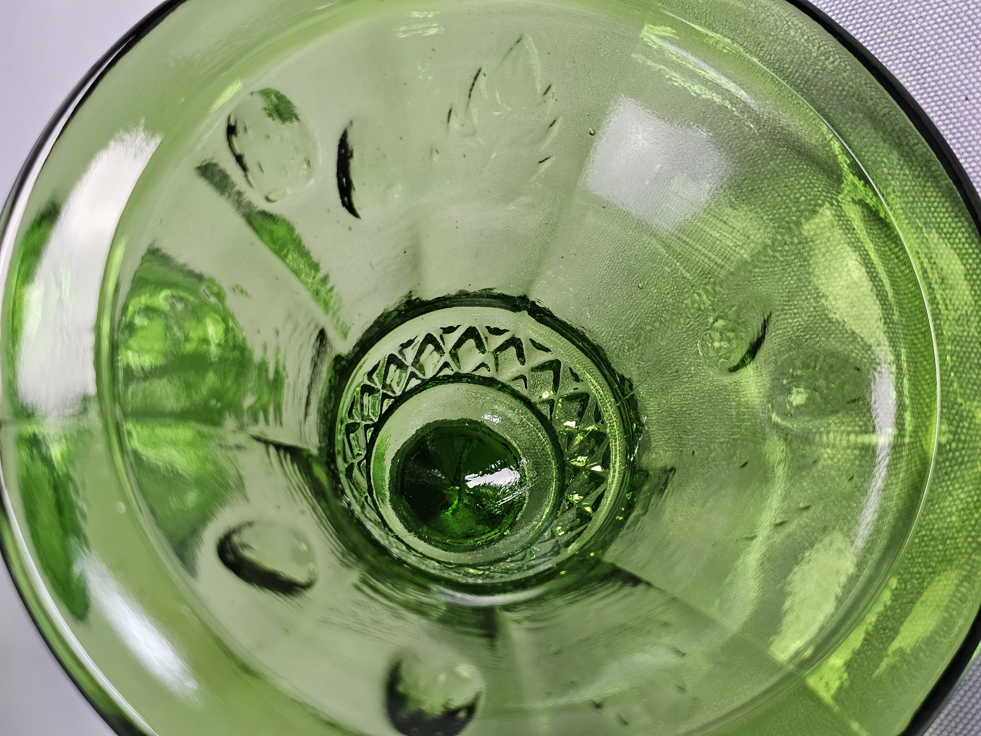 A vintage green pressed glass covered compote. Total Height: Approximately 9 inches Small chips are present on the rim where the lid sits. The surface shows light wear consistent with age.