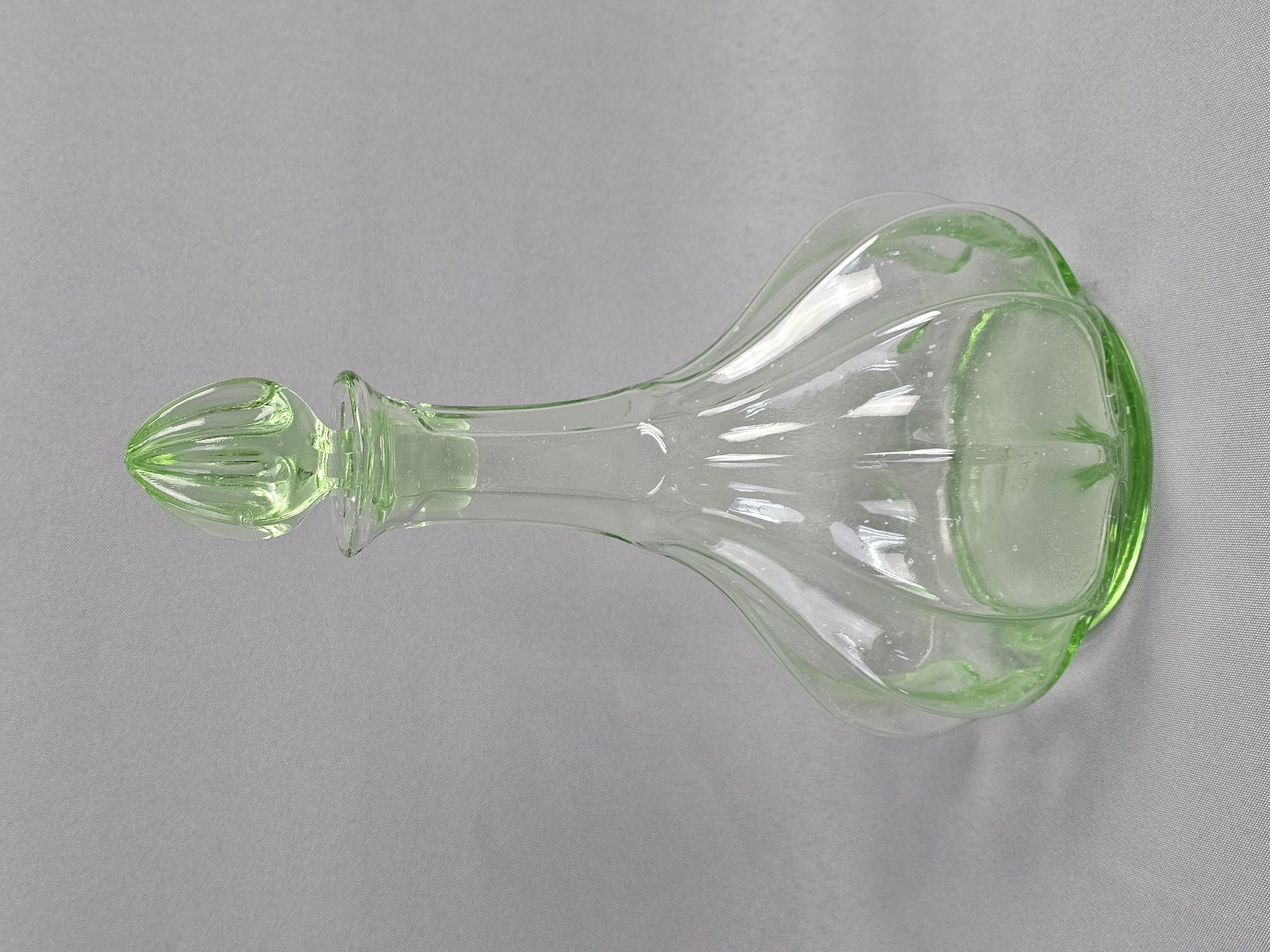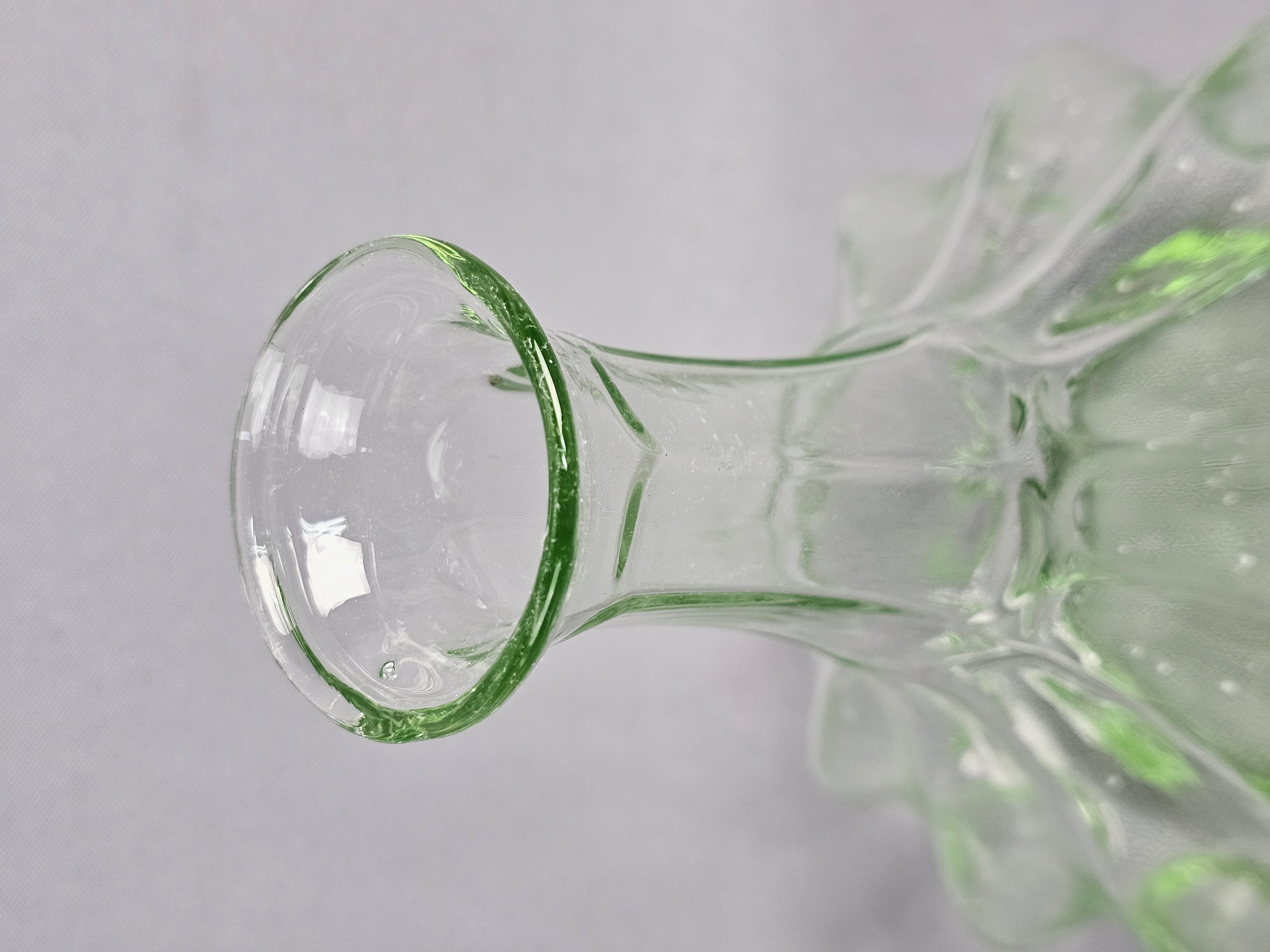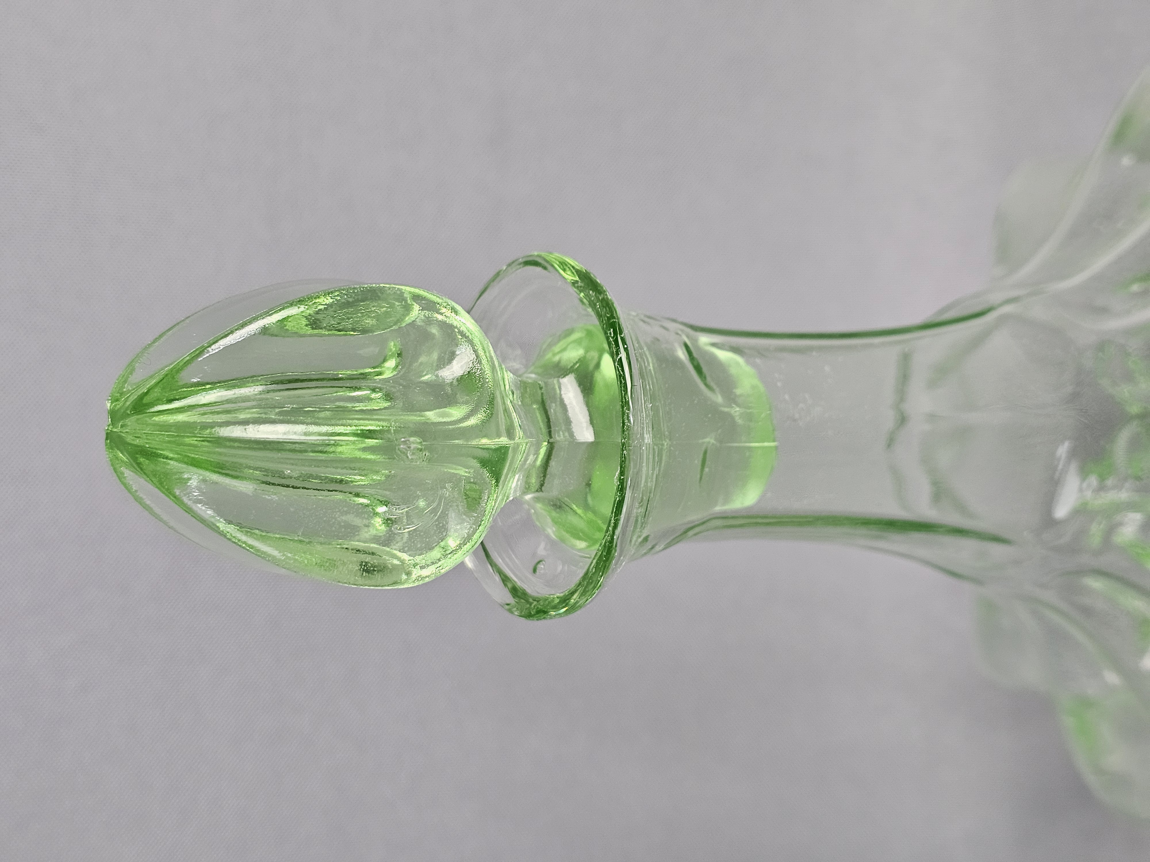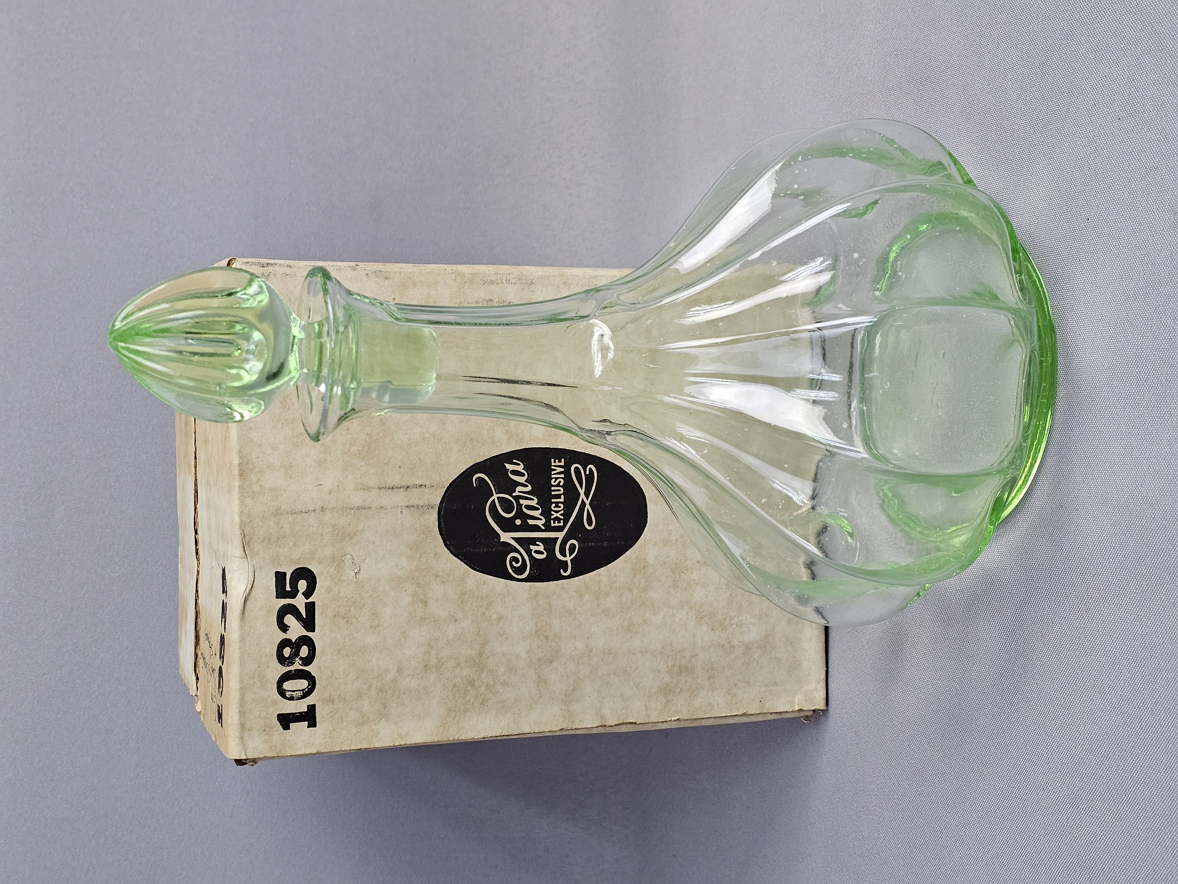 A vintage glass decanter with matching stopper produced for Tiara Exclusives, manufactured in the United States by the Indiana Glass Company. The set is made of transparent light green glass. The center of the base is embossed with the Tiara maker mark in stylized cursive script. The original cardboard box is included, featuring the Tiara Exclusive logo and stock number 10825. Height: 10.5 inches The decanter and stopper are in excellent vintage condition. No chips, cracks, or repairs are present. Minor internal residue is visible near the base, along with typical shelf wear to the underside. The original box shows significant age-related wear, including staining, scuffing, and structural damage to the top flaps.