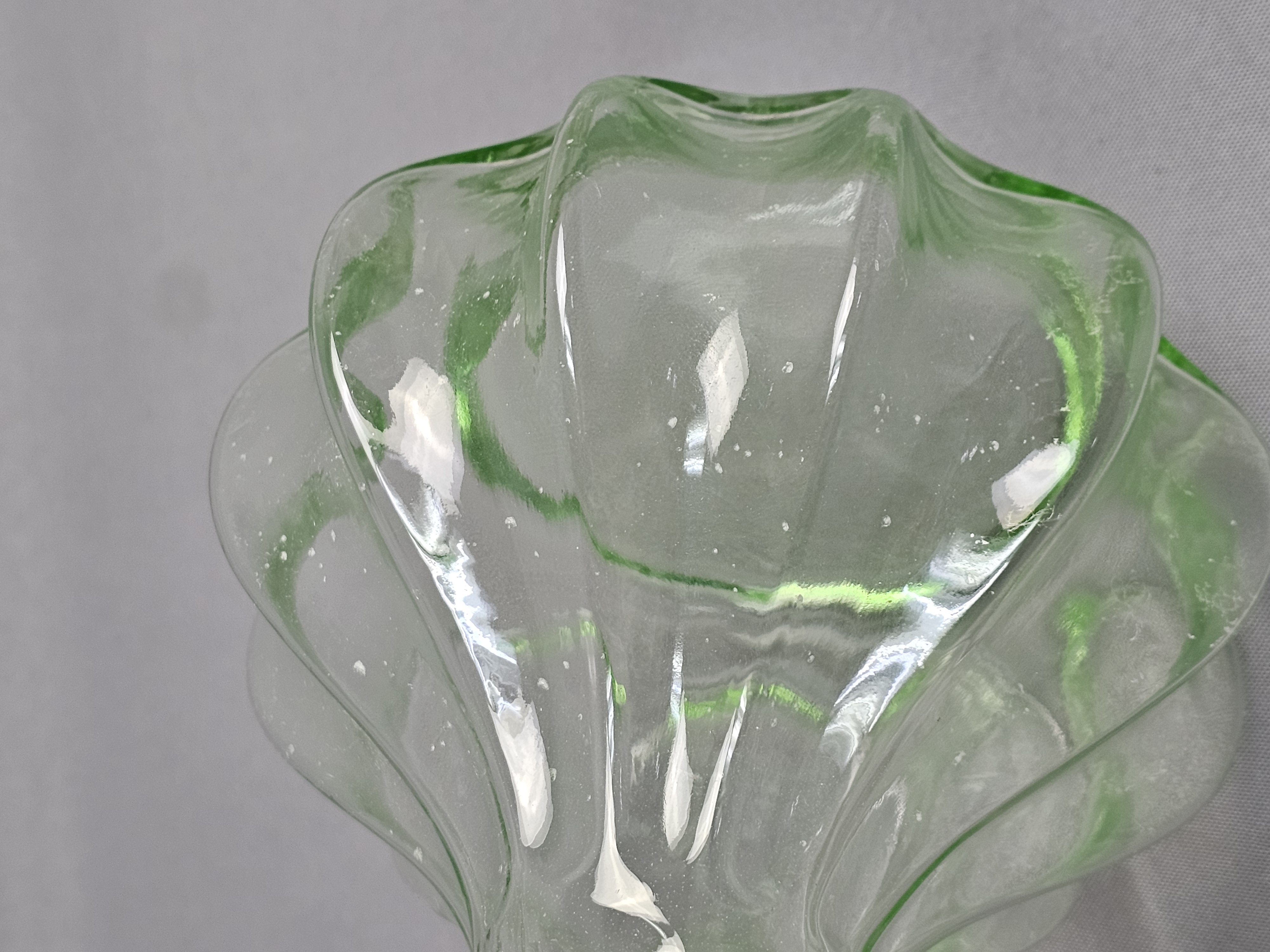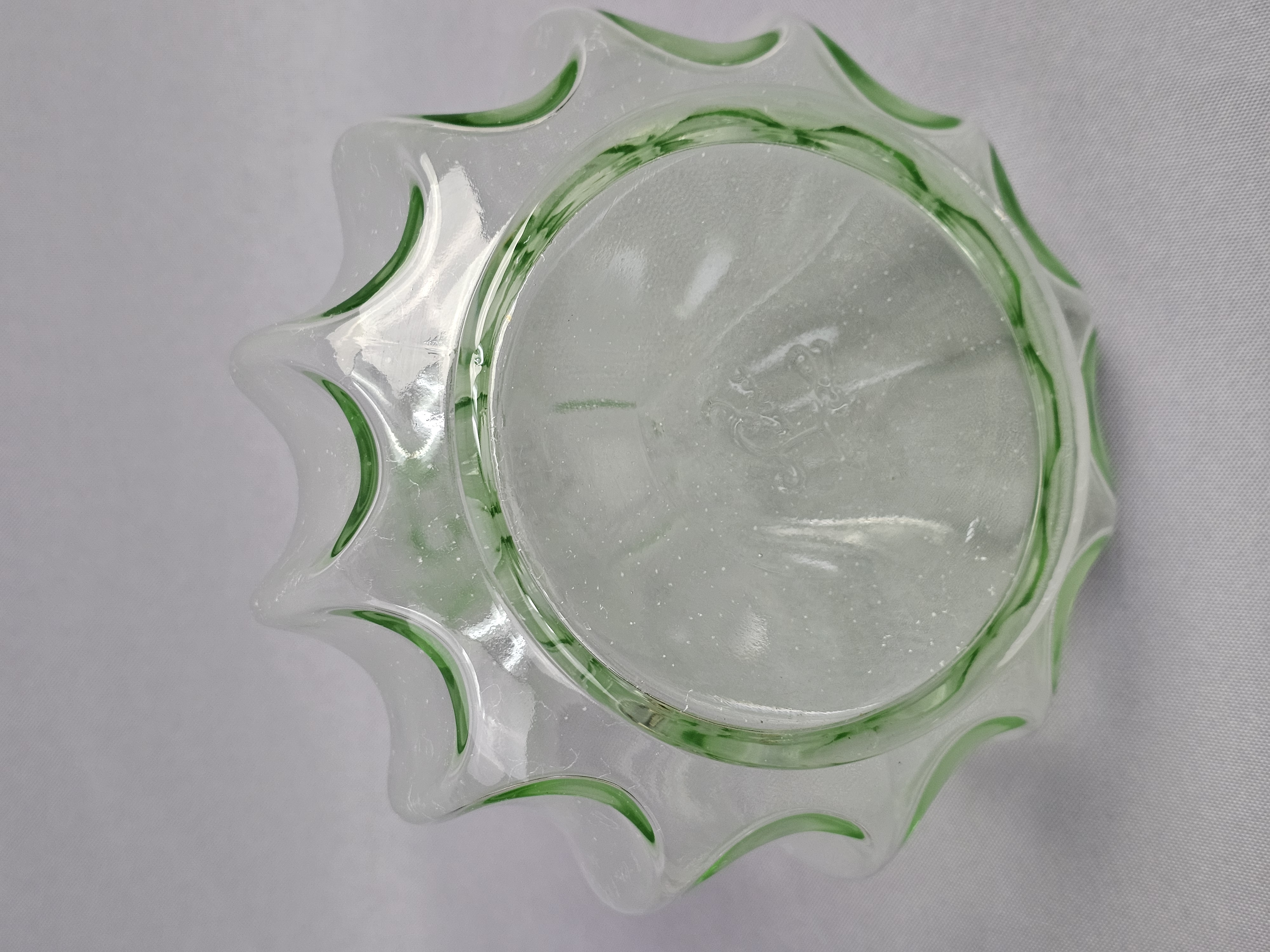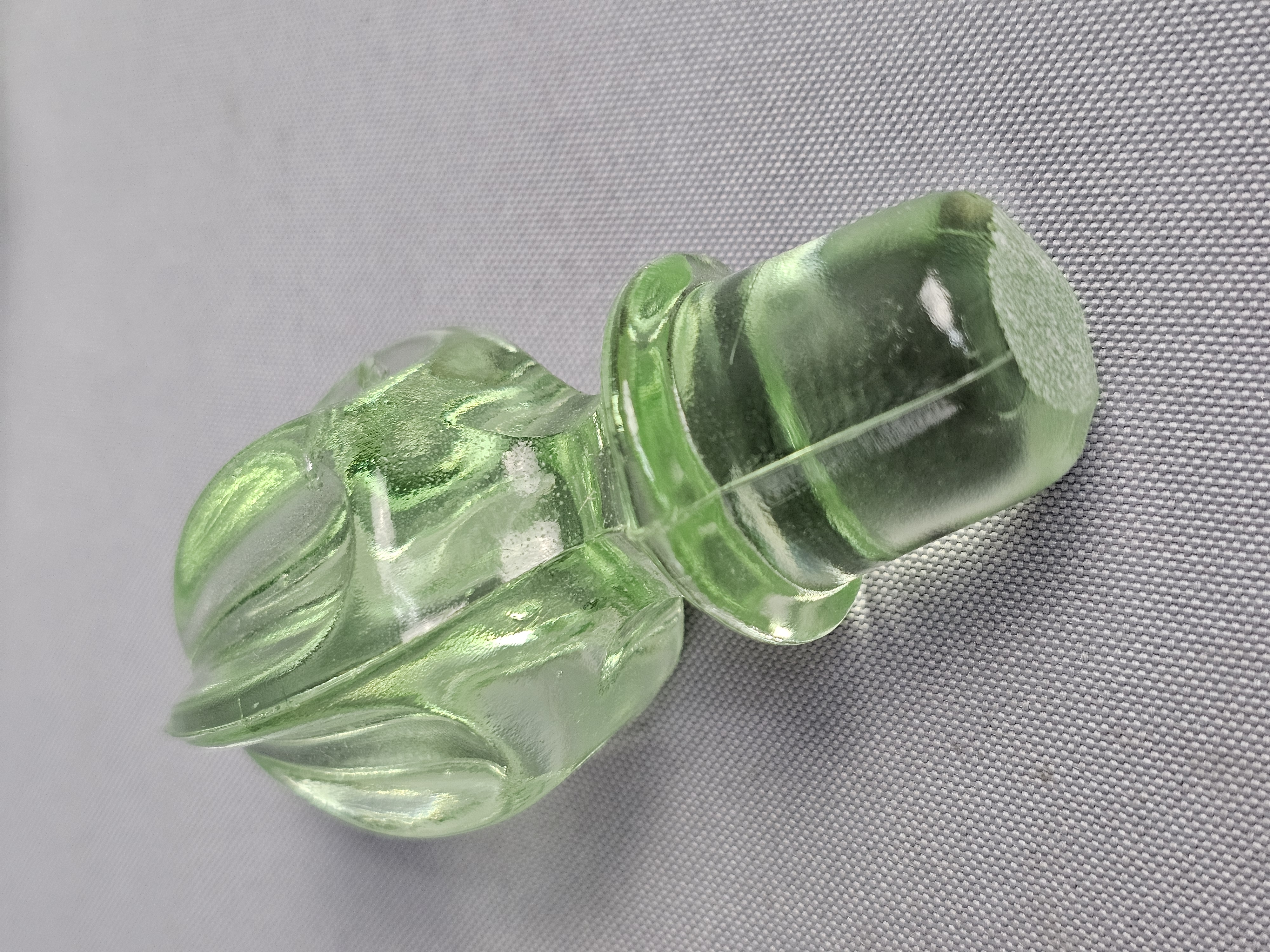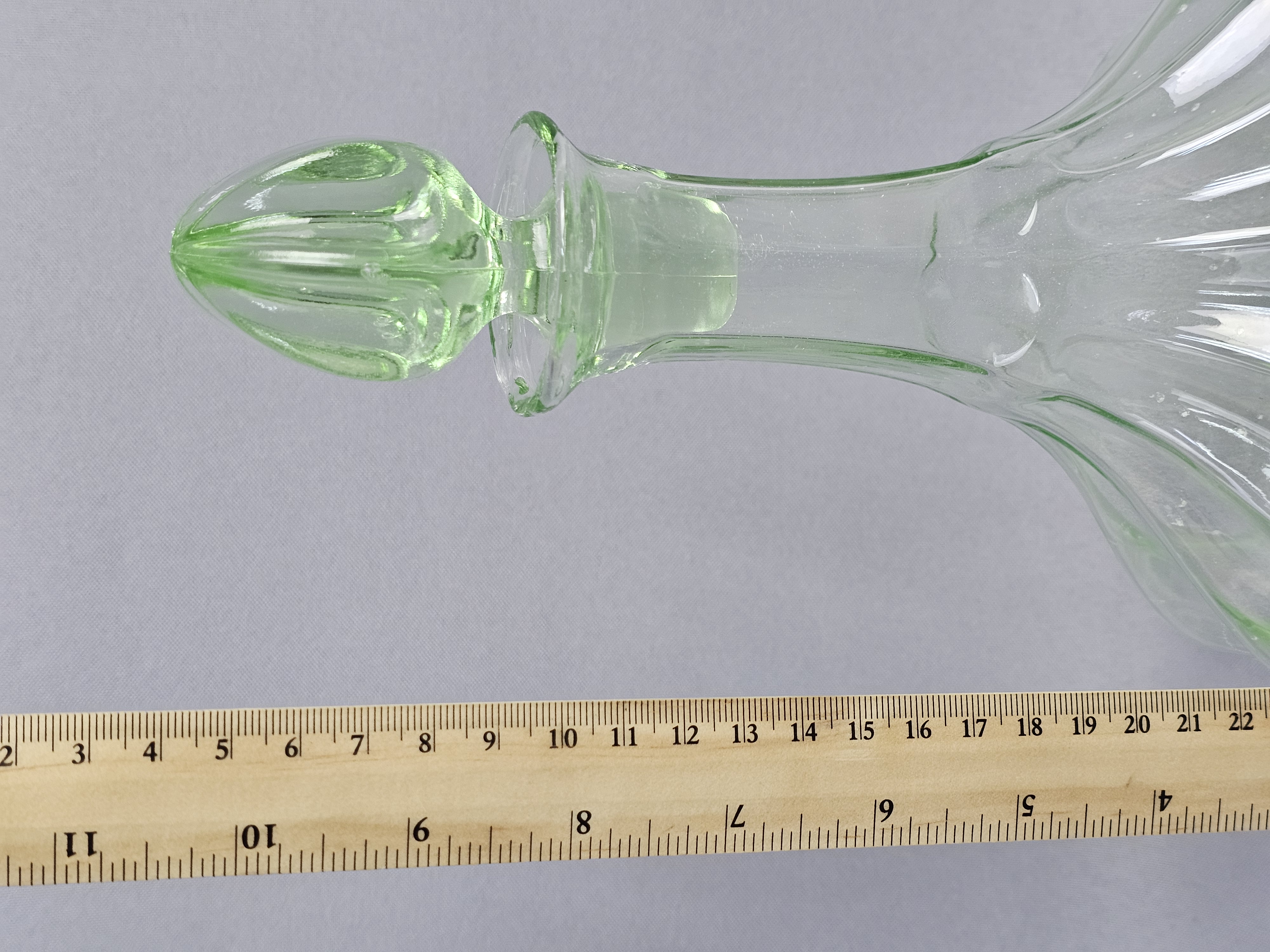 A vintage glass decanter with matching stopper produced for Tiara Exclusives, manufactured in the United States by the Indiana Glass Company. The set is made of transparent light green glass. The center of the base is embossed with the Tiara maker mark in stylized cursive script. The original cardboard box is included, featuring the Tiara Exclusive logo and stock number 10825. Height: 10.5 inches The decanter and stopper are in excellent vintage condition. No chips, cracks, or repairs are present. Minor internal residue is visible near the base, along with typical shelf wear to the underside. The original box shows significant age-related wear, including staining, scuffing, and structural damage to the top flaps.