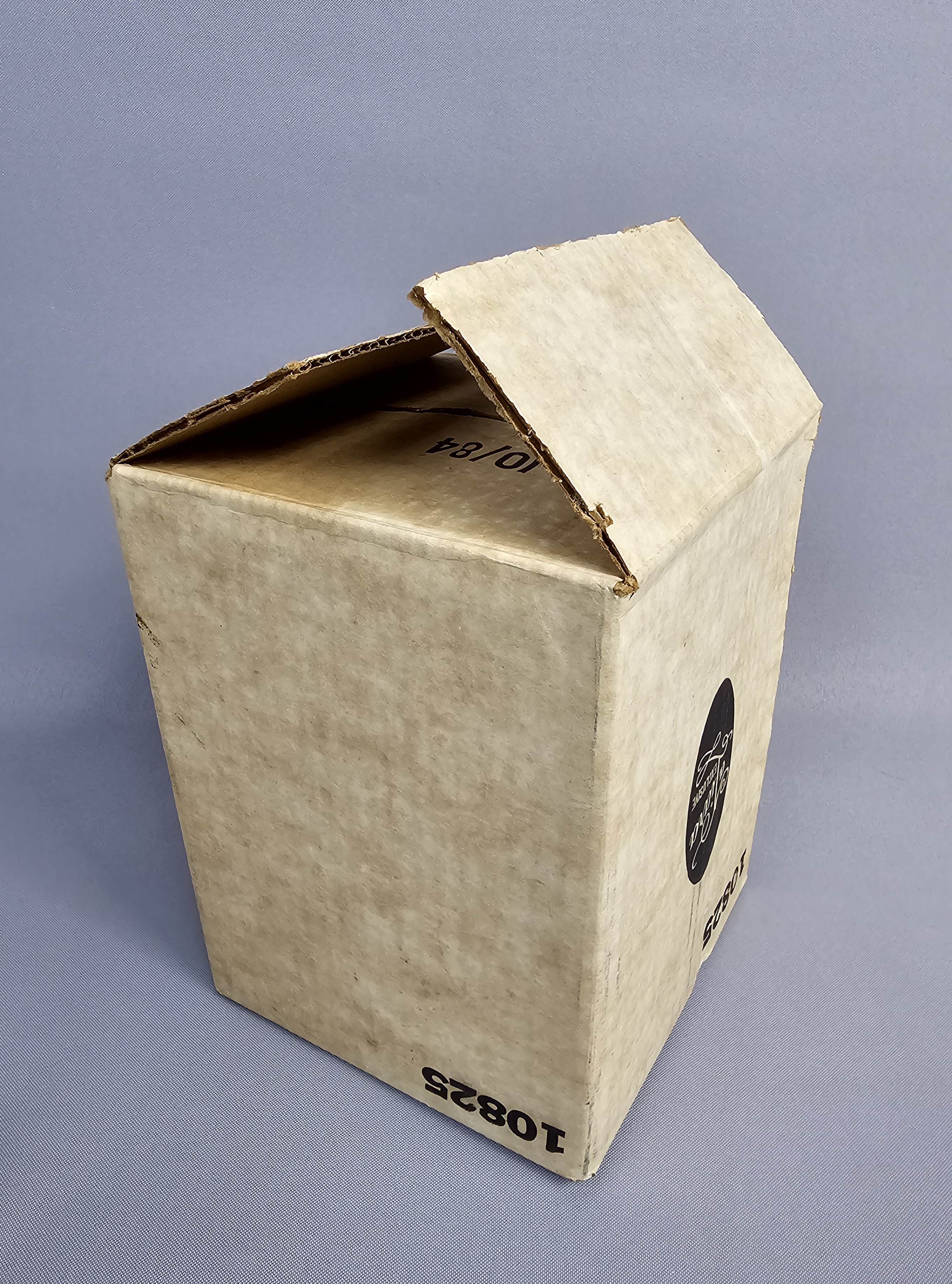 The decanter and stopper are in excellent vintage condition. No chips, cracks, or repairs are present. Minor internal residue is visible near the base, along with typical shelf wear to the underside. The original box shows significant age-related wear, including staining, scuffing, and structural damage to the top flaps.