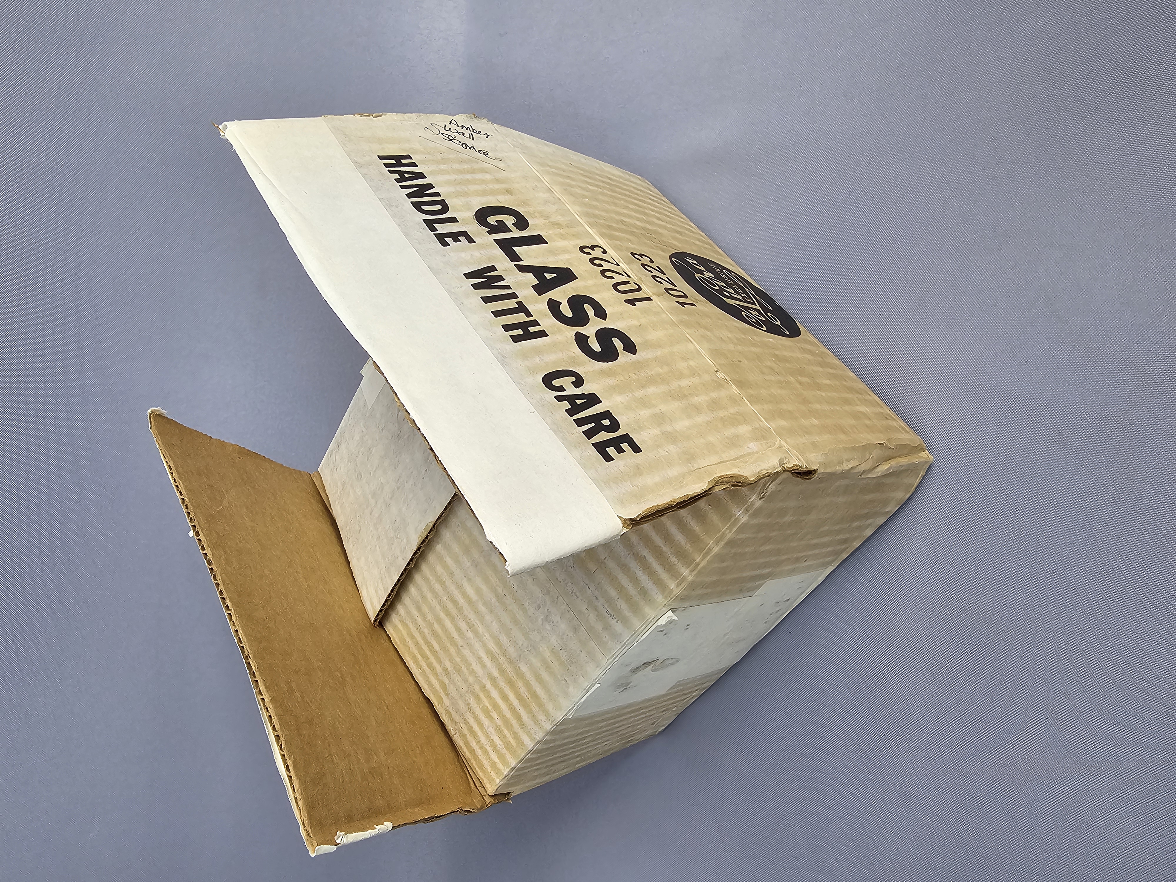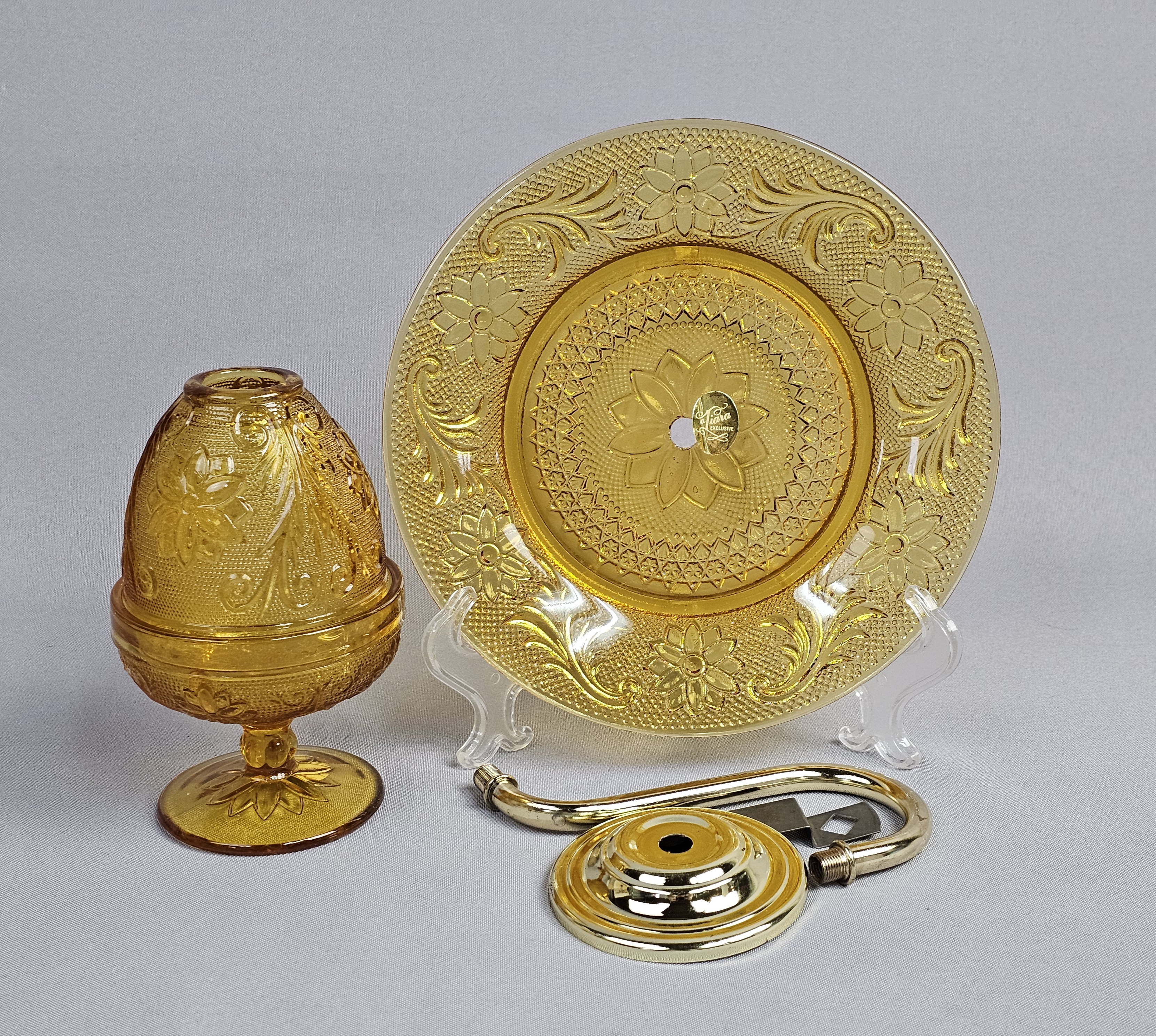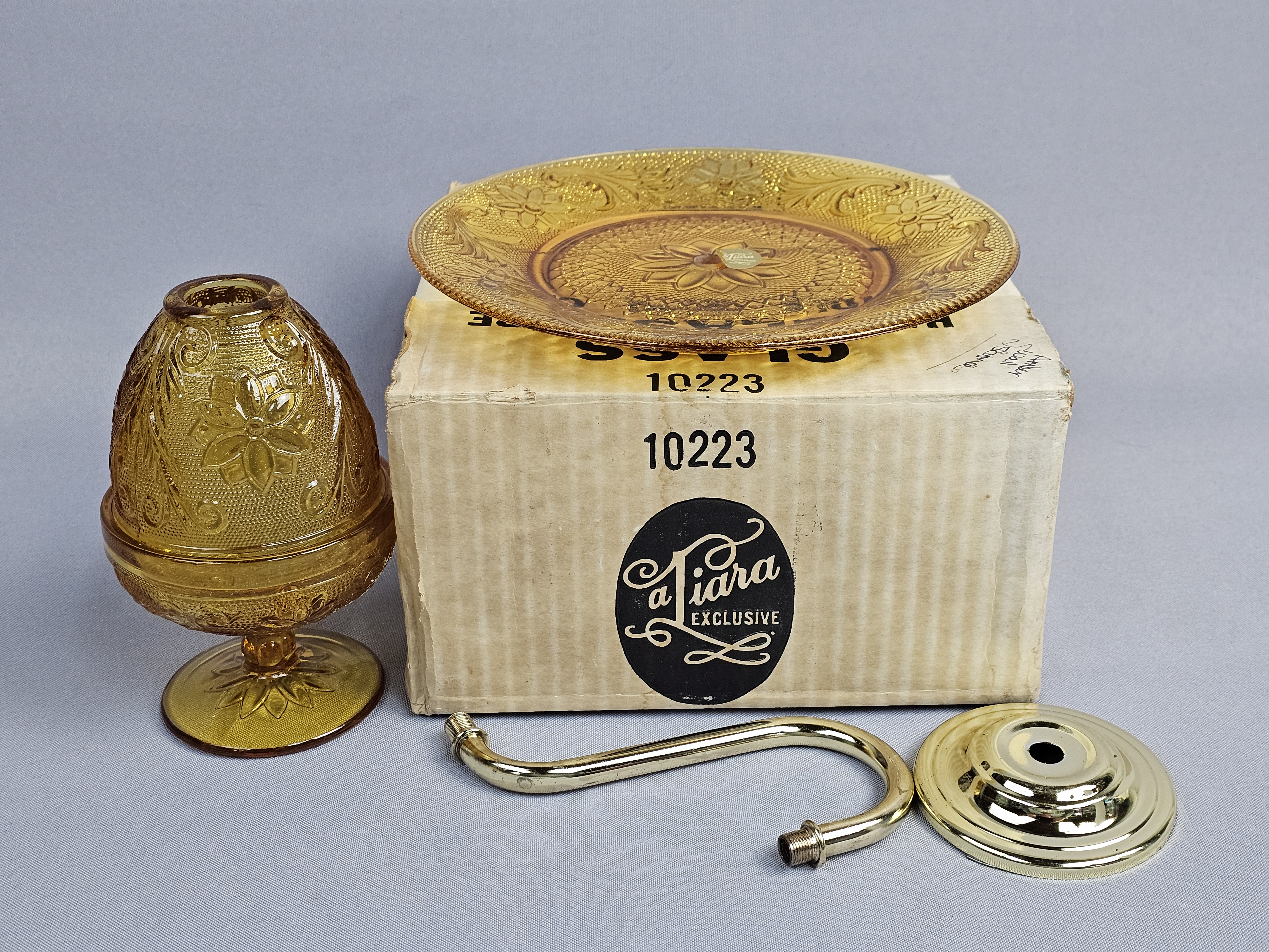 A Tiara Exclusives wall sconce set in the Sandwich pattern, manufactured in amber-colored pressed glass. The original manufacturer’s box, marked with item number 10223, and the original assembly instruction sheet are present. Gold foil labels are affixed to the glass components. Backplate: 8 inches in diameter Assembled Votive Holder: 6 inches in height. Good vintage condition. Small chips on center hole of backplate. Metal hardware shows no significant tarnish or wear. The original instruction sheet is present and legible. The original box shows moderate shelf wear, including creasing and minor tearing to the flaps.