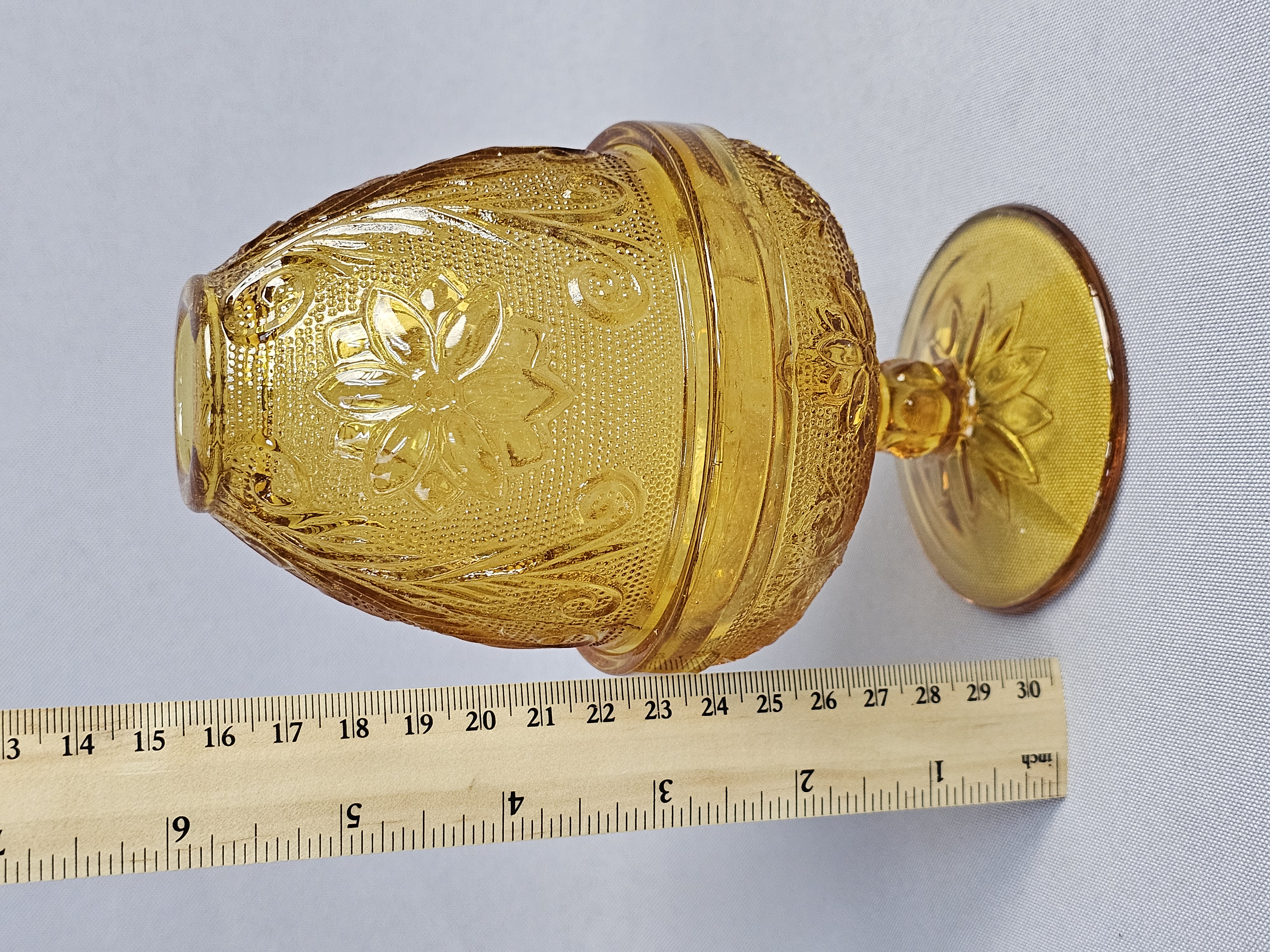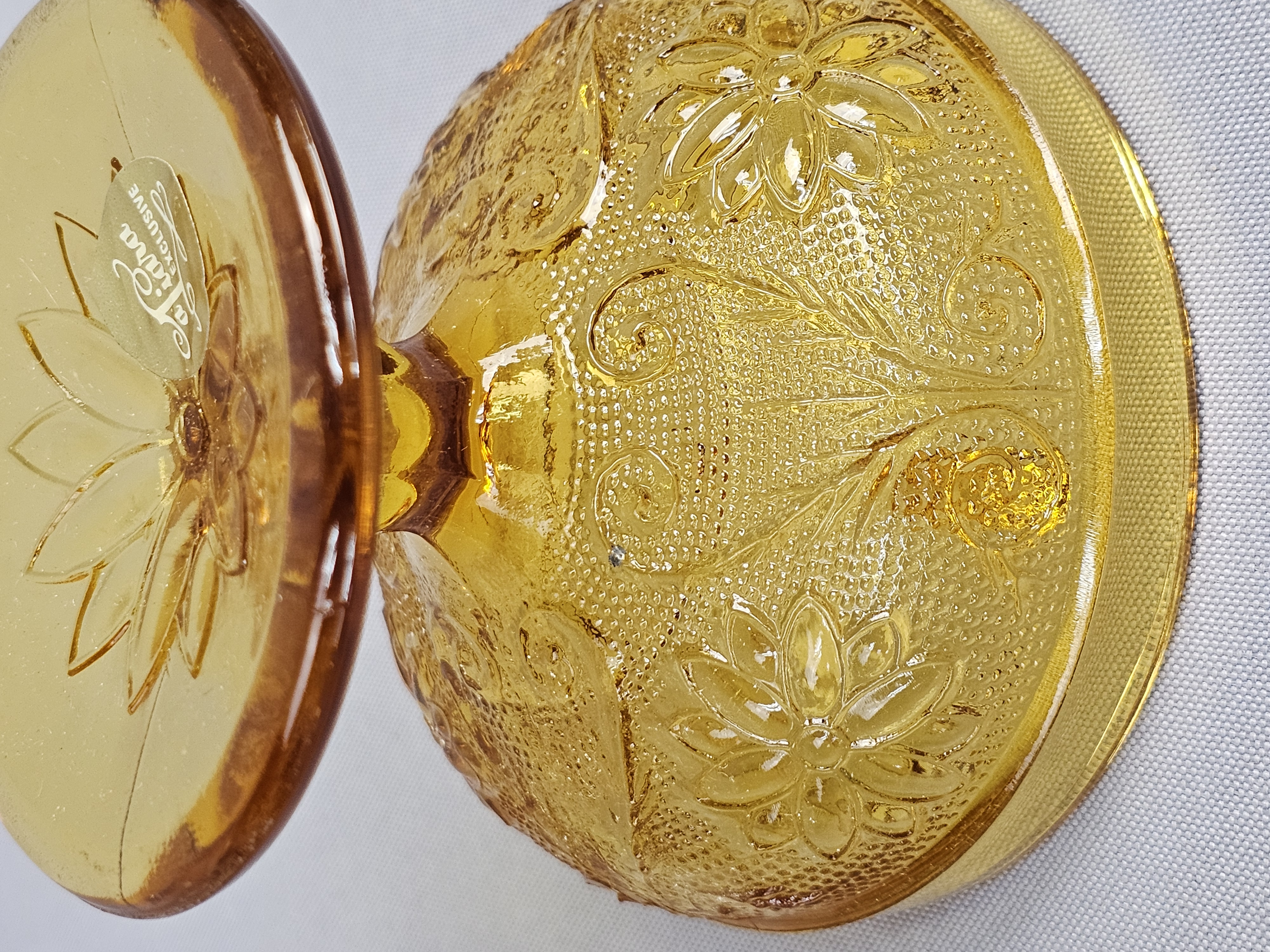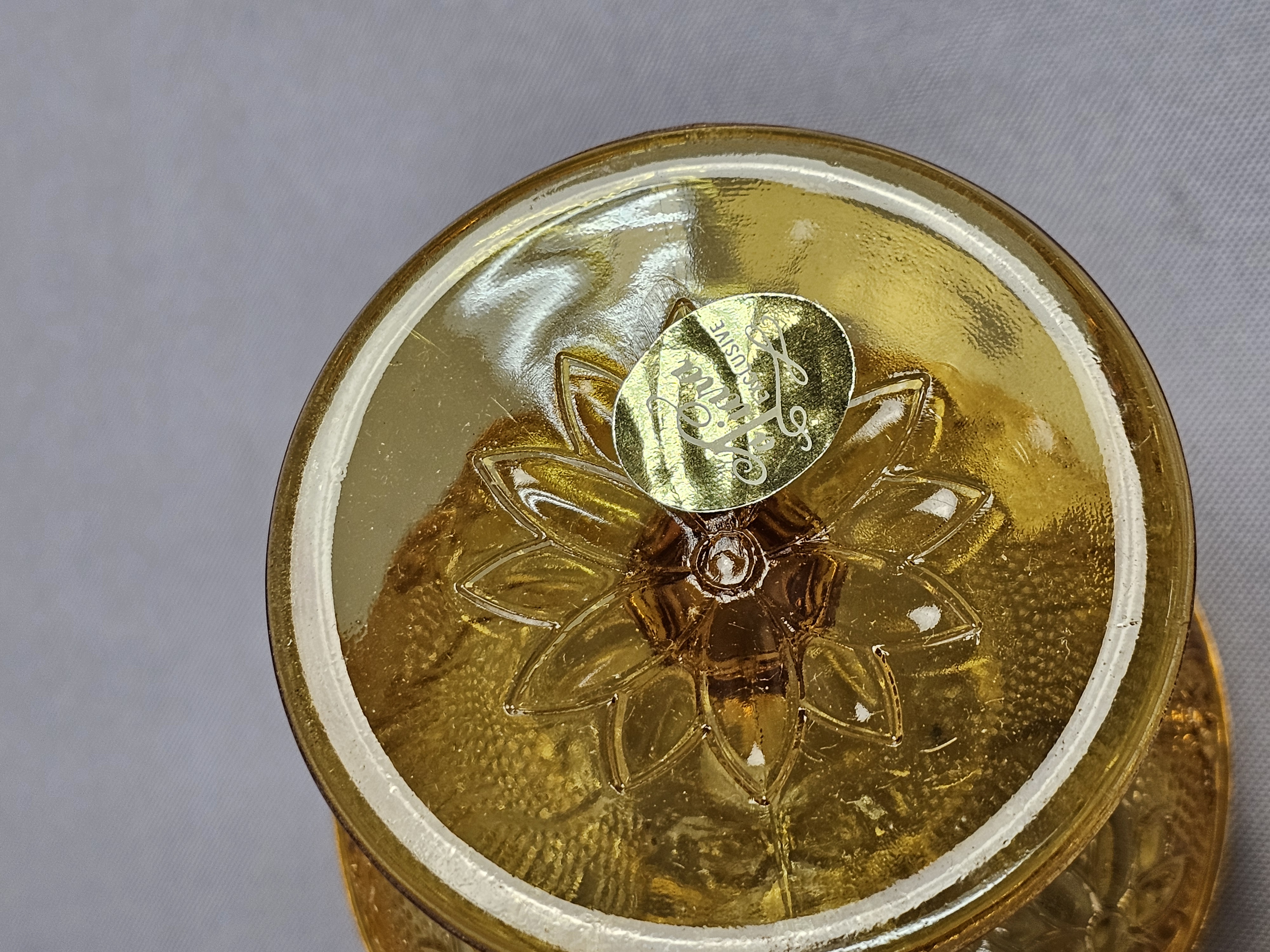 A Tiara Exclusives wall sconce set in the Sandwich pattern, manufactured in amber-colored pressed glass. The original manufacturer’s box, marked with item number 10223, and the original assembly instruction sheet are present. Gold foil labels are affixed to the glass components. Backplate: 8 inches in diameter Assembled Votive Holder: 6 inches in height. Good vintage condition. Small chips on center hole of backplate. Metal hardware shows no significant tarnish or wear. The original instruction sheet is present and legible. The original box shows moderate shelf wear, including creasing and minor tearing to the flaps.