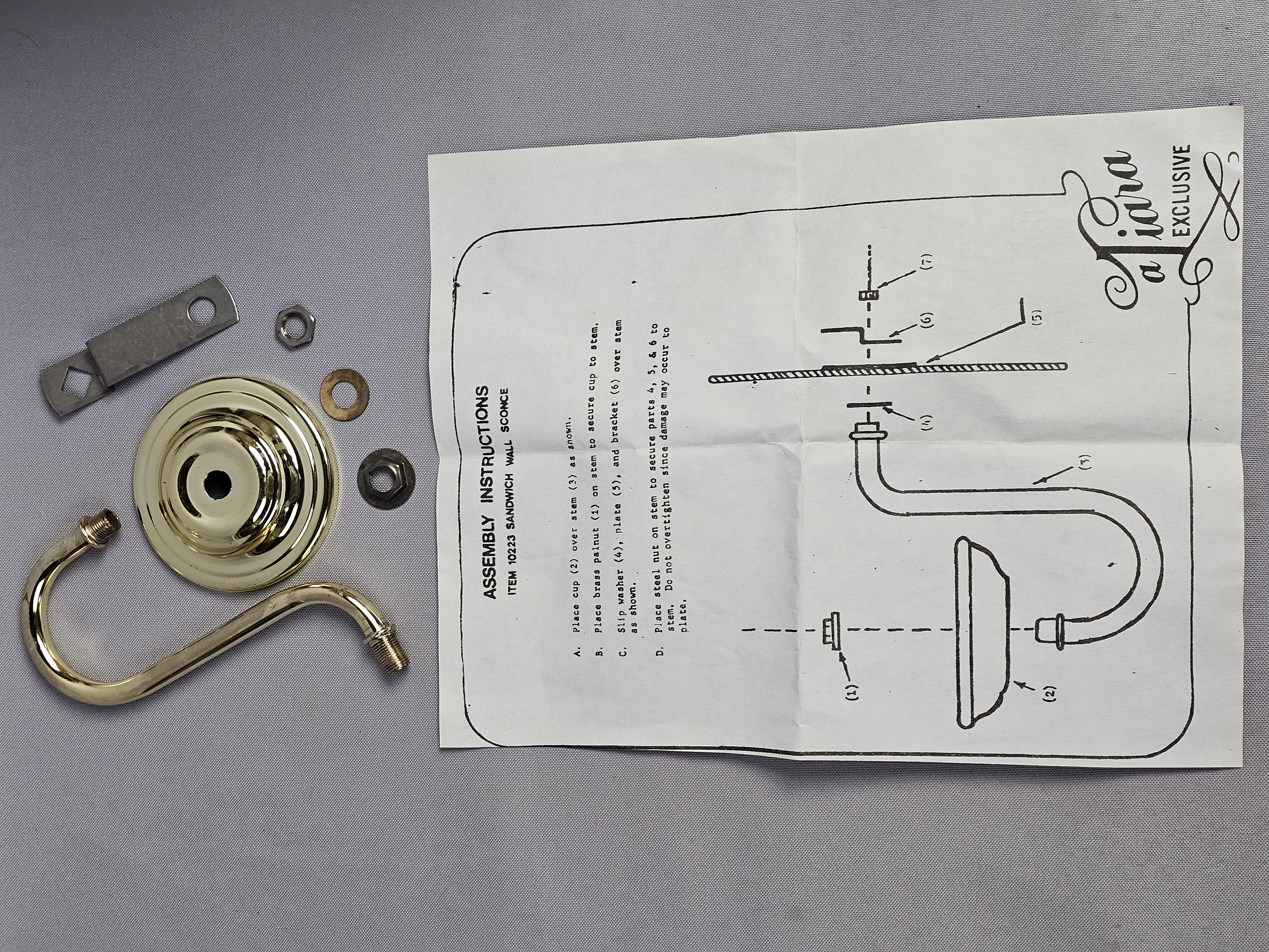 Good vintage condition. Small chips on center hole of backplate. Metal hardware shows no significant tarnish or wear. The original instruction sheet is present and legible. The original box shows moderate shelf wear, including creasing and minor tearing to the flaps.