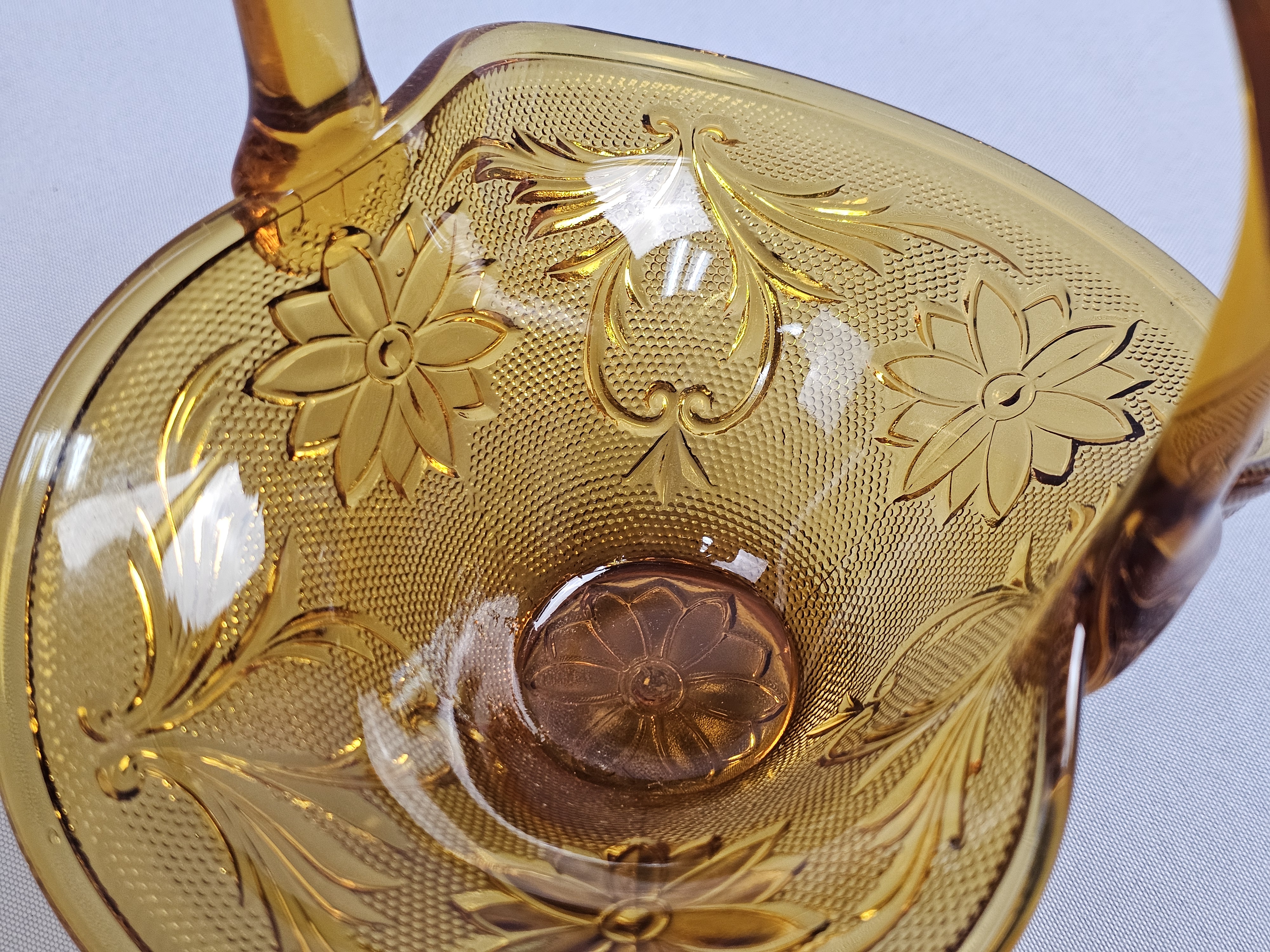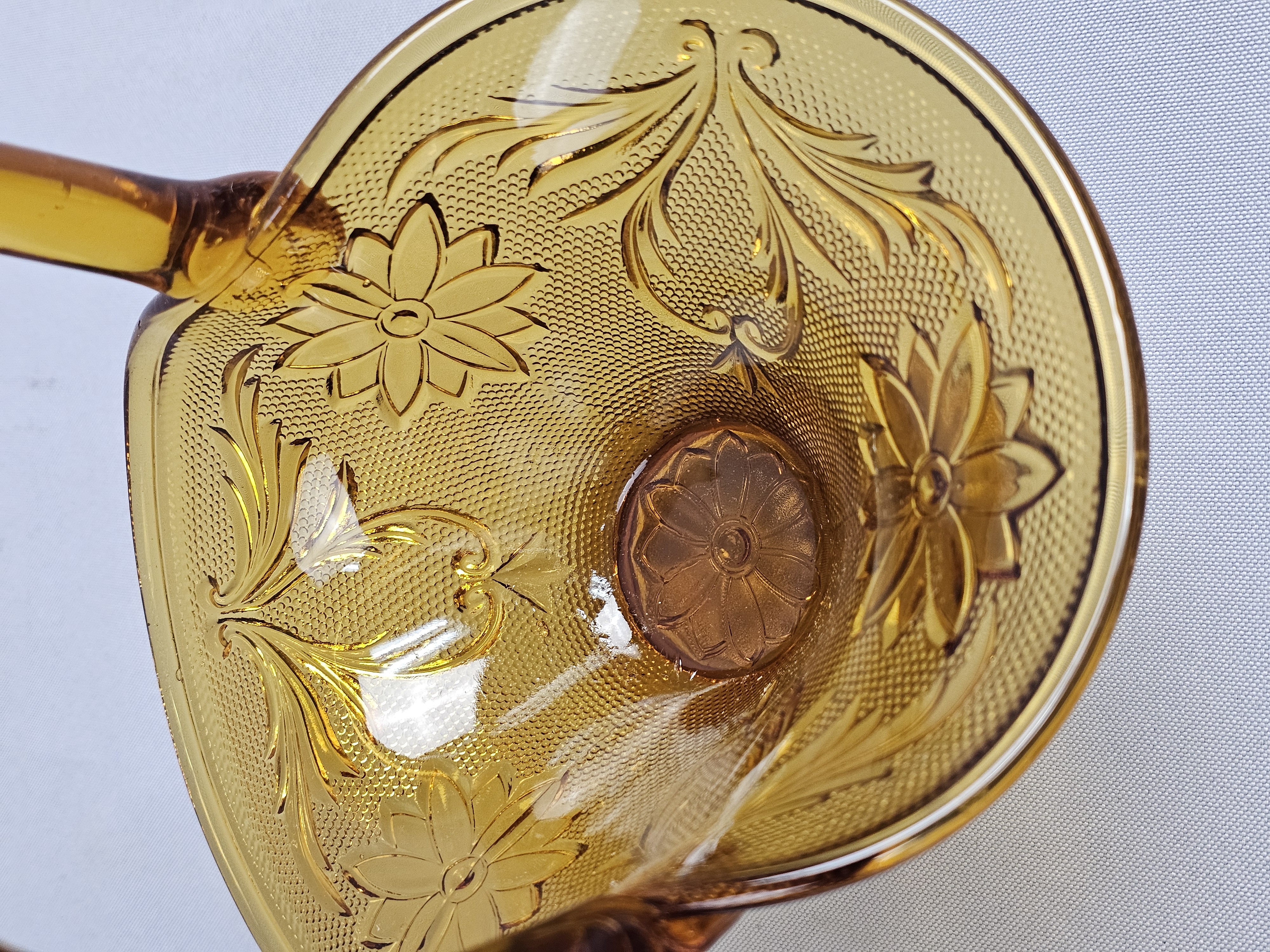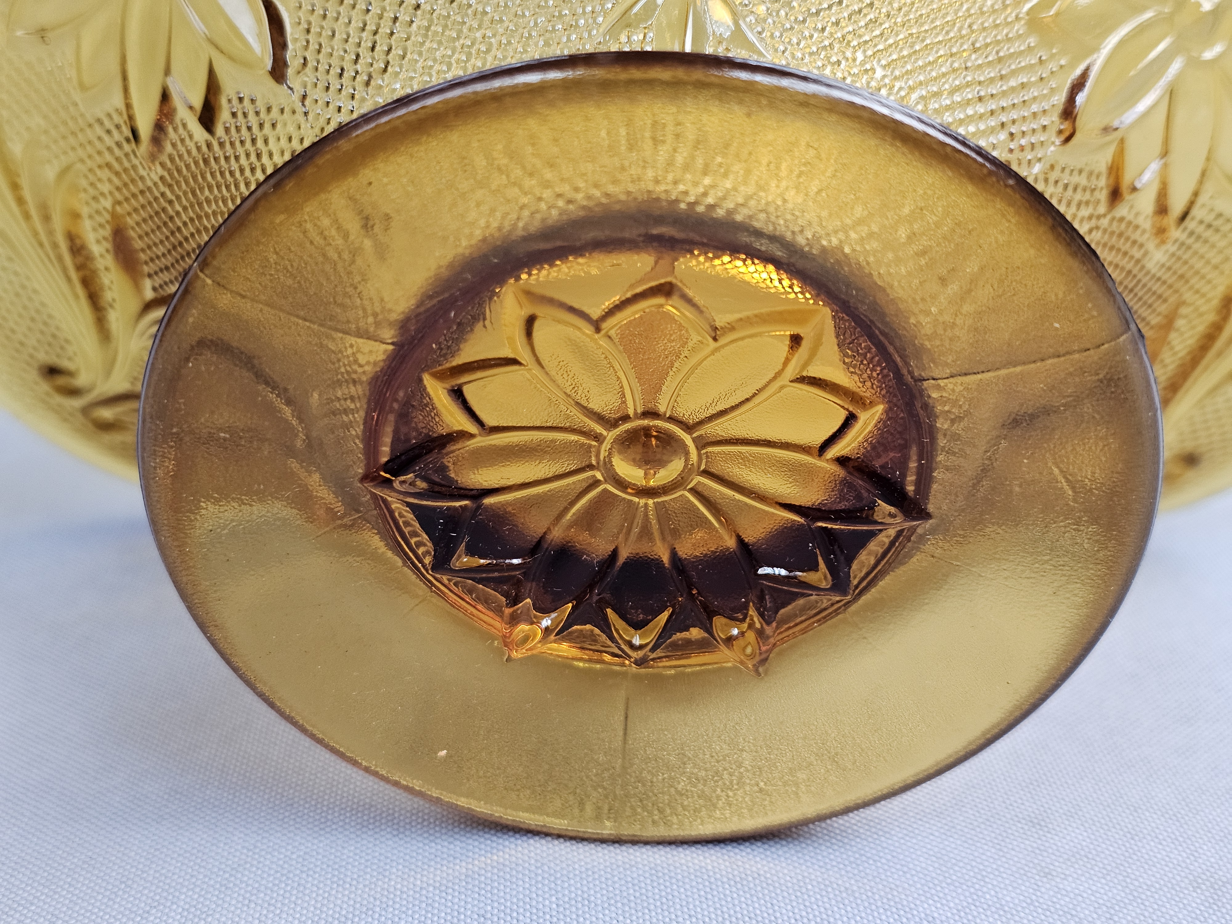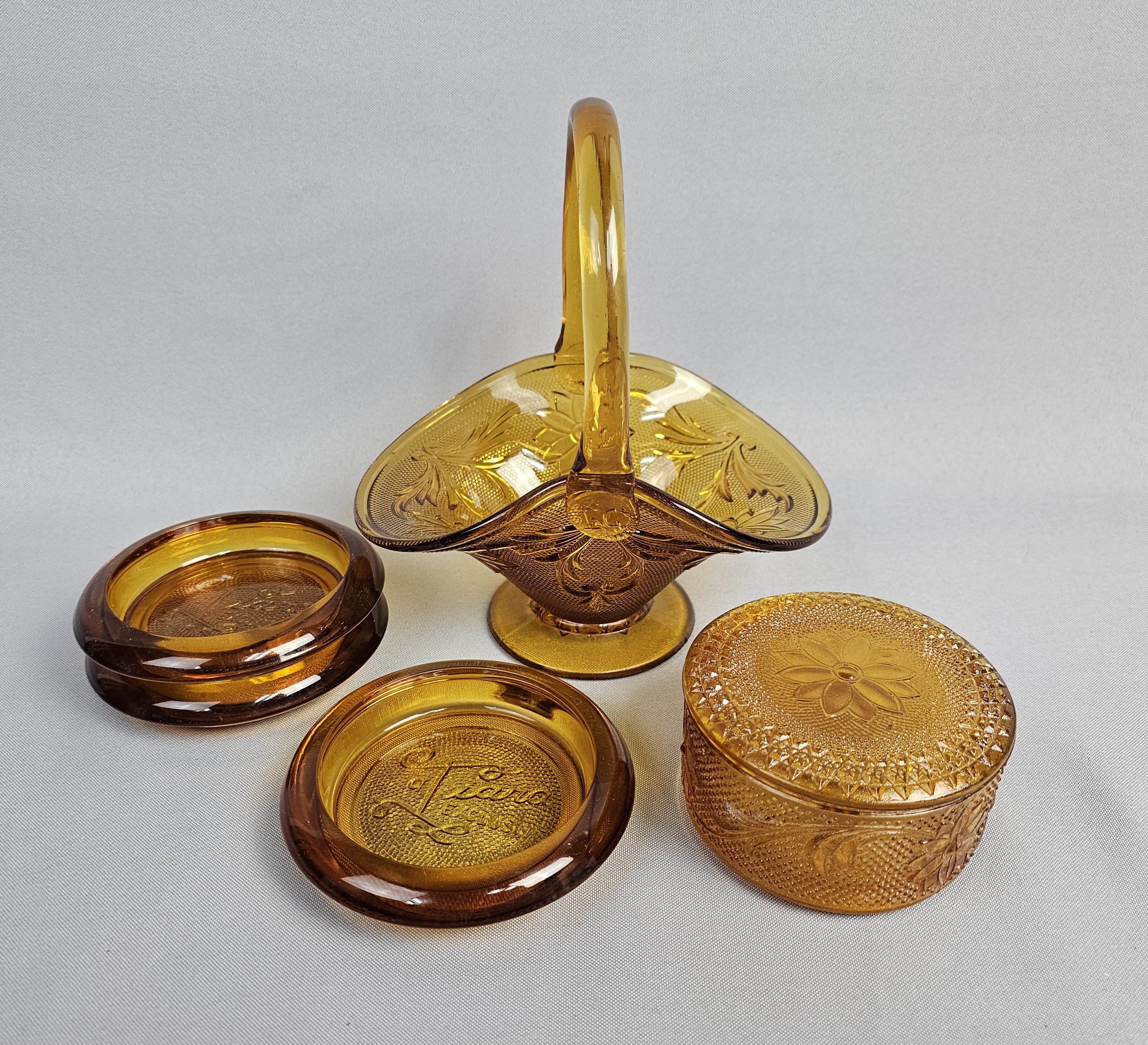 This collection of pressed glassware is produced in the Sandwich pattern by Indiana Glass for Tiara Exclusives. The items are made of amber-colored glass and feature a design of floral and scrolling leaf motifs against a stippled background. Footed Basket: 8 inches tall Covered Jar: 3.5 inches diameter Coasters: 4 inches diameter The collection is in good vintage condition. There is minor surface wear and light scratching consistent with age. Small flea bites and roughness are visible on the inner seating rim of the covered jar base. No major chips, cracks, or repairs are noted.