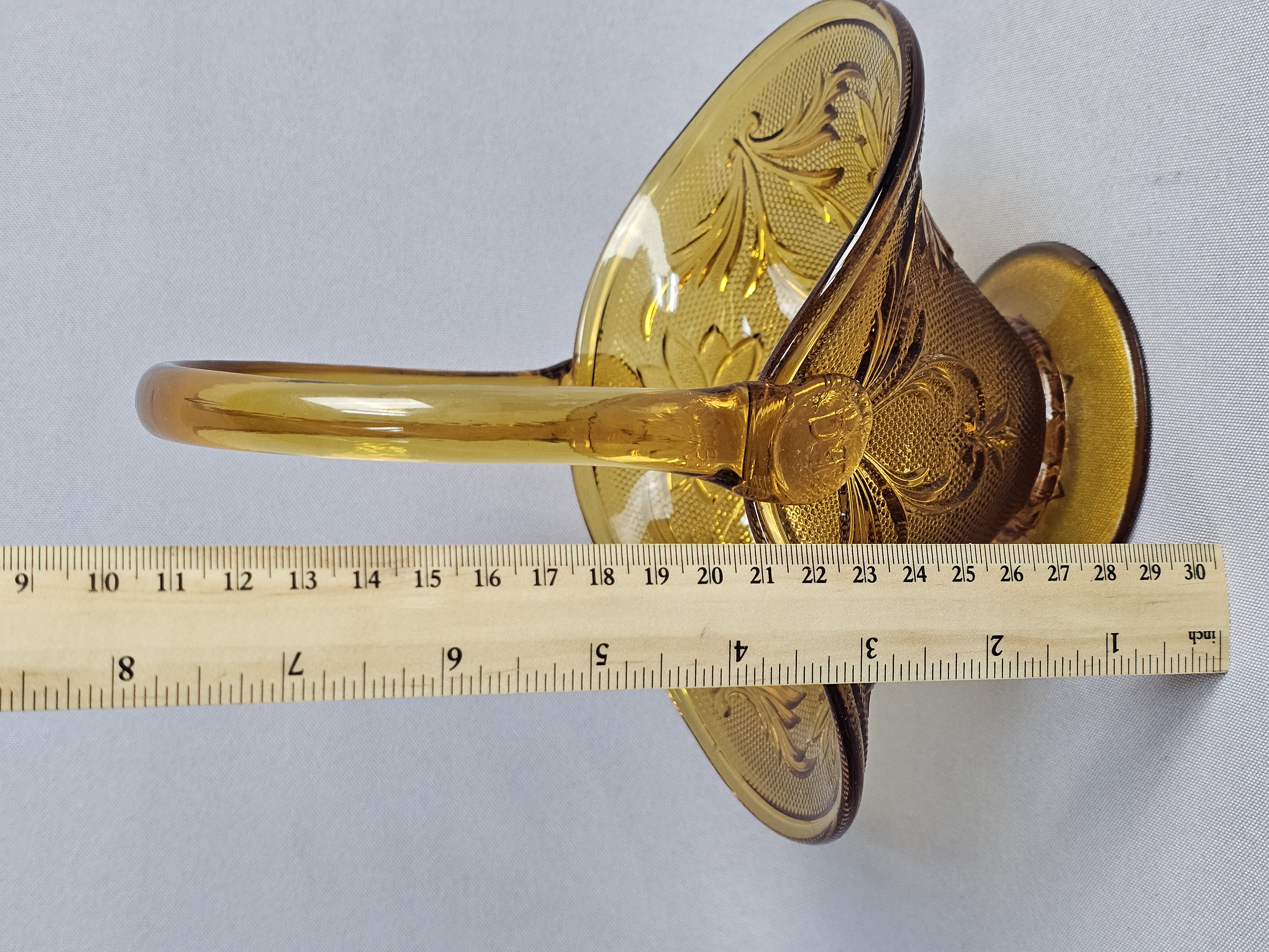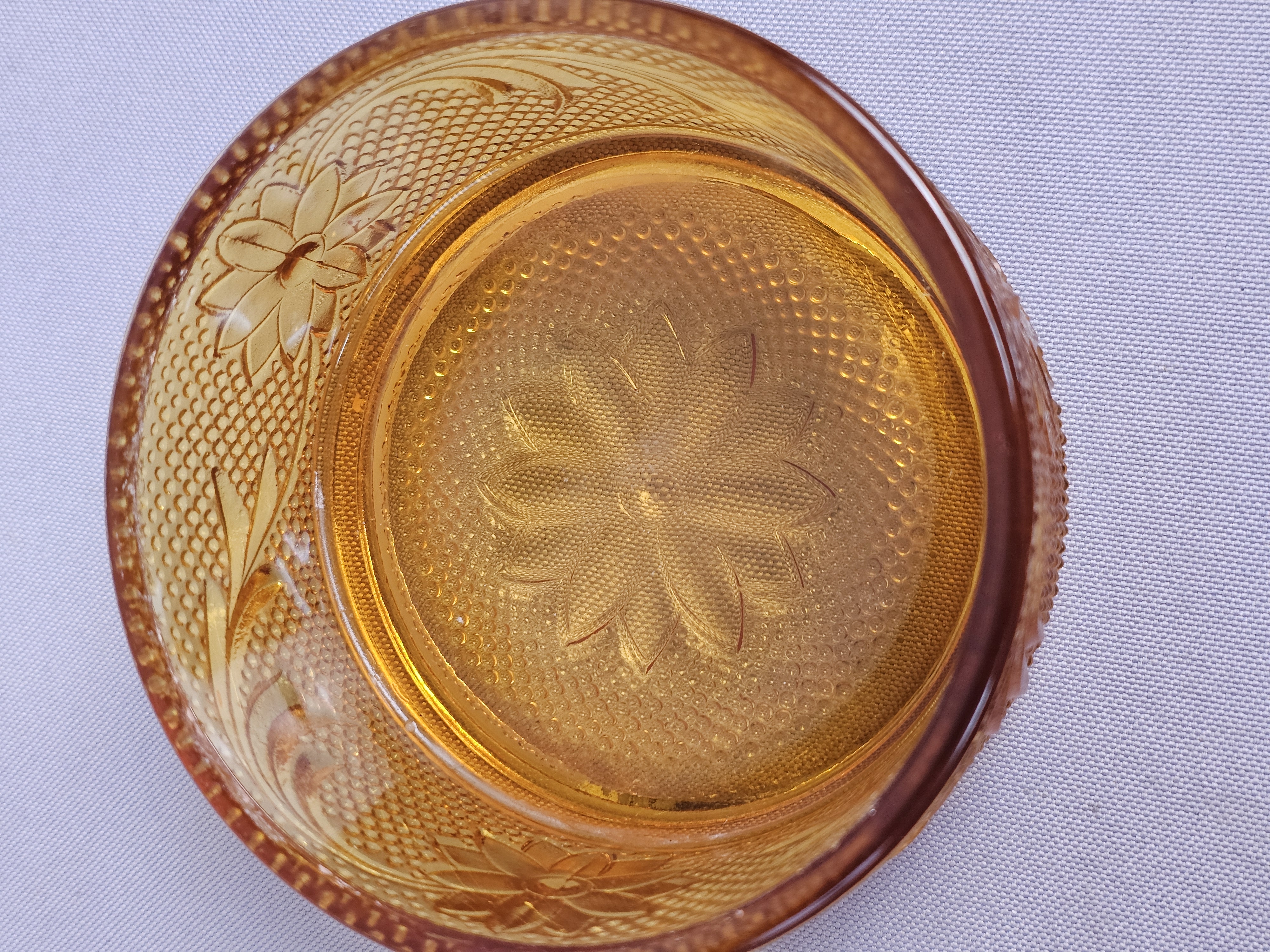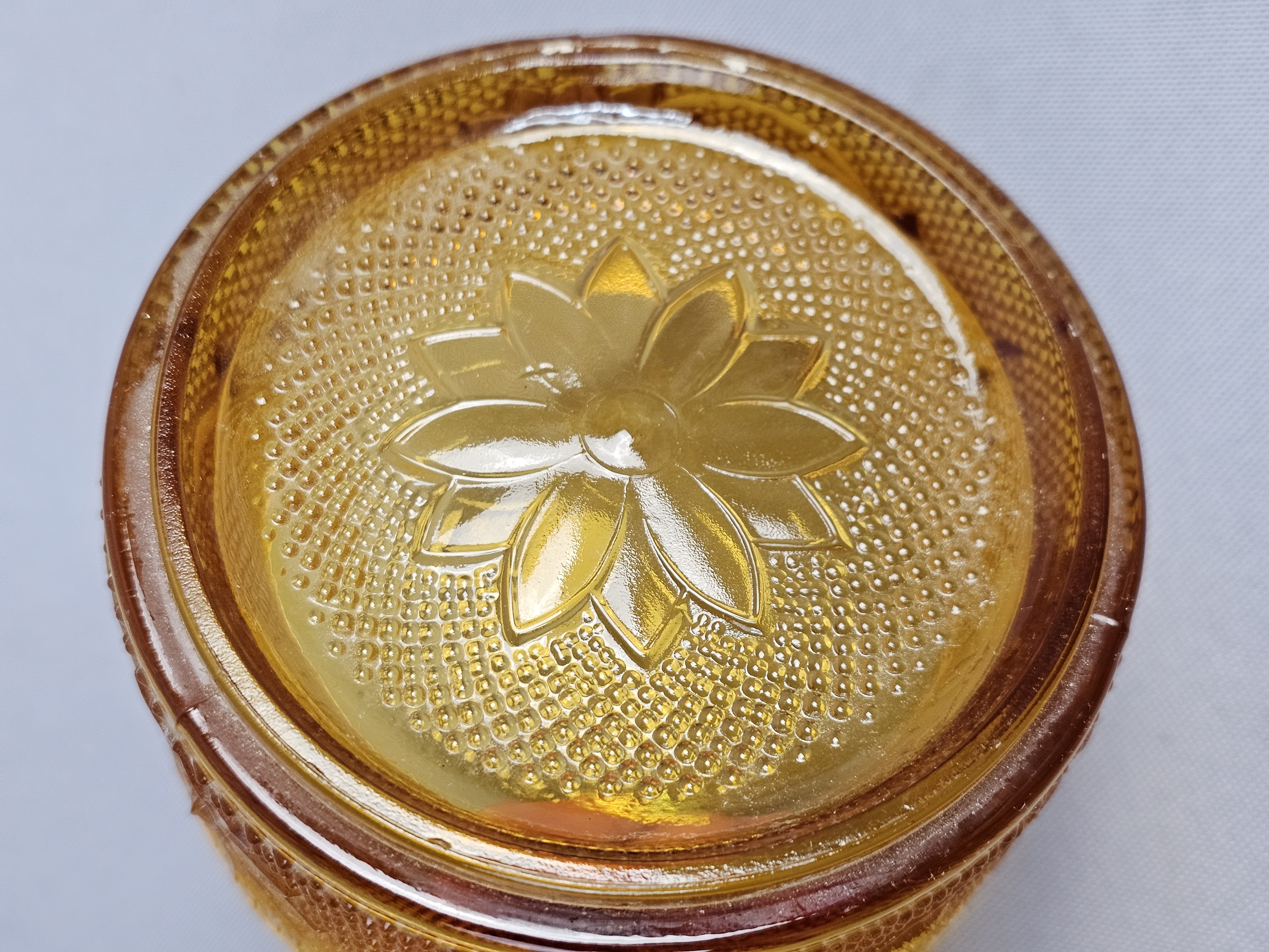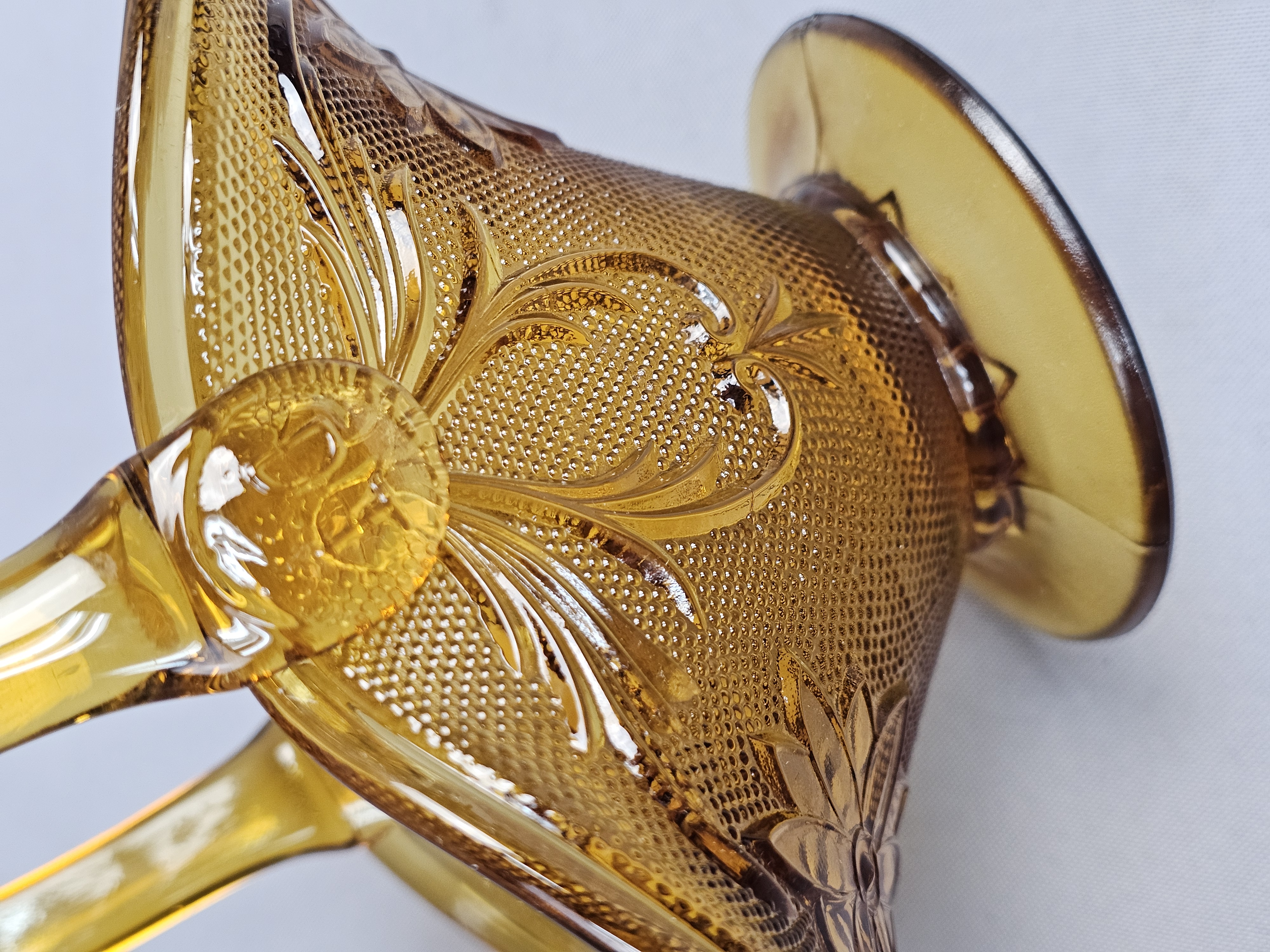 This collection of pressed glassware is produced in the Sandwich pattern by Indiana Glass for Tiara Exclusives. The items are made of amber-colored glass and feature a design of floral and scrolling leaf motifs against a stippled background. Footed Basket: 8 inches tall Covered Jar: 3.5 inches diameter Coasters: 4 inches diameter The collection is in good vintage condition. There is minor surface wear and light scratching consistent with age. Small flea bites and roughness are visible on the inner seating rim of the covered jar base. No major chips, cracks, or repairs are noted.