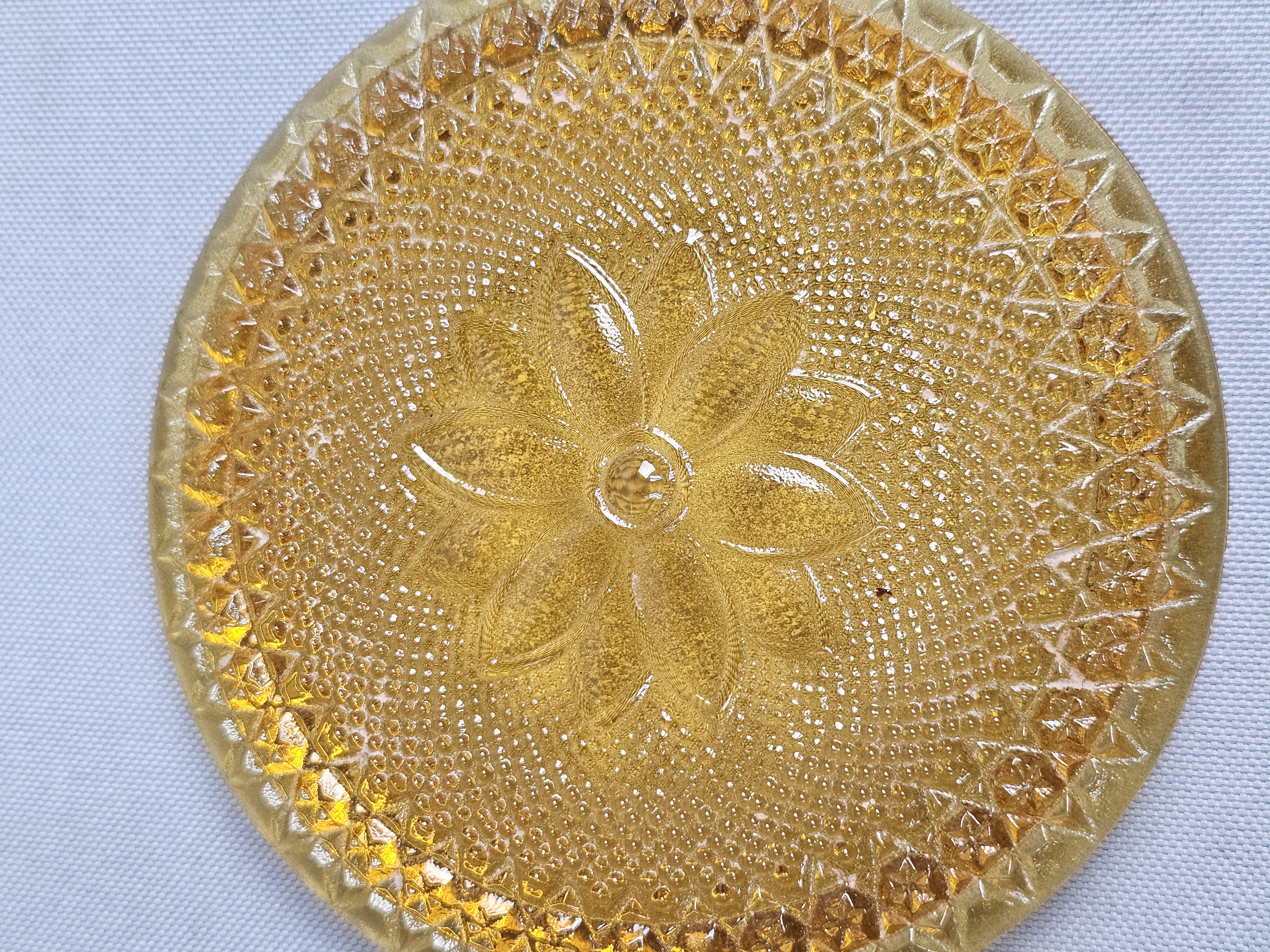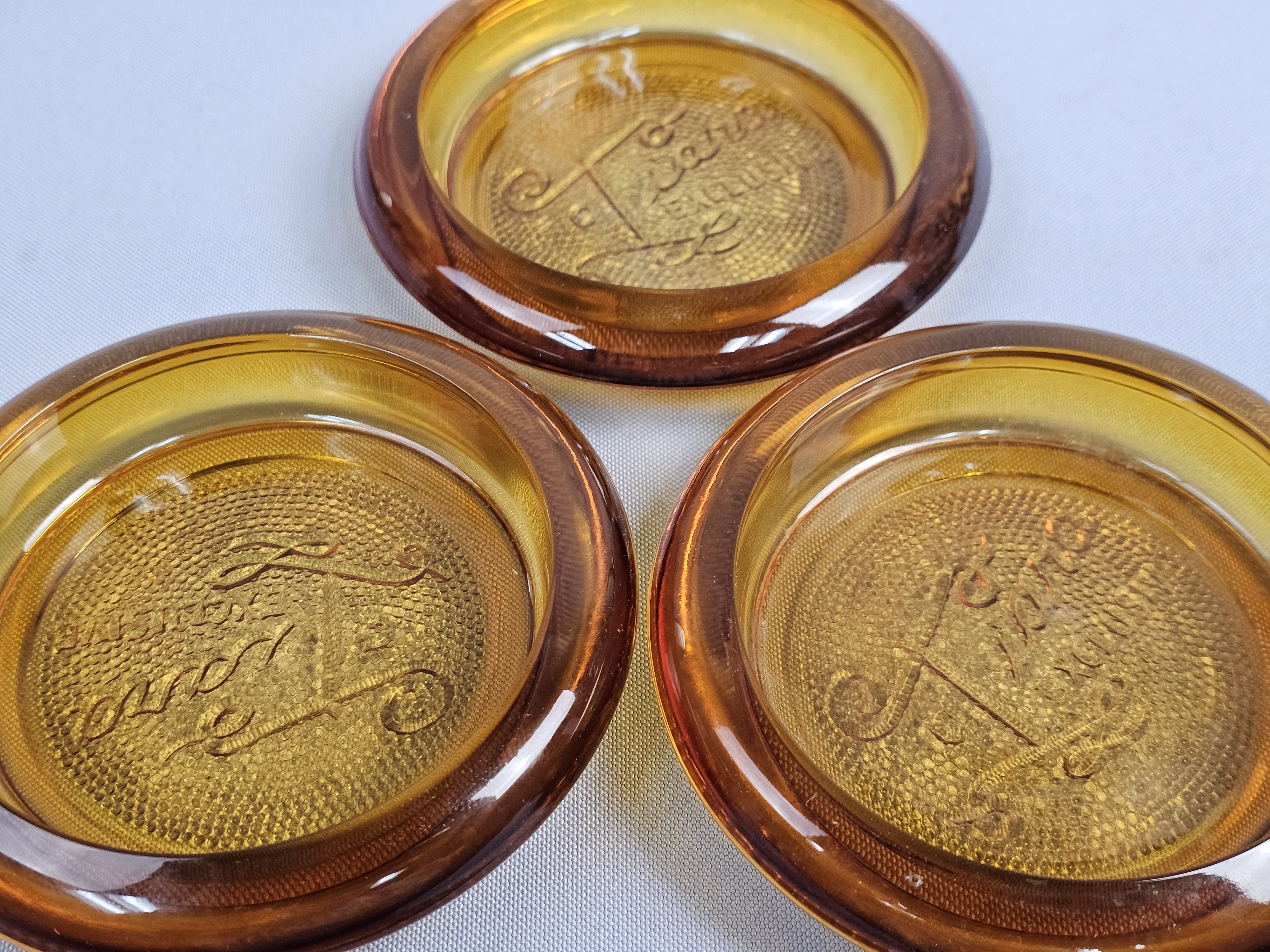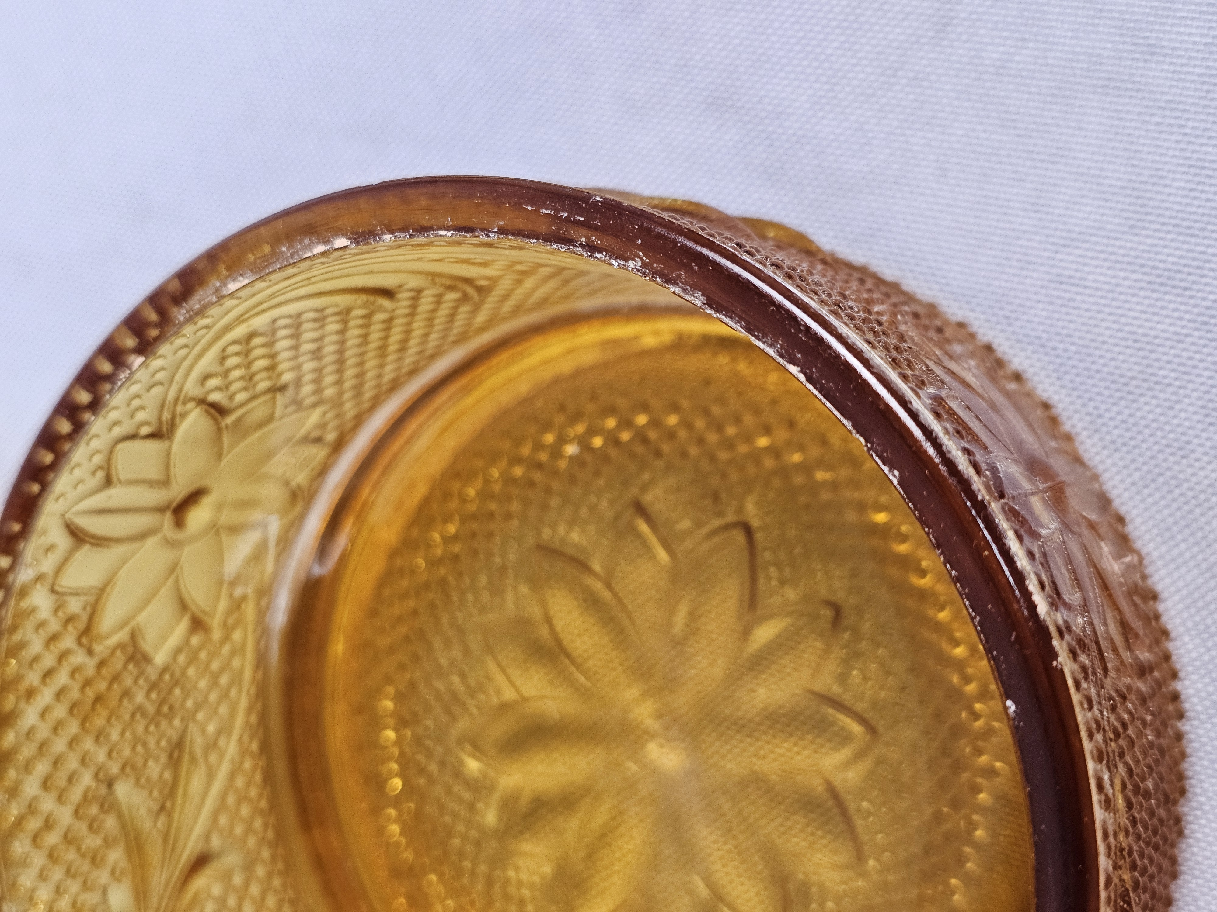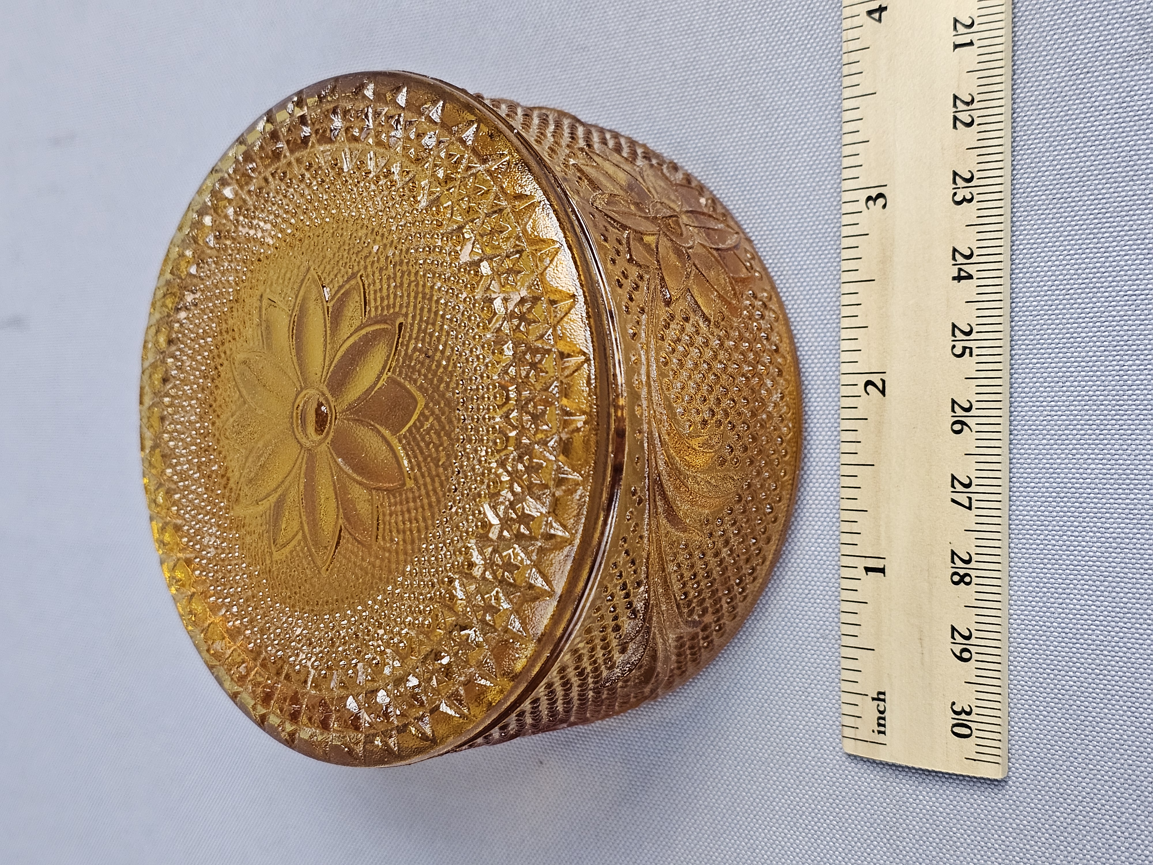 This collection of pressed glassware is produced in the Sandwich pattern by Indiana Glass for Tiara Exclusives. The items are made of amber-colored glass and feature a design of floral and scrolling leaf motifs against a stippled background. Footed Basket: 8 inches tall Covered Jar: 3.5 inches diameter Coasters: 4 inches diameter The collection is in good vintage condition. There is minor surface wear and light scratching consistent with age. Small flea bites and roughness are visible on the inner seating rim of the covered jar base. No major chips, cracks, or repairs are noted.