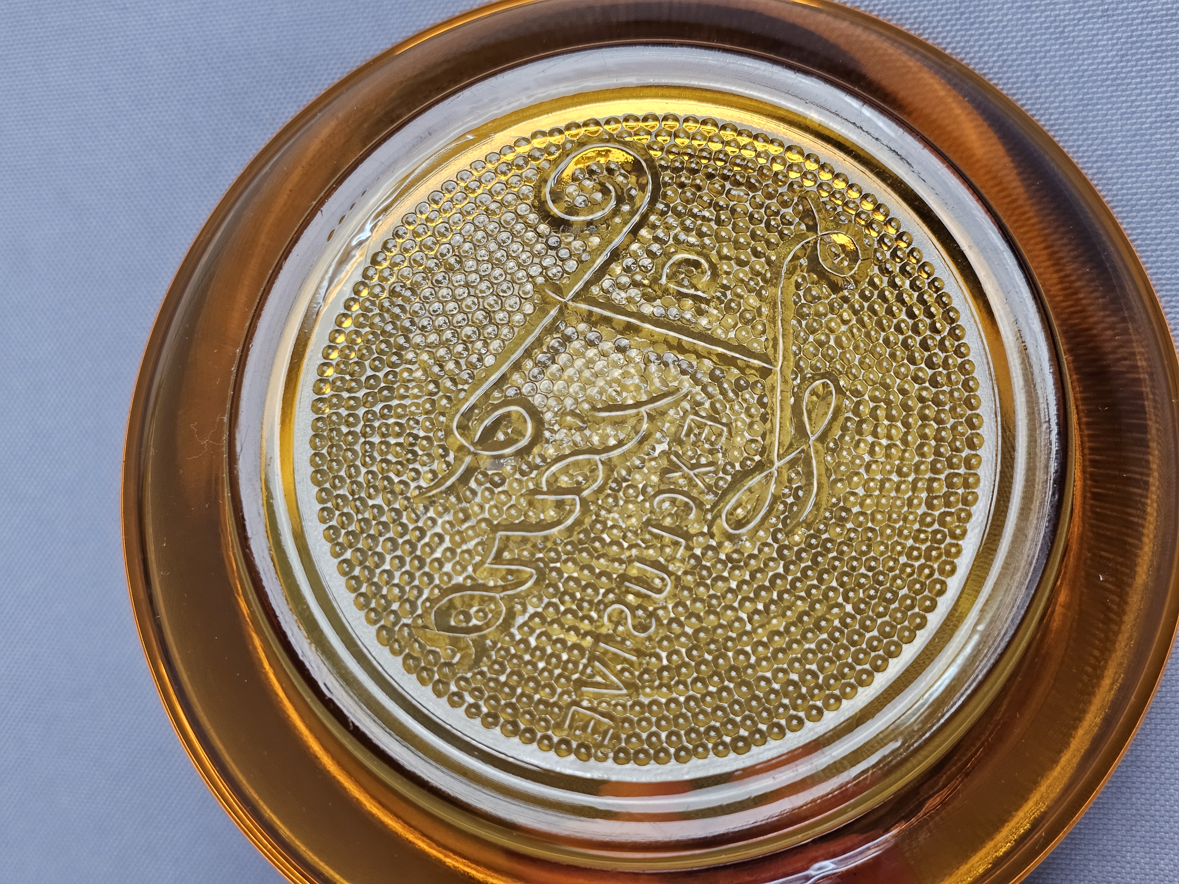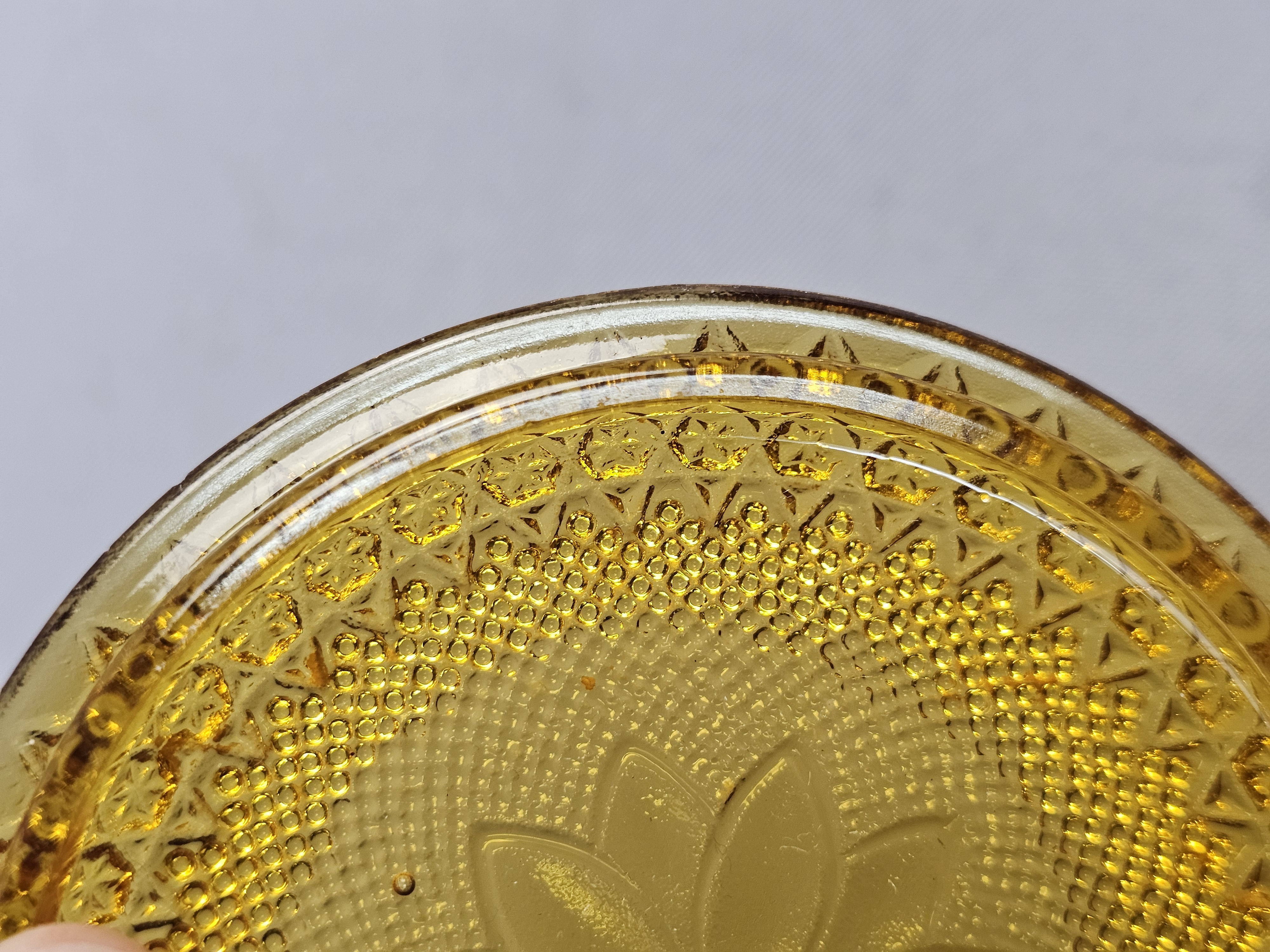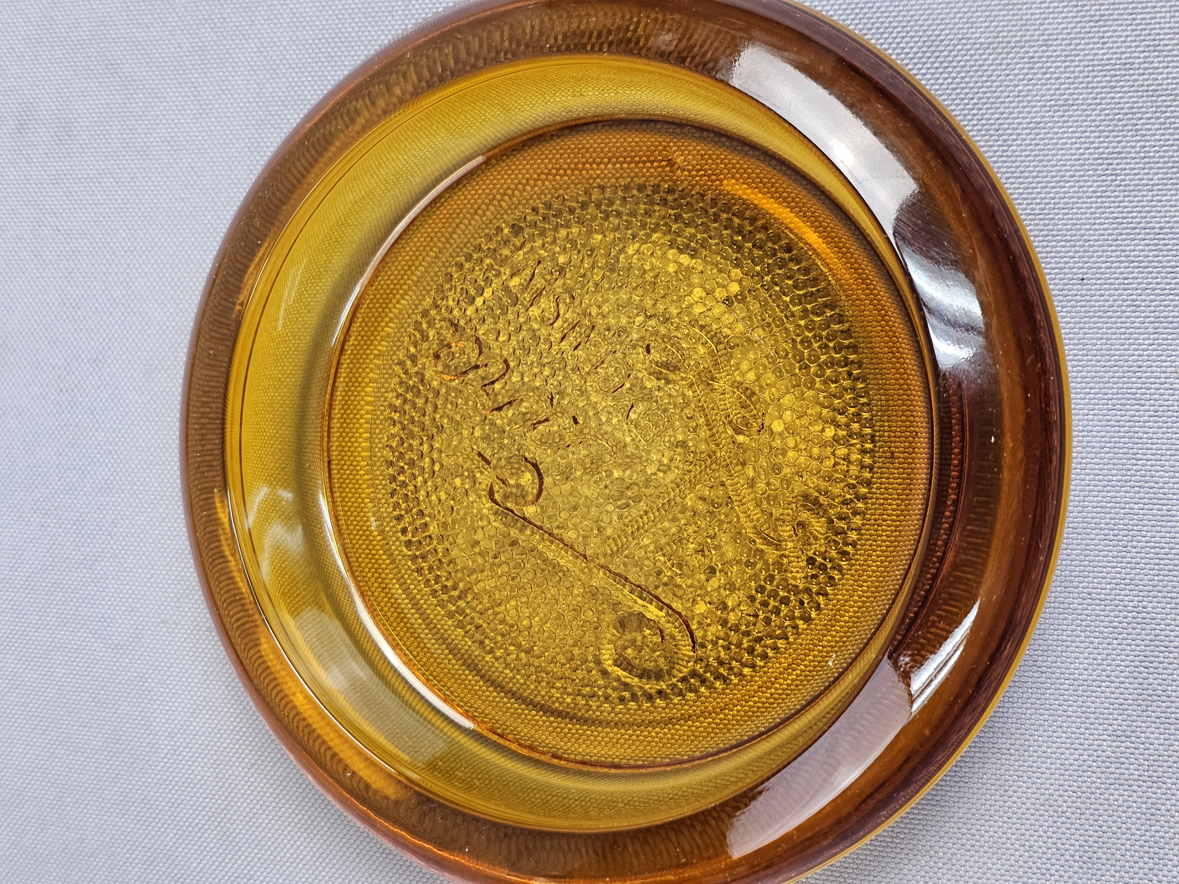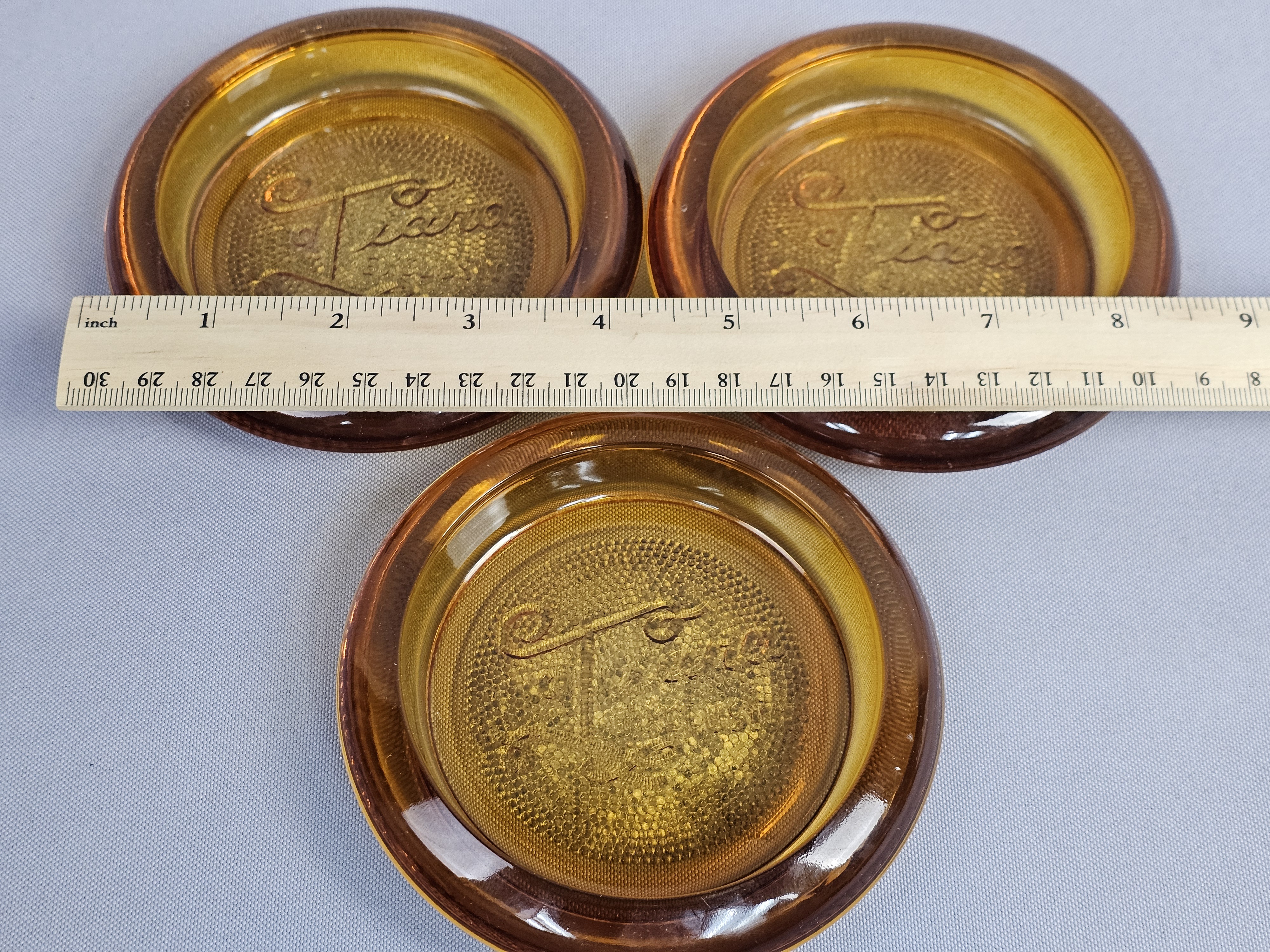 This collection of pressed glassware is produced in the Sandwich pattern by Indiana Glass for Tiara Exclusives. The items are made of amber-colored glass and feature a design of floral and scrolling leaf motifs against a stippled background. Footed Basket: 8 inches tall Covered Jar: 3.5 inches diameter Coasters: 4 inches diameter The collection is in good vintage condition. There is minor surface wear and light scratching consistent with age. Small flea bites and roughness are visible on the inner seating rim of the covered jar base. No major chips, cracks, or repairs are noted.