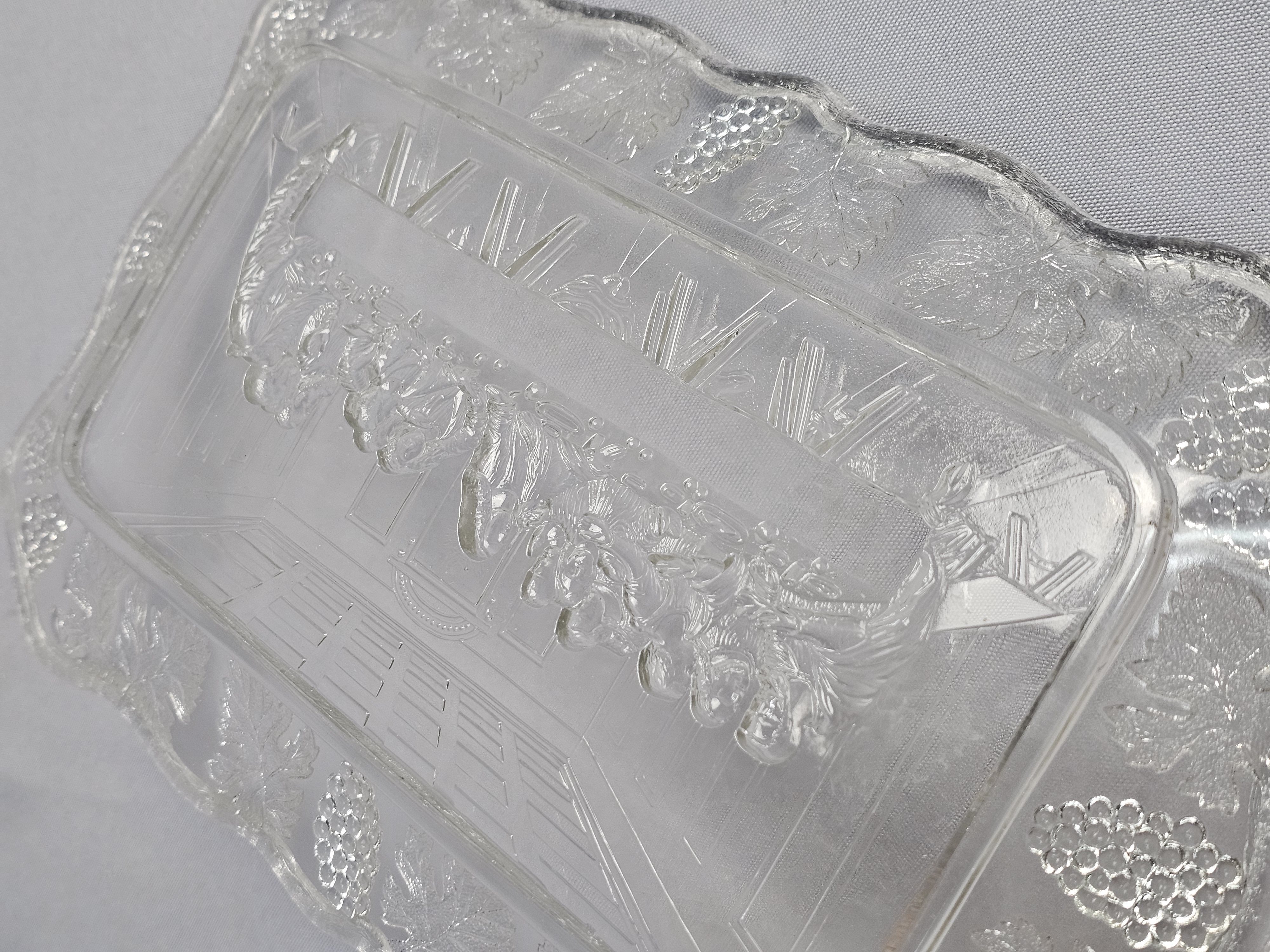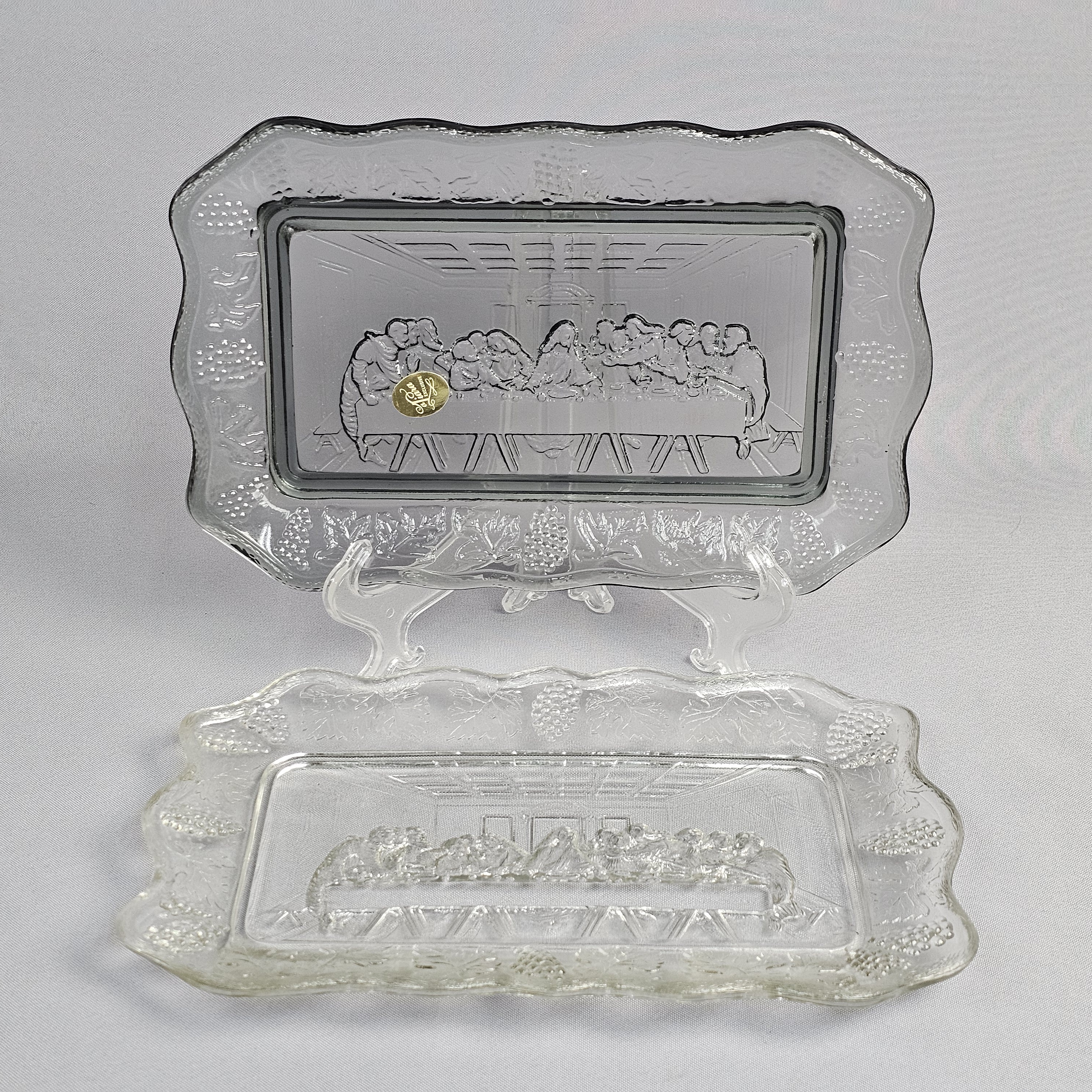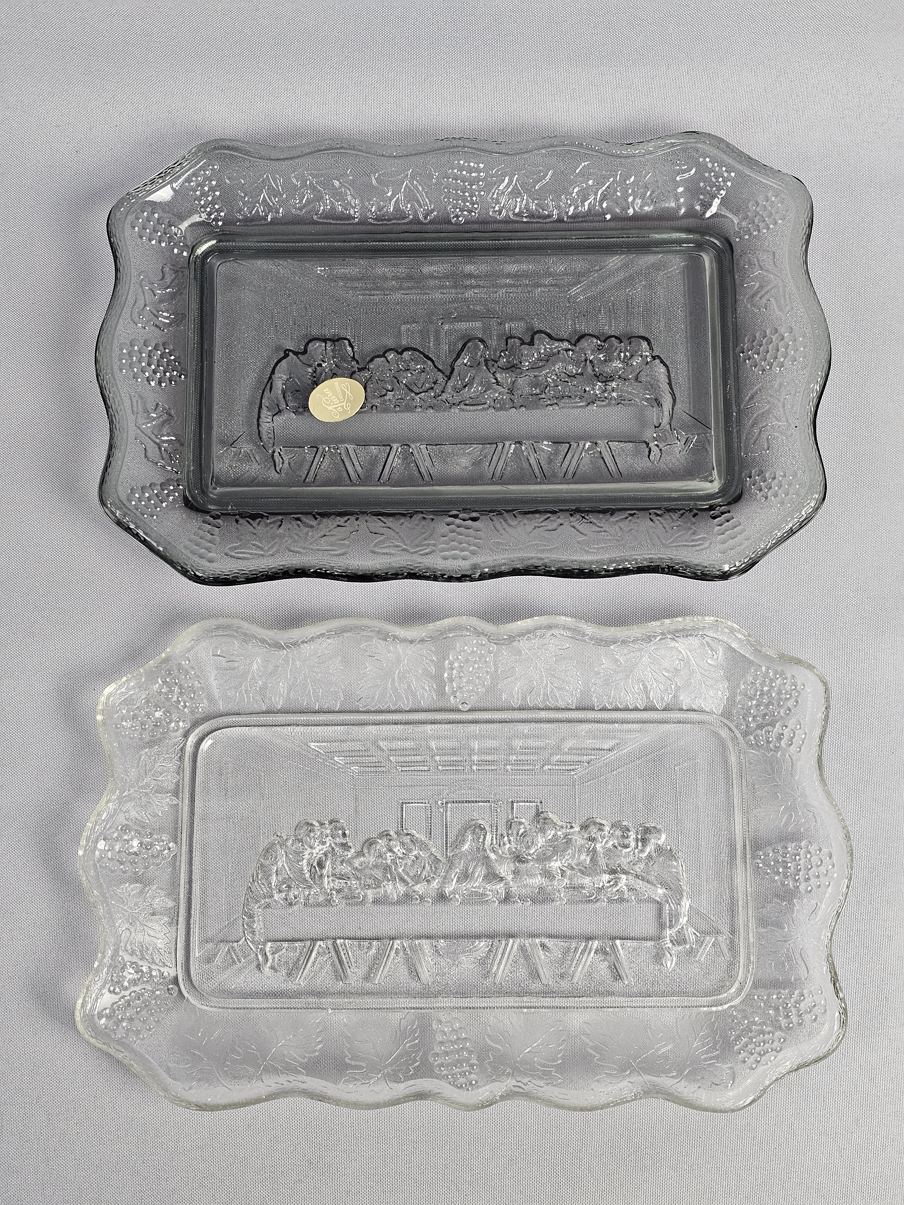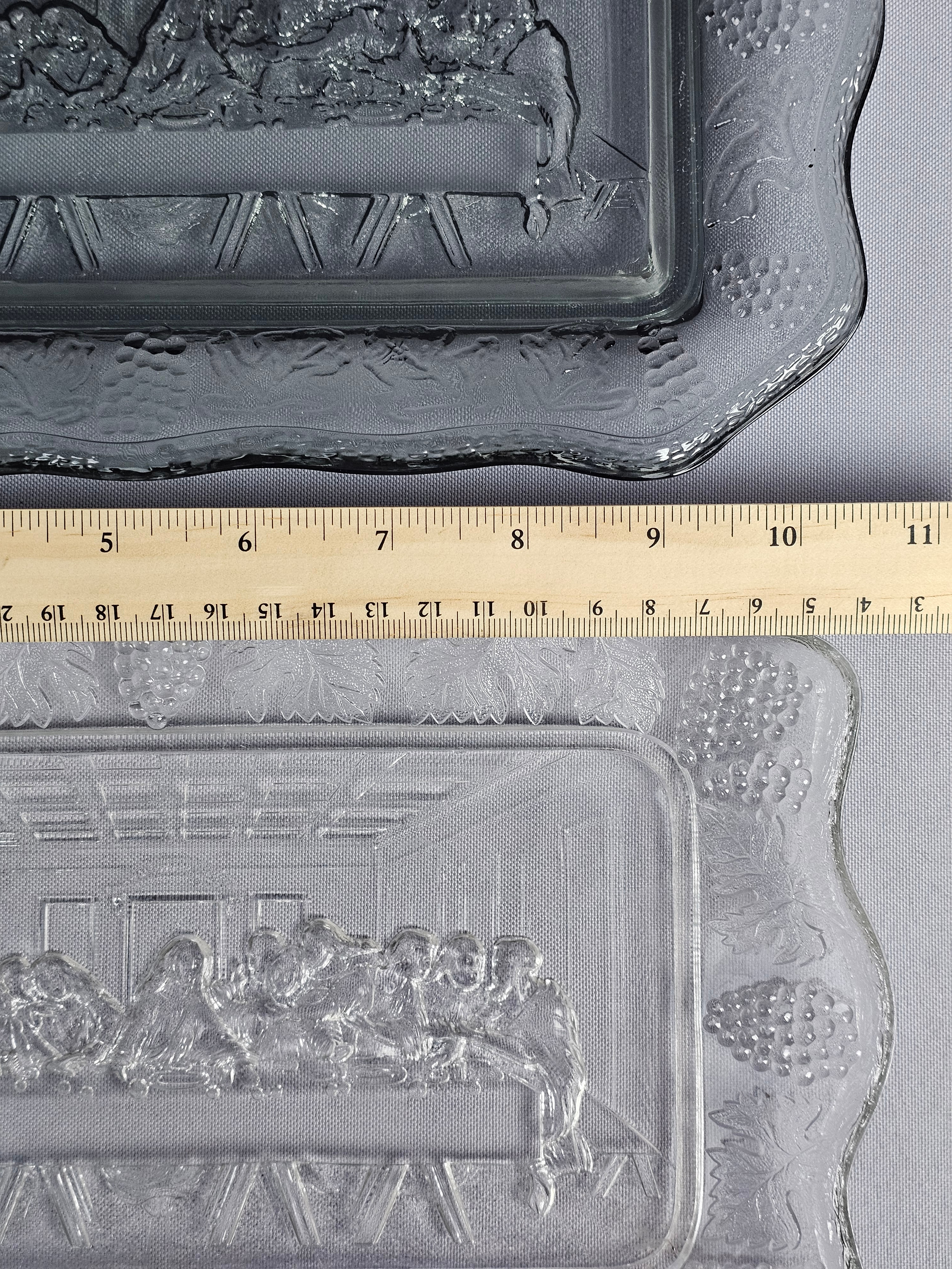 This pair of rectangular pressed glass platters is produced by Tiara Exclusives in the pattern known as The Lord’s Supper. The set consists of one clear glass platter and one smoky grey tinted glass platter. One original cardboard storage box featuring the Tiara Exclusive logo is included. Length: Approximately 10 inches Clear platter has a small chip noted. The included cardboard box shows age-related yellowing, shelf wear, and handwritten identification in ink.