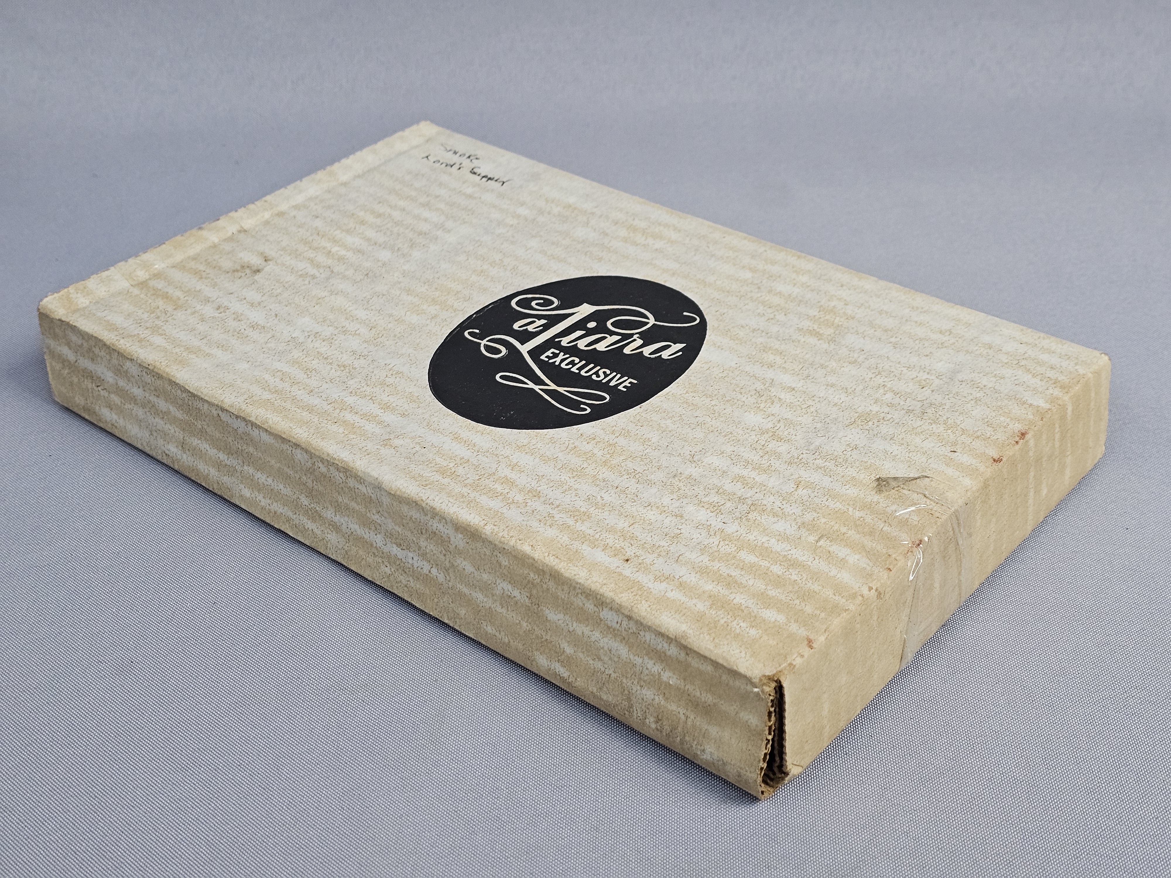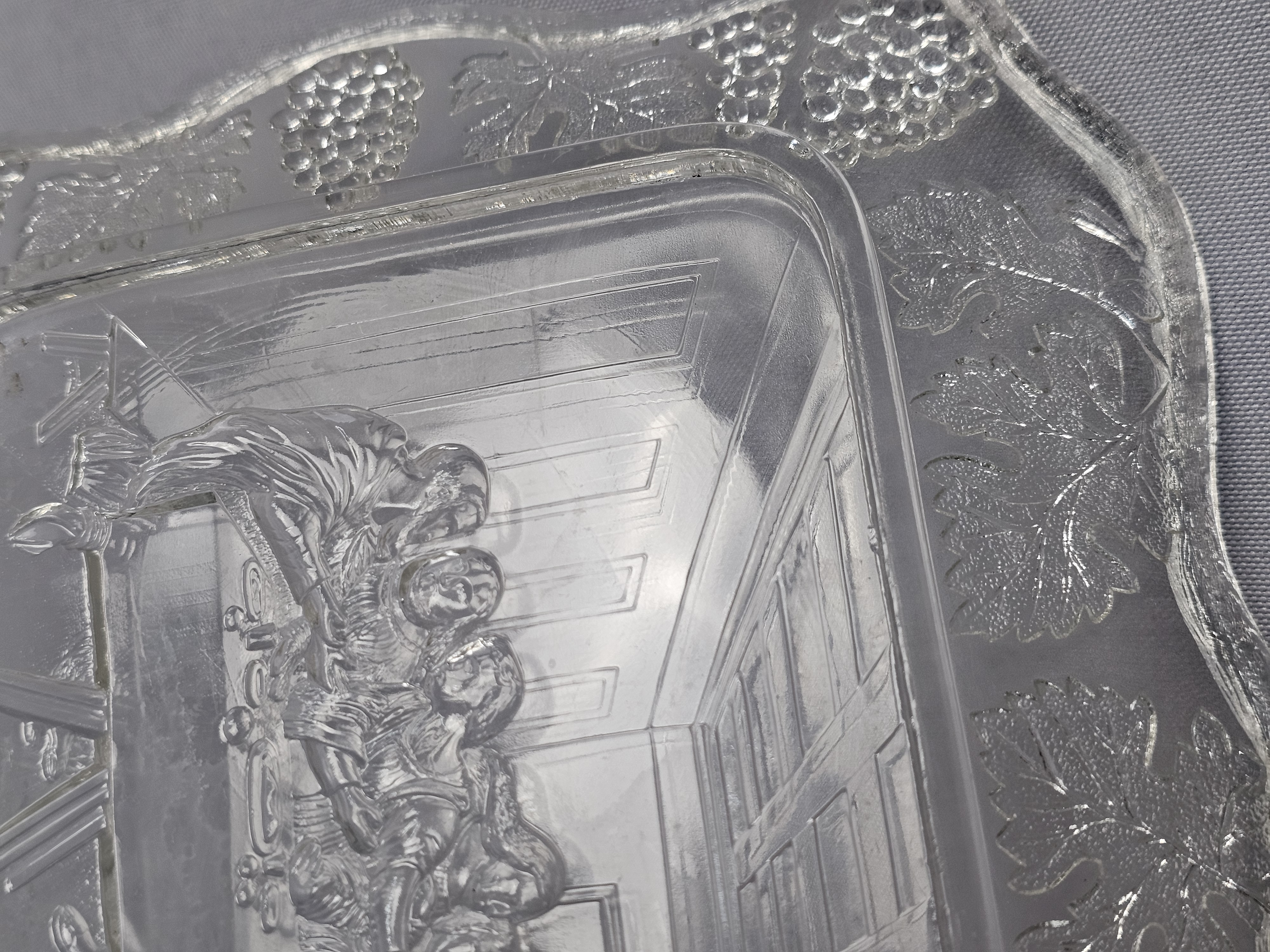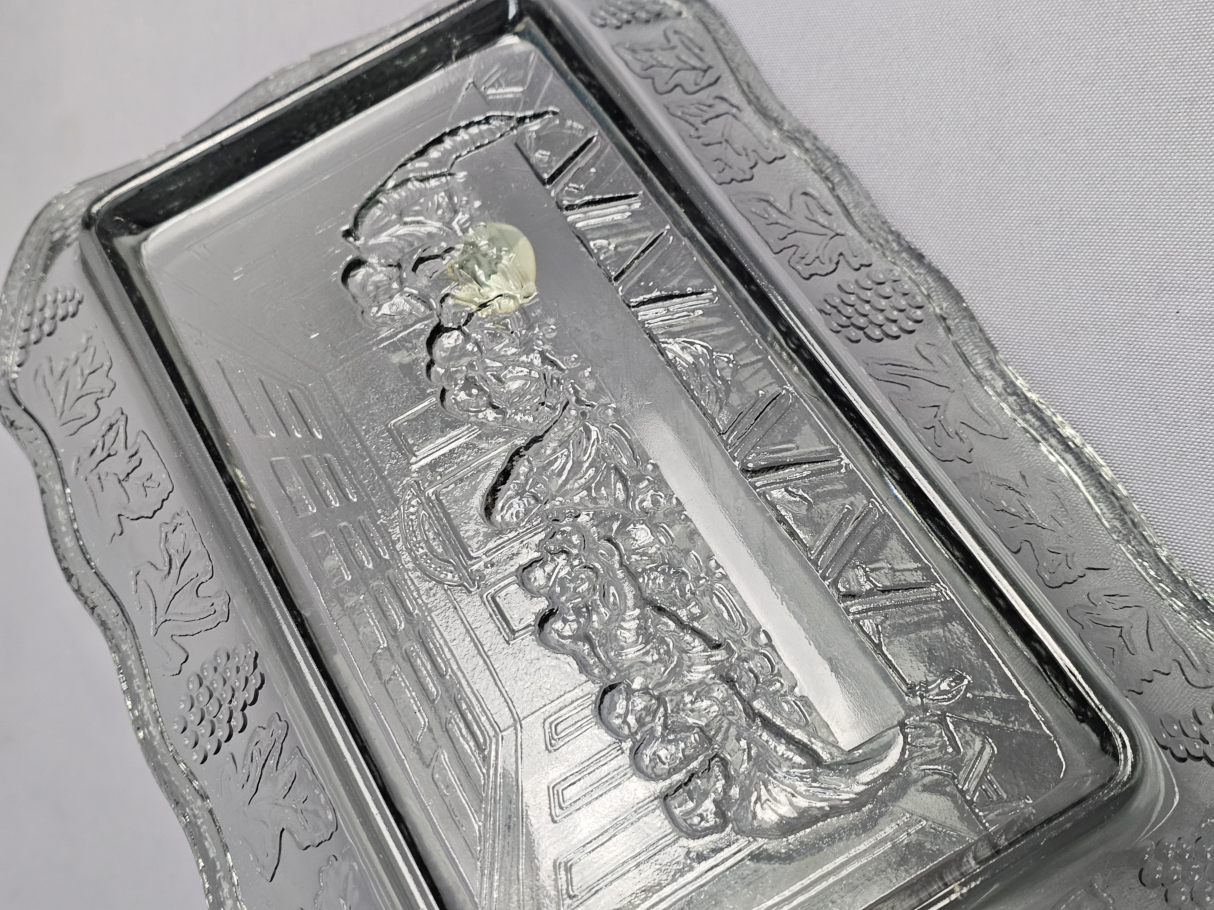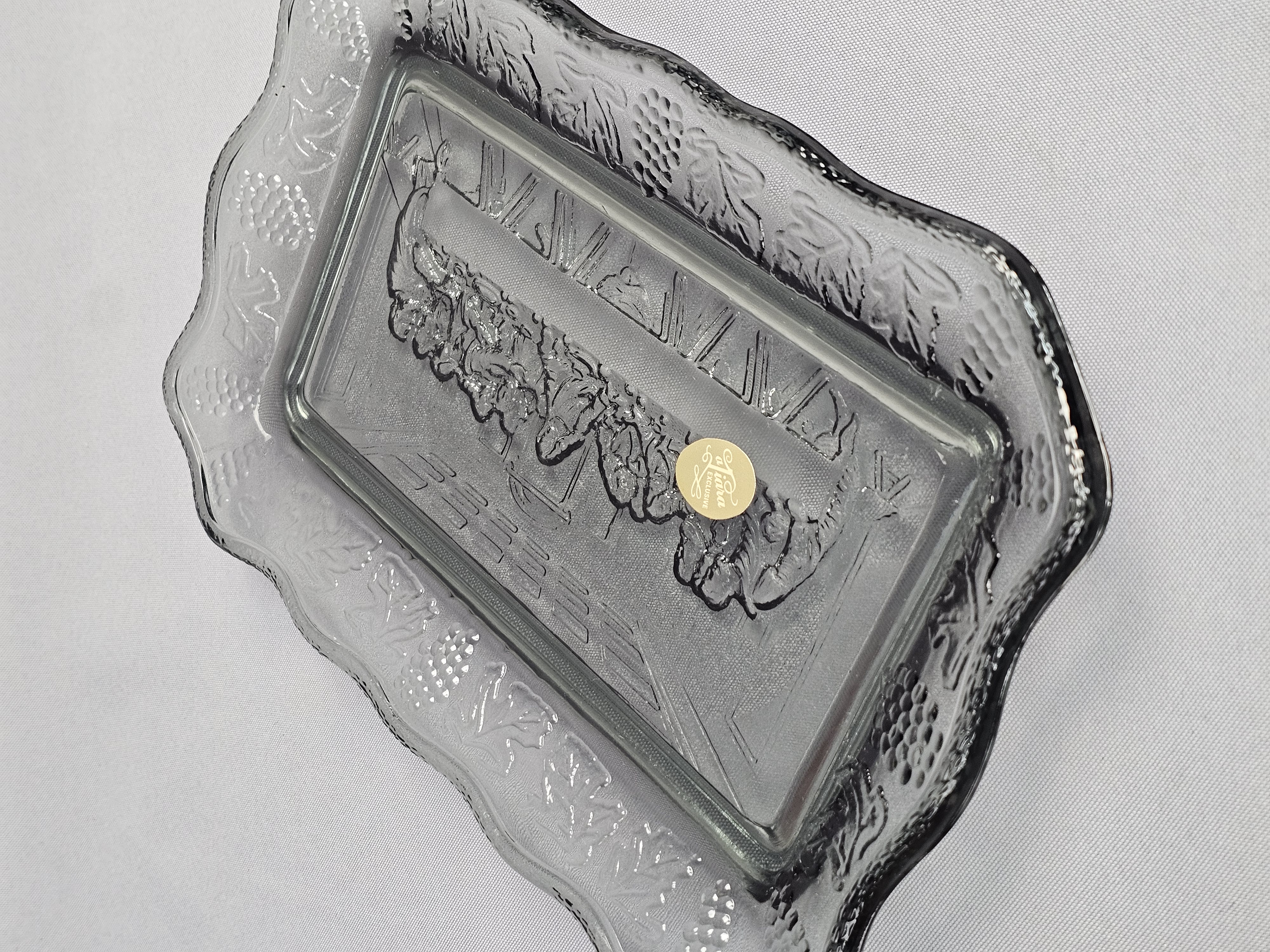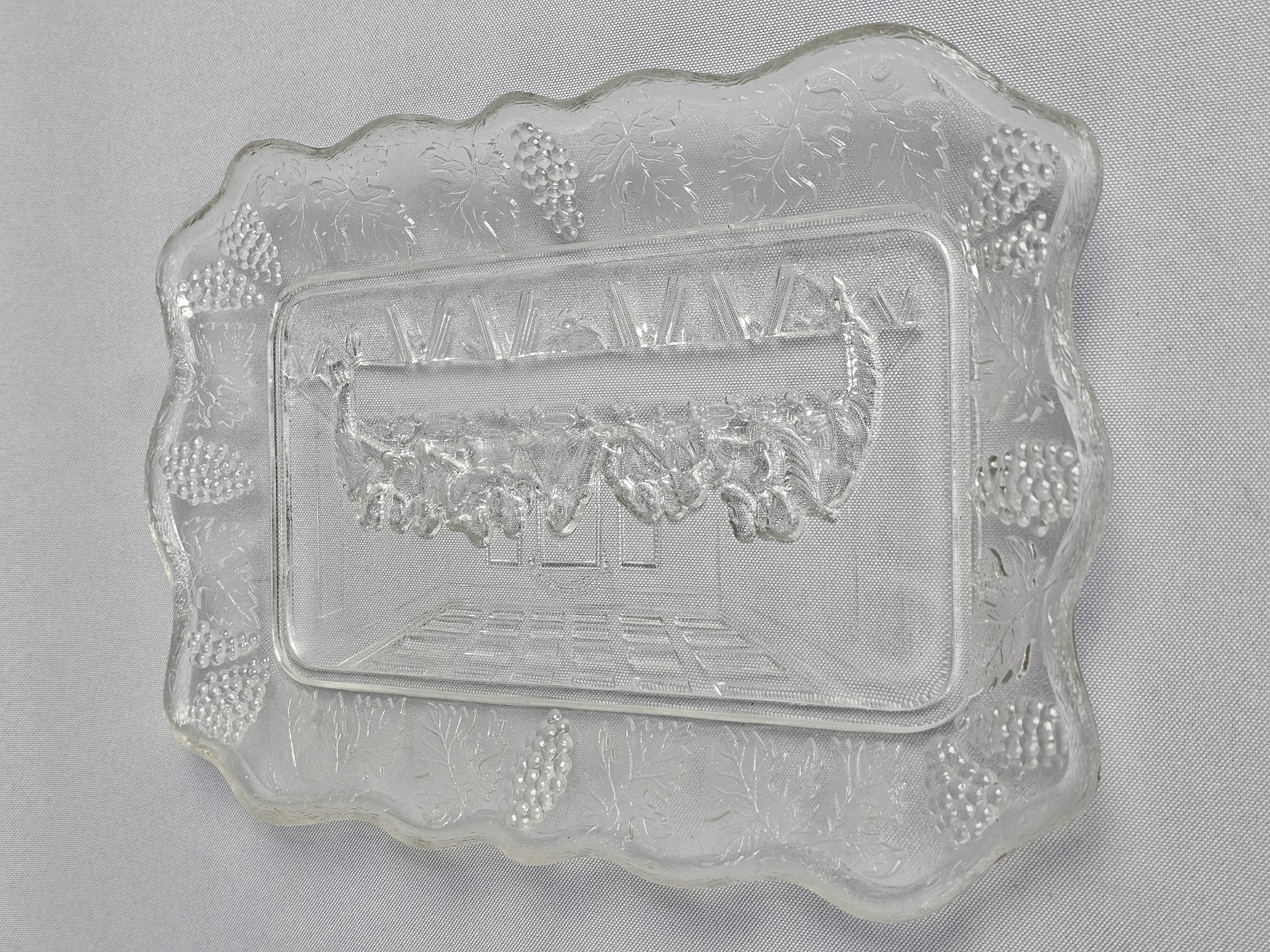 This pair of rectangular pressed glass platters is produced by Tiara Exclusives in the pattern known as The Lord’s Supper. The set consists of one clear glass platter and one smoky grey tinted glass platter. One original cardboard storage box featuring the Tiara Exclusive logo is included. Length: Approximately 10 inches Clear platter has a small chip noted. The included cardboard box shows age-related yellowing, shelf wear, and handwritten identification in ink.