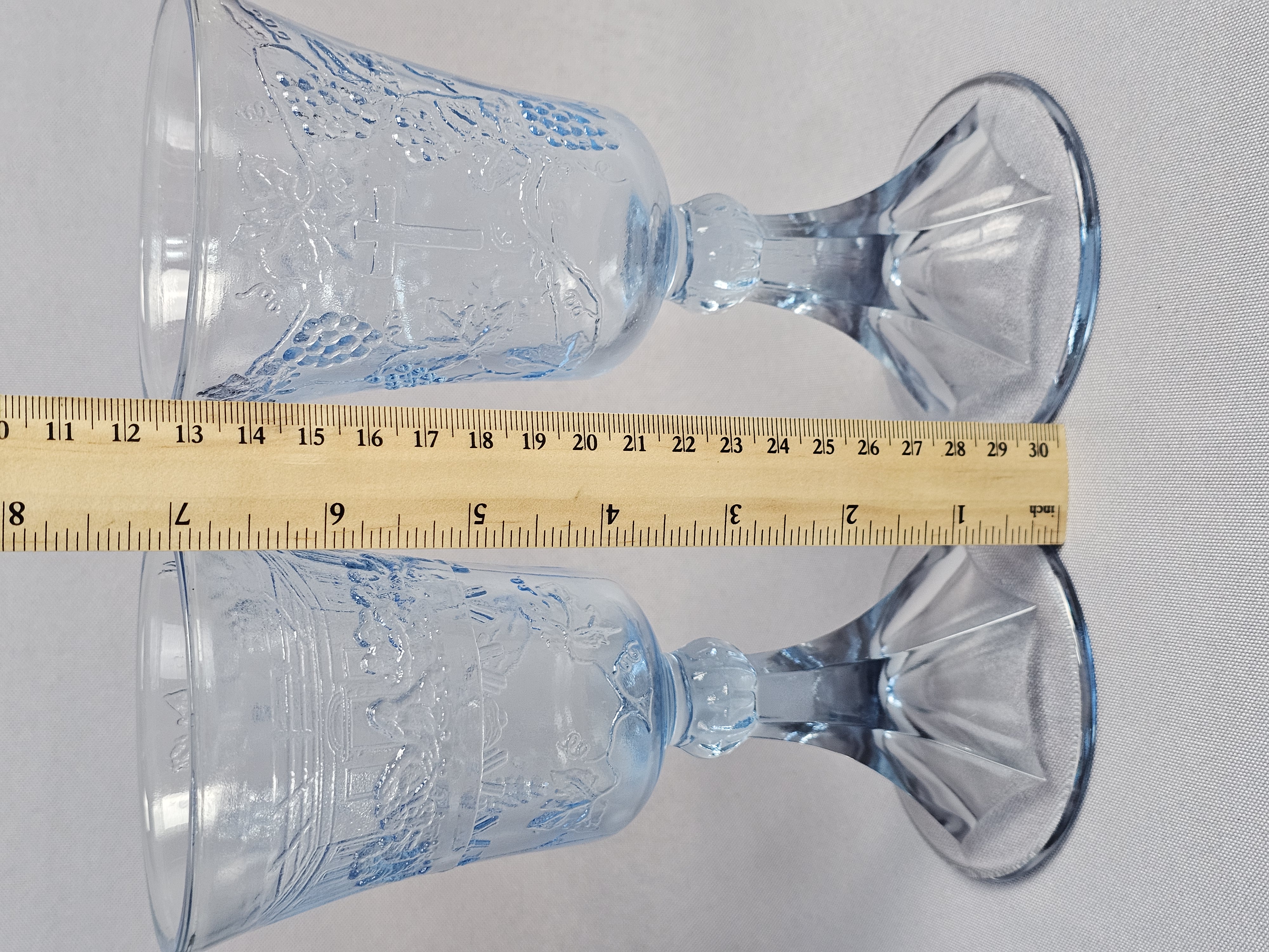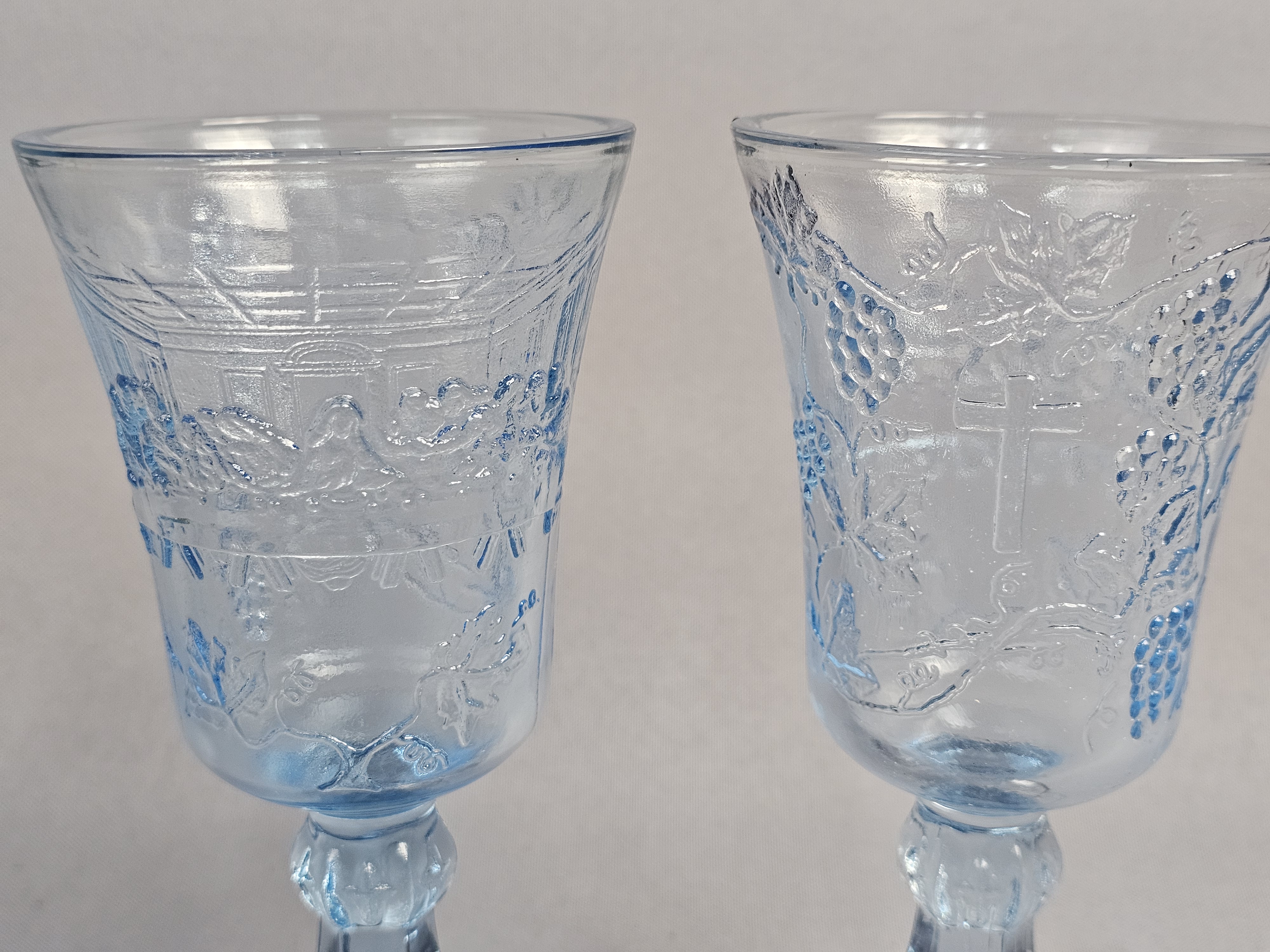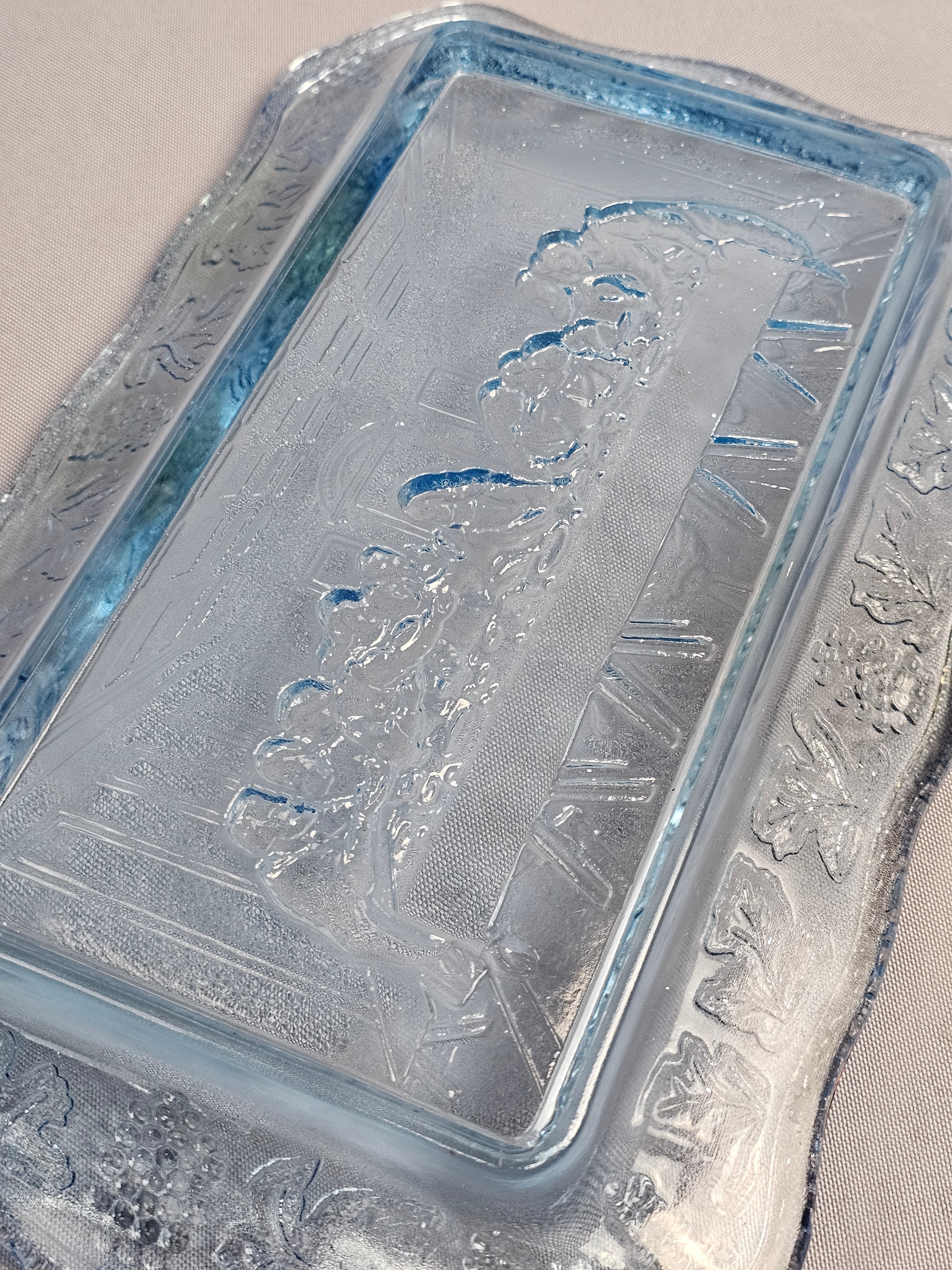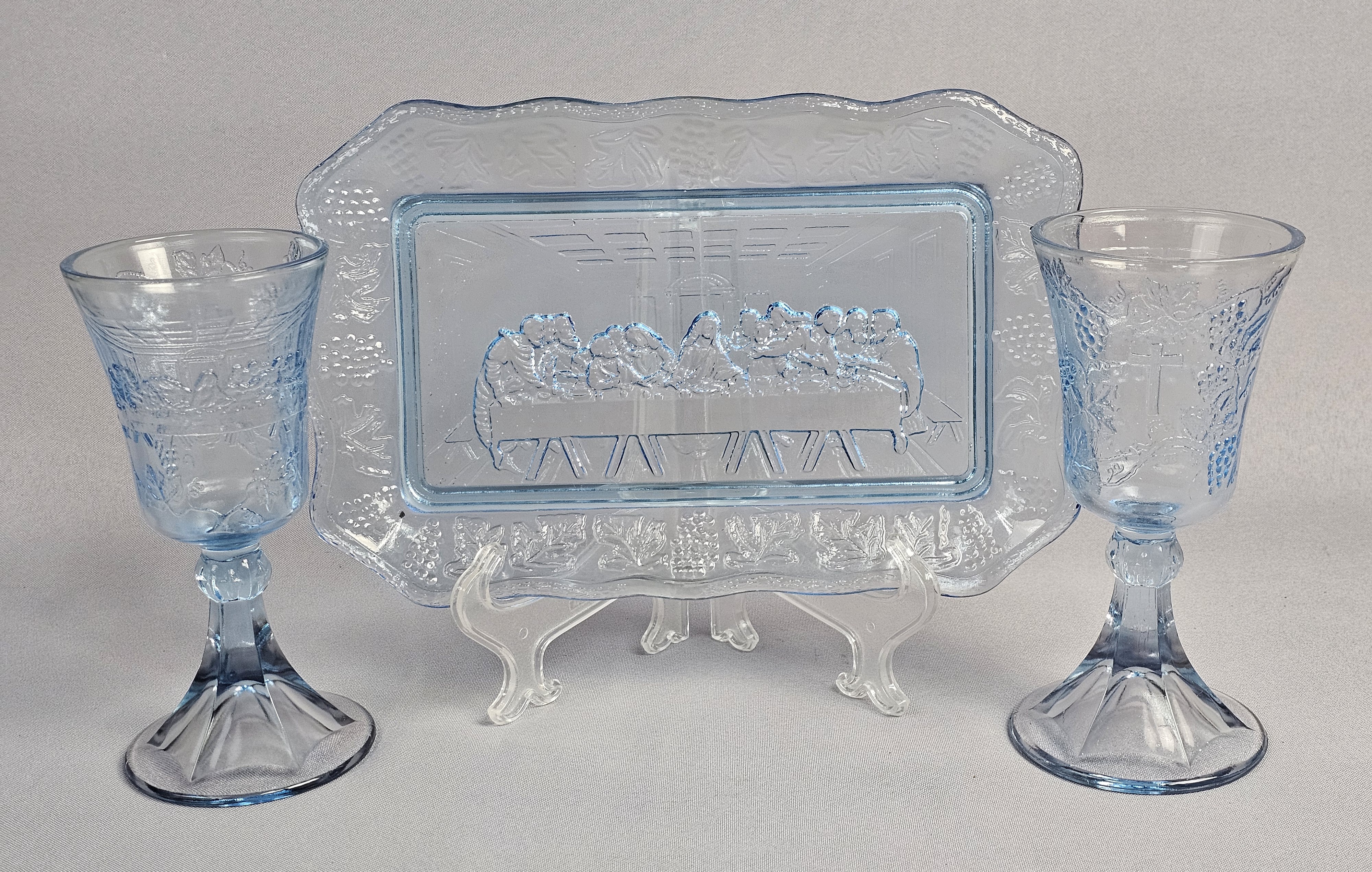 This three-piece set of light blue pressed glass is attributed to Tiara Exclusives and consists of a rectangular tray and two matching goblets. While the glass items do not bear maker marks, the set includes one original cardboard retail box featuring the Tiara Exclusive logo, the printed number 10468. Tray: Approximately 10.5 inches in length Goblets: Approximately 7 inches in height The glassware is in excellent condition with no visible chips, cracks, or notable surface wear. The included original box is in poor condition, showing significant wear, paper loss, tearing at the flaps, and handwritten ink notations.