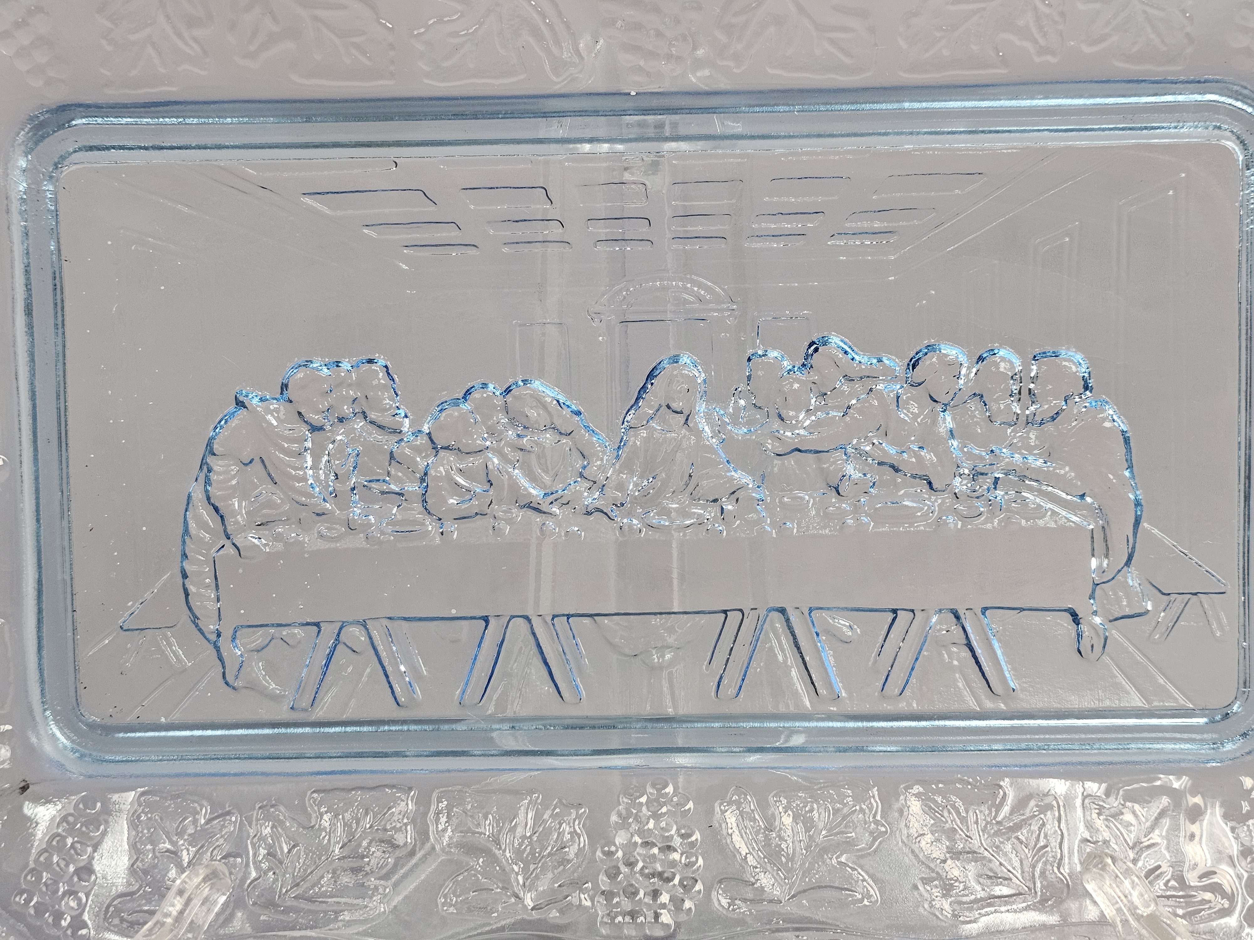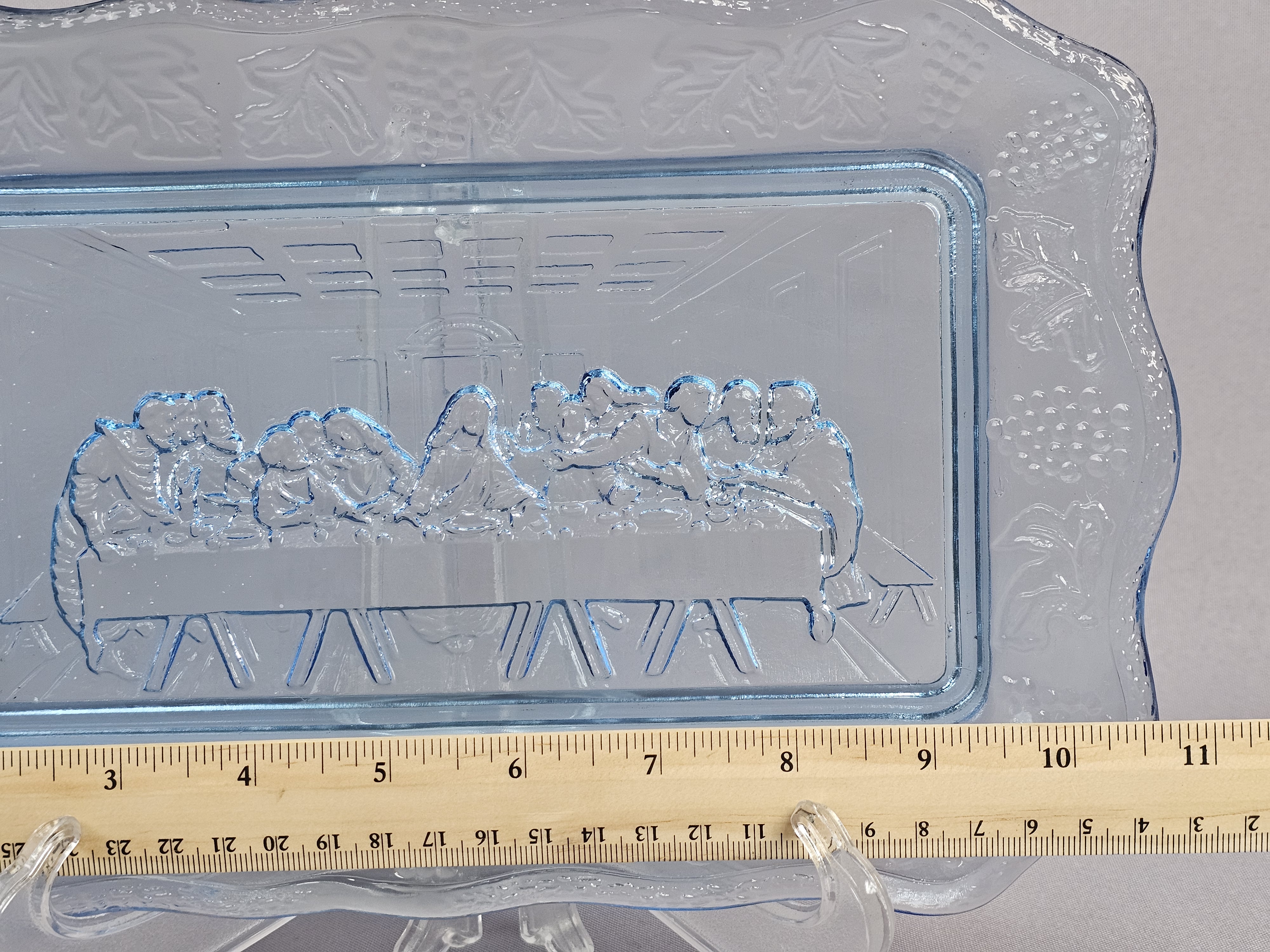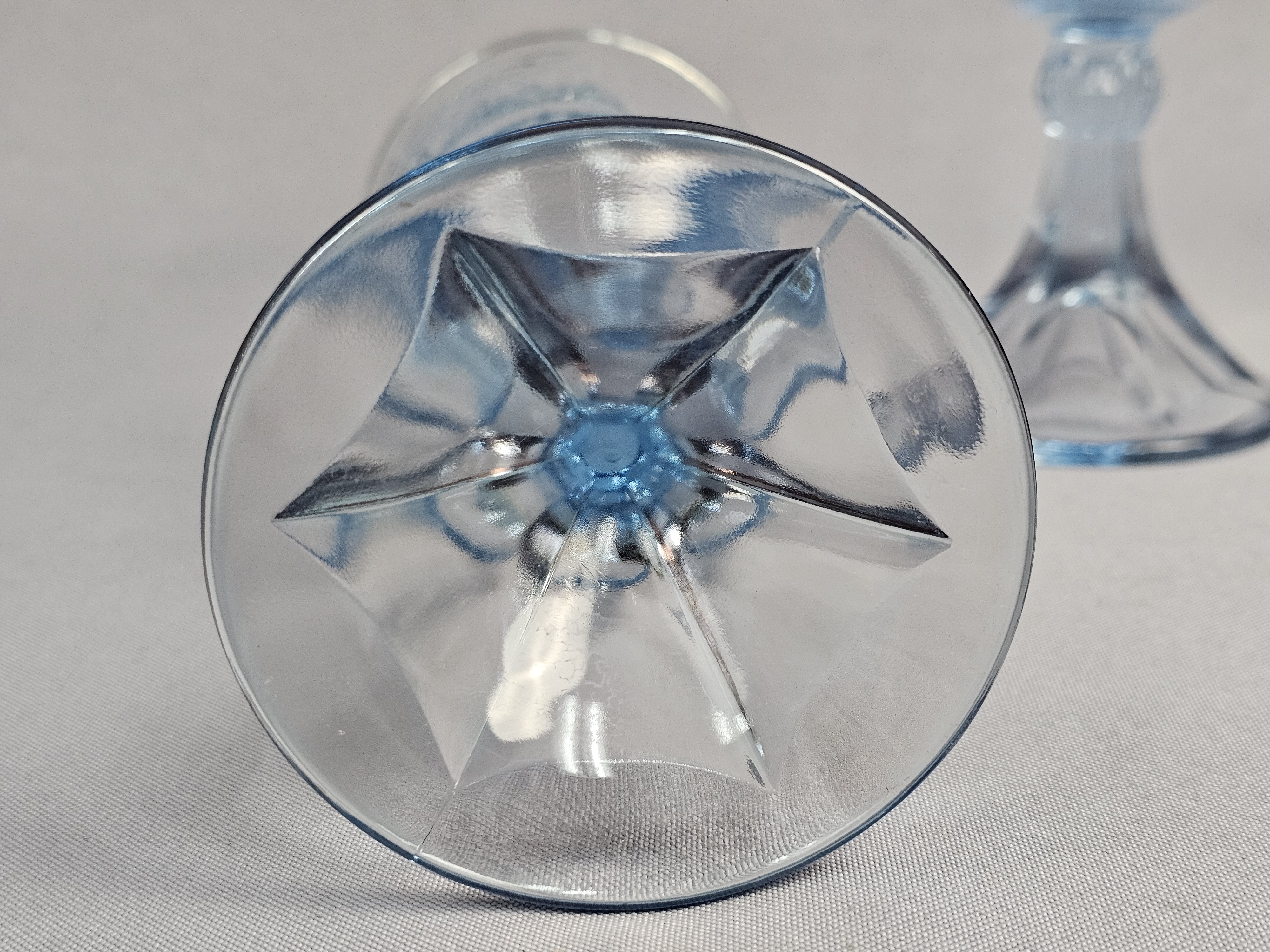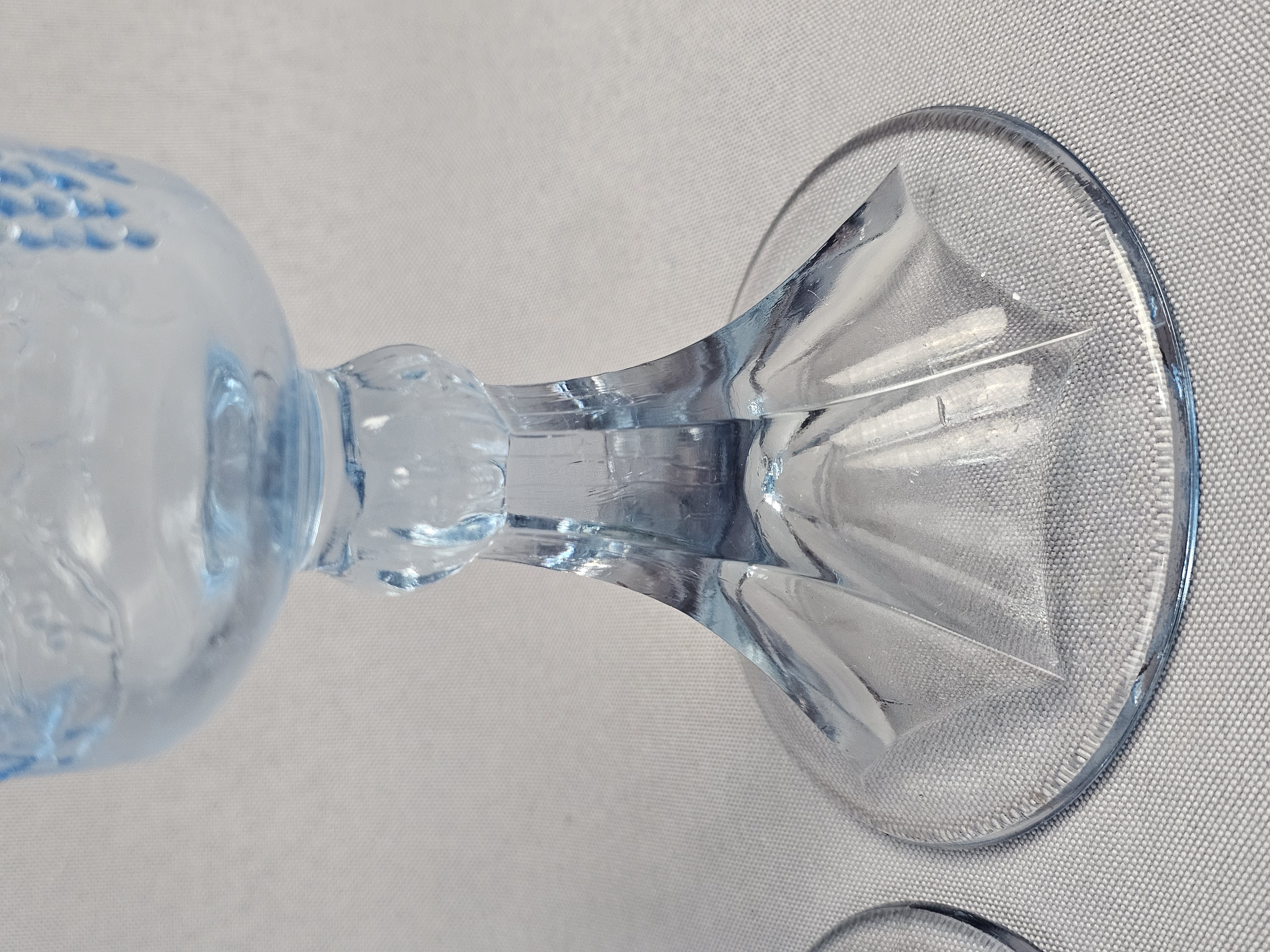 This three-piece set of light blue pressed glass is attributed to Tiara Exclusives and consists of a rectangular tray and two matching goblets. While the glass items do not bear maker marks, the set includes one original cardboard retail box featuring the Tiara Exclusive logo, the printed number 10468. Tray: Approximately 10.5 inches in length Goblets: Approximately 7 inches in height The glassware is in excellent condition with no visible chips, cracks, or notable surface wear. The included original box is in poor condition, showing significant wear, paper loss, tearing at the flaps, and handwritten ink notations.