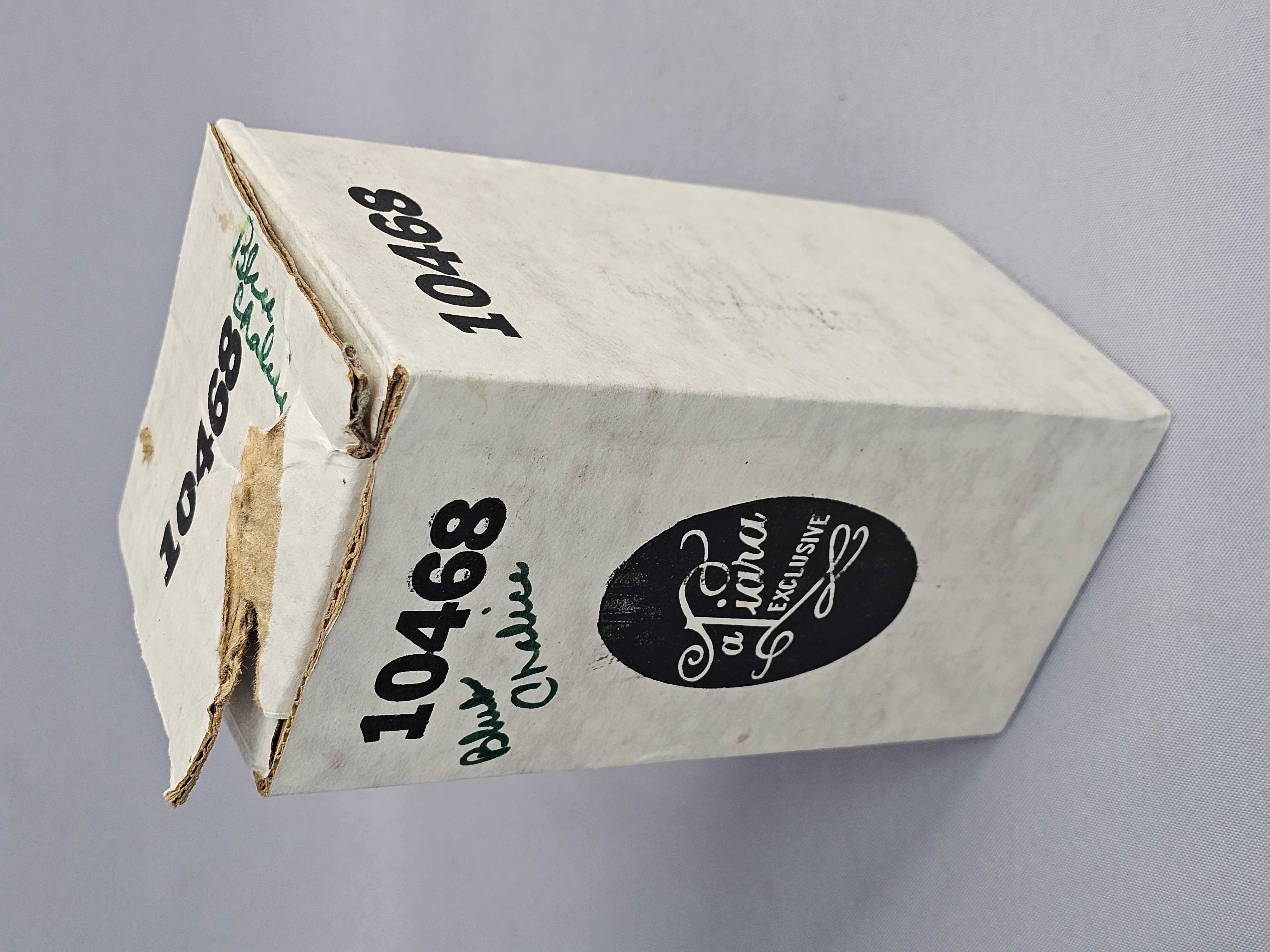 The glassware is in excellent condition with no visible chips, cracks, or notable surface wear. The included original box is in poor condition, showing significant wear, paper loss, tearing at the flaps, and handwritten ink notations.