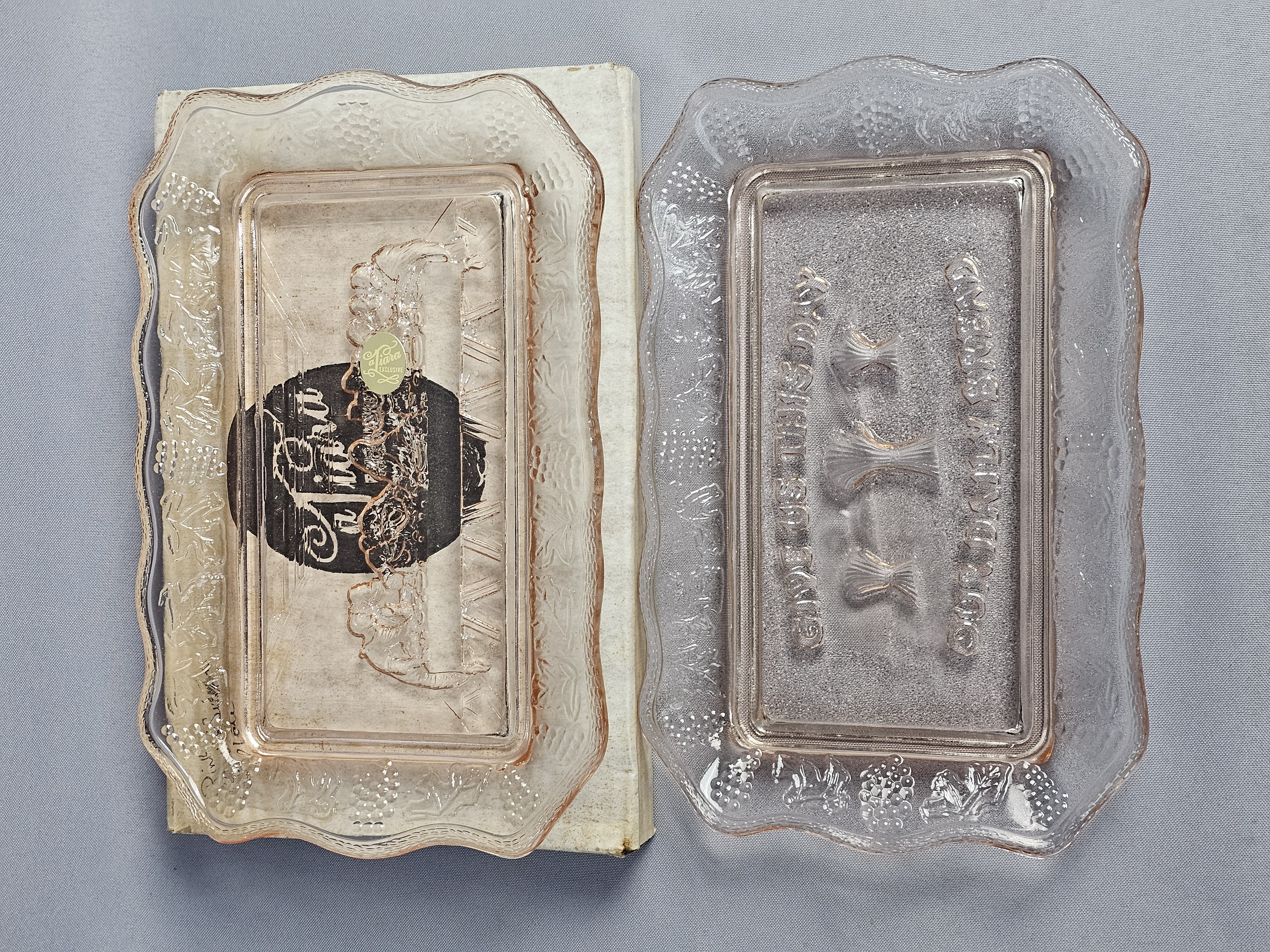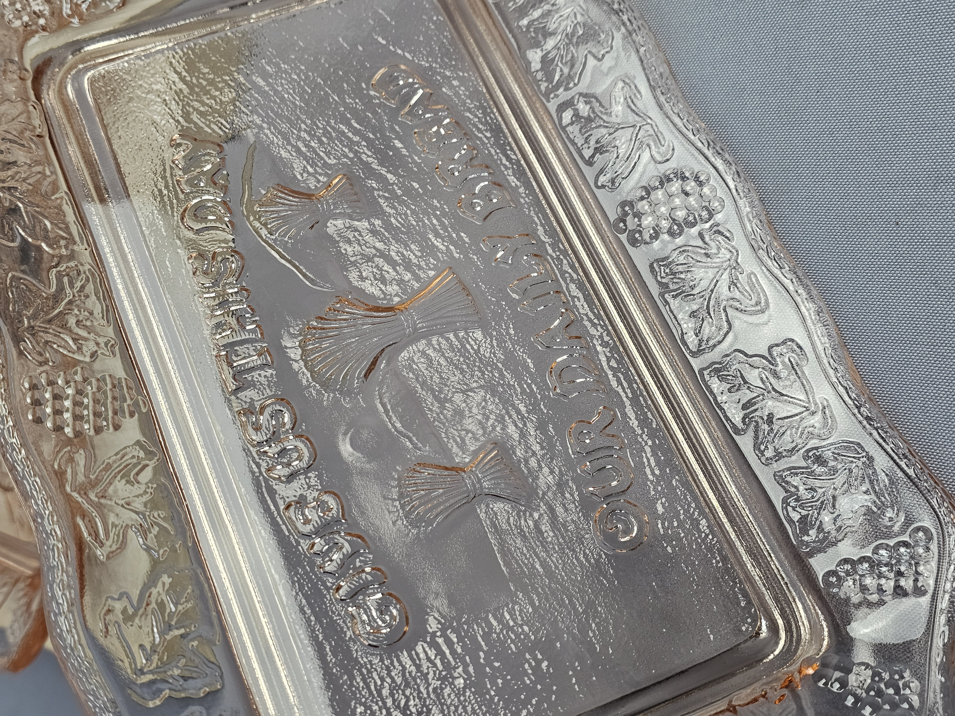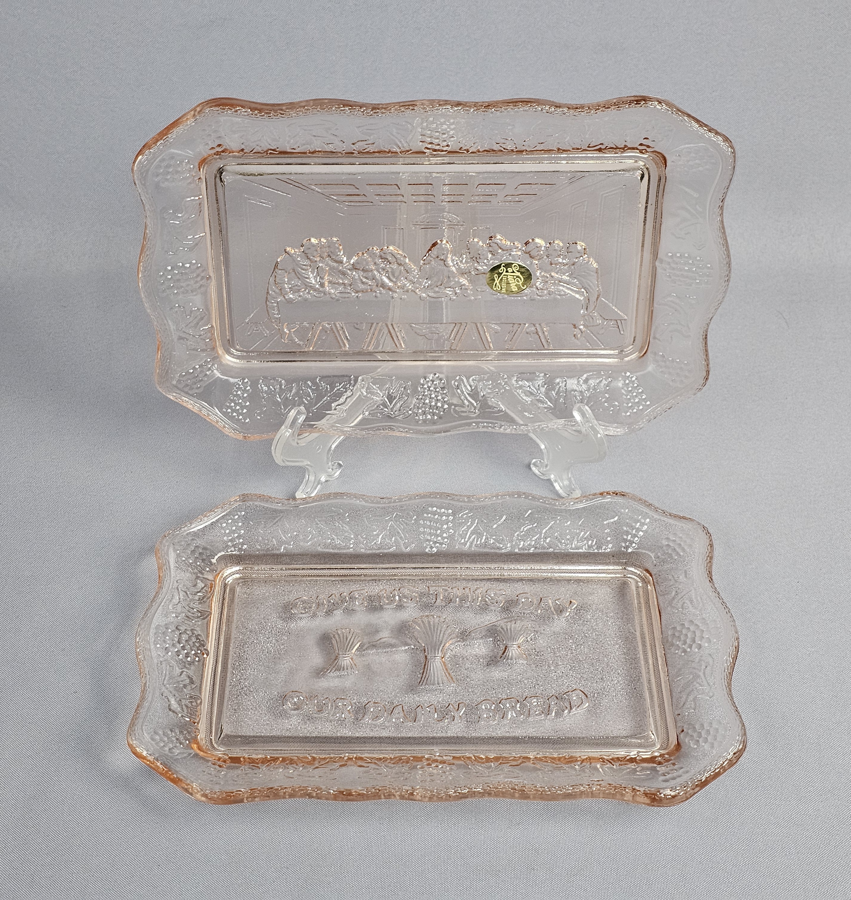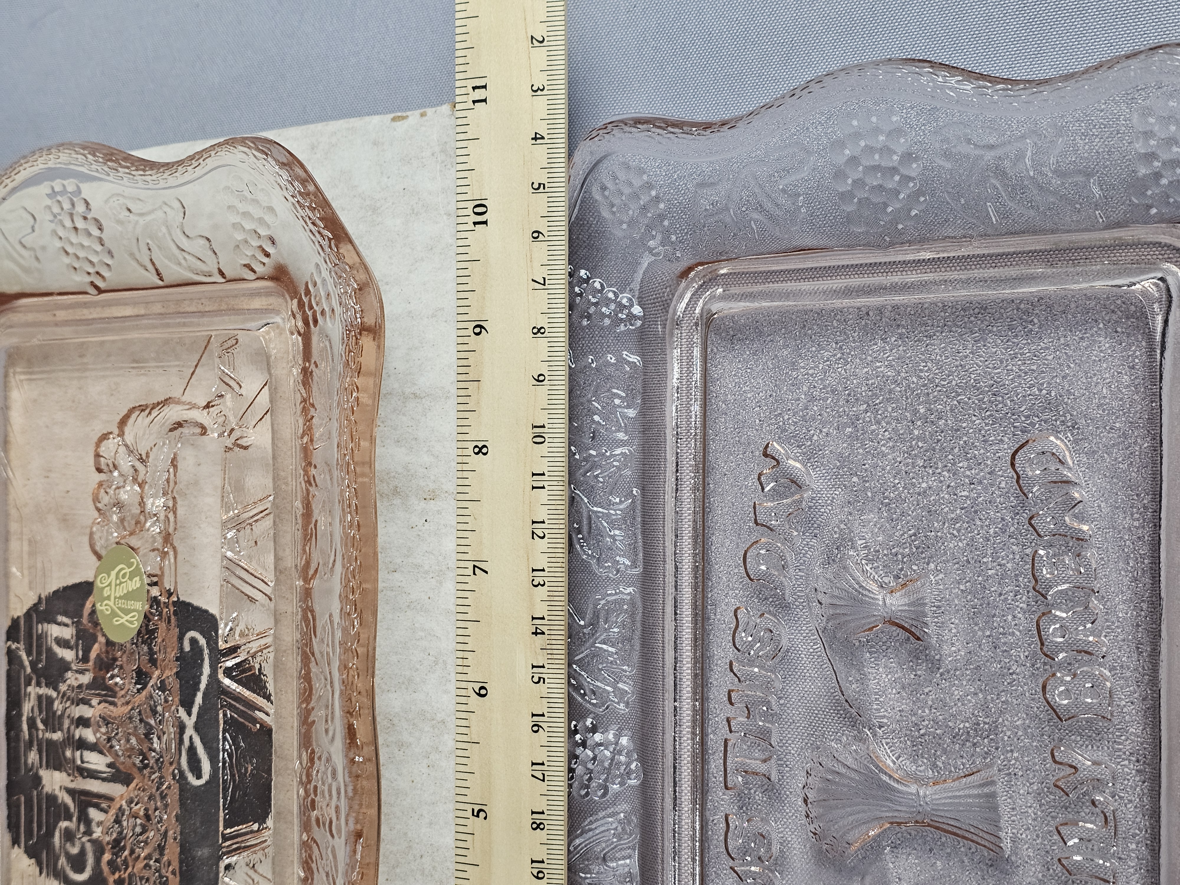 A pair of rectangular pink pressed glass trays marketed by Tiara Exclusives. The first tray features a central panel with a high-relief molded depiction of Leonardo da Vinci’s The Last Supper. The second tray is a bread platter featuring a stippled central panel with three embossed sheaves of wheat and the inscribed text GIVE US THIS DAY OUR DAILY BREAD. This lot includes one original cardboard storage box with the Tiara Exclusive logo and handwritten identification. Approximately 11 inches long Both items are in good vintage condition. Minor manufacturing-related imperfections are present, including small air bubbles and straw marks within the glass. A small nick is visible on the inner ridge of the Last Supper tray. The original box shows significant age-related yellowing, staining, and wear to the corners.