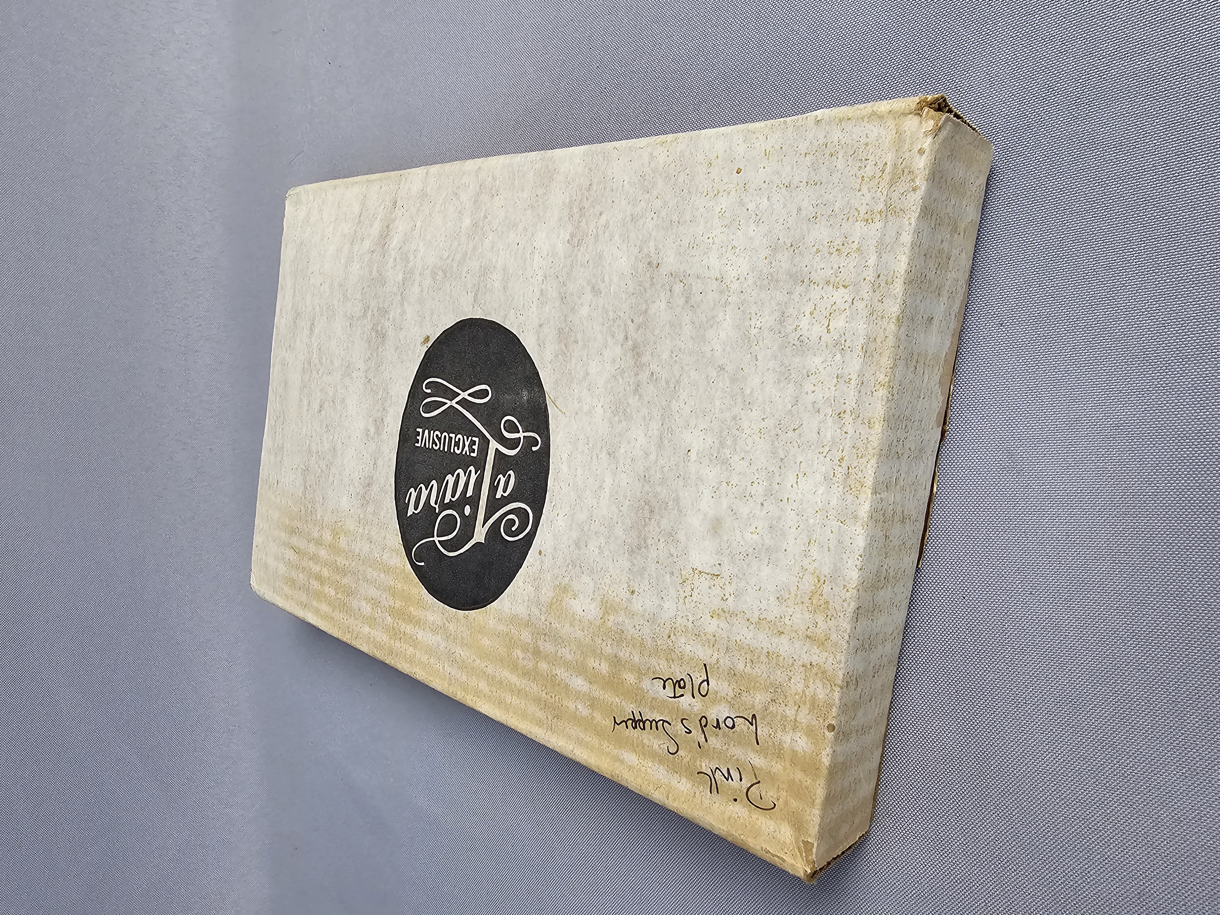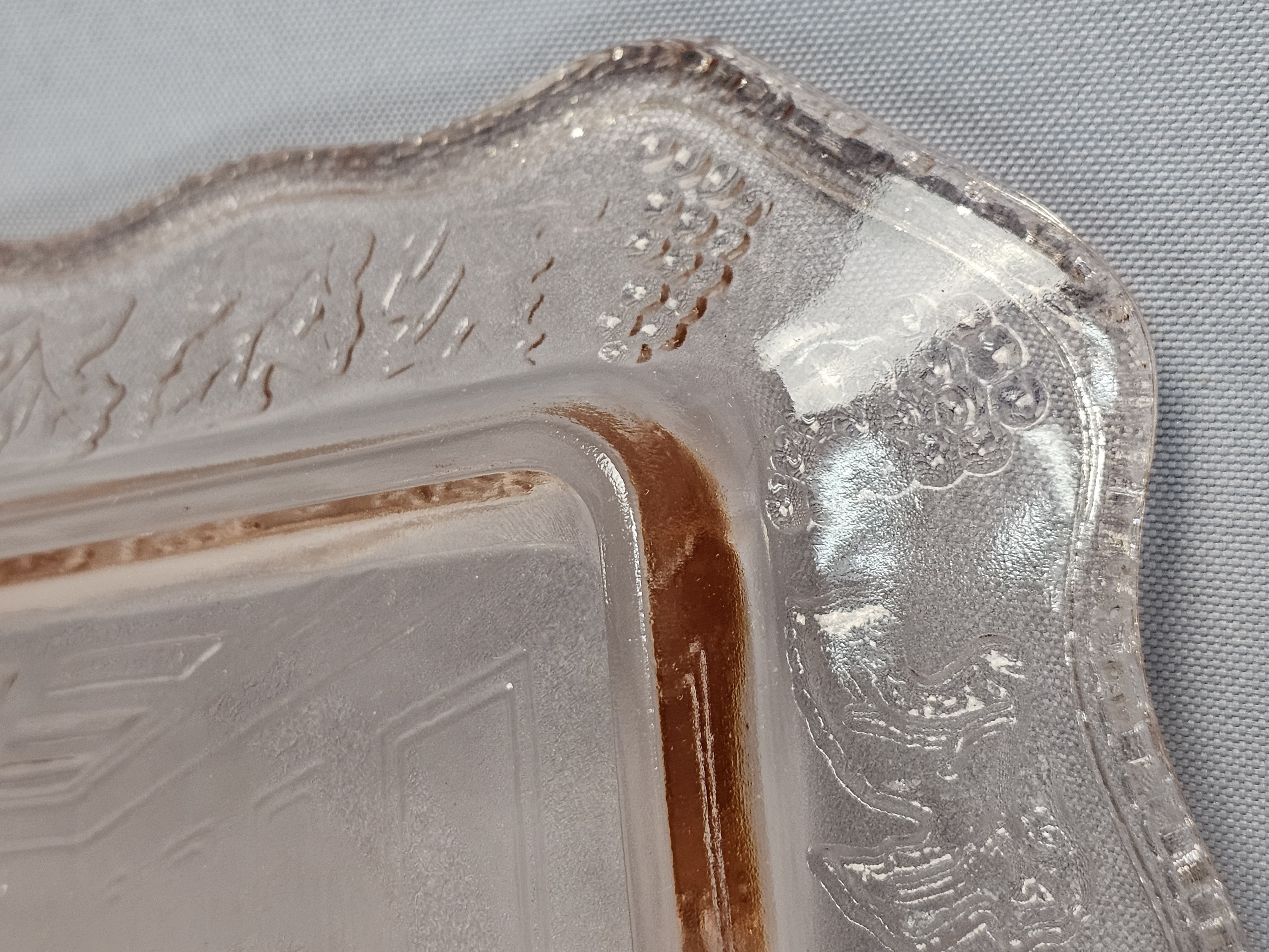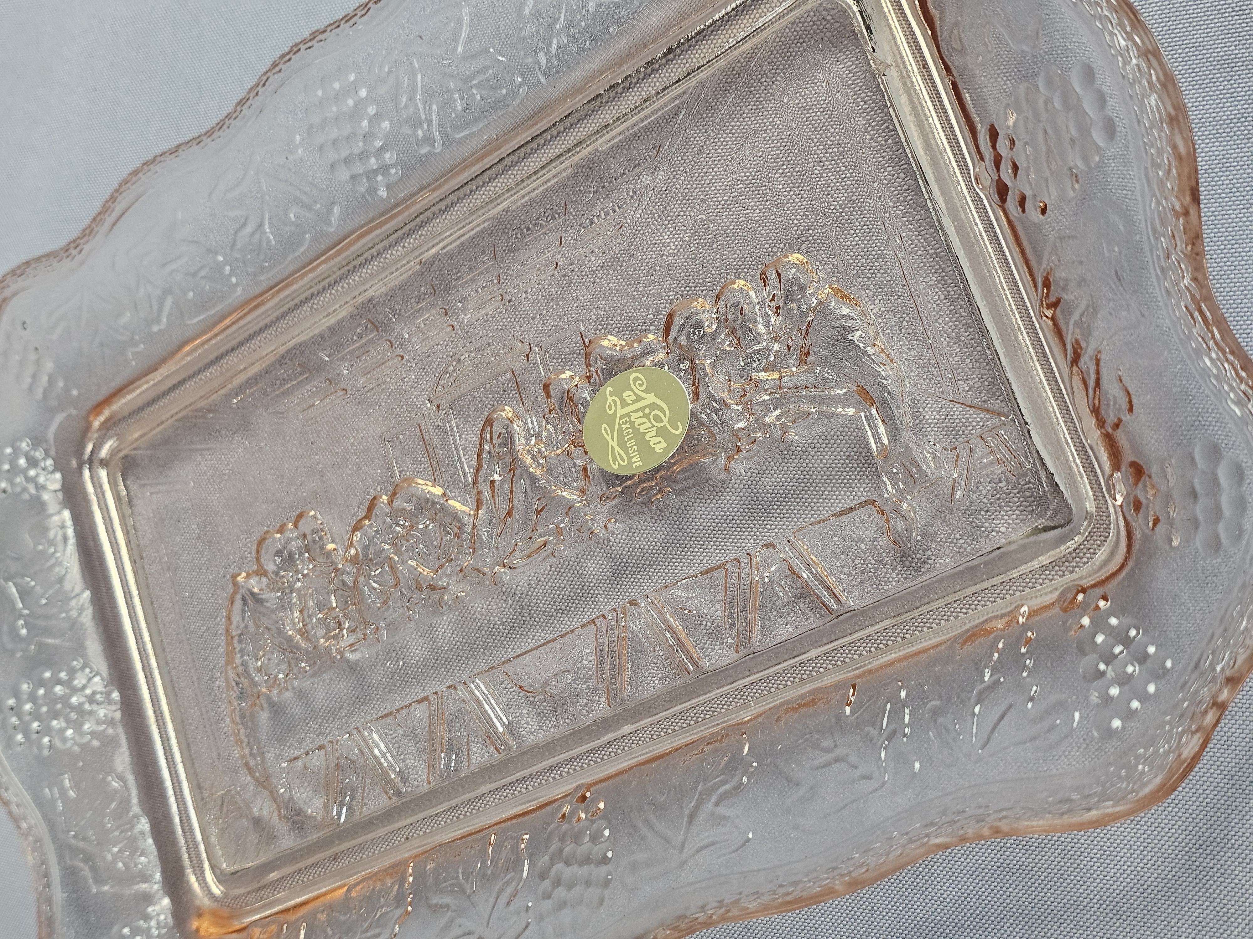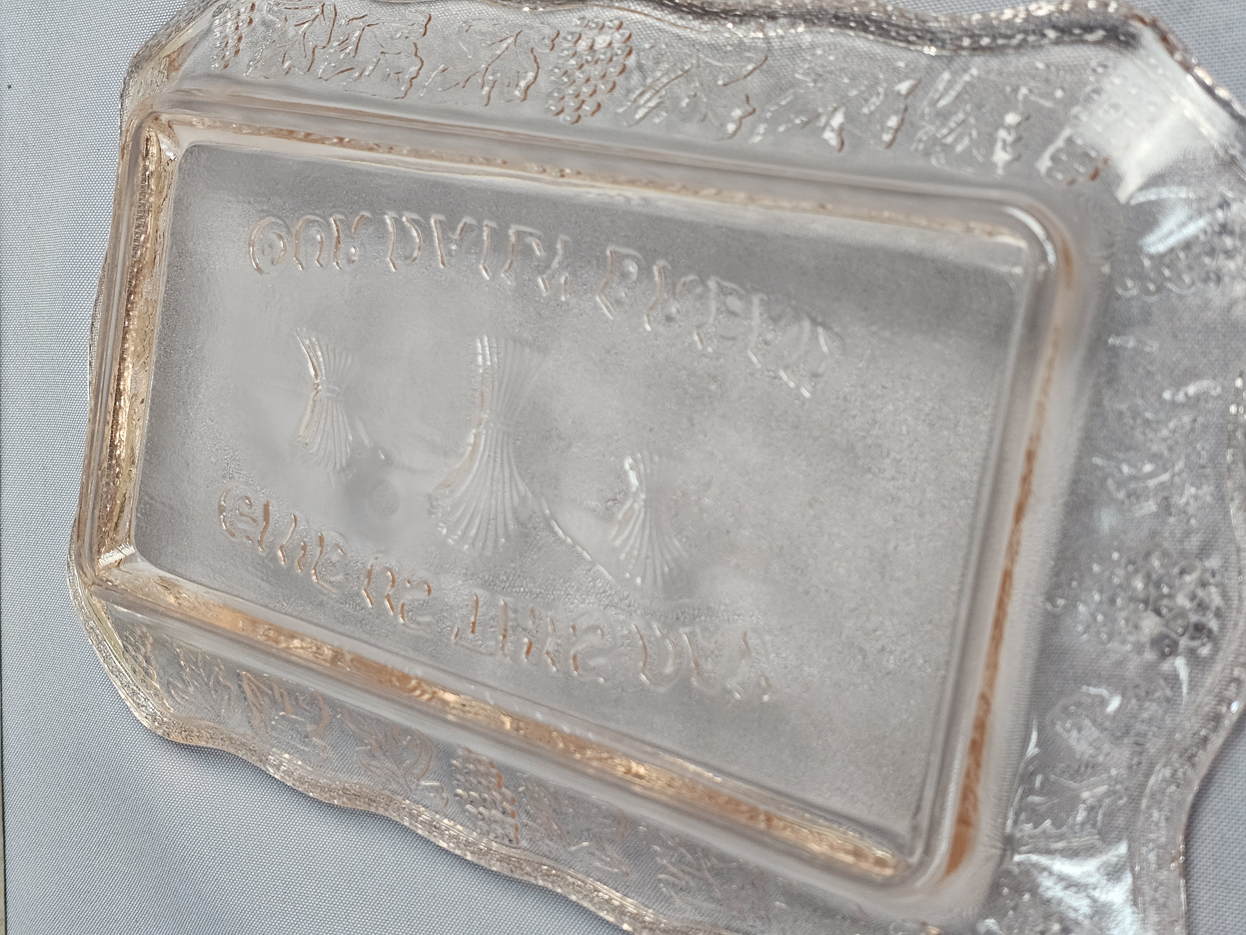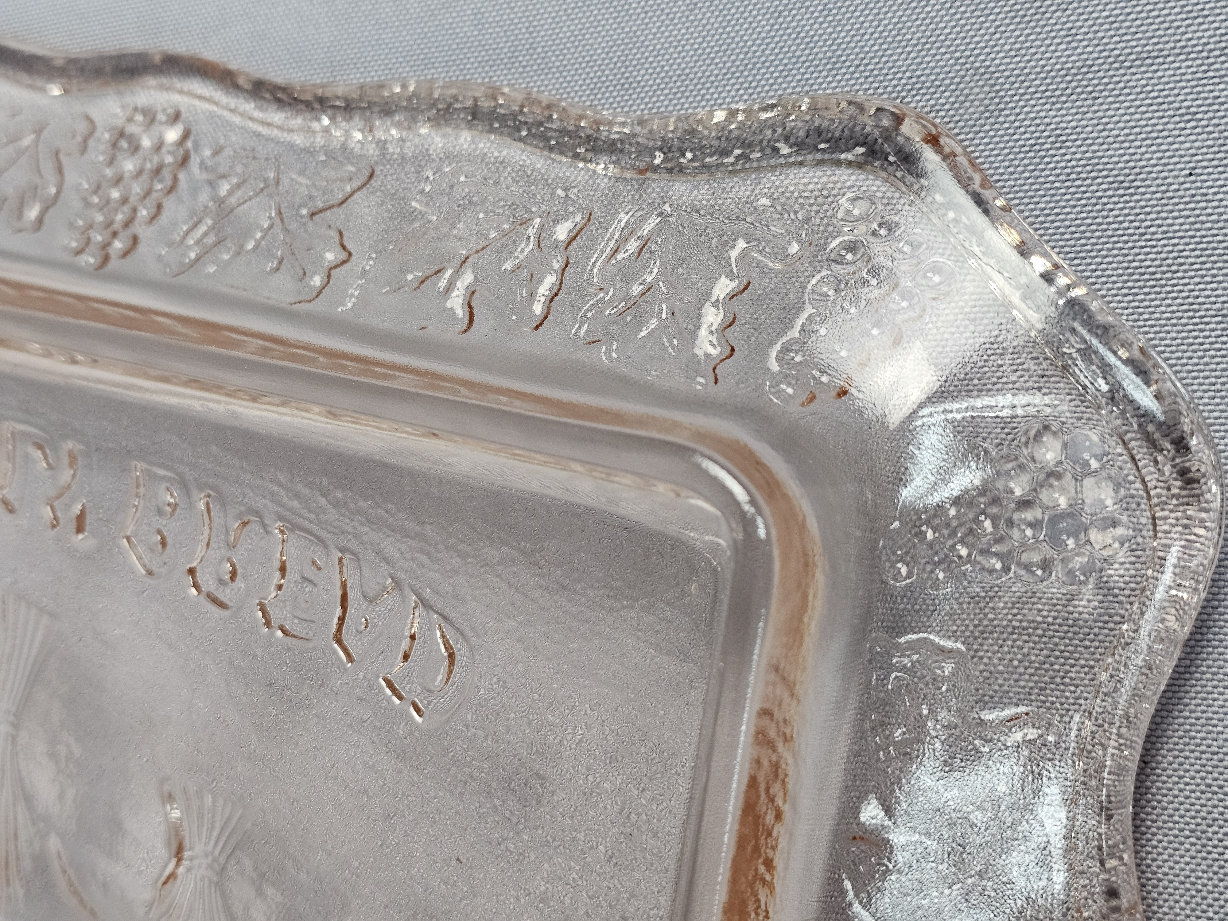 A pair of rectangular pink pressed glass trays marketed by Tiara Exclusives. The first tray features a central panel with a high-relief molded depiction of Leonardo da Vinci’s The Last Supper. The second tray is a bread platter featuring a stippled central panel with three embossed sheaves of wheat and the inscribed text GIVE US THIS DAY OUR DAILY BREAD. This lot includes one original cardboard storage box with the Tiara Exclusive logo and handwritten identification. Approximately 11 inches long Both items are in good vintage condition. Minor manufacturing-related imperfections are present, including small air bubbles and straw marks within the glass. A small nick is visible on the inner ridge of the Last Supper tray. The original box shows significant age-related yellowing, staining, and wear to the corners.