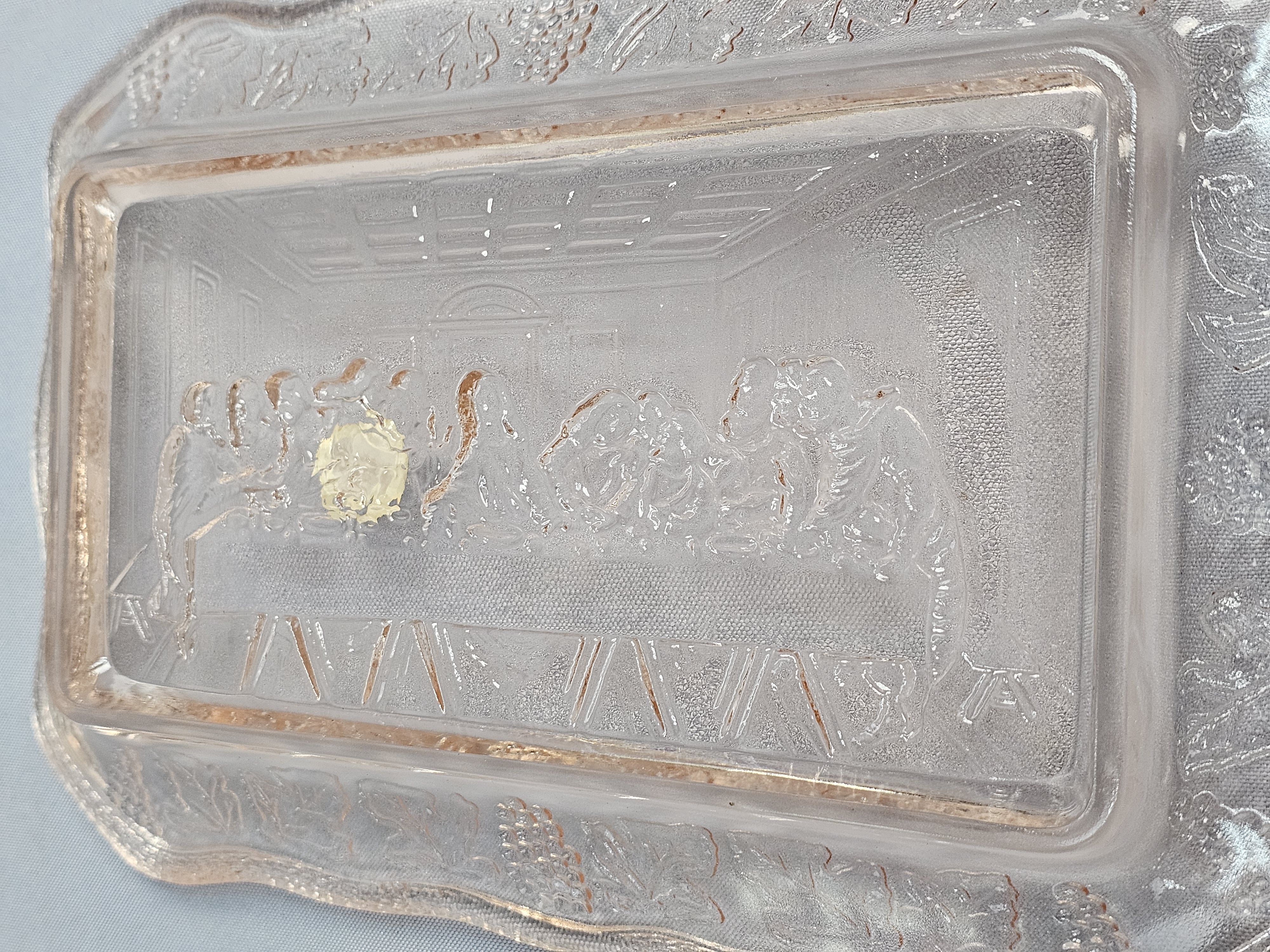 Both items are in good vintage condition. Minor manufacturing-related imperfections are present, including small air bubbles and straw marks within the glass. A small nick is visible on the inner ridge of the Last Supper tray. The original box shows significant age-related yellowing, staining, and wear to the corners.