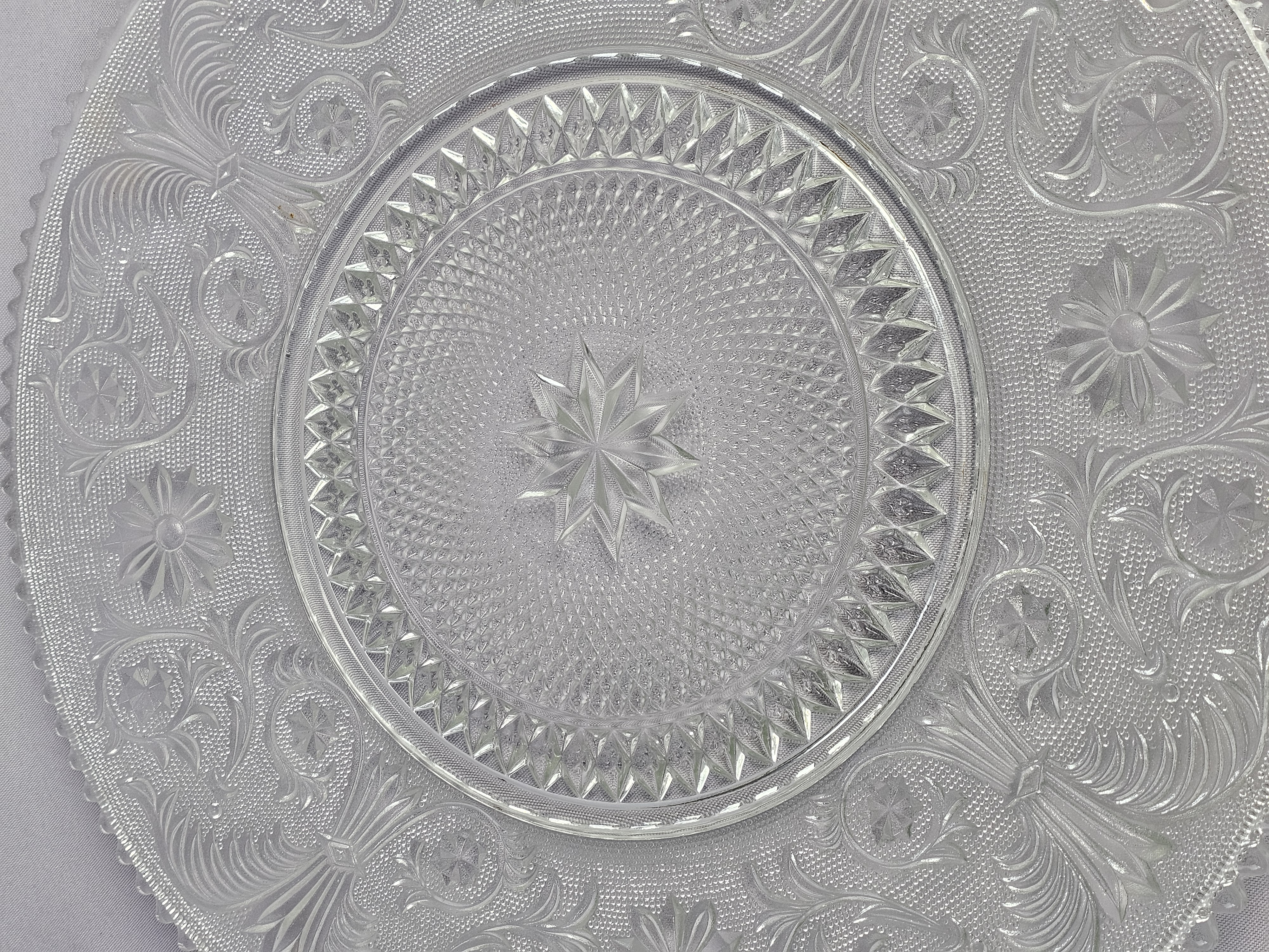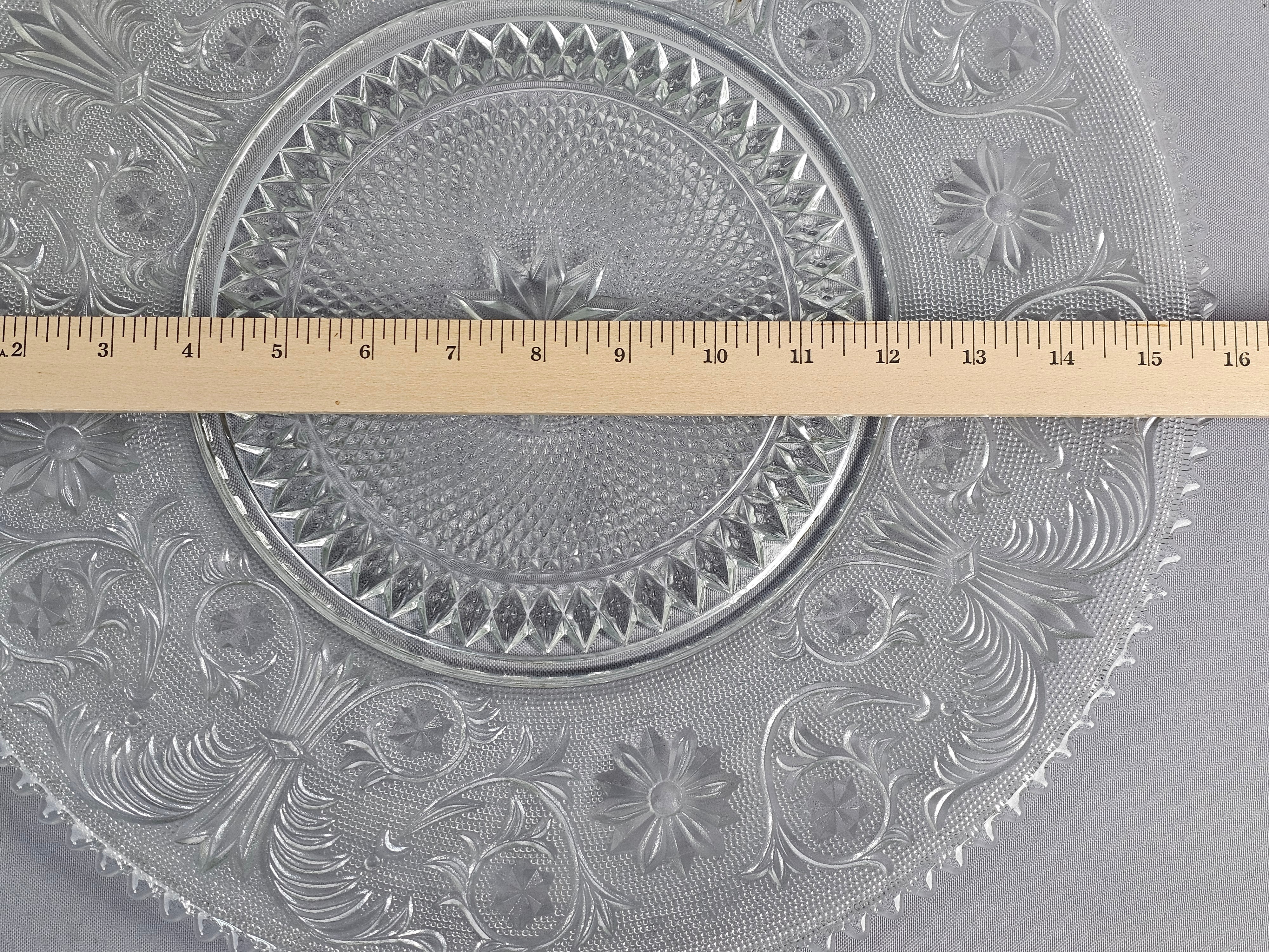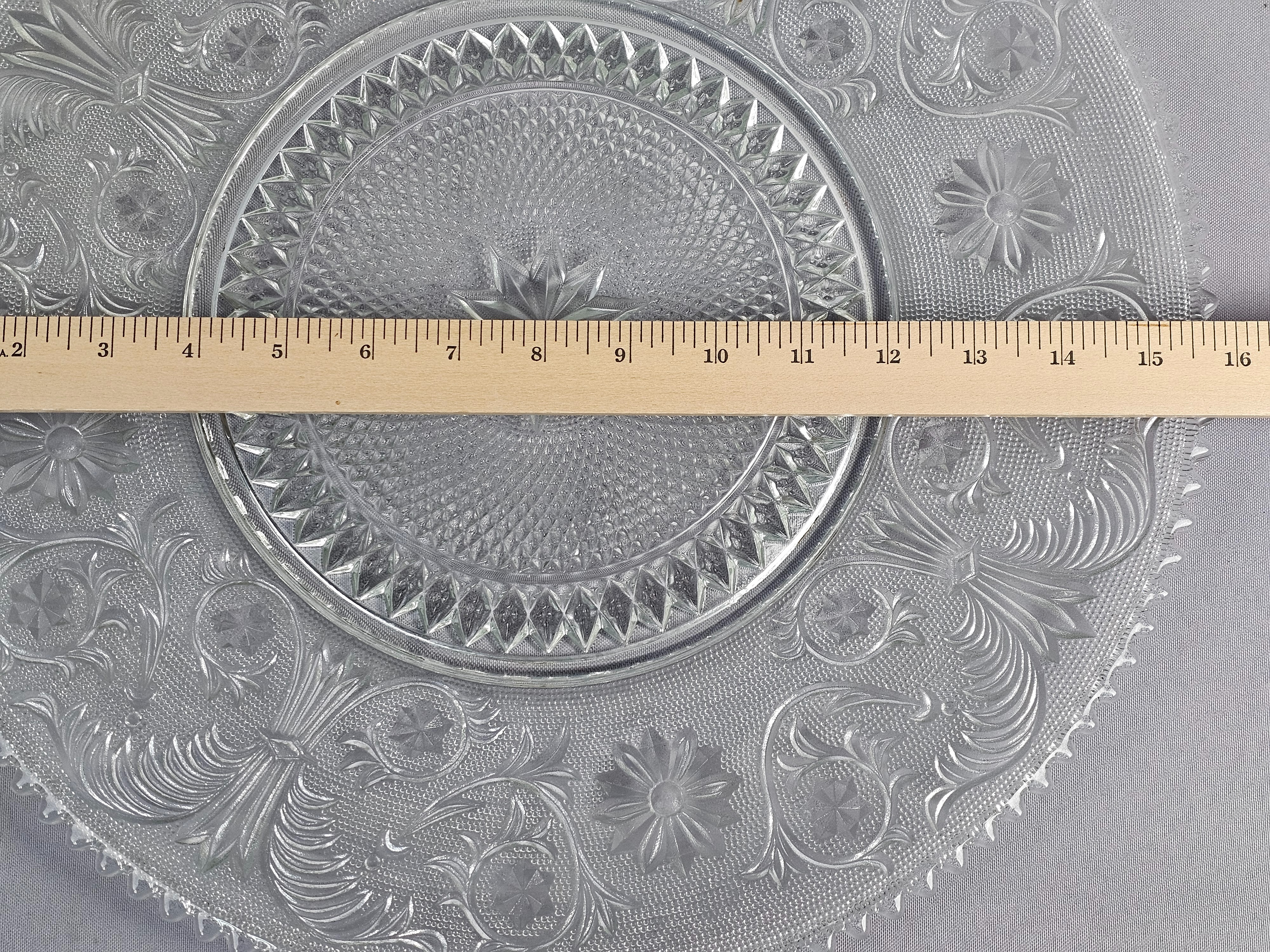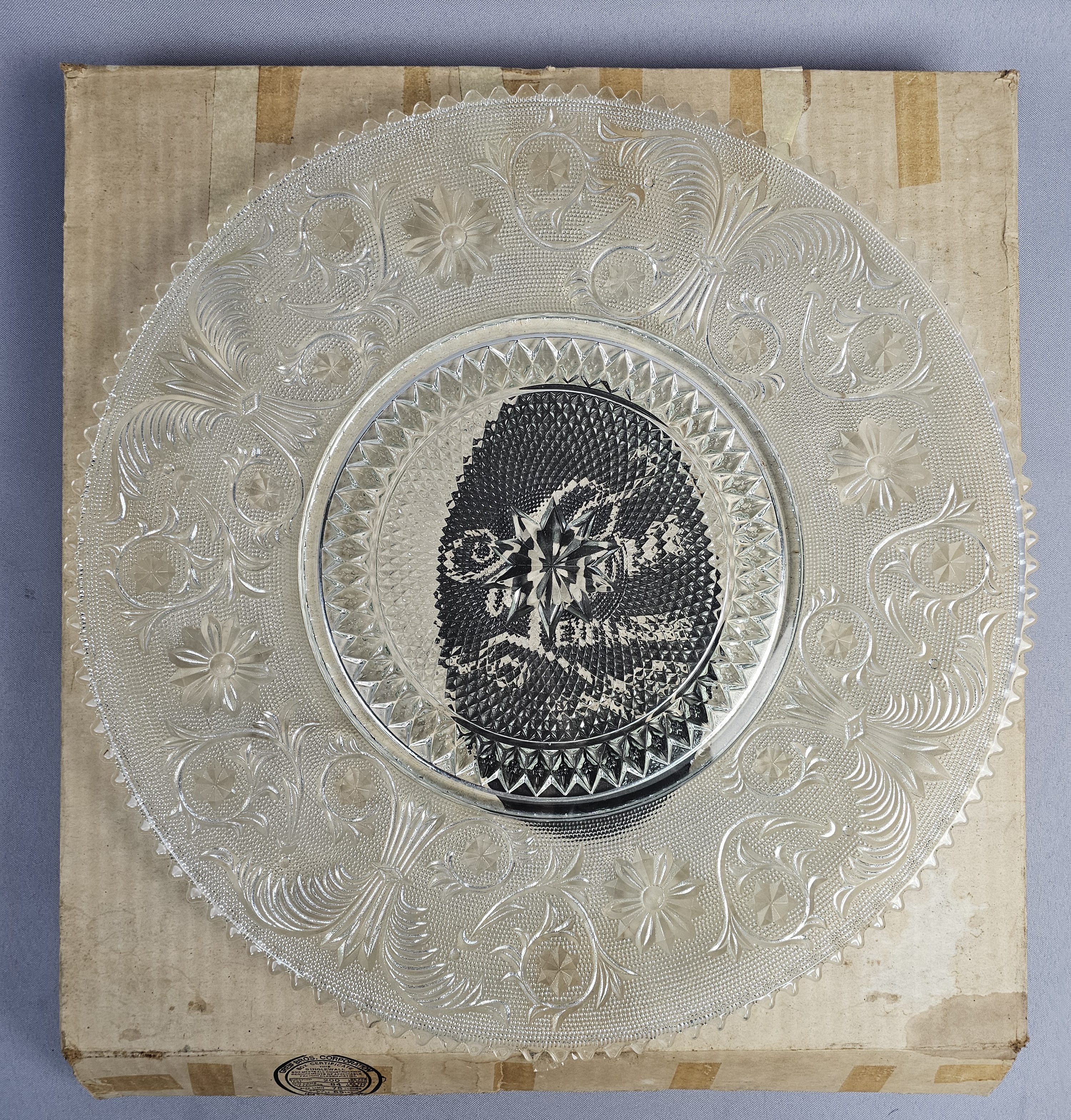 A large clear pressed glass serving plate with original cardboard box. Diameter: 15.5 inches No chips, cracks, or repairs are observed. There is minor shelf wear on the underside contact points consistent with age and use.