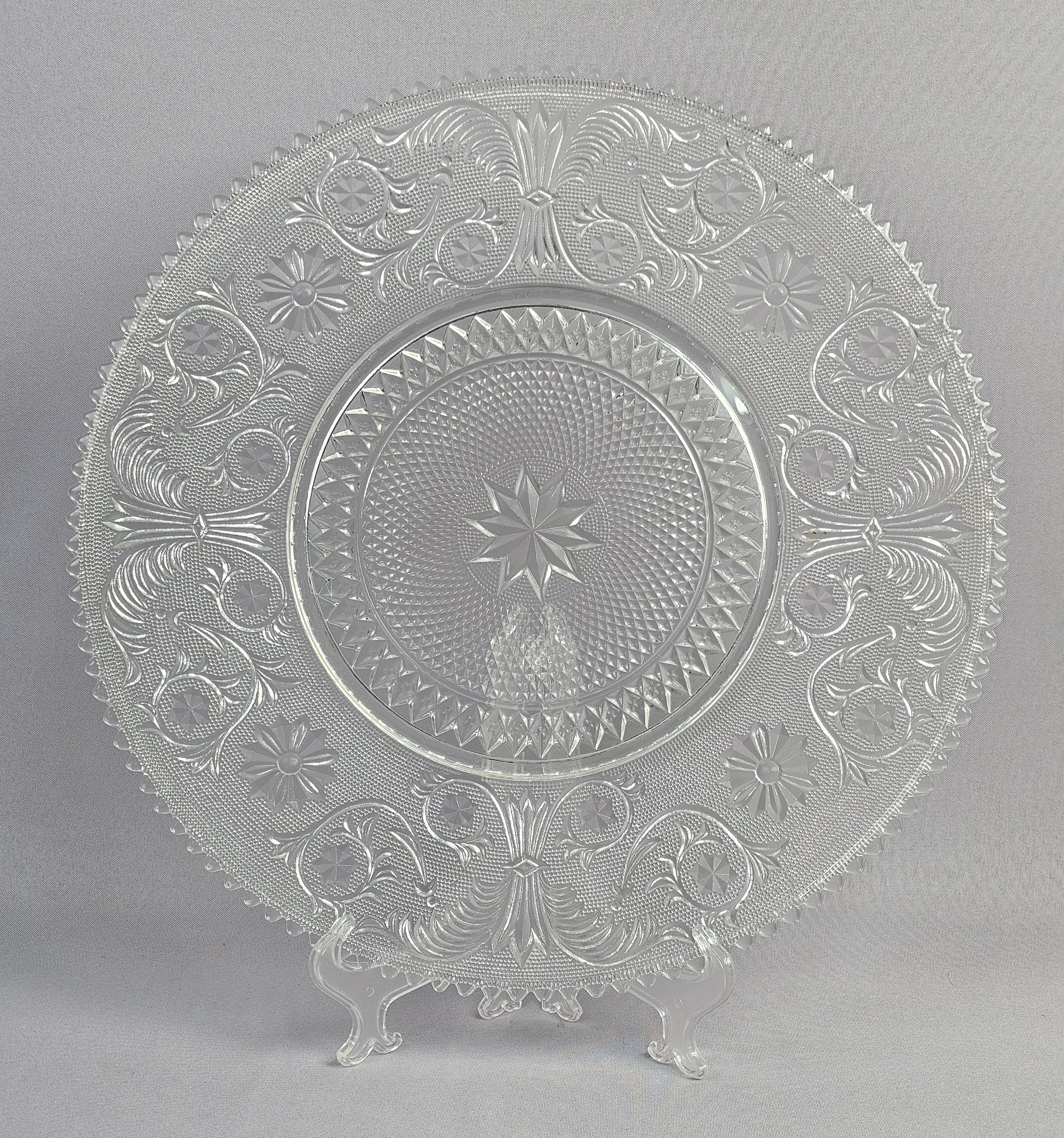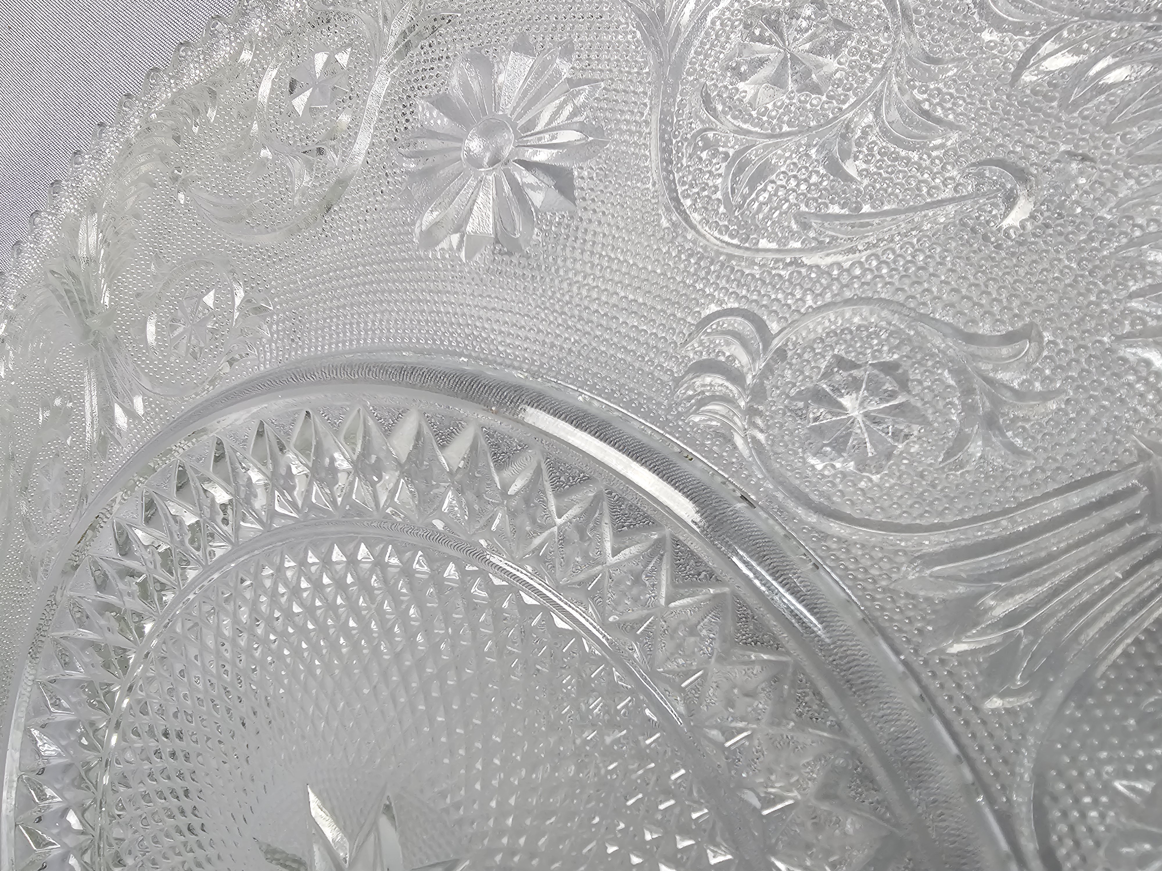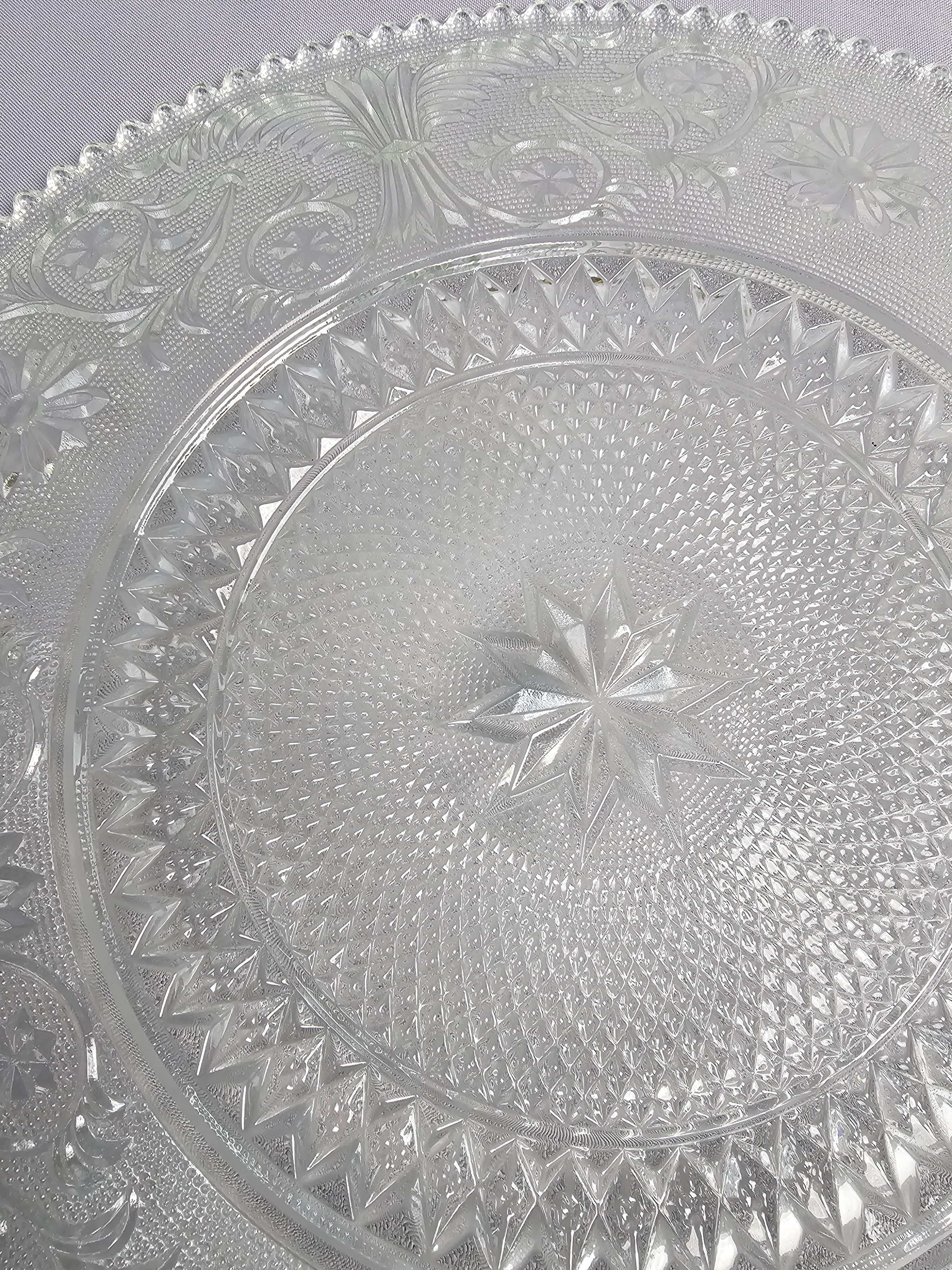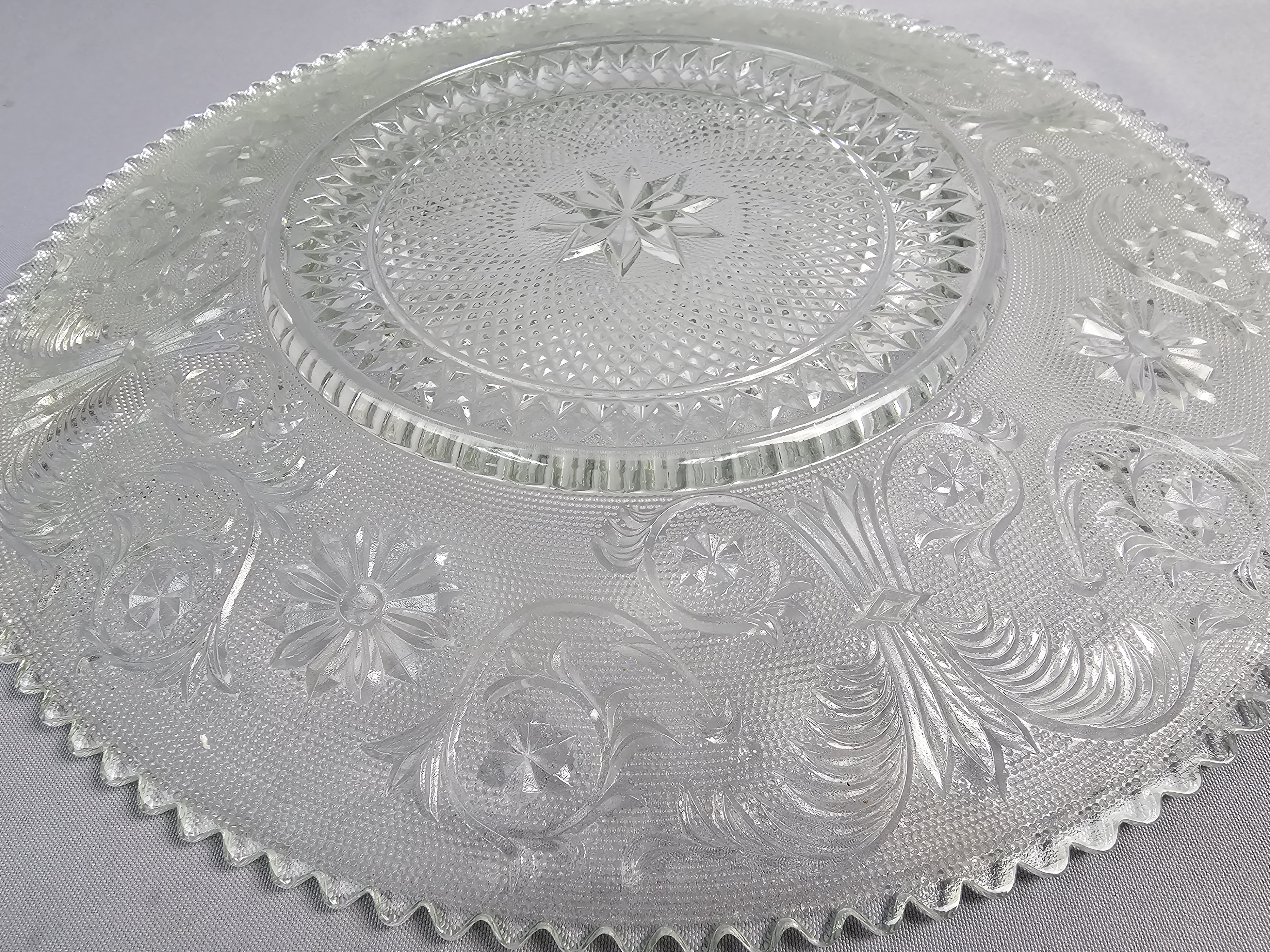 A large clear pressed glass serving plate with original cardboard box. Diameter: 15.5 inches No chips, cracks, or repairs are observed. There is minor shelf wear on the underside contact points consistent with age and use.