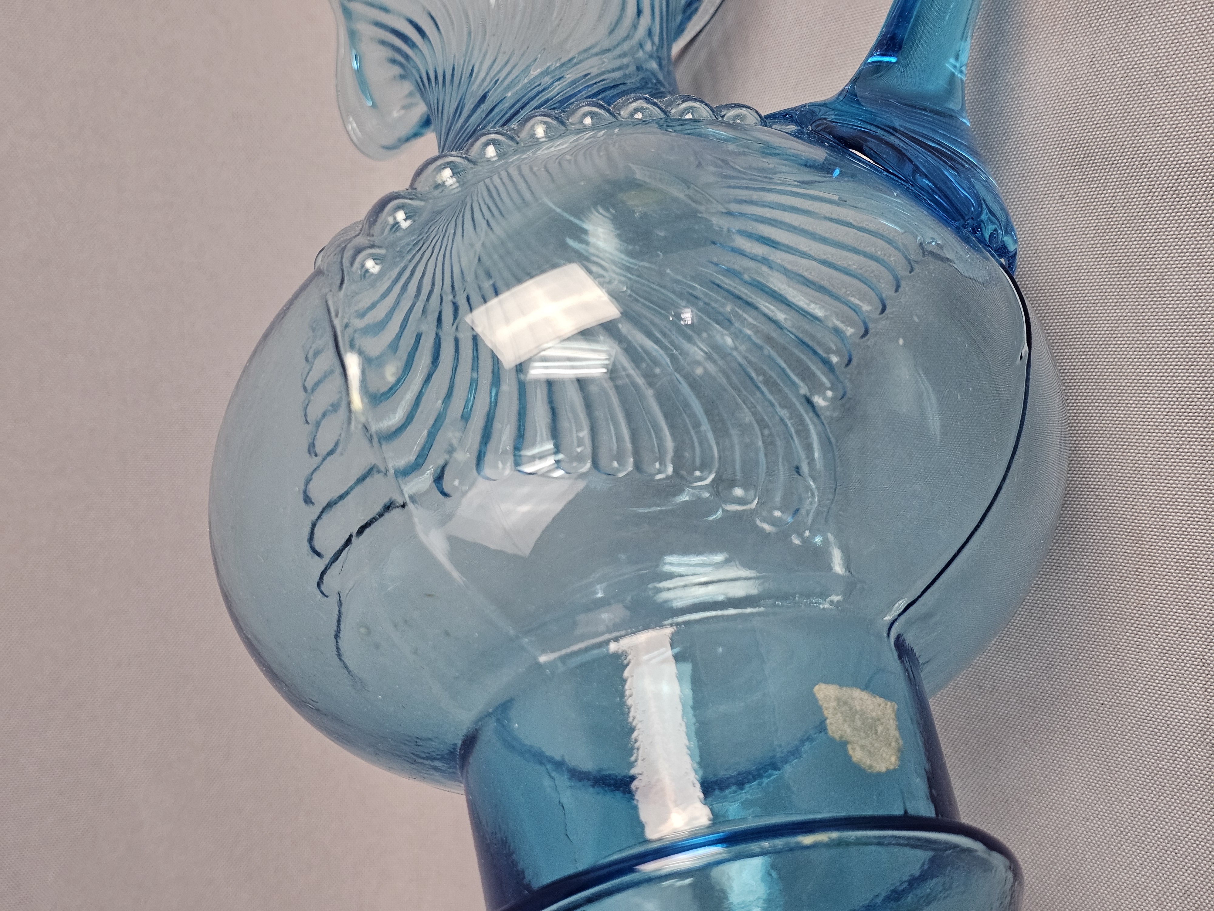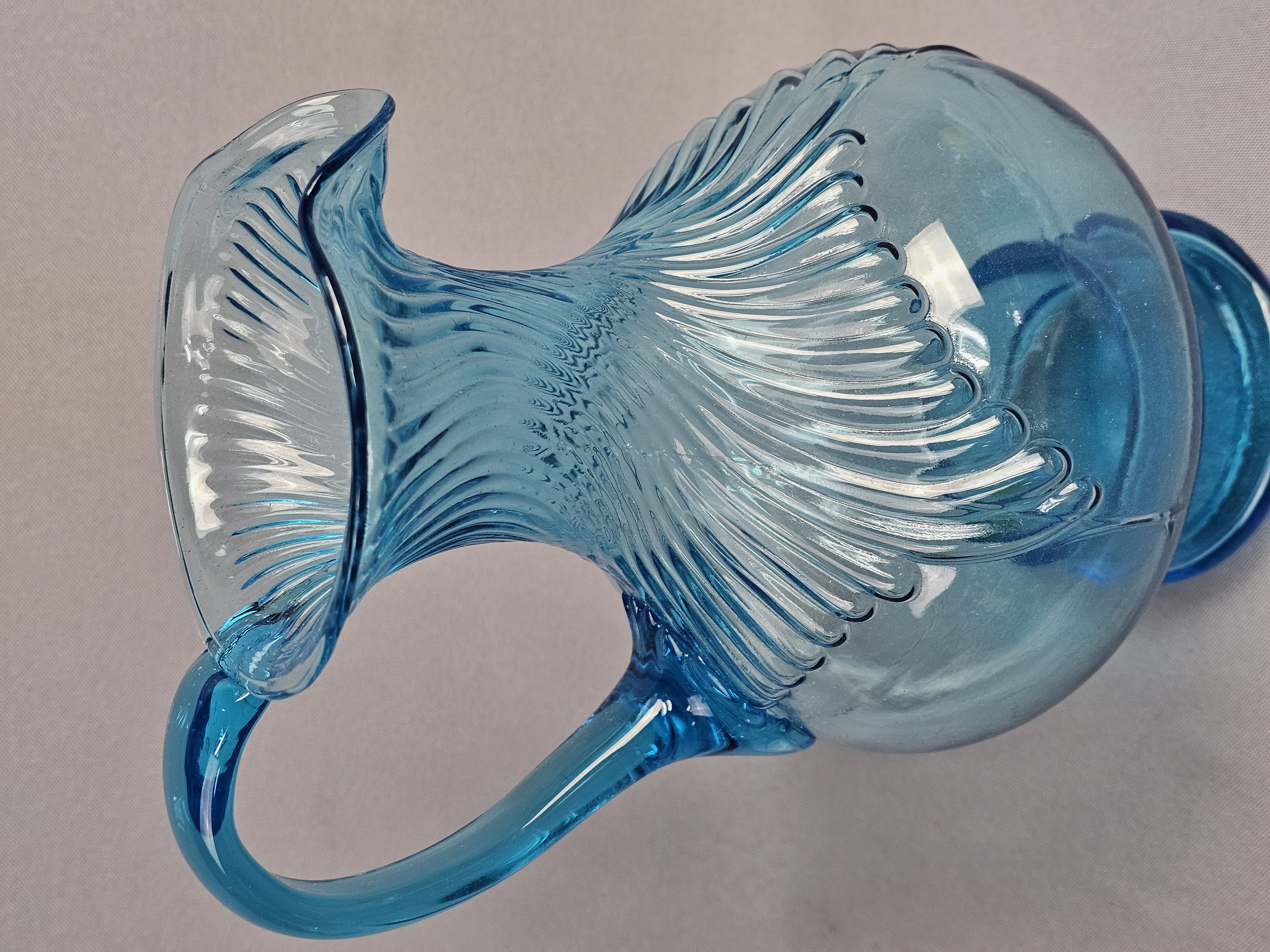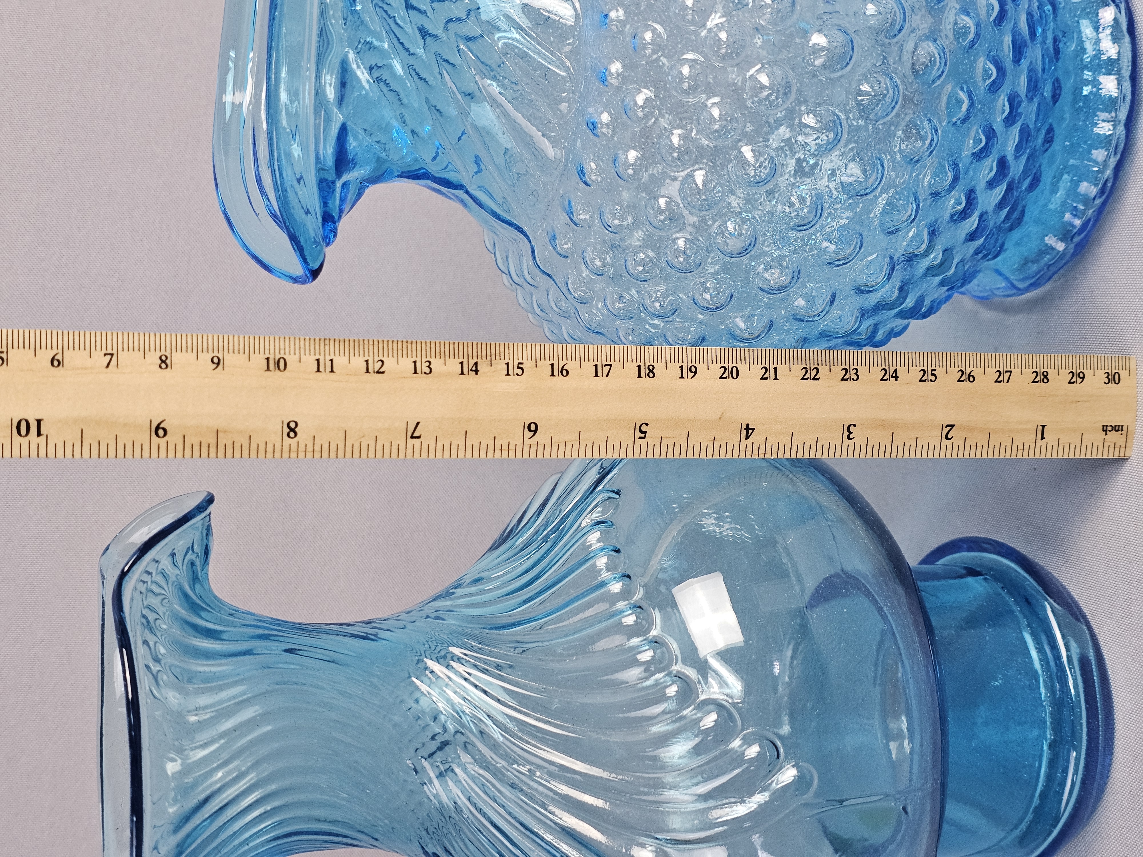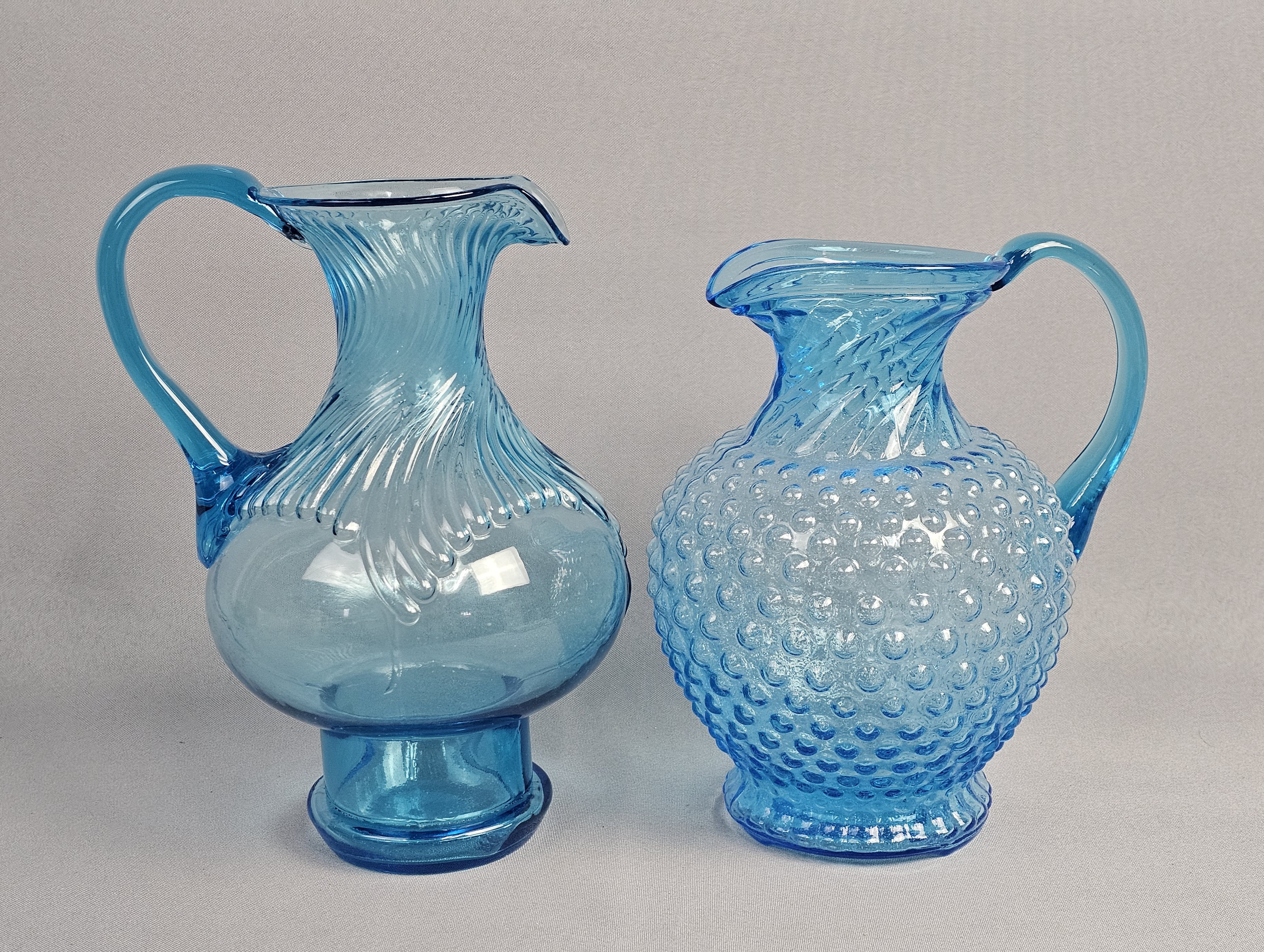 This pair of pressed glass pitchers is attributed to Tiara Exclusives and was manufactured by the Indiana Glass Company. Pitchers measure approximately 8.5 and 9.5 inches tall. No chips, cracks, or repairs are visible. One item has a small amount of adhesive residue from a former paper label on the lower body. Standard light shelf wear is present on the bases of both items.