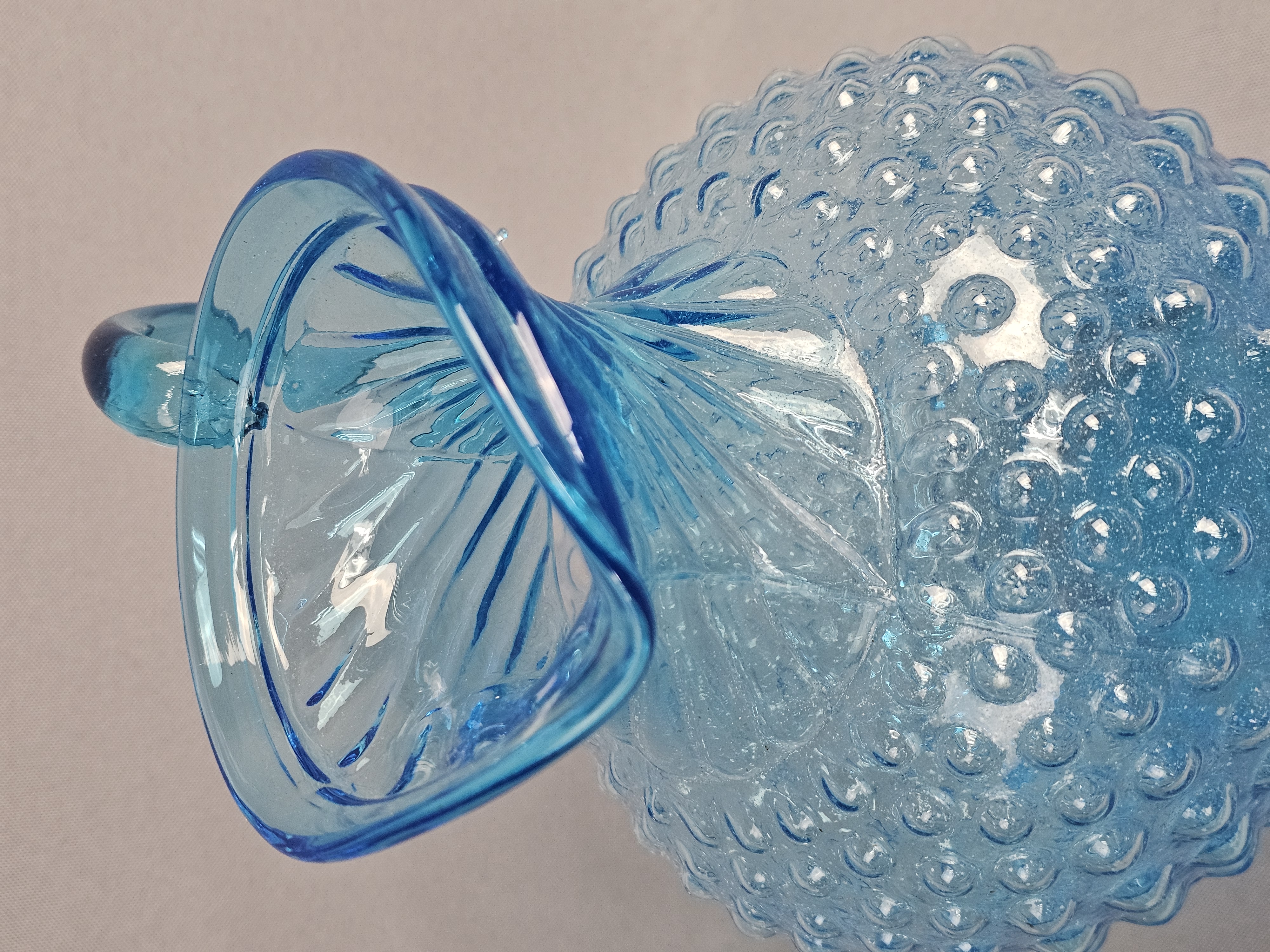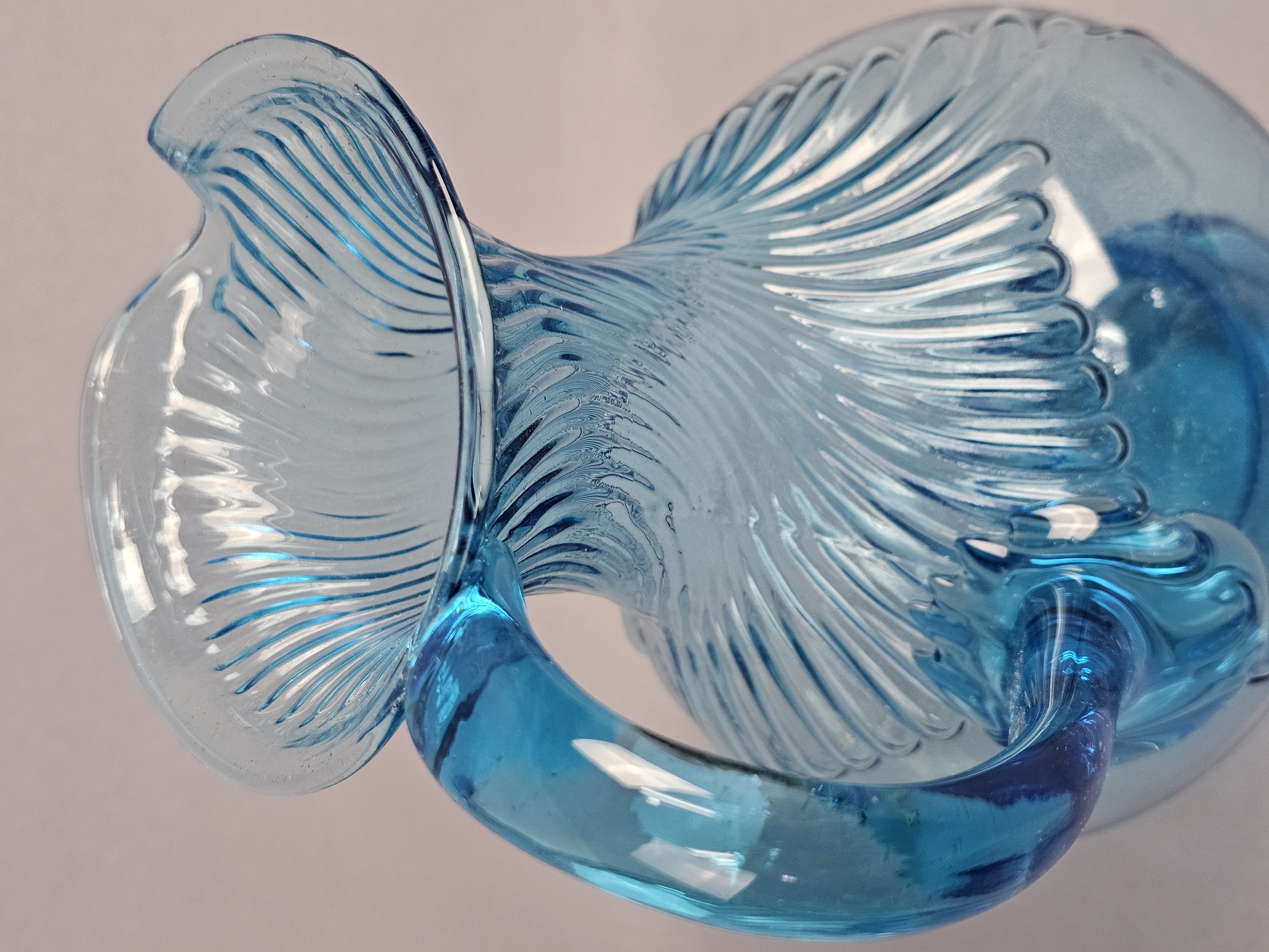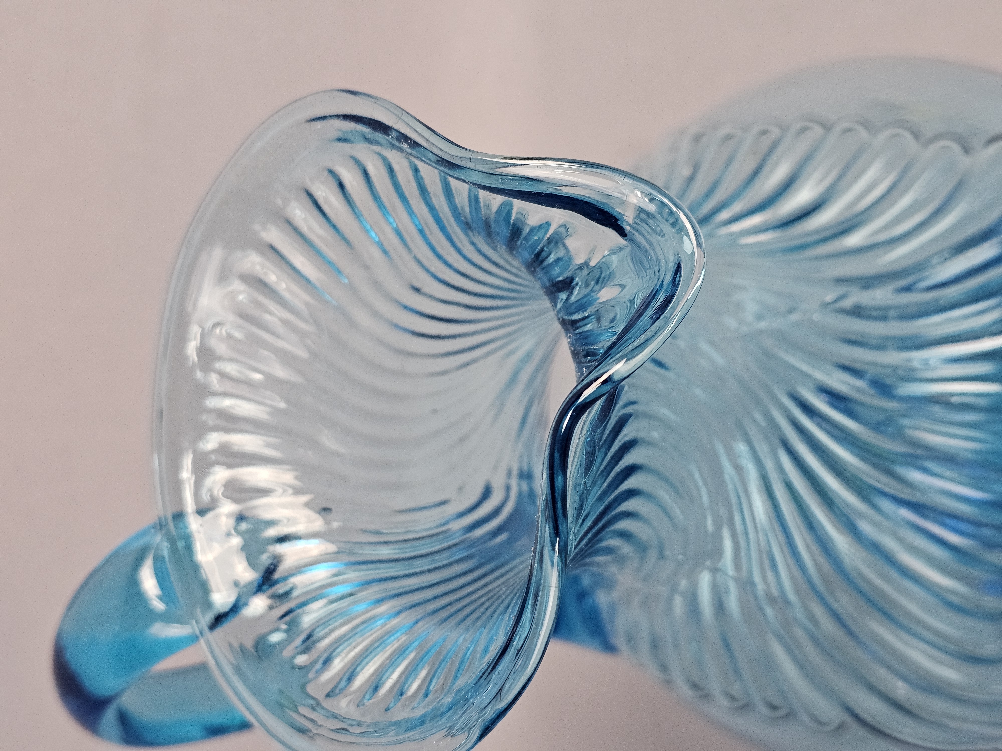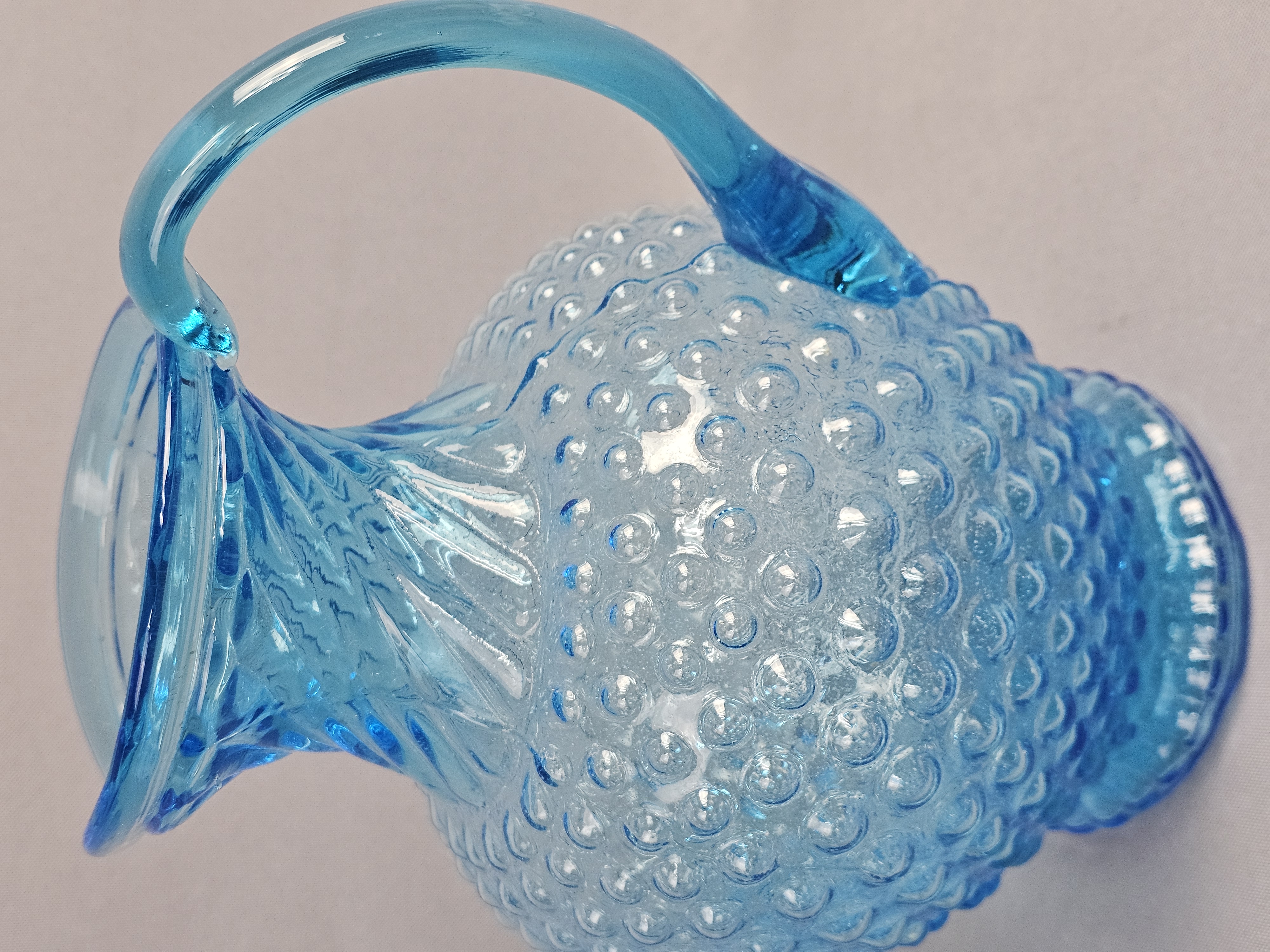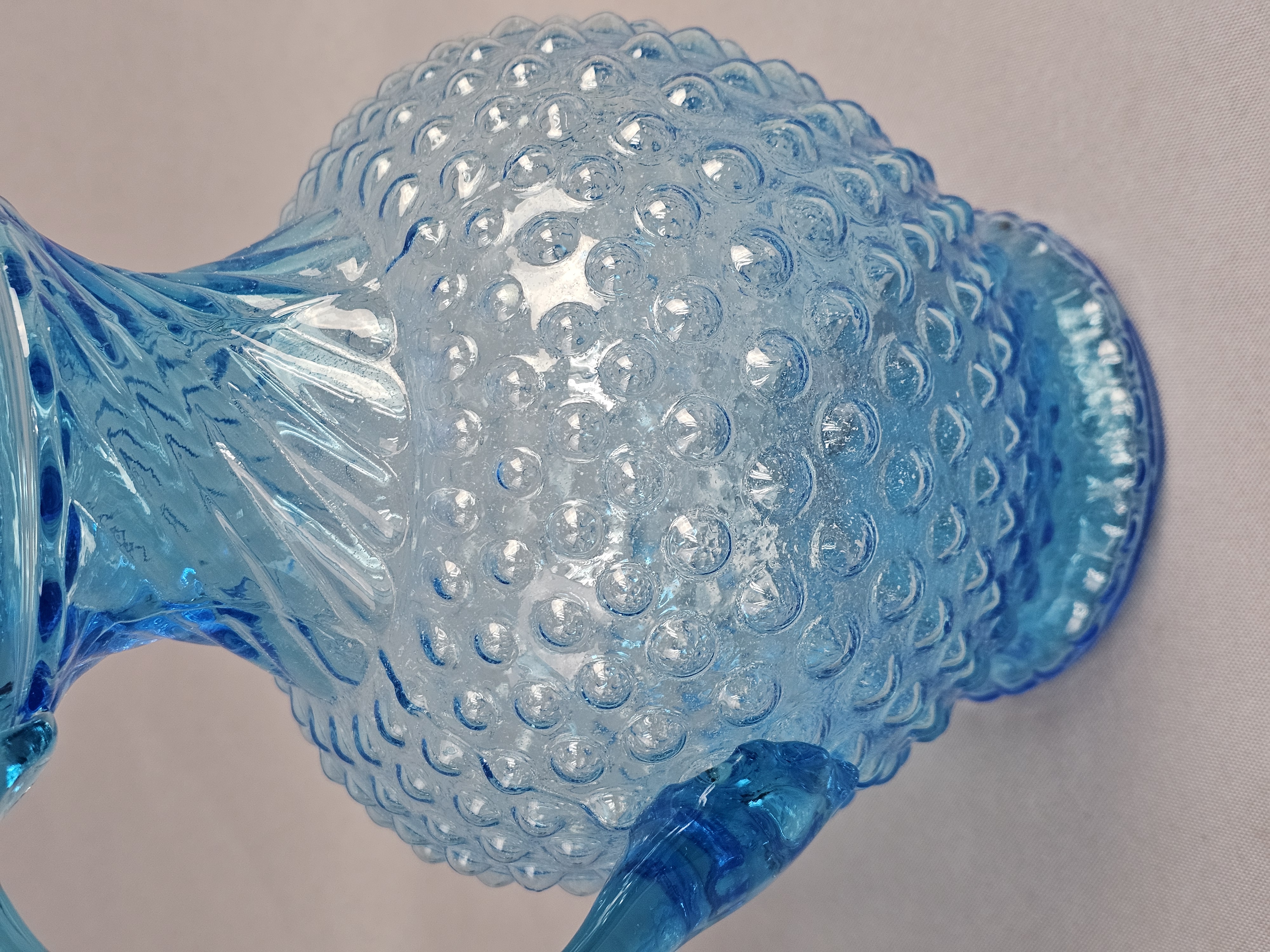 This pair of pressed glass pitchers is attributed to Tiara Exclusives and was manufactured by the Indiana Glass Company. Pitchers measure approximately 8.5 and 9.5 inches tall. No chips, cracks, or repairs are visible. One item has a small amount of adhesive residue from a former paper label on the lower body. Standard light shelf wear is present on the bases of both items.
