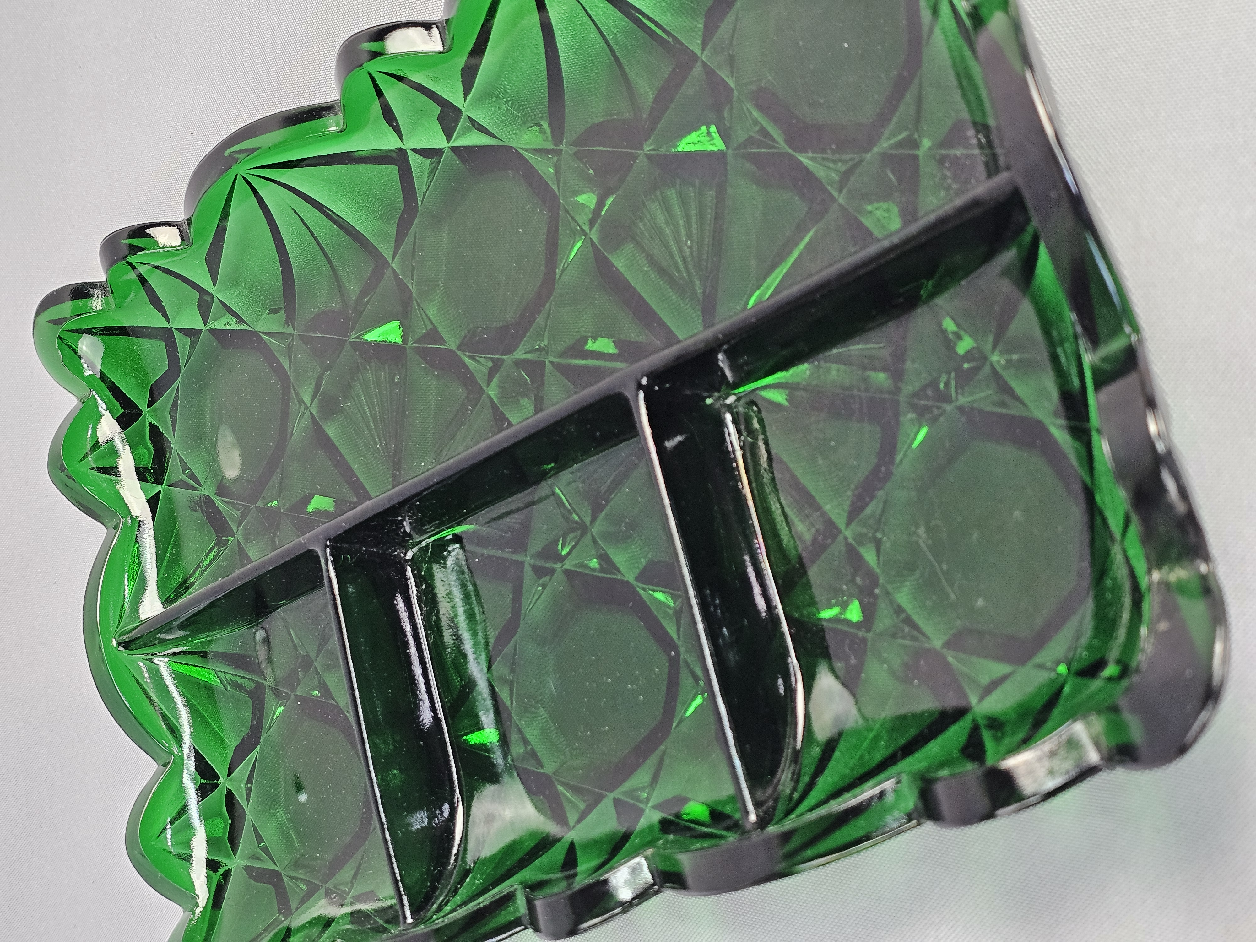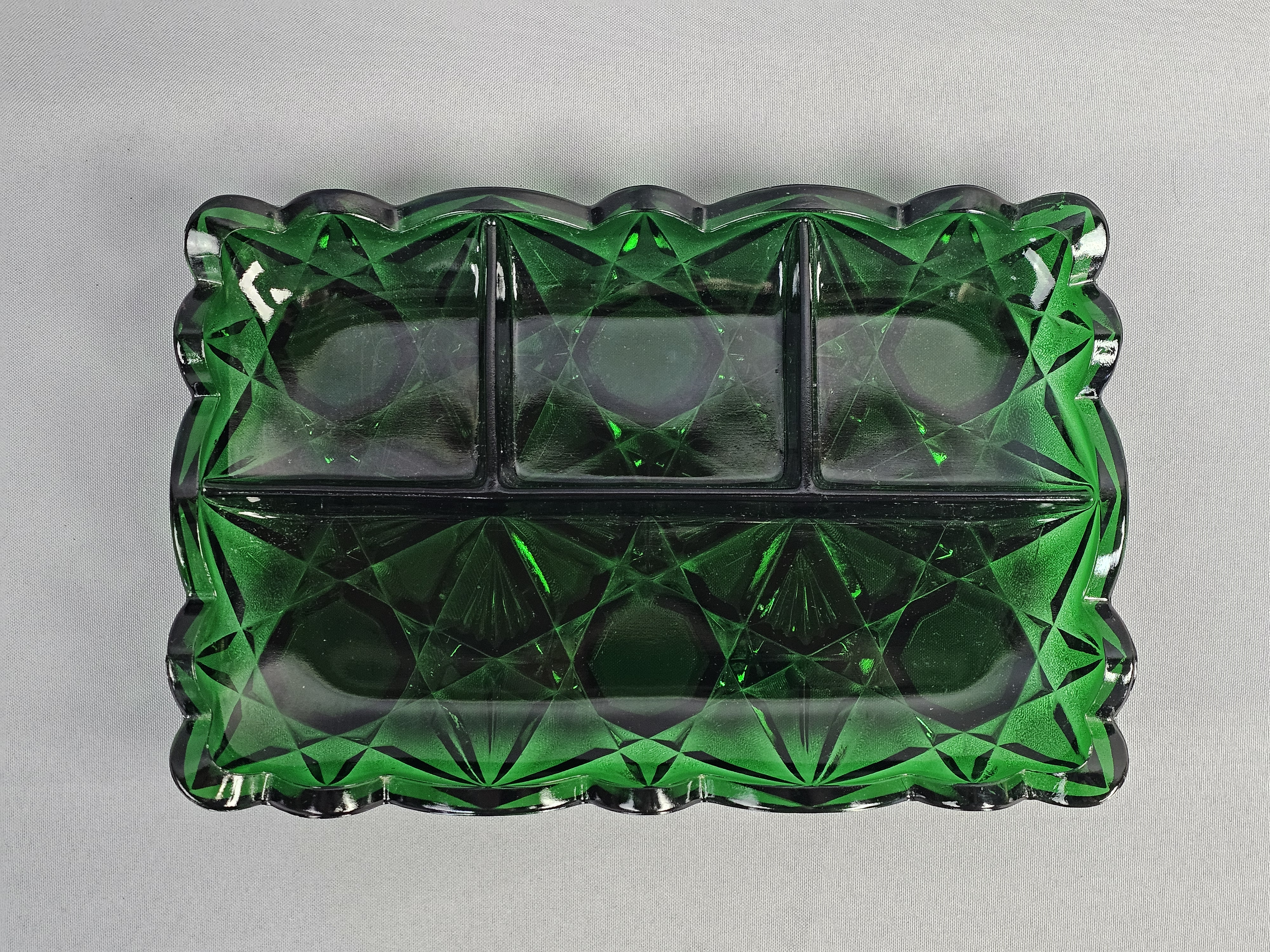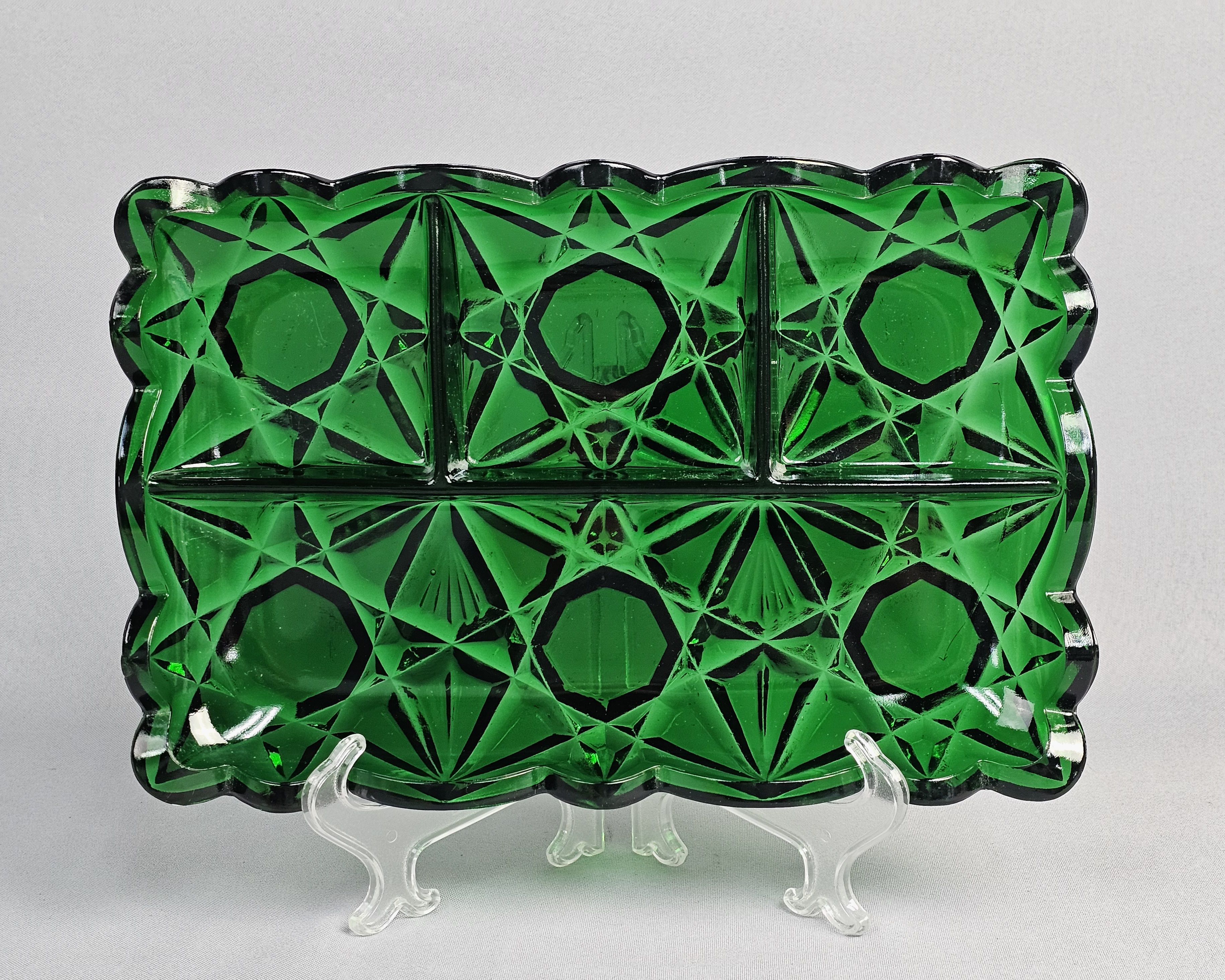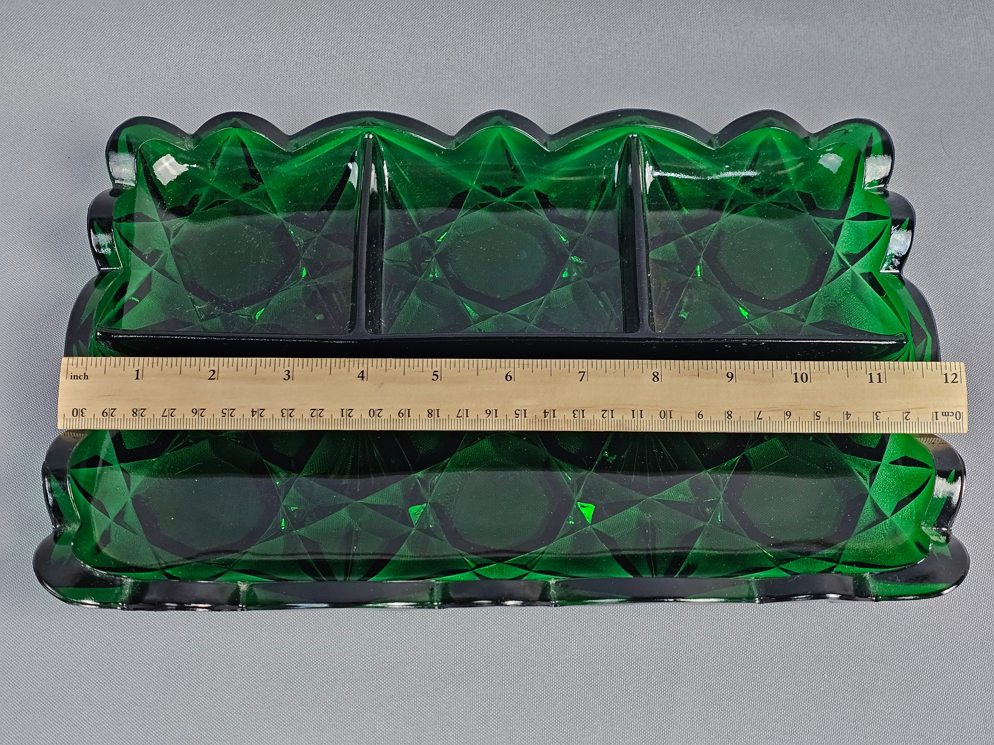 A rectangular pressed glass divided serving tray or relish dish in emerald green. The piece features a geometric pattern consisting of large octagonal panels surrounded by radiating star and diamond motifs. Approximately 12 inches long. The item is in good overall condition with wear consistent with age and use. Several small nicks and flea bites are visible along the scalloped rim and the edges of the interior dividers. The interior base of the compartments shows light surface scratching. No major cracks or large chips are noted.