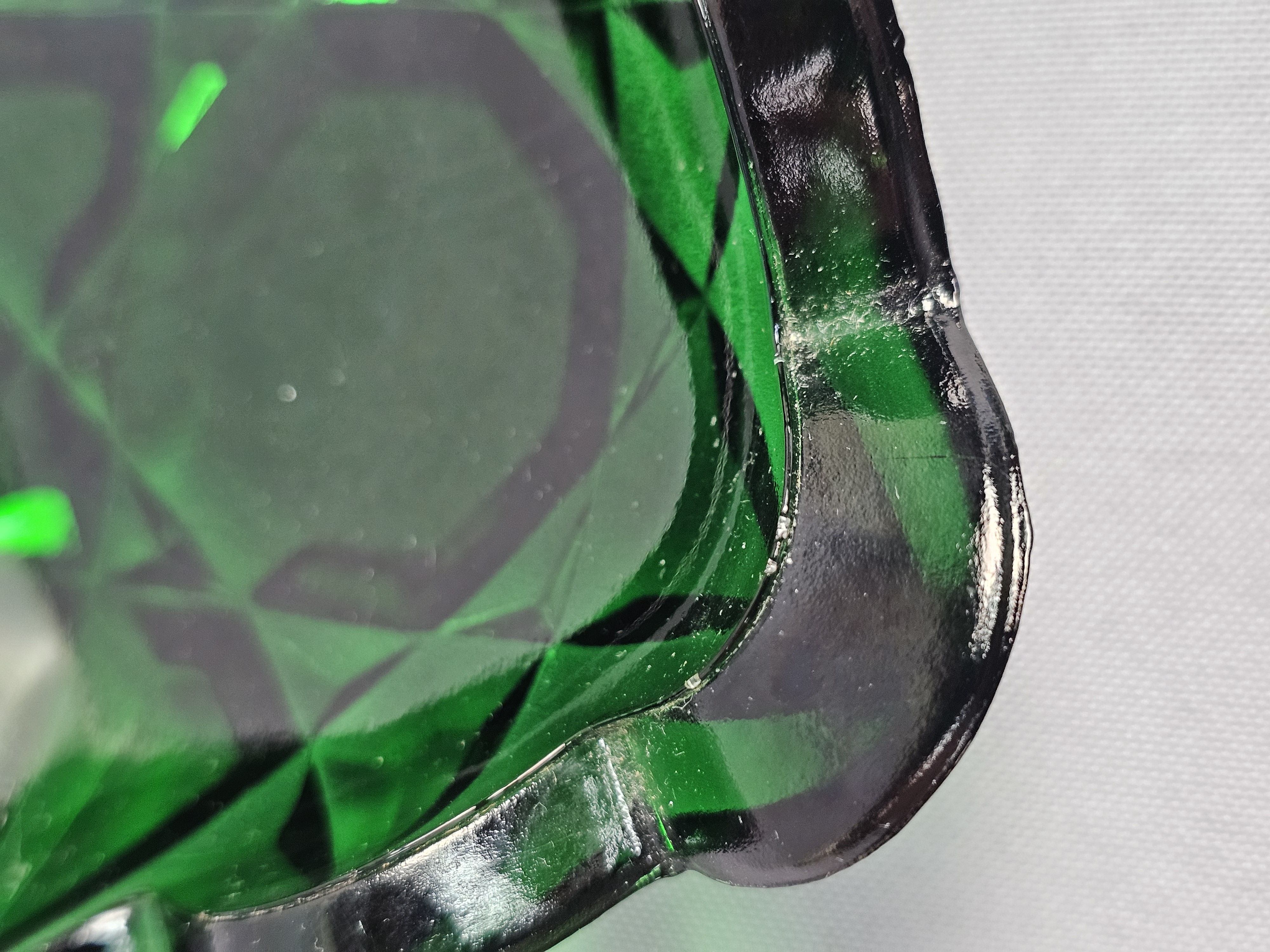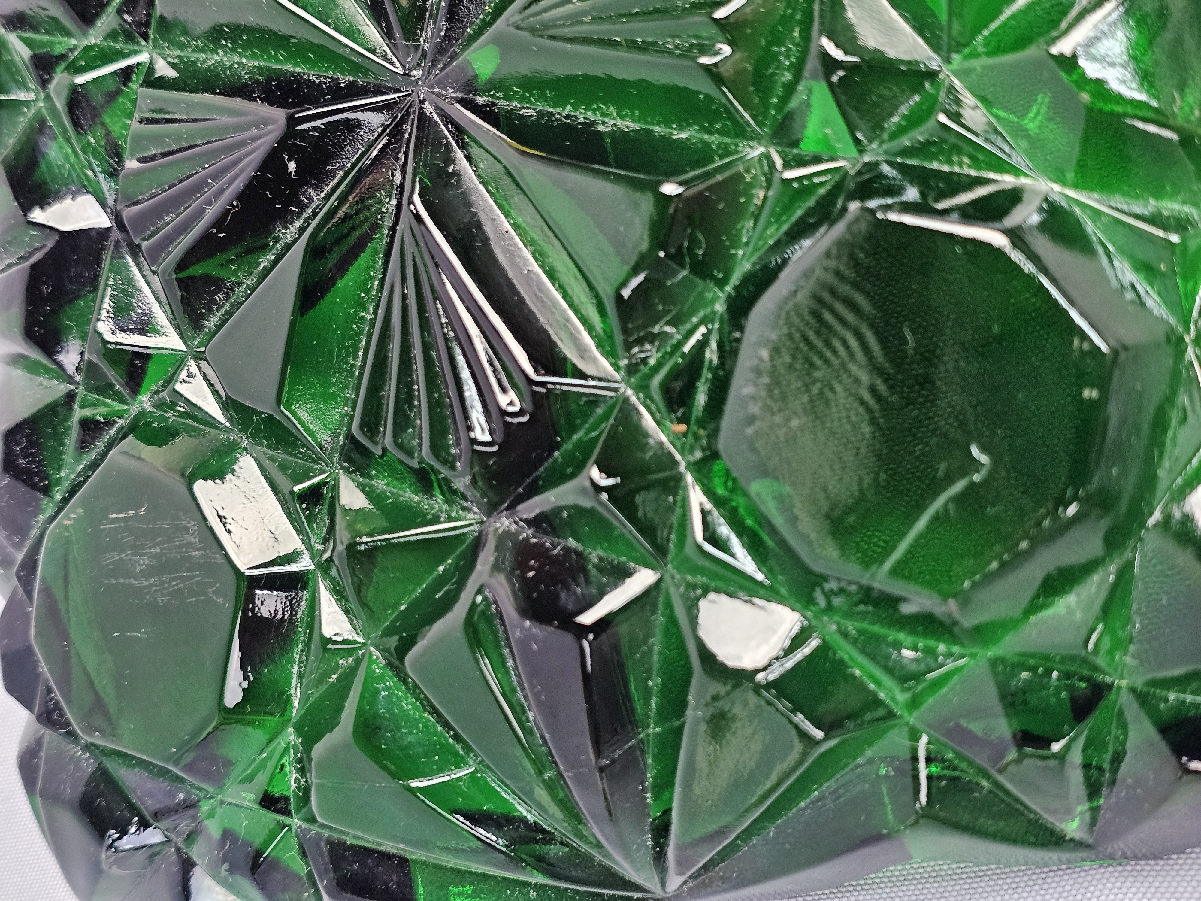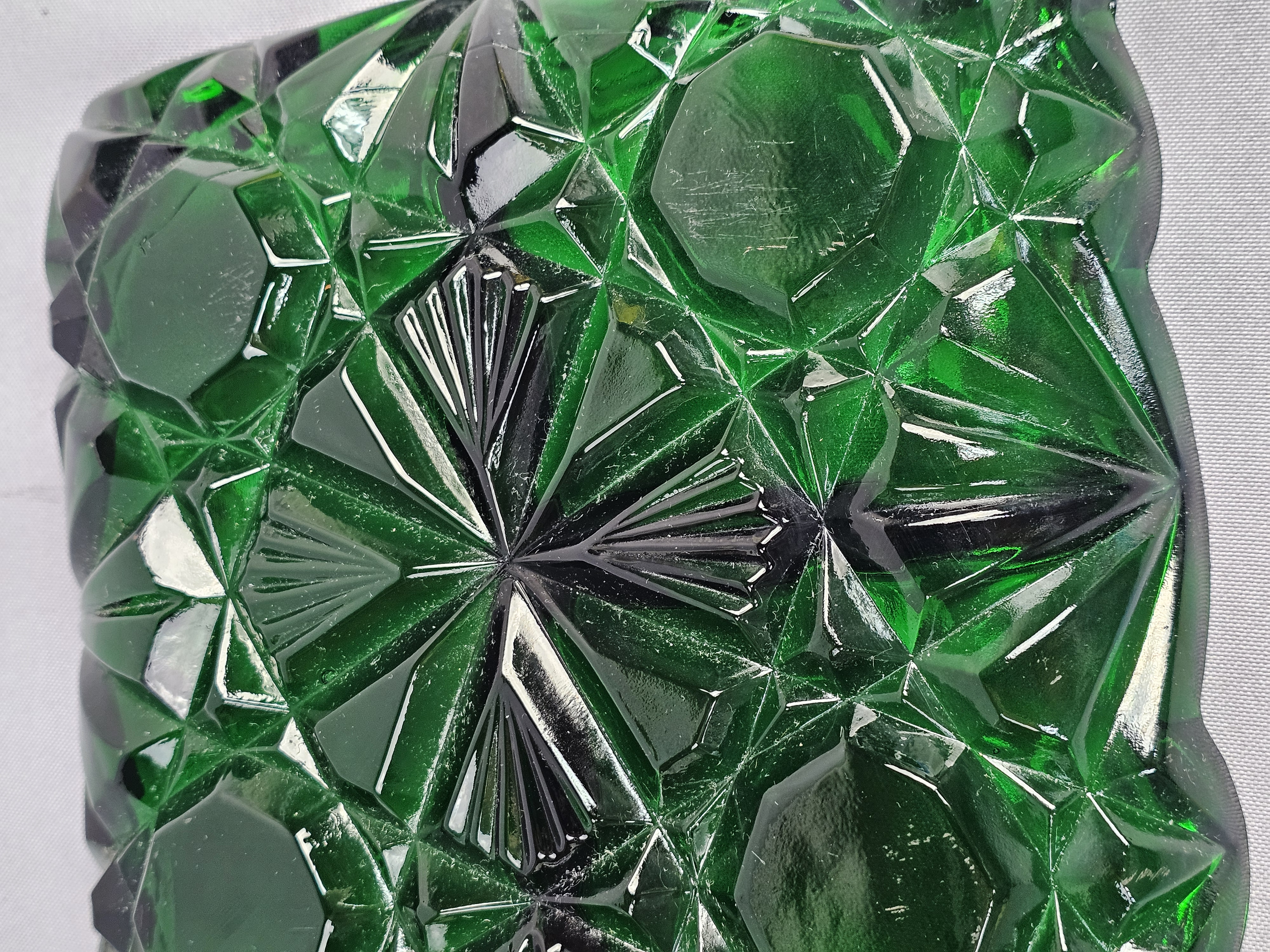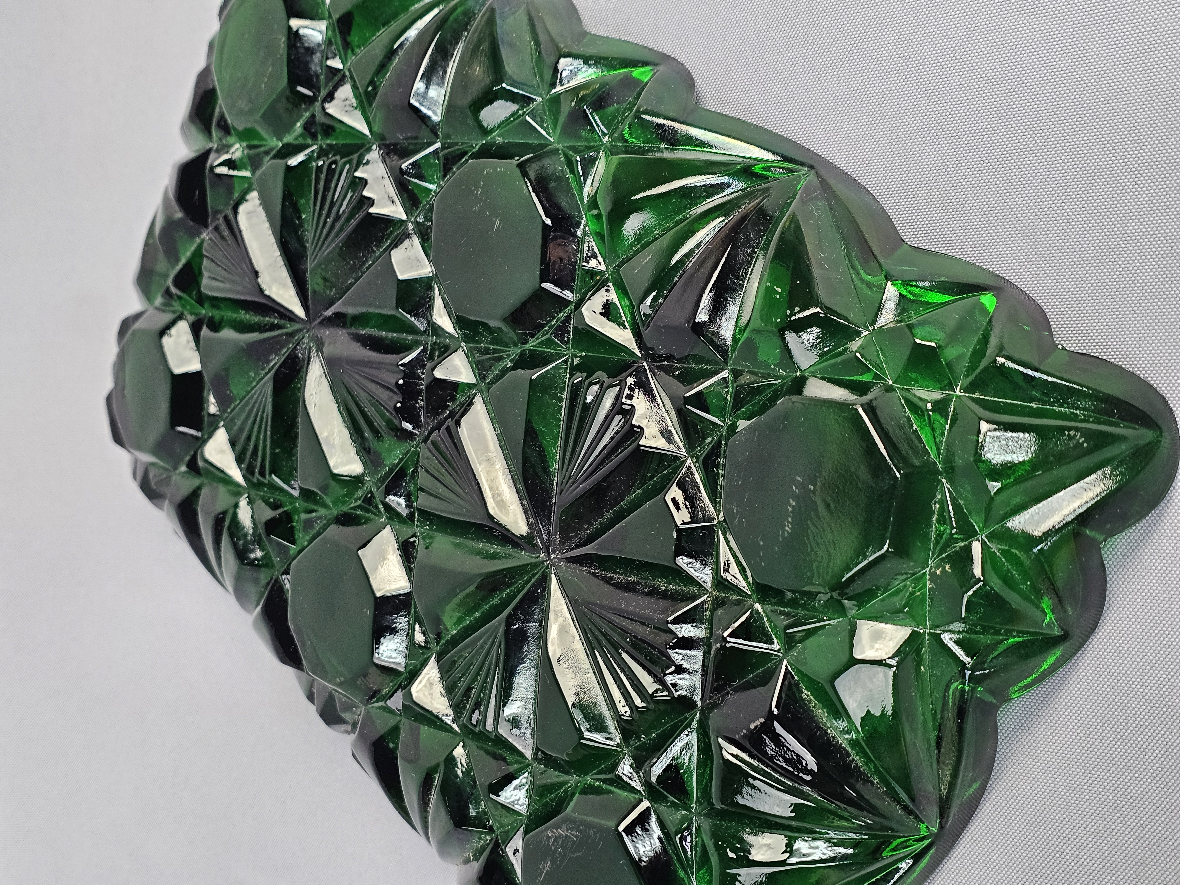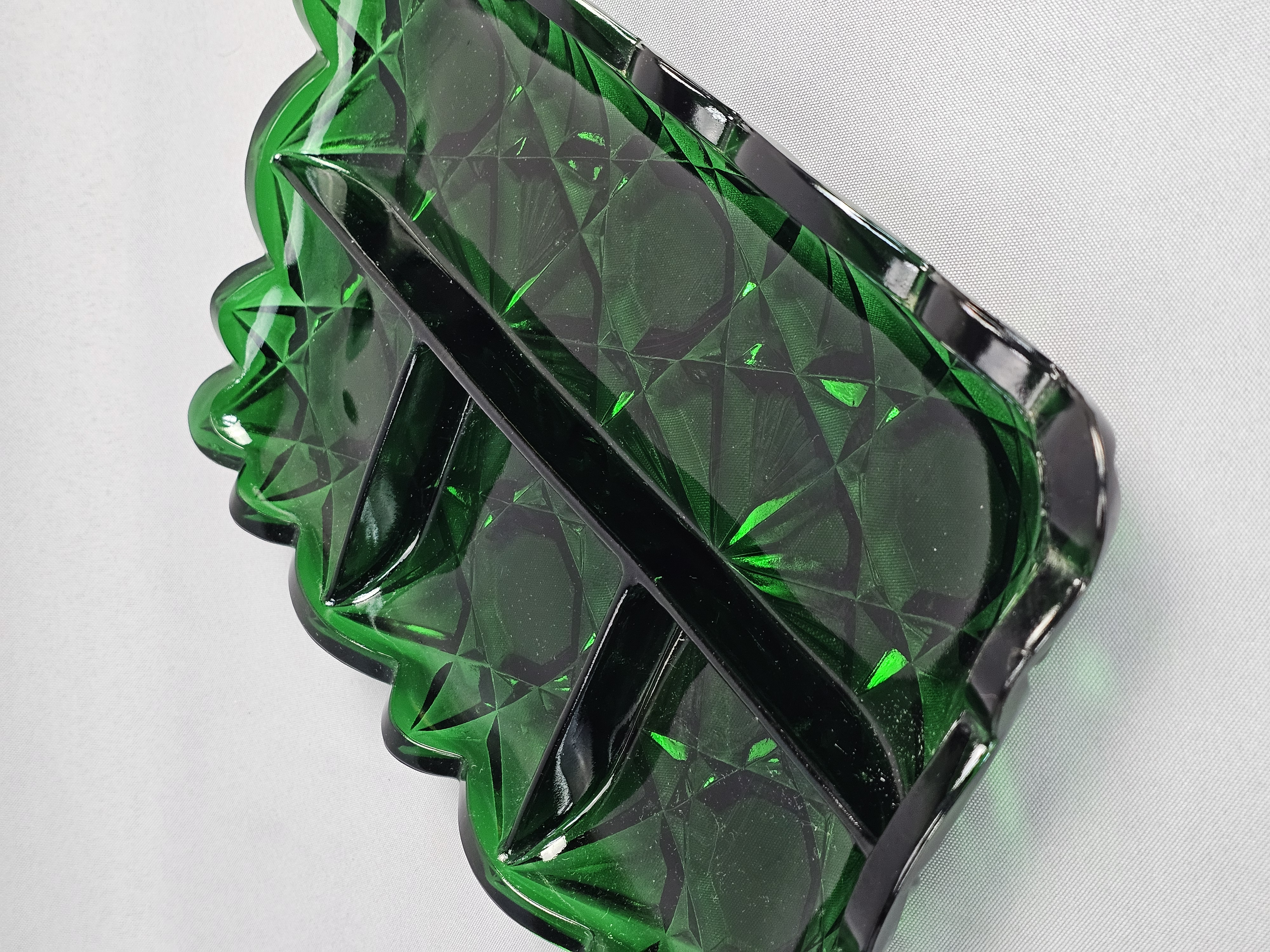 A rectangular pressed glass divided serving tray or relish dish in emerald green. The piece features a geometric pattern consisting of large octagonal panels surrounded by radiating star and diamond motifs. Approximately 12 inches long. The item is in good overall condition with wear consistent with age and use. Several small nicks and flea bites are visible along the scalloped rim and the edges of the interior dividers. The interior base of the compartments shows light surface scratching. No major cracks or large chips are noted.