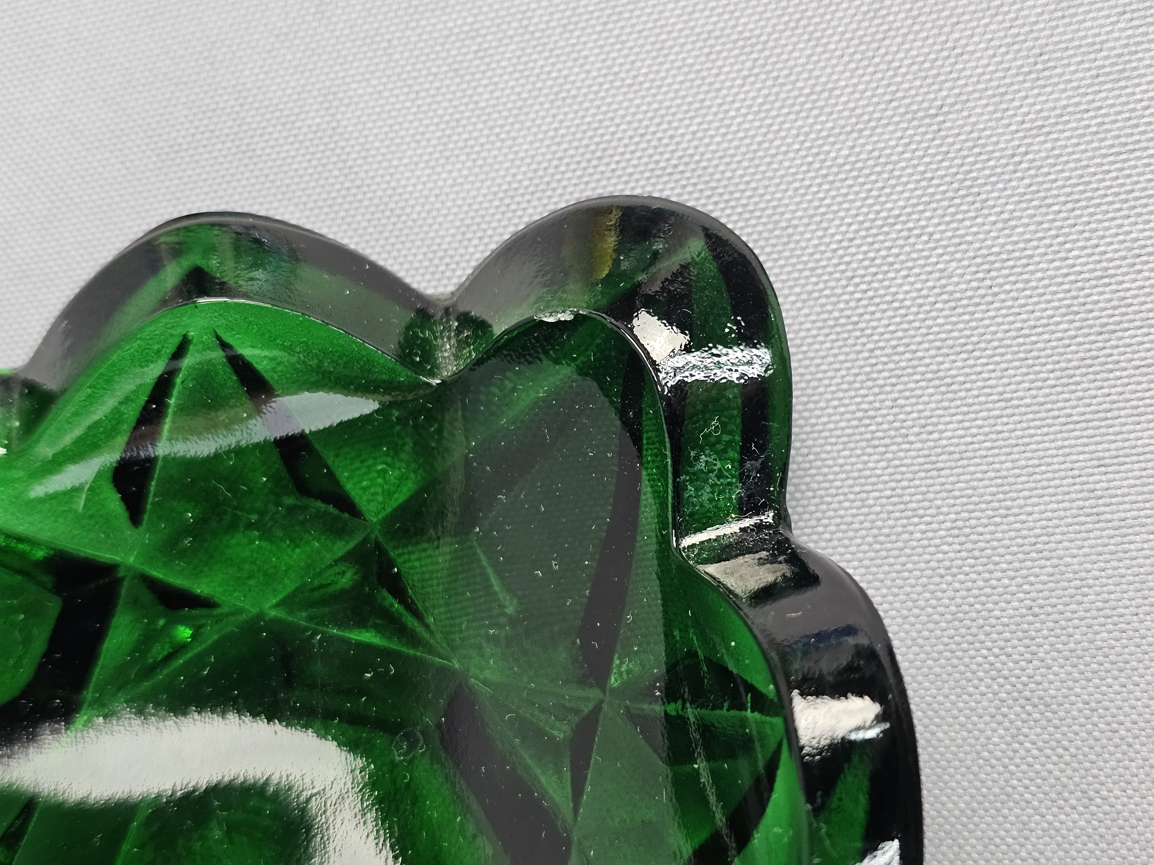 The item is in good overall condition with wear consistent with age and use. Several small nicks and flea bites are visible along the scalloped rim and the edges of the interior dividers. The interior base of the compartments shows light surface scratching. No major cracks or large chips are noted.