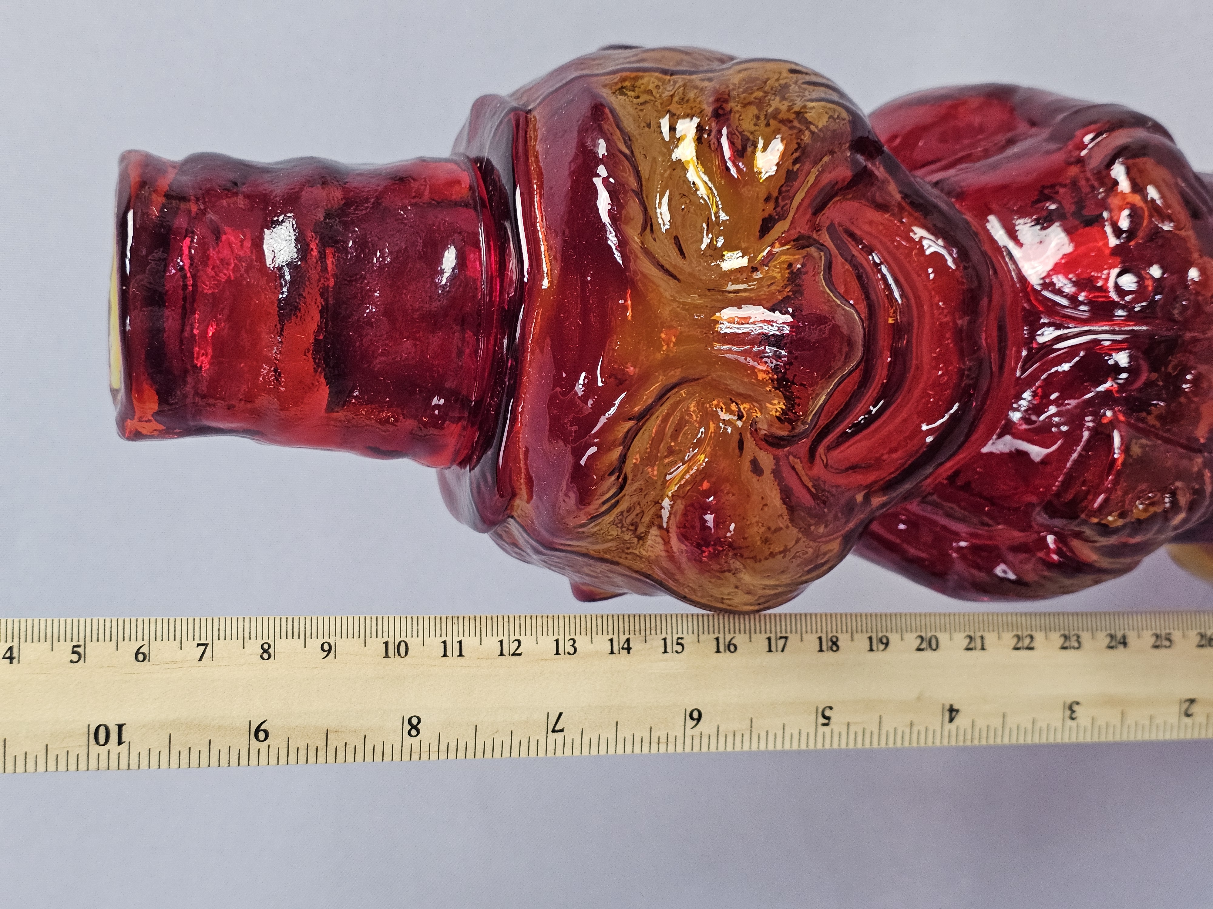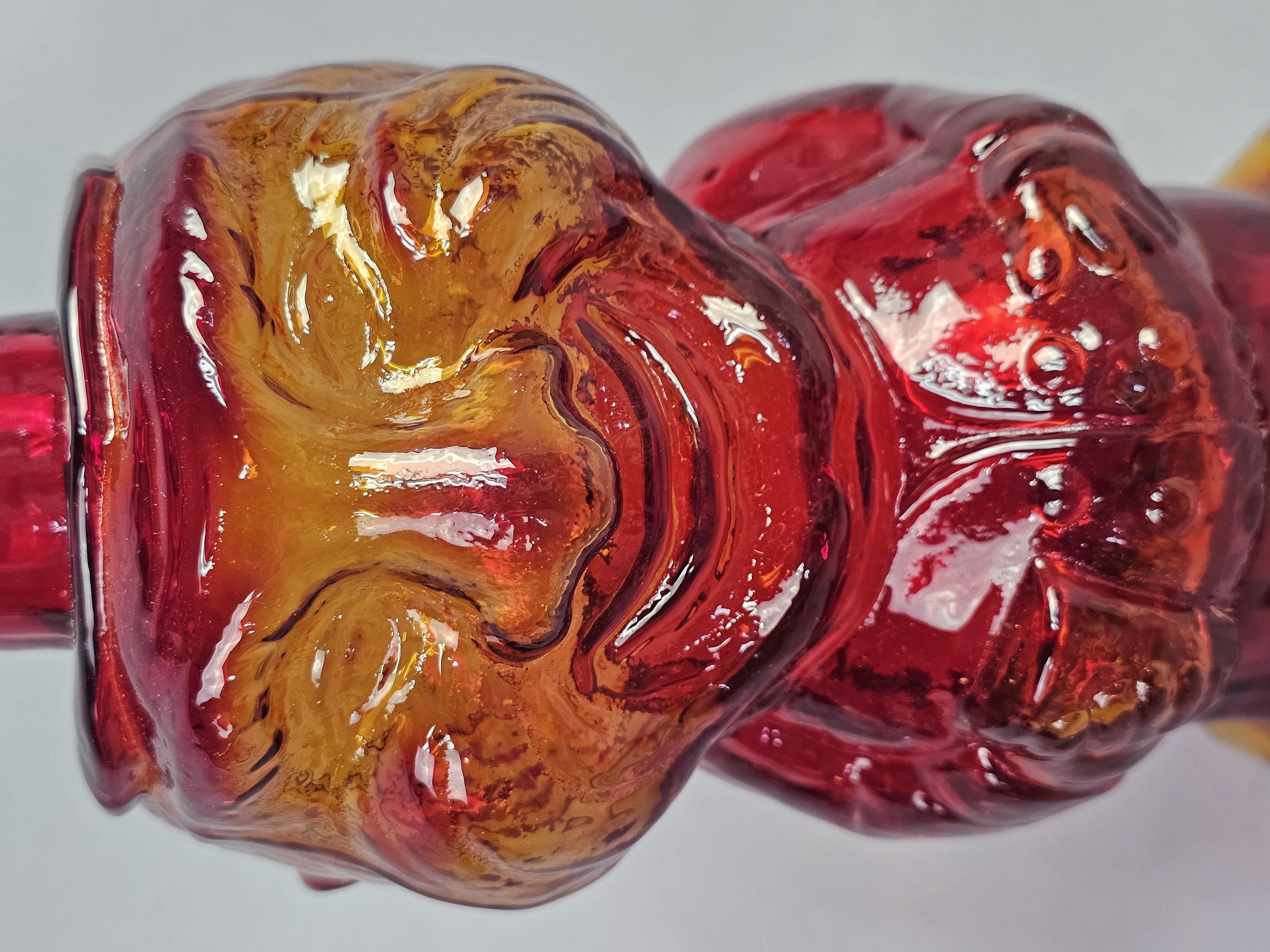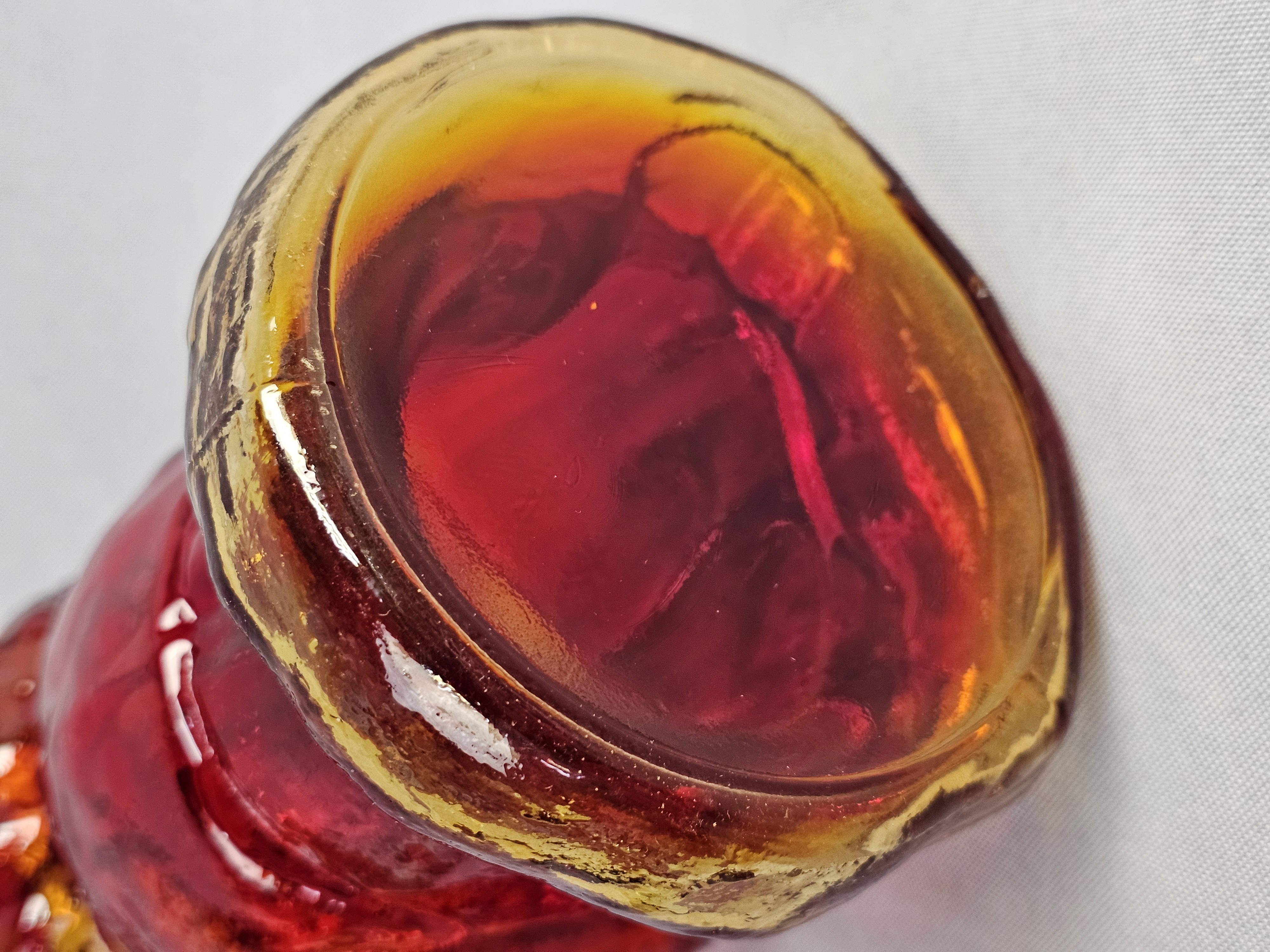 The object is crafted from Amberina glass, featuring a deep ruby red color that transitions to amber and yellow hues at the base and along the molded highlights. No manufacturer marks, stamps, or labels are present. Height: 10 inches The item is in good condition. There are no observed chips, cracks, or evidence of repair. Minor shelf wear is present on the underside of the base.