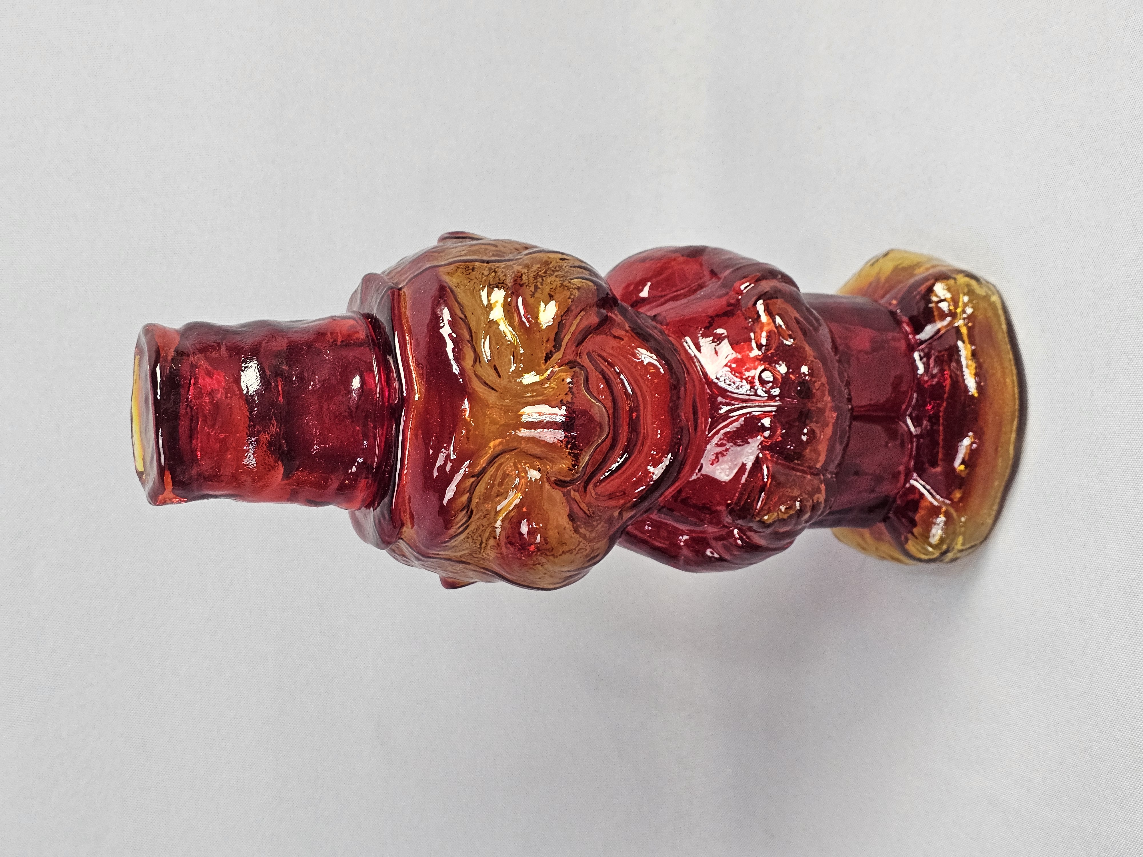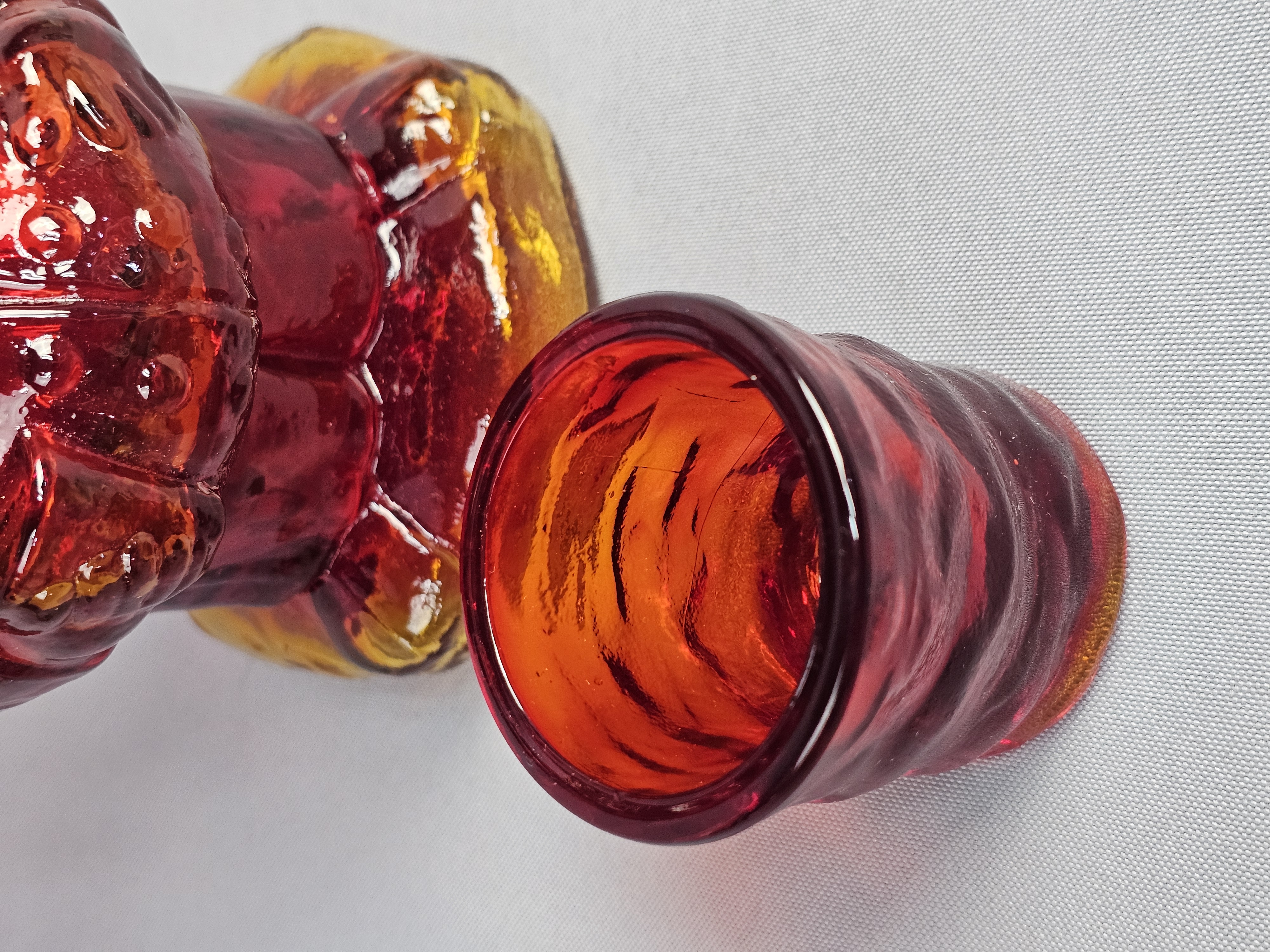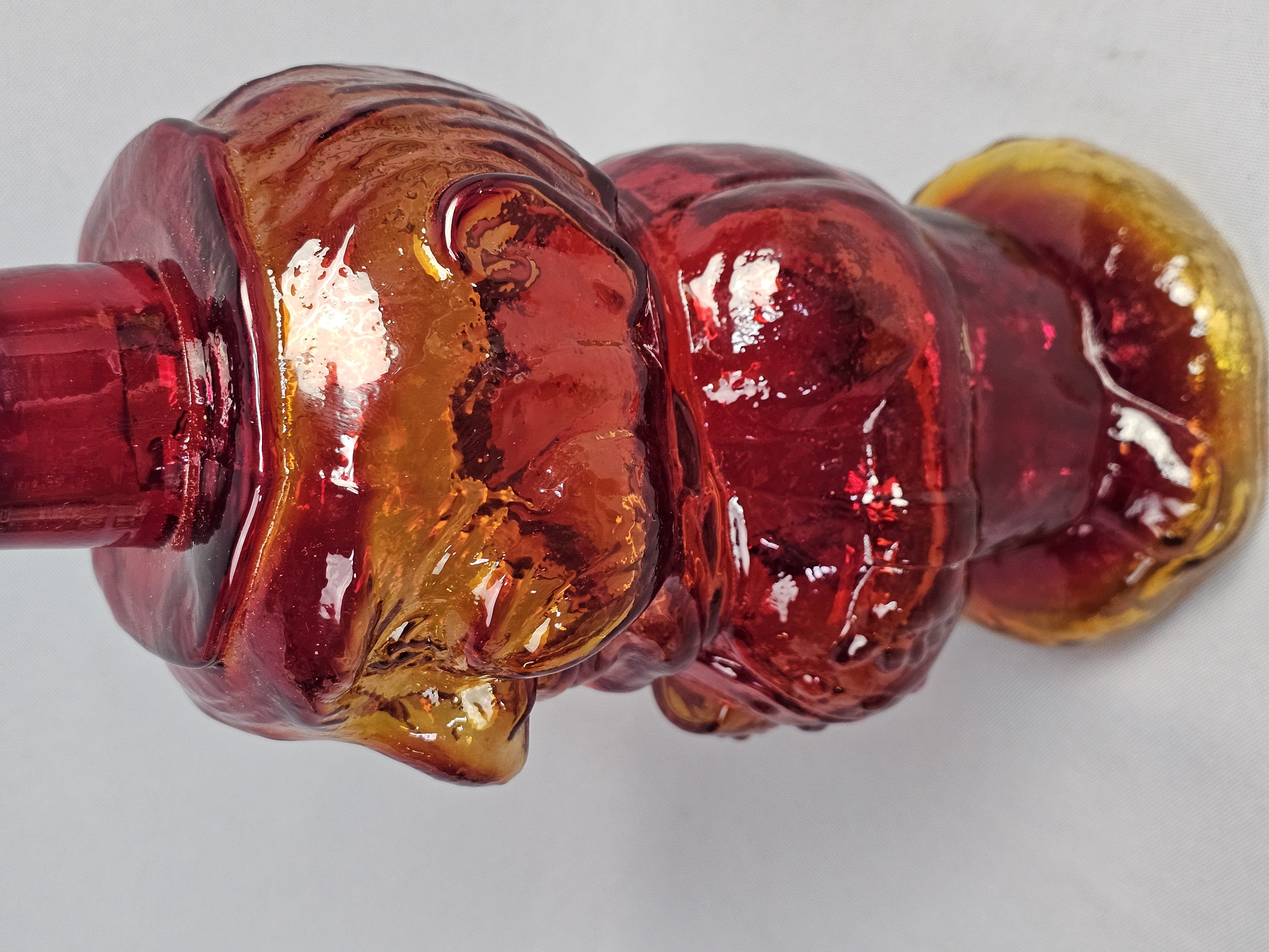 The object is crafted from Amberina glass, featuring a deep ruby red color that transitions to amber and yellow hues at the base and along the molded highlights. No manufacturer marks, stamps, or labels are present. Height: 10 inches The item is in good condition. There are no observed chips, cracks, or evidence of repair. Minor shelf wear is present on the underside of the base.