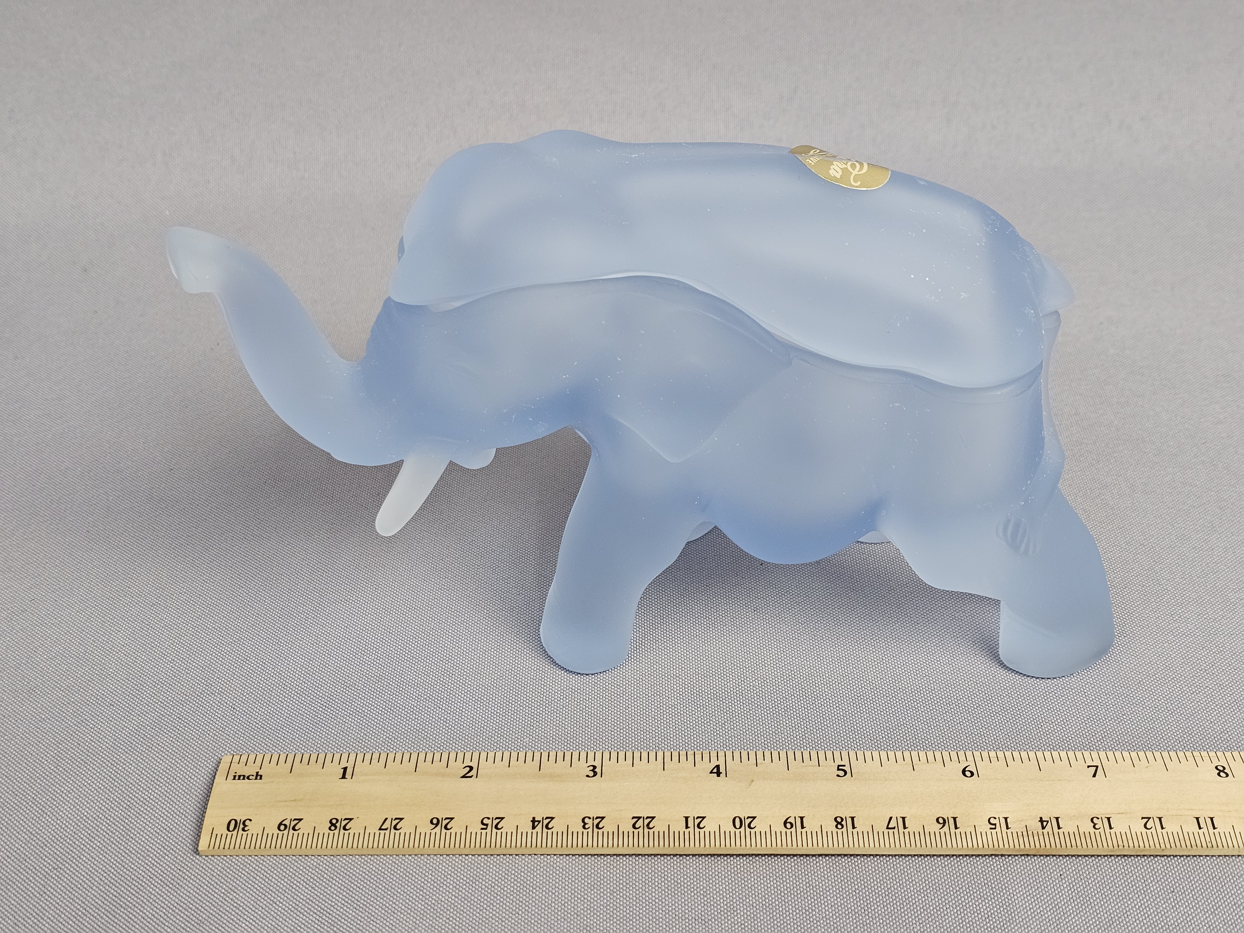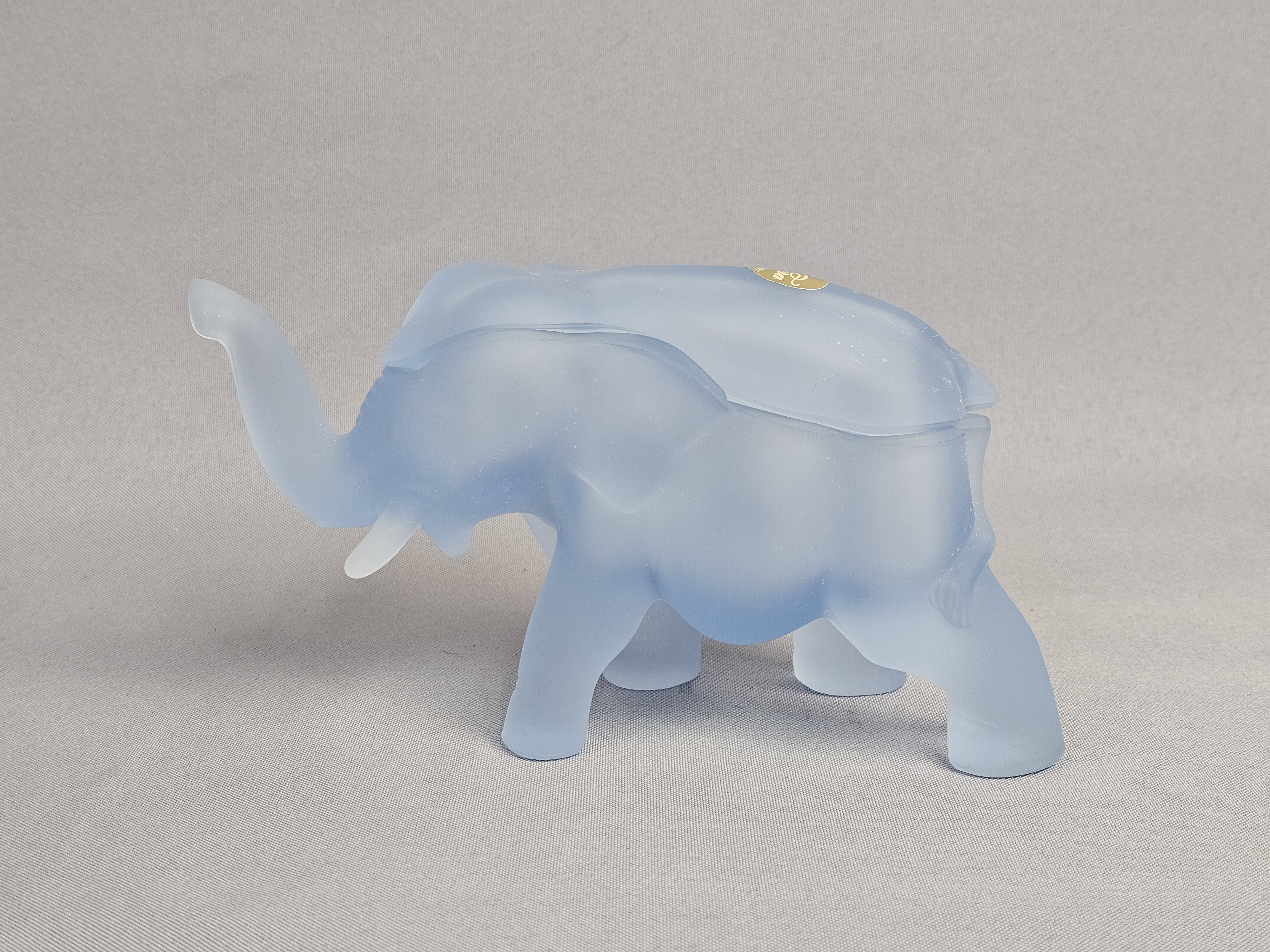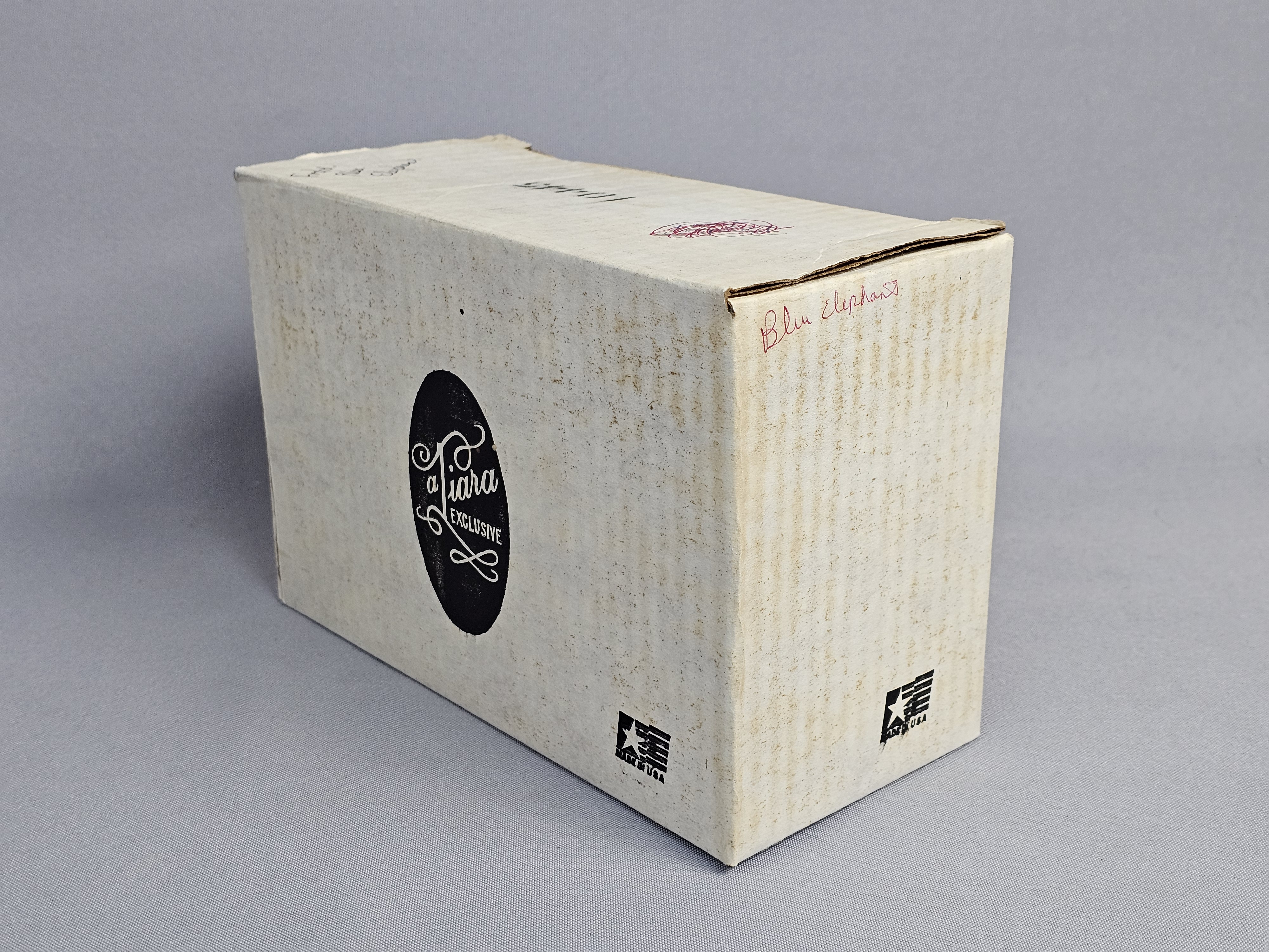 Tiara Exclusives elephant-shaped lidded trinket box or candy dish. The piece is constructed from frosted light blue satin glass and features a two-part design where the upper portion of the elephant’s back serves as a removable lid. The item includes its original cardboard storage box featuring the Tiara EXCLUSIVE logo. Length: 7 inches The glass figurine is in good condition with no visible chips, cracks, or repairs. Few surface scratches present. The original cardboard box shows significant signs of age, including surface staining, shelf wear, and handwritten notations.