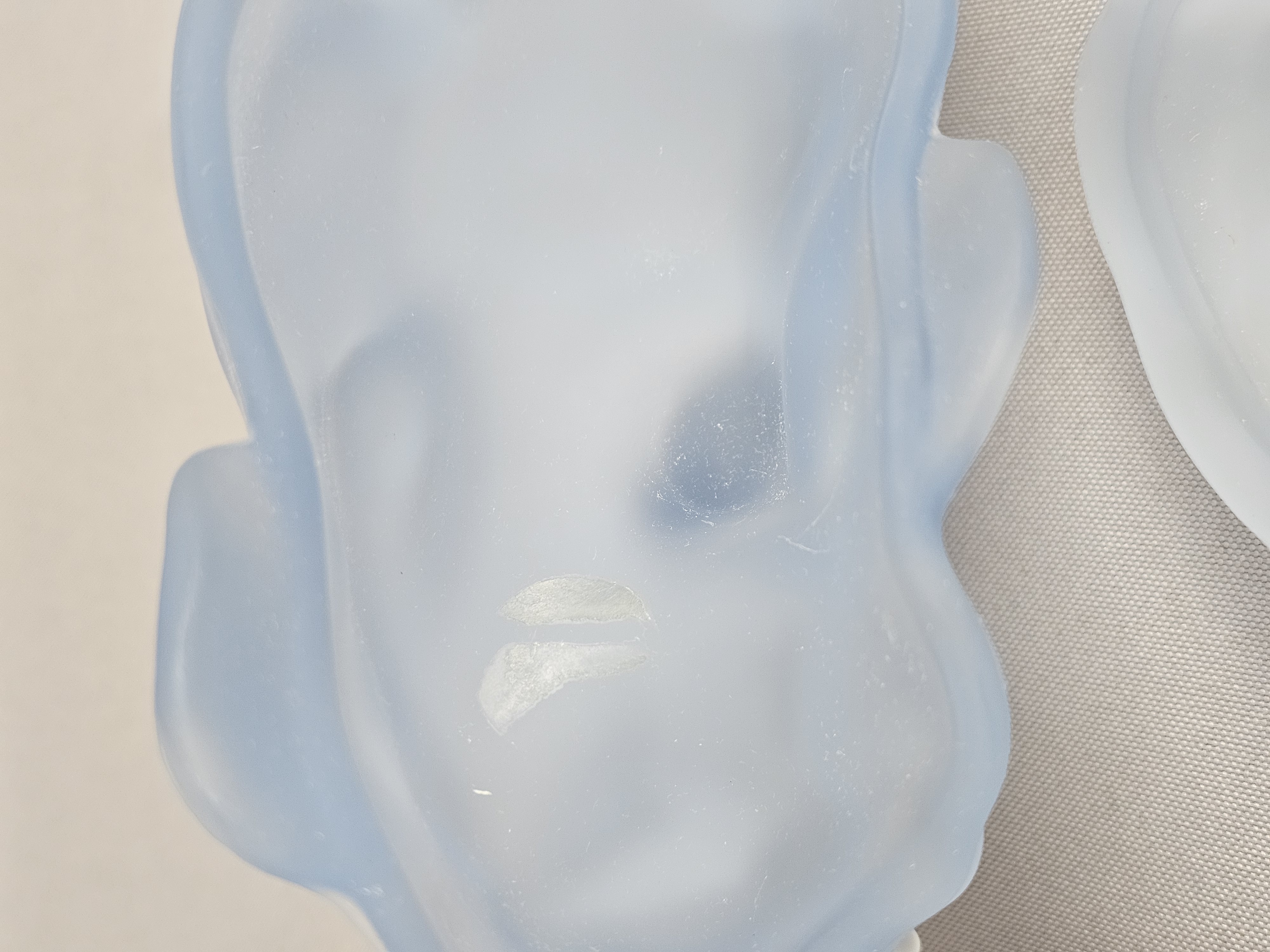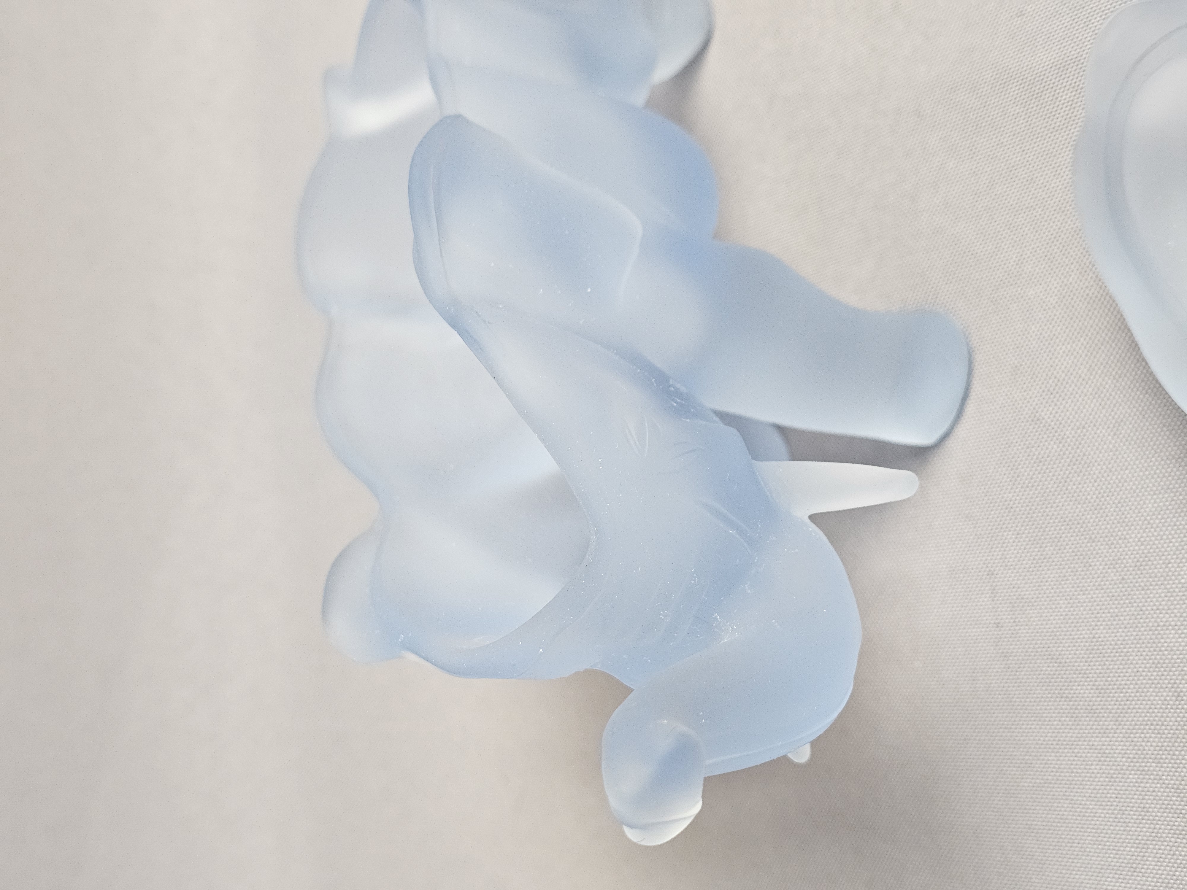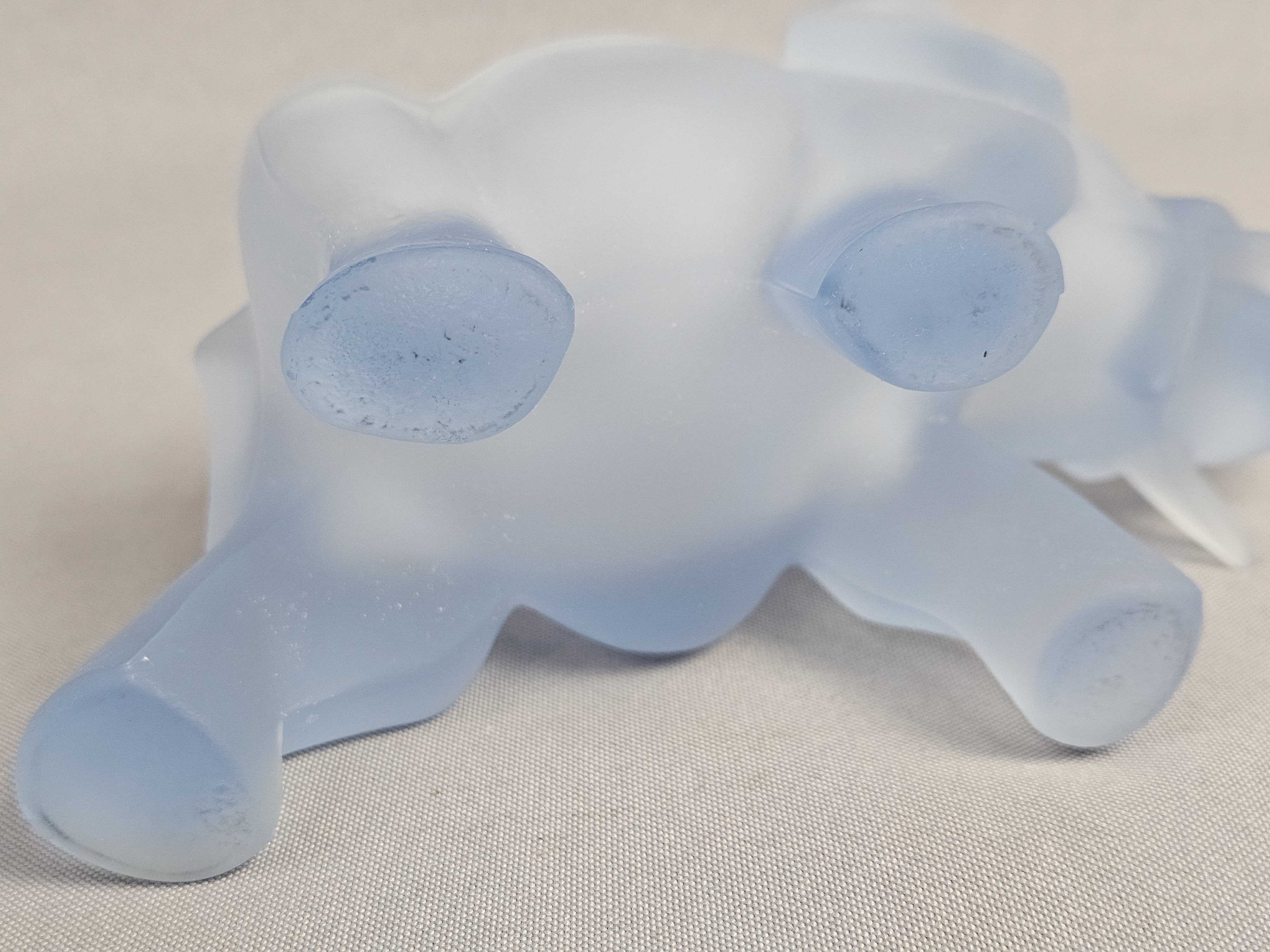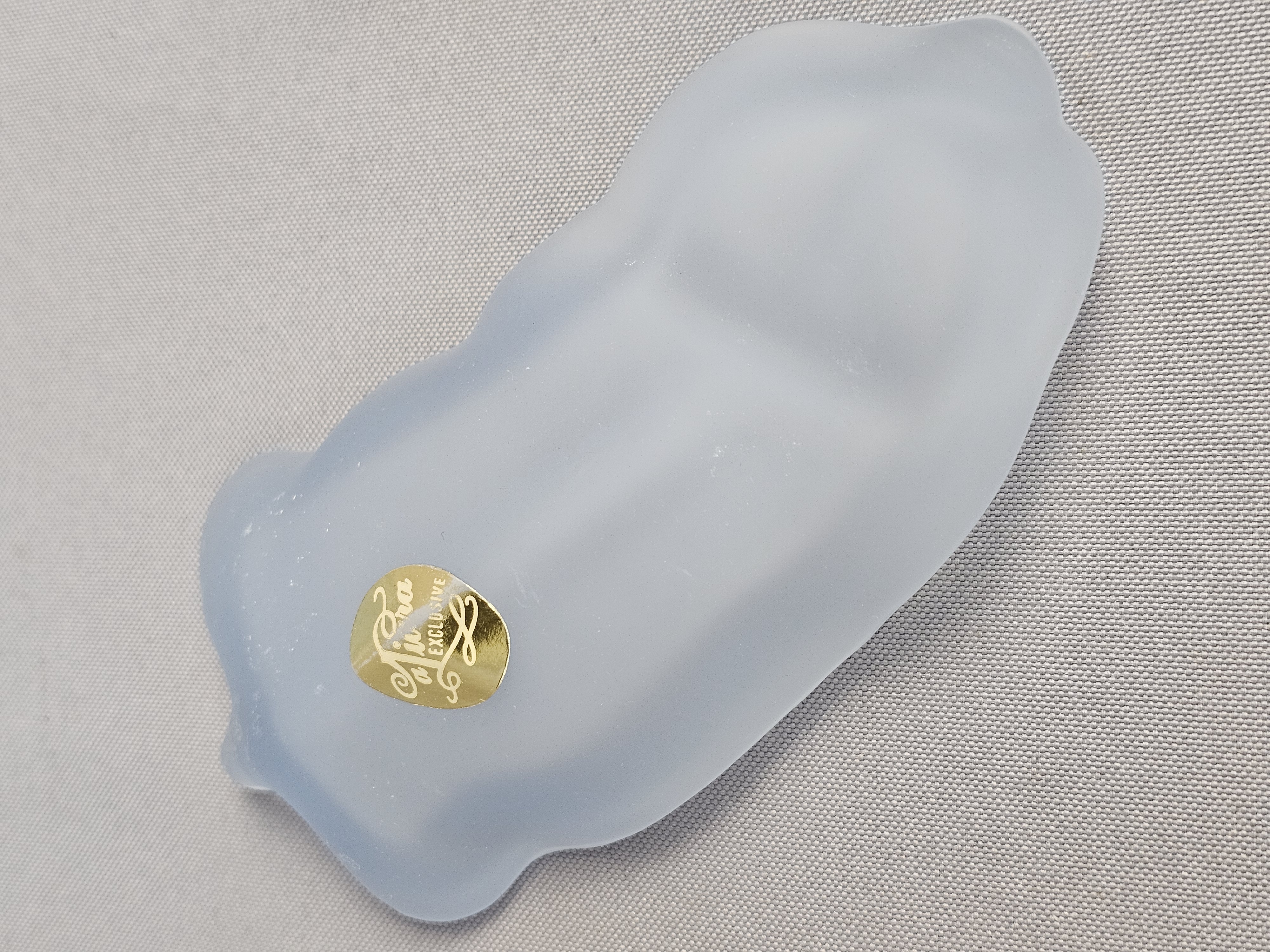 Tiara Exclusives elephant-shaped lidded trinket box or candy dish. The piece is constructed from frosted light blue satin glass and features a two-part design where the upper portion of the elephant’s back serves as a removable lid. The item includes its original cardboard storage box featuring the Tiara EXCLUSIVE logo. Length: 7 inches The glass figurine is in good condition with no visible chips, cracks, or repairs. Few surface scratches present. The original cardboard box shows significant signs of age, including surface staining, shelf wear, and handwritten notations.