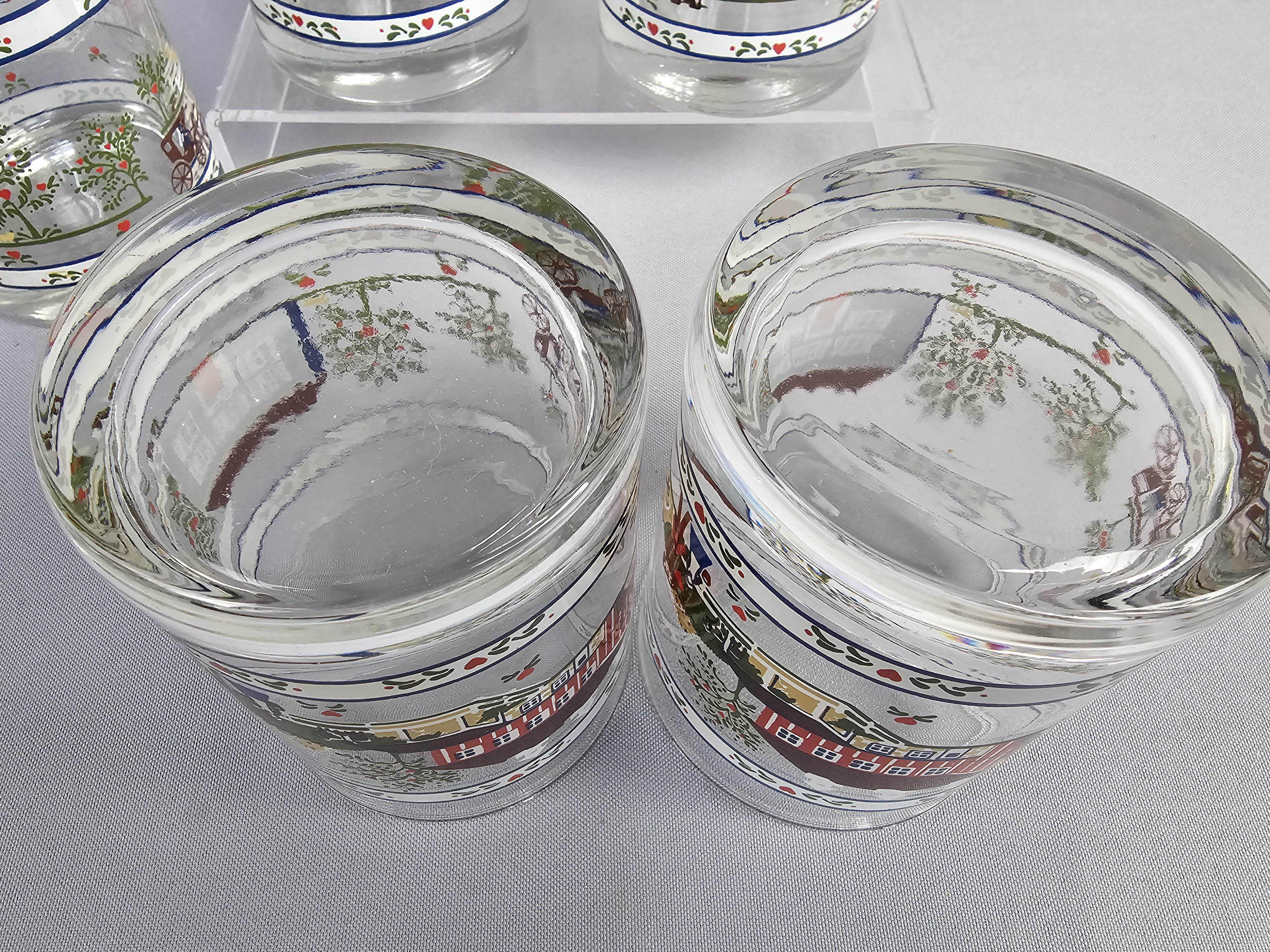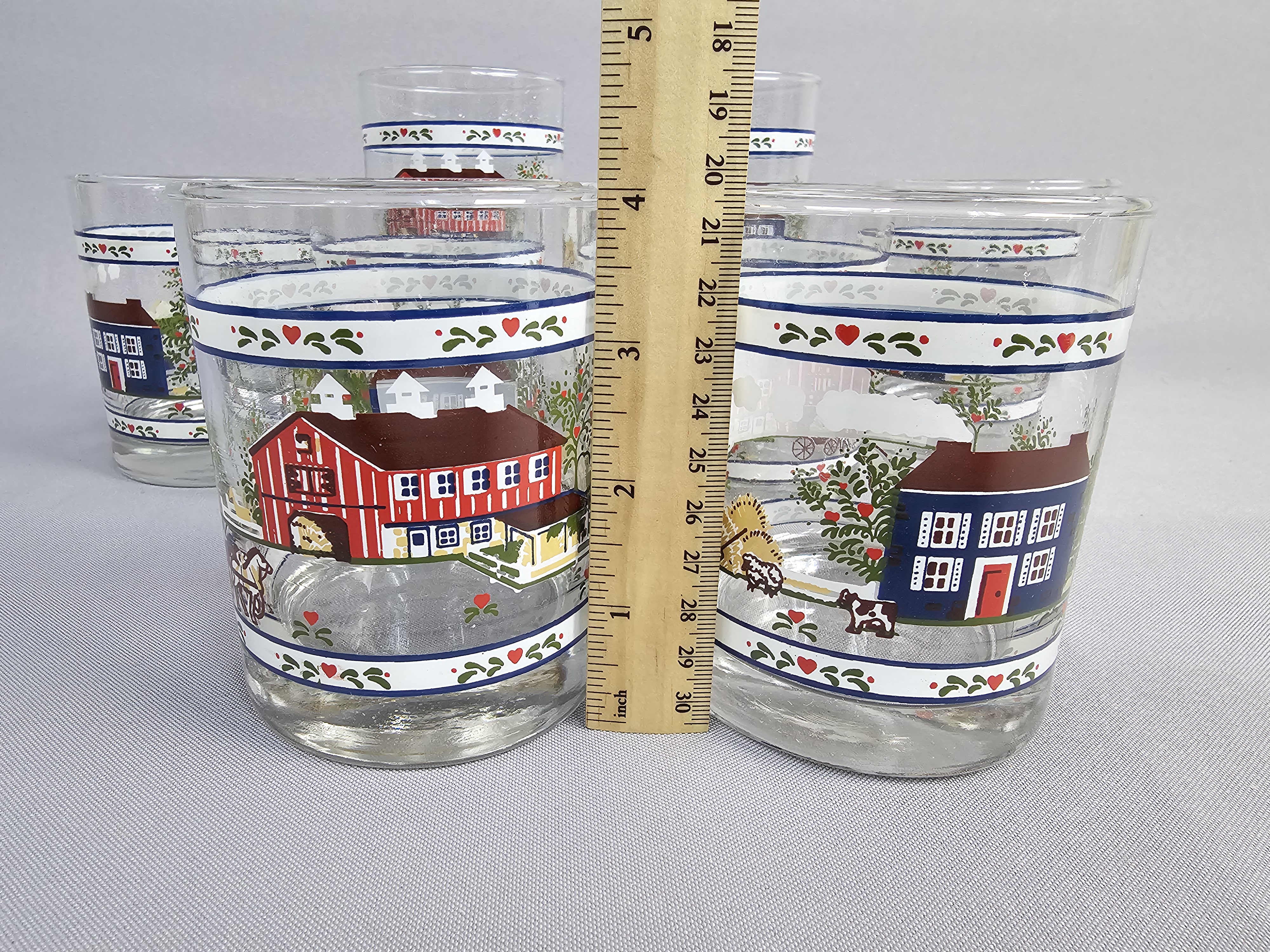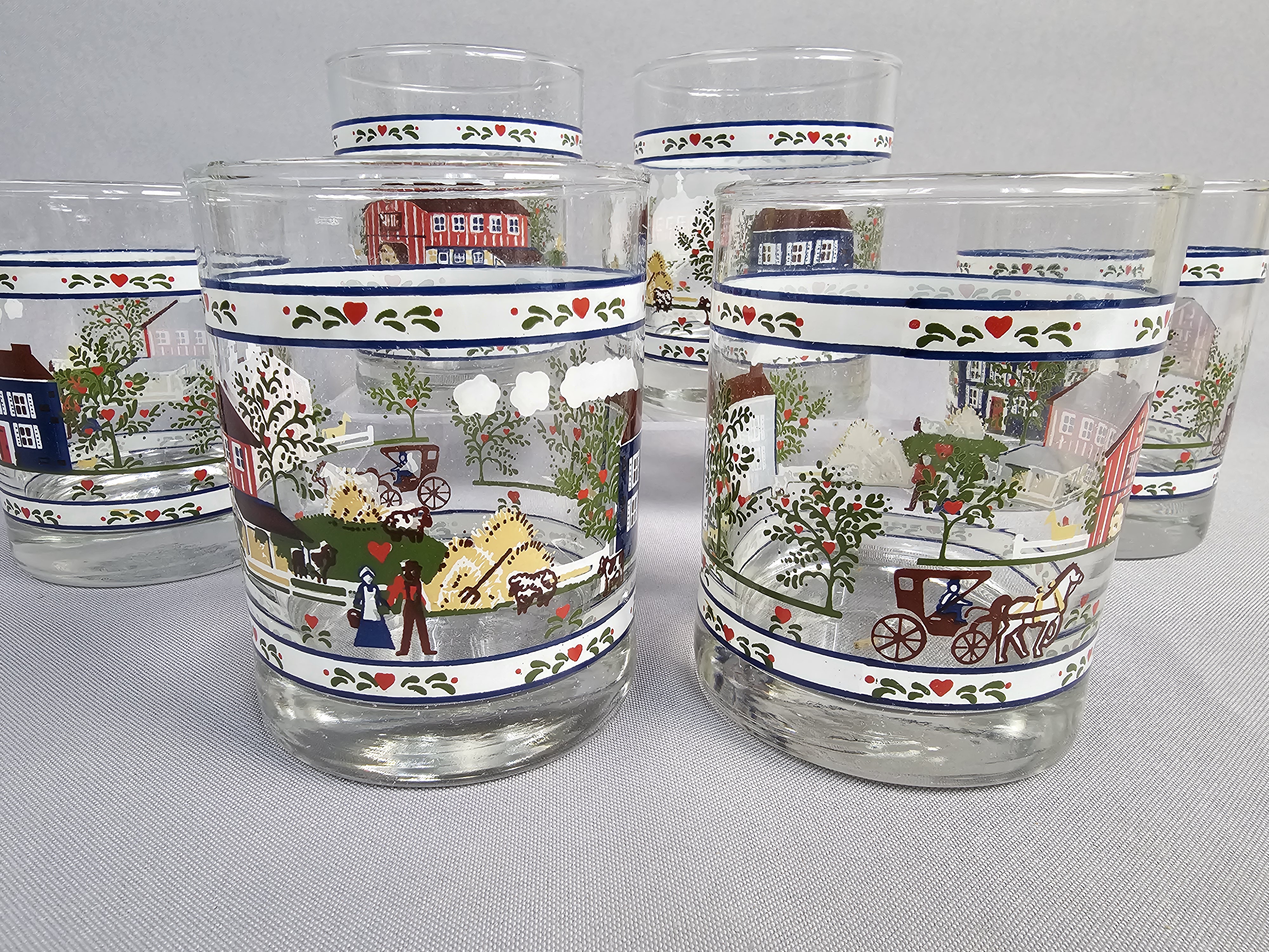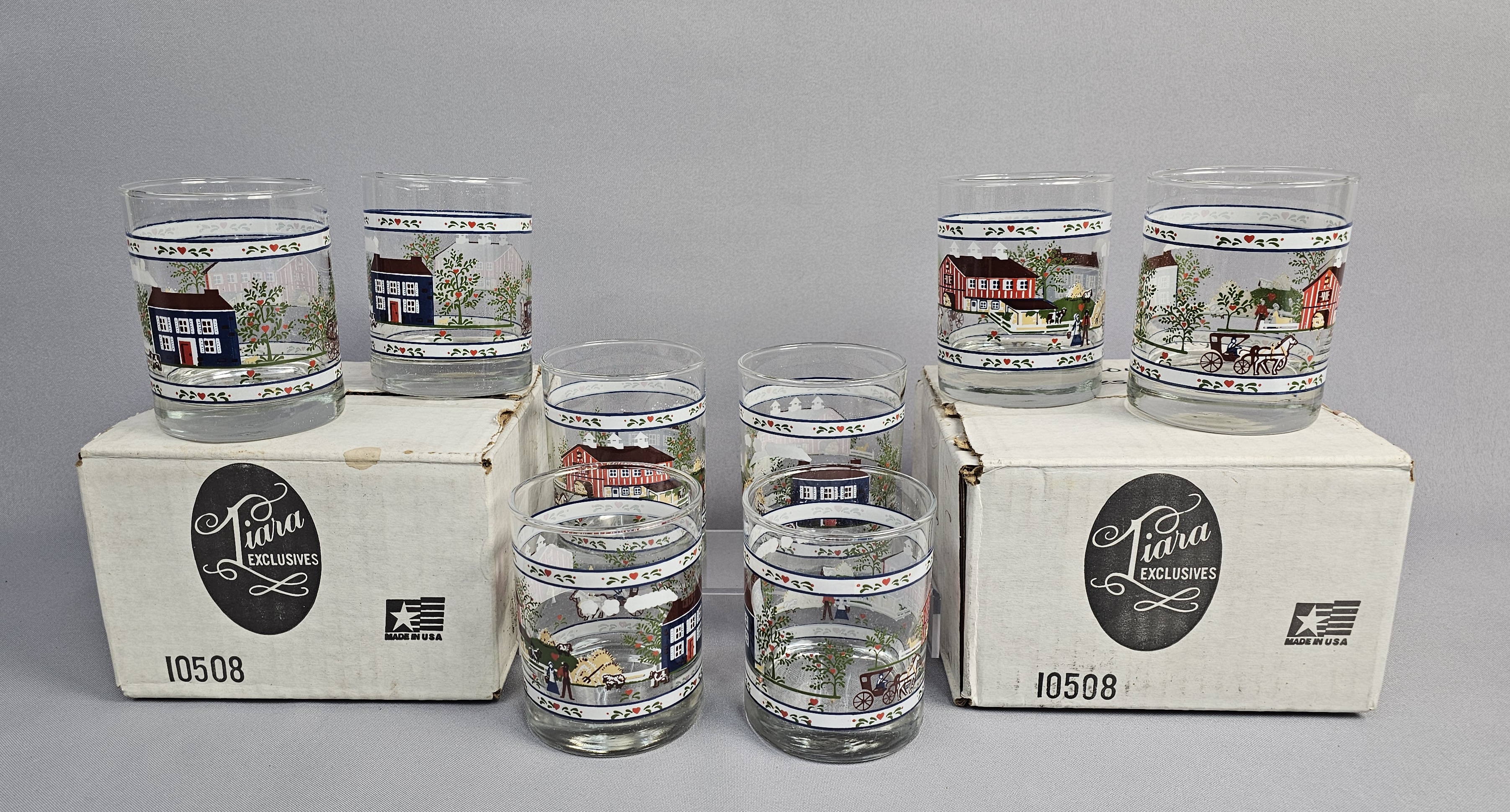 A set of eight clear glass tumblers featuring a wrap-around Americana folk art pattern produced by Tiara Exclusives. The multi-color printed design depicts a rural landscape with a red barn and silos, a blue house, horse-drawn carriages, apple trees, and figures in traditional dress. While the glassware itself bears no maker marks on the base, the set is accompanied by two original cardboard boxes. The boxes feature the Tiara Exclusives script logo, a Made in USA star and stripe icon, and the model number 10508. Height: 4 inches The glassware is in good condition with the printed designs remaining vibrant and showing no significant signs of loss or fading. The two original cardboard boxes show age-related wear, including surface scuffing, minor staining, and remnants of adhesive tape.