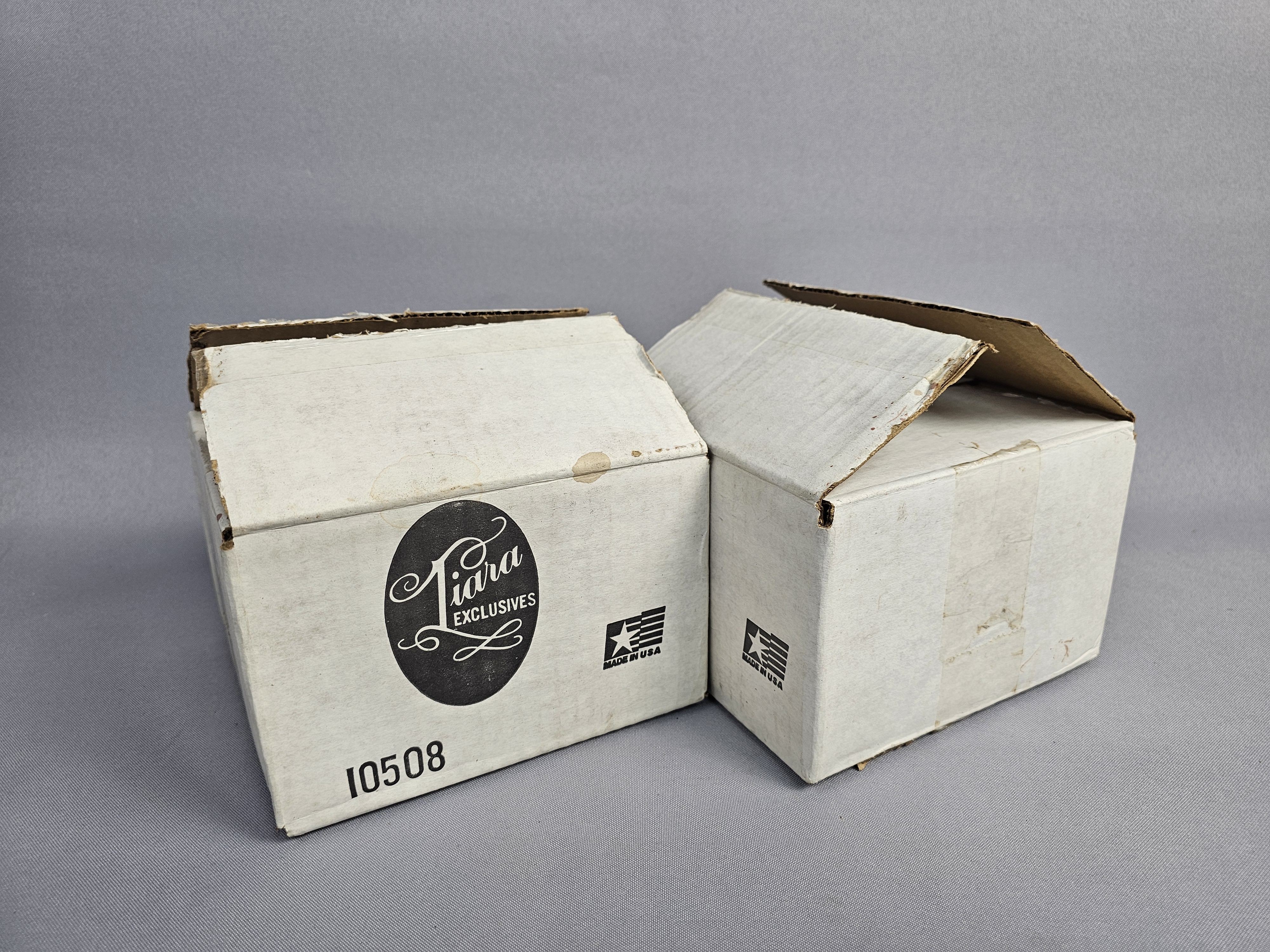 The glassware is in good condition with the printed designs remaining vibrant and showing no significant signs of loss or fading. The two original cardboard boxes show age-related wear, including surface scuffing, minor staining, and remnants of adhesive tape.
