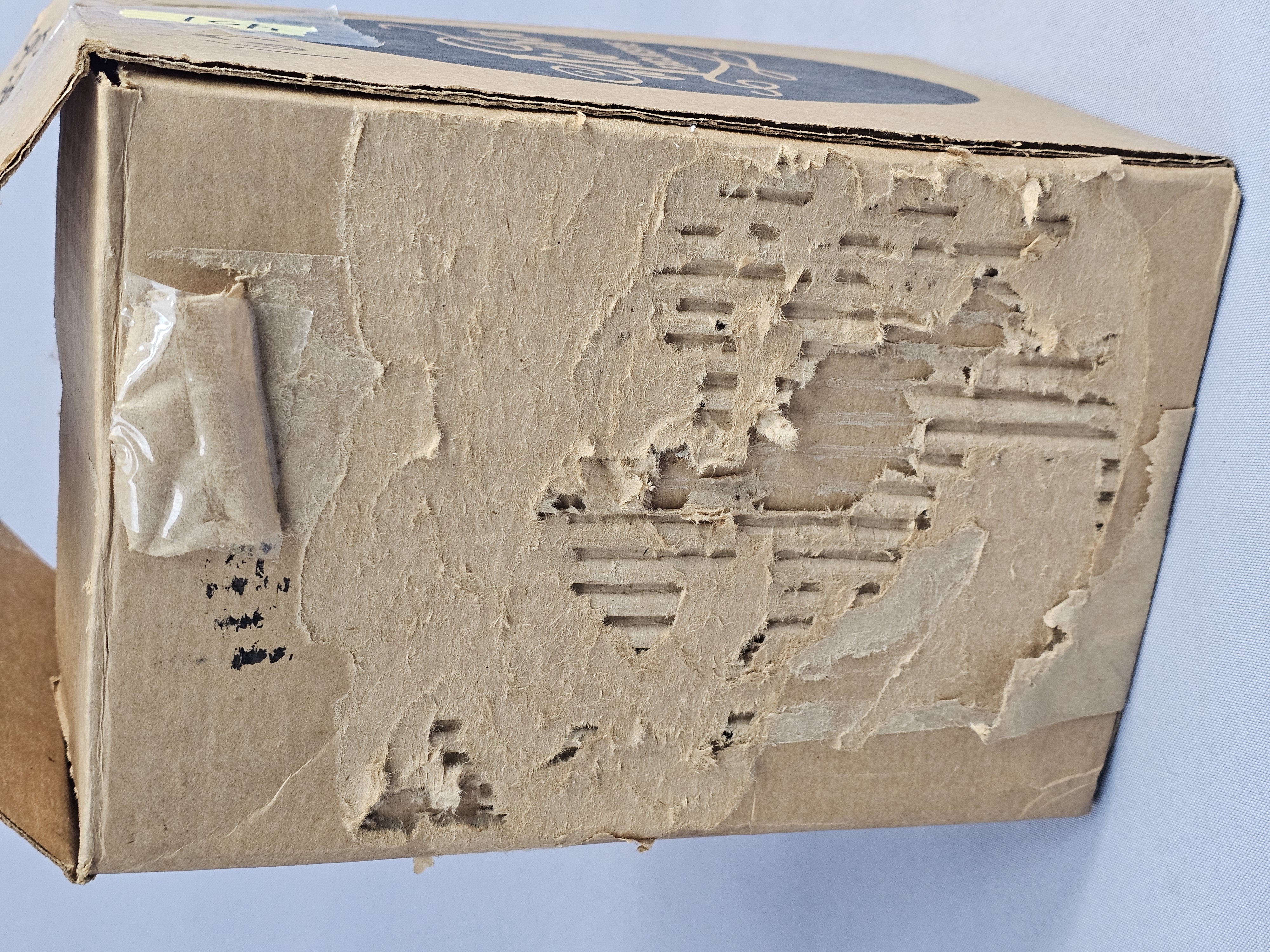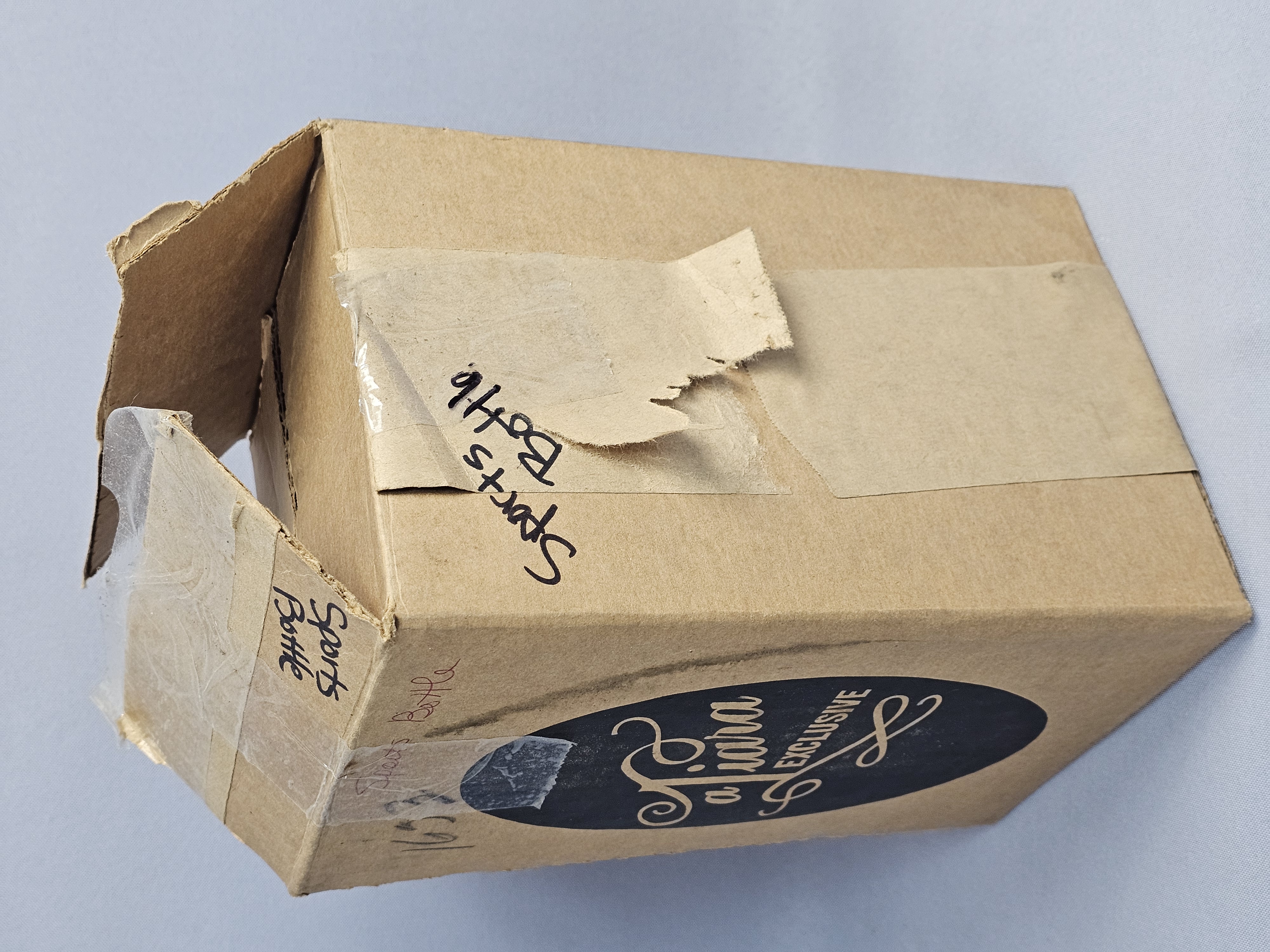 The glass bottle is in good condition with no visible chips, cracks, or clouding. The original cardboard box shows significant wear, including structural tears, adhesive tape reinforcement, and handwritten ink notations.