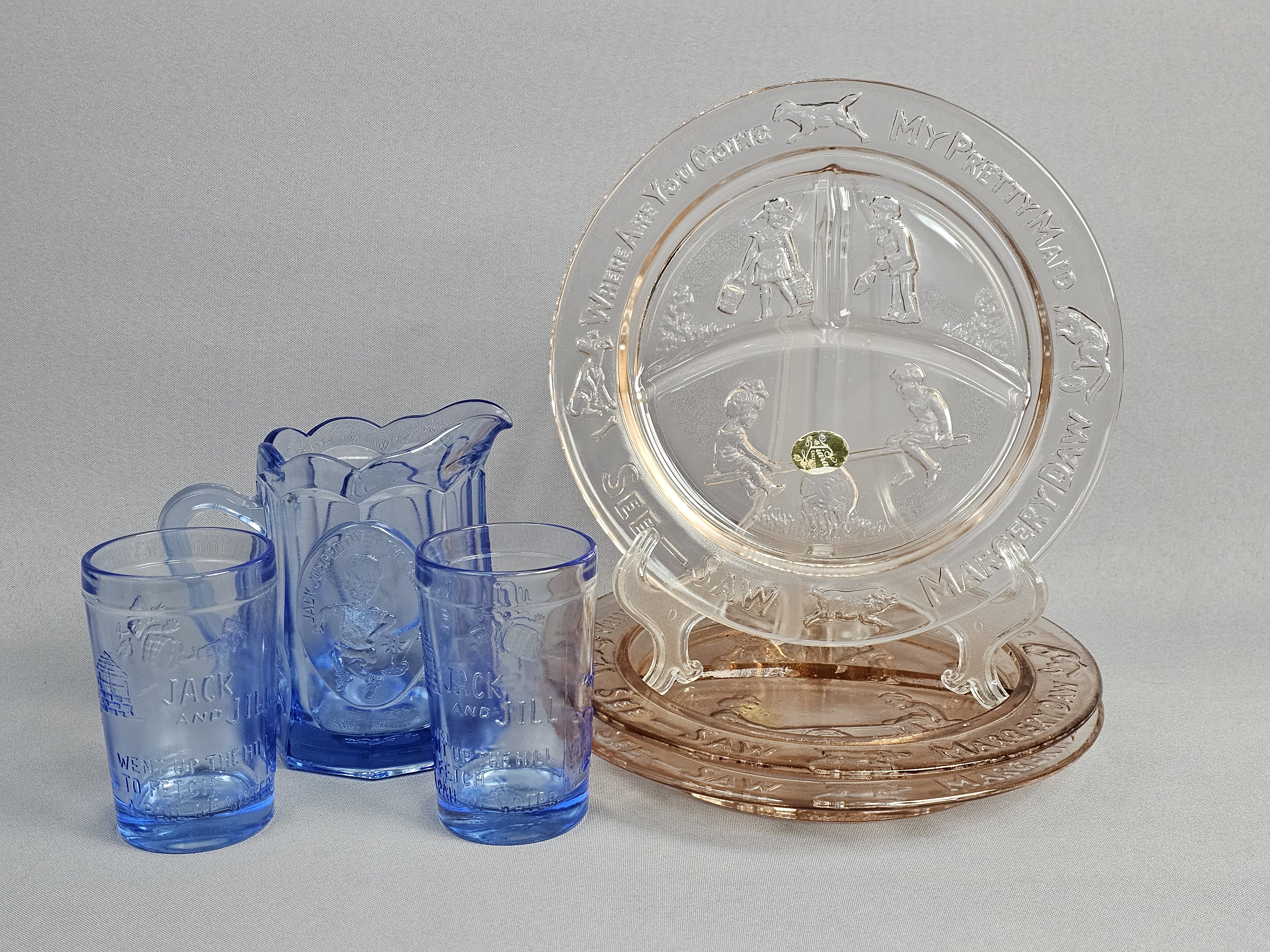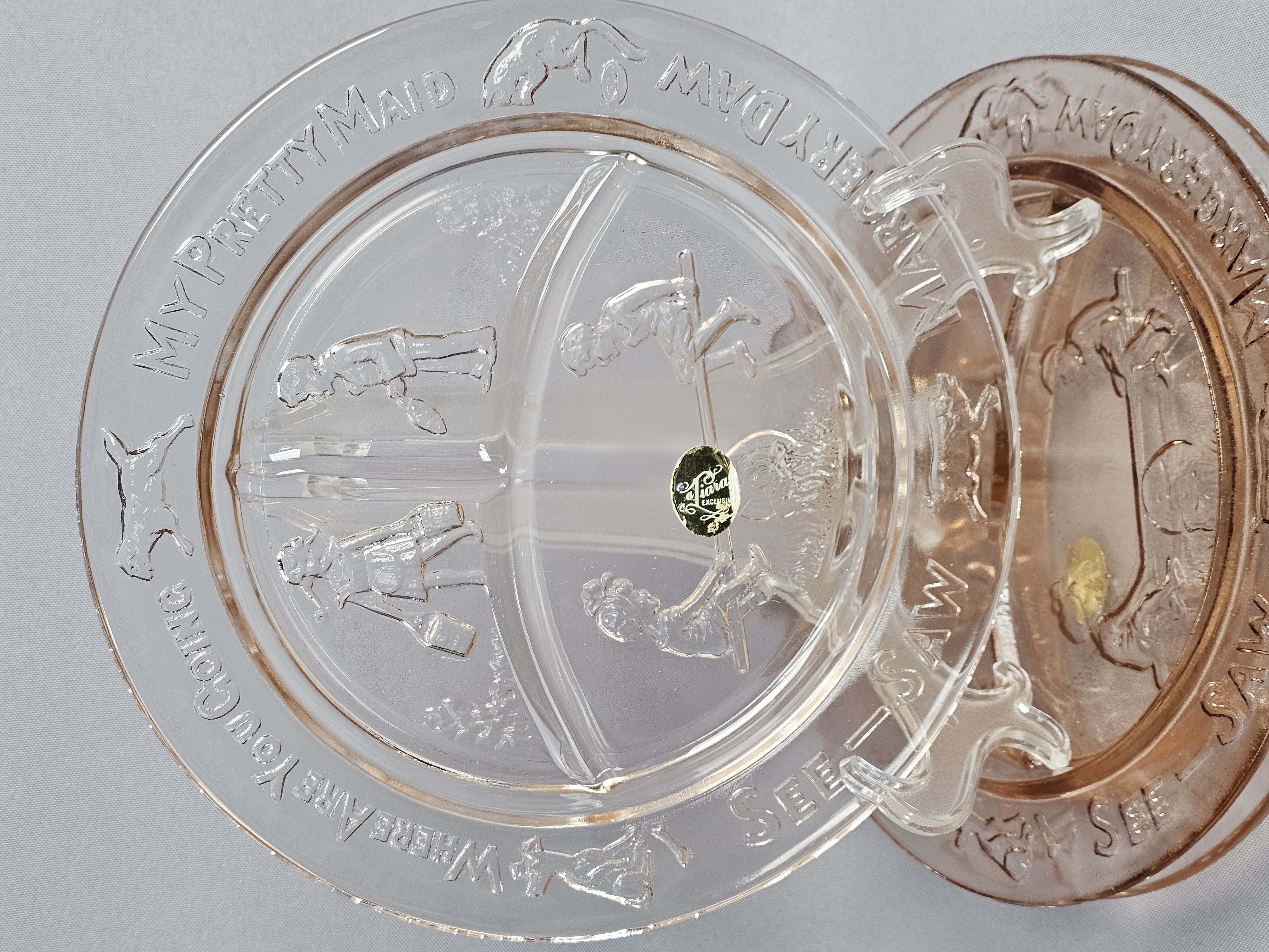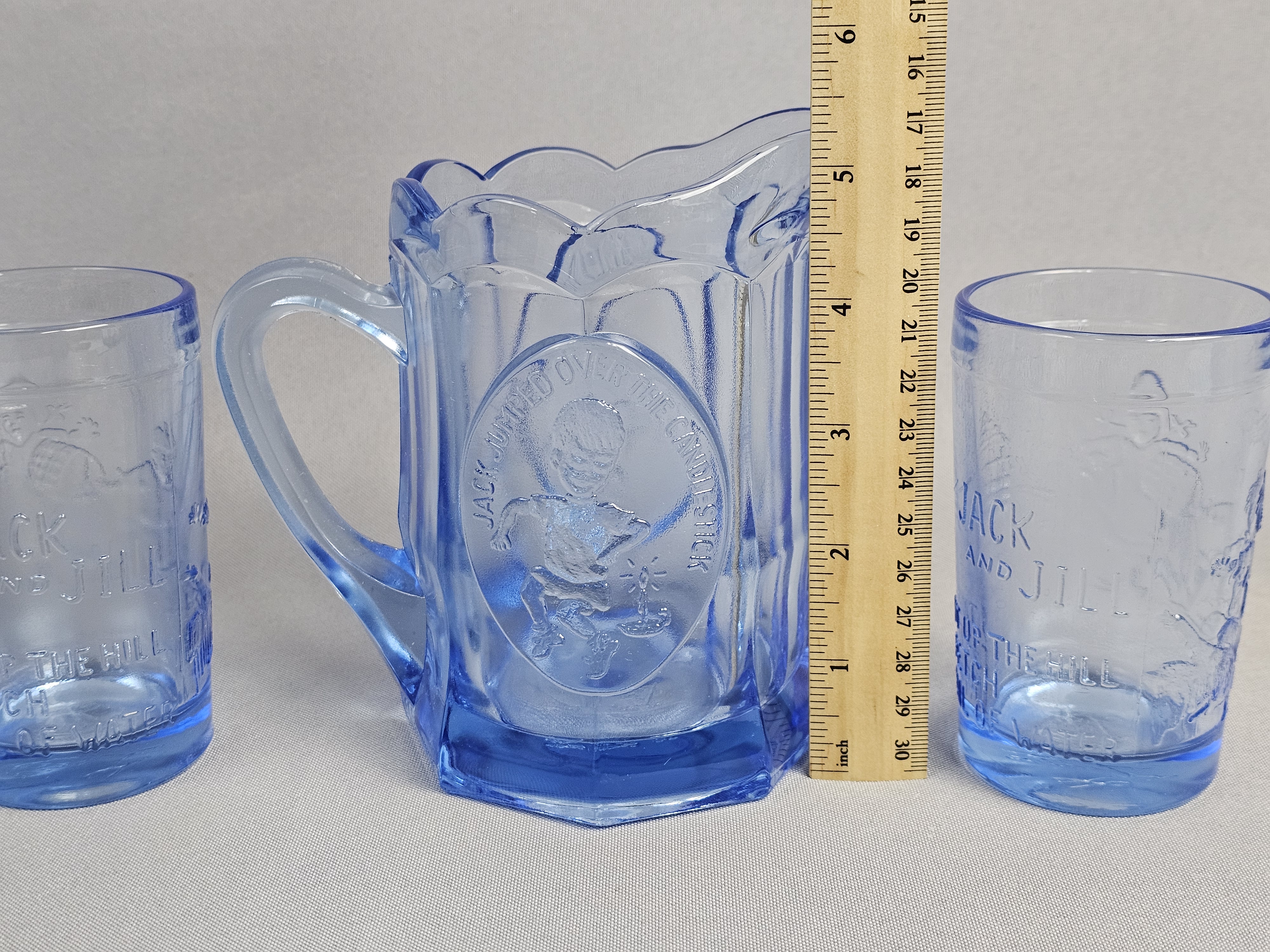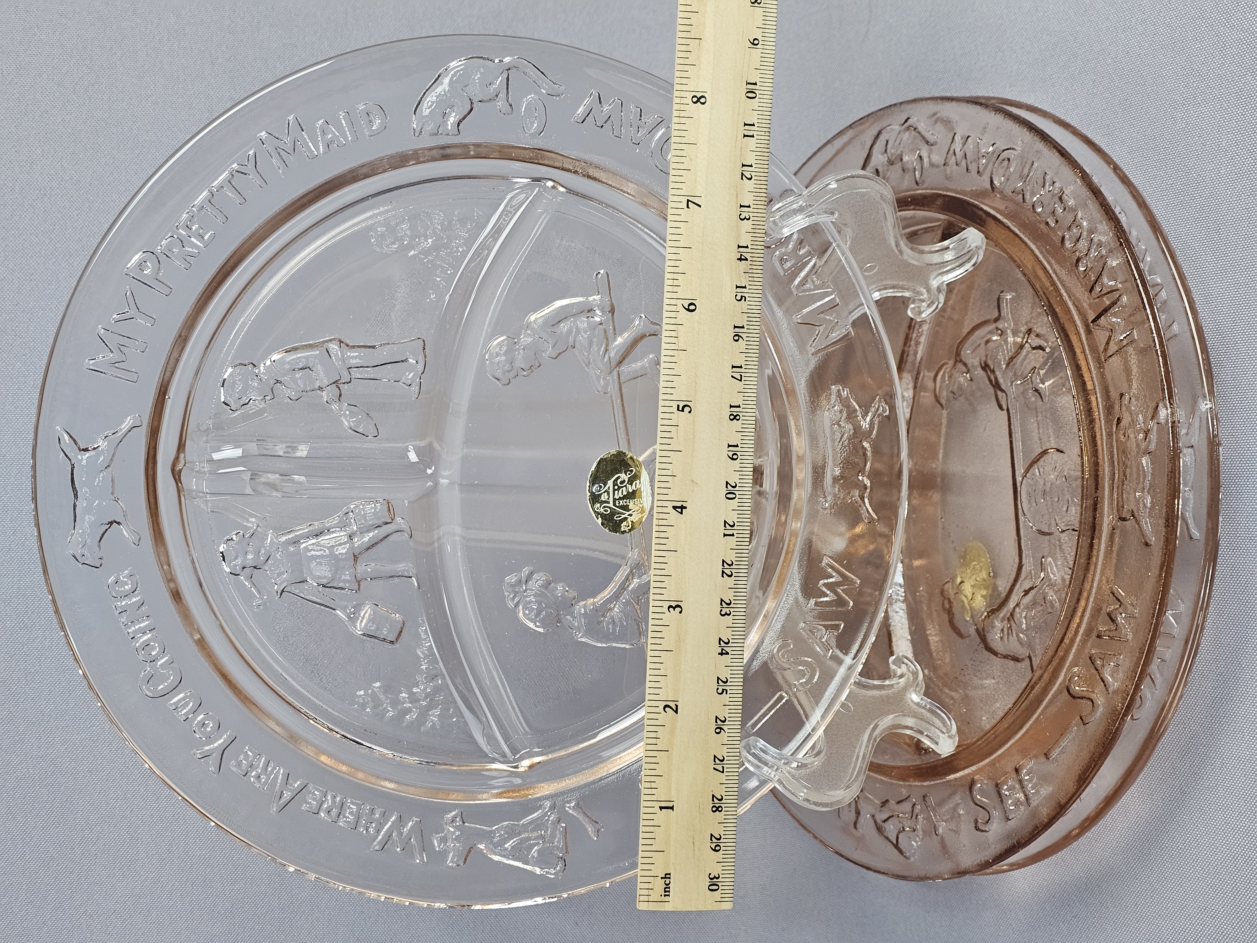This collection of pressed glass children’s dinnerware is produced in the Nursery Rhyme pattern by Tiara Exclusives. The assortment includes translucent pink and blue pieces featuring embossed characters and text from classic nursery rhymes. The lot includes an original branded cardboard box. Pink Plates: 8 inches in diameter Blue Pitcher: 5 inches in height Blue Tumblers: 4 inches in height The blue pitcher and tumblers are in good condition with no visible chips or cracks. Two pink plates appear in good condition, while one pink plate has a chip located along an interior ridge. The original cardboard box shows shelf wear and notations.