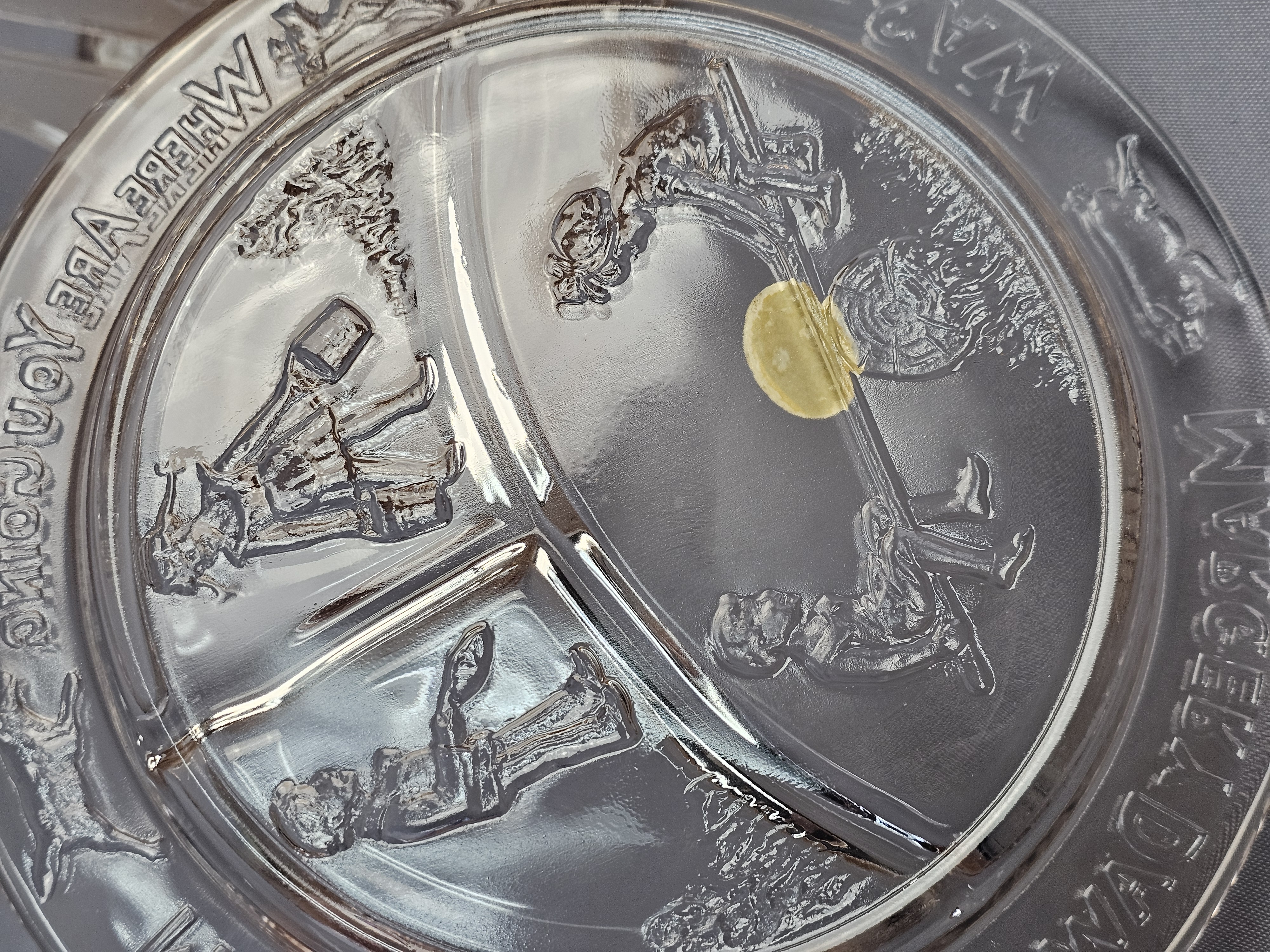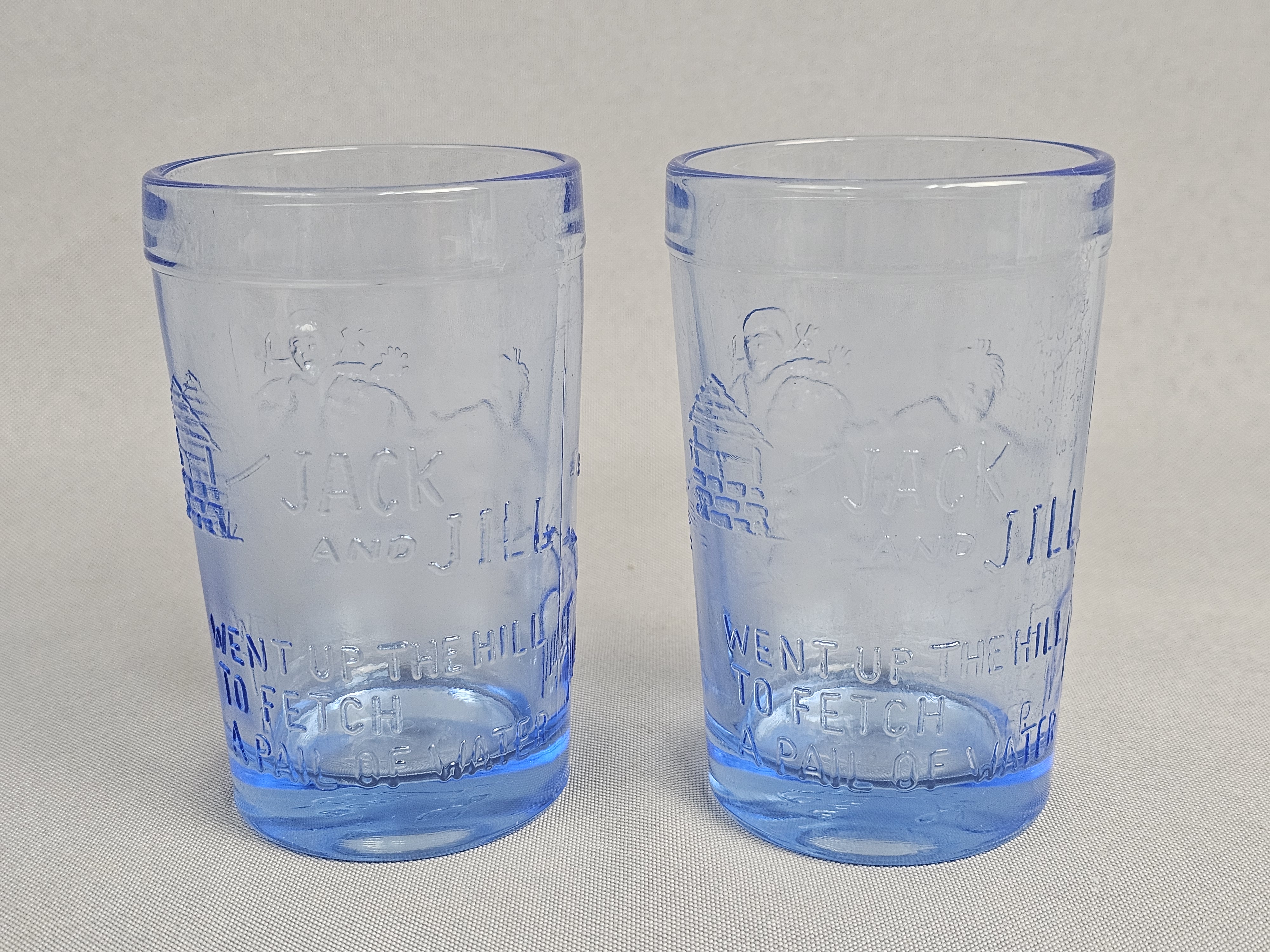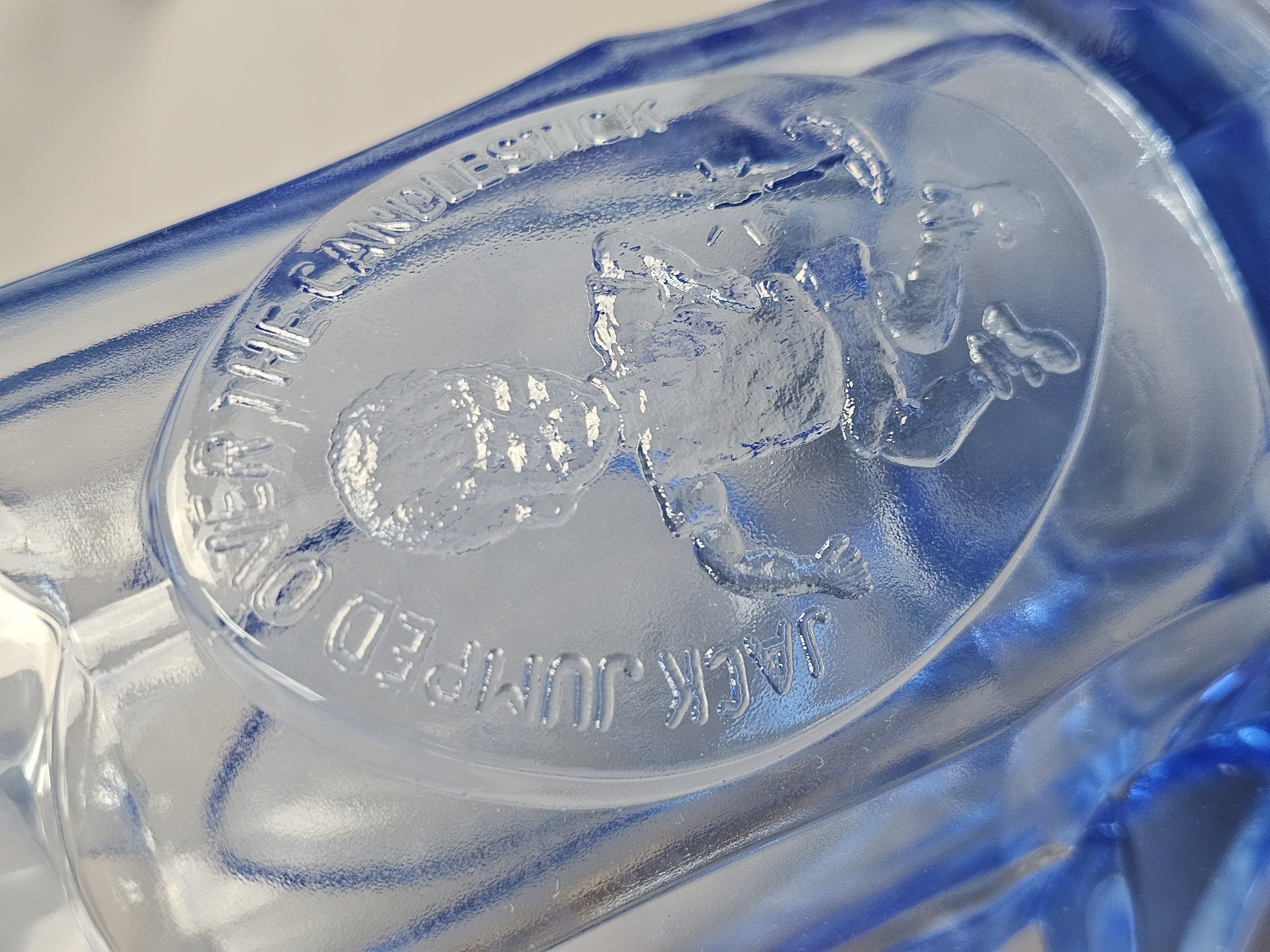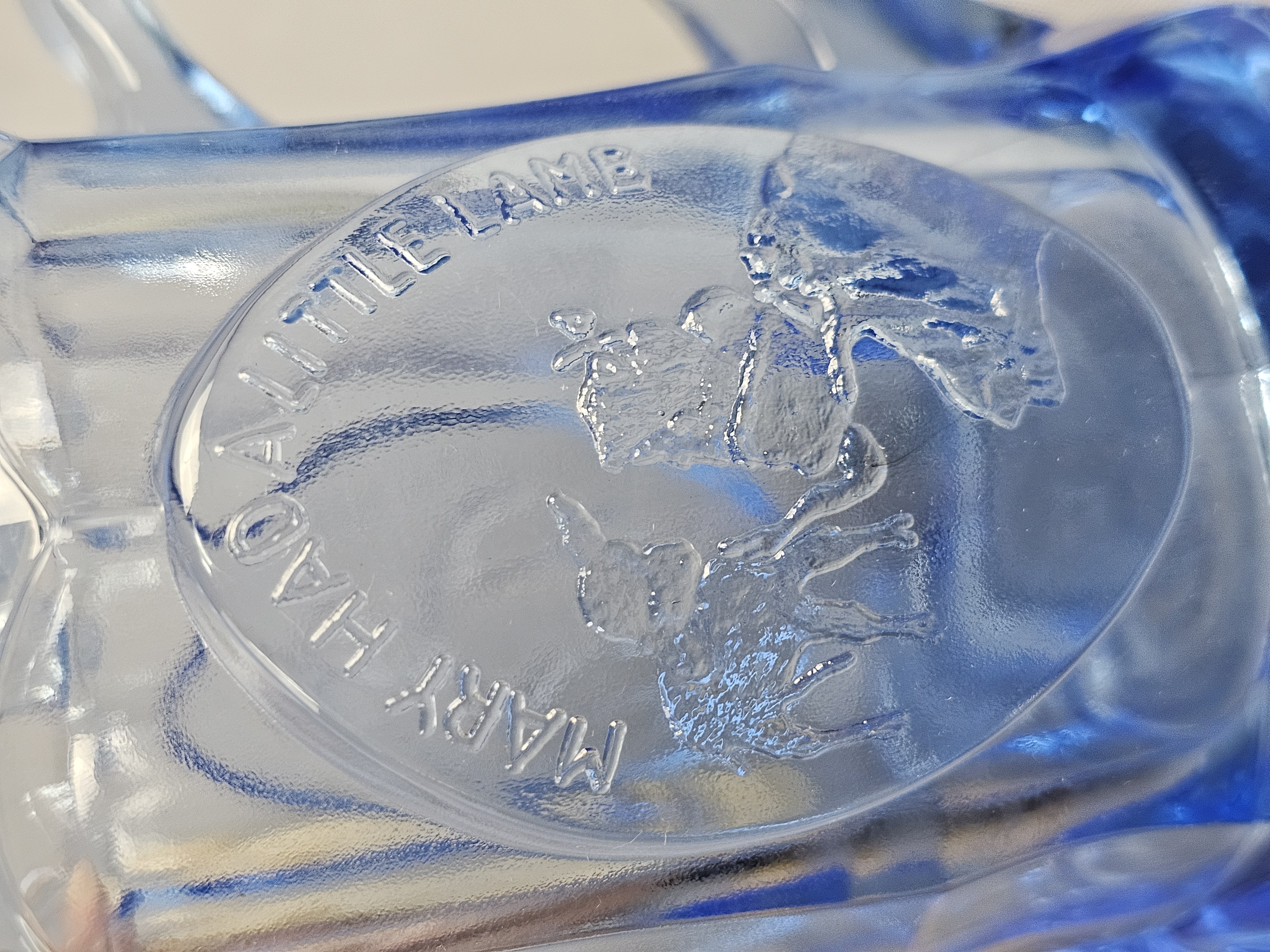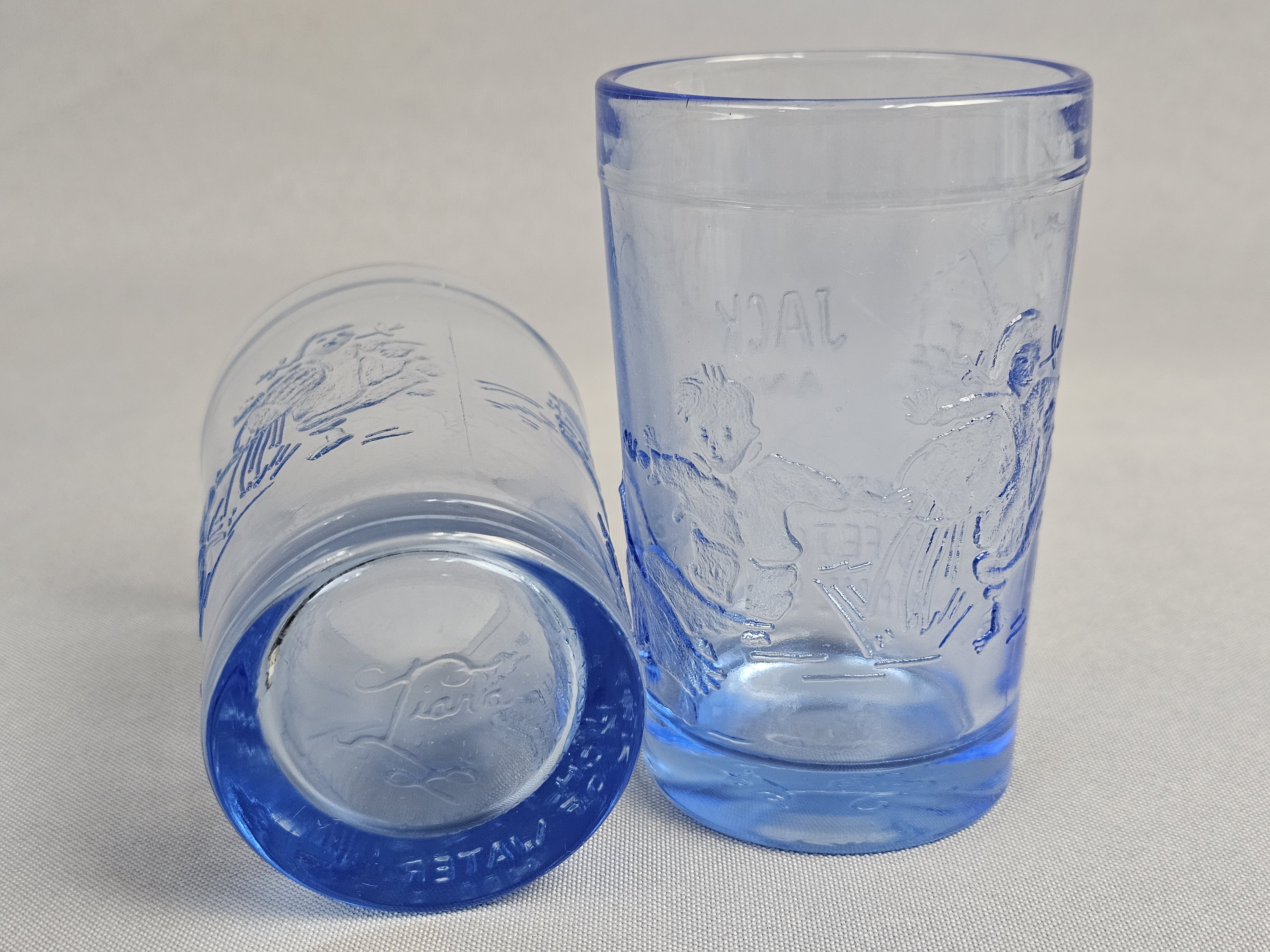 This collection of pressed glass children’s dinnerware is produced in the Nursery Rhyme pattern by Tiara Exclusives. The assortment includes translucent pink and blue pieces featuring embossed characters and text from classic nursery rhymes. The lot includes an original branded cardboard box. Pink Plates: 8 inches in diameter Blue Pitcher: 5 inches in height Blue Tumblers: 4 inches in height The blue pitcher and tumblers are in good condition with no visible chips or cracks. Two pink plates appear in good condition, while one pink plate has a chip located along an interior ridge. The original cardboard box shows shelf wear and notations.