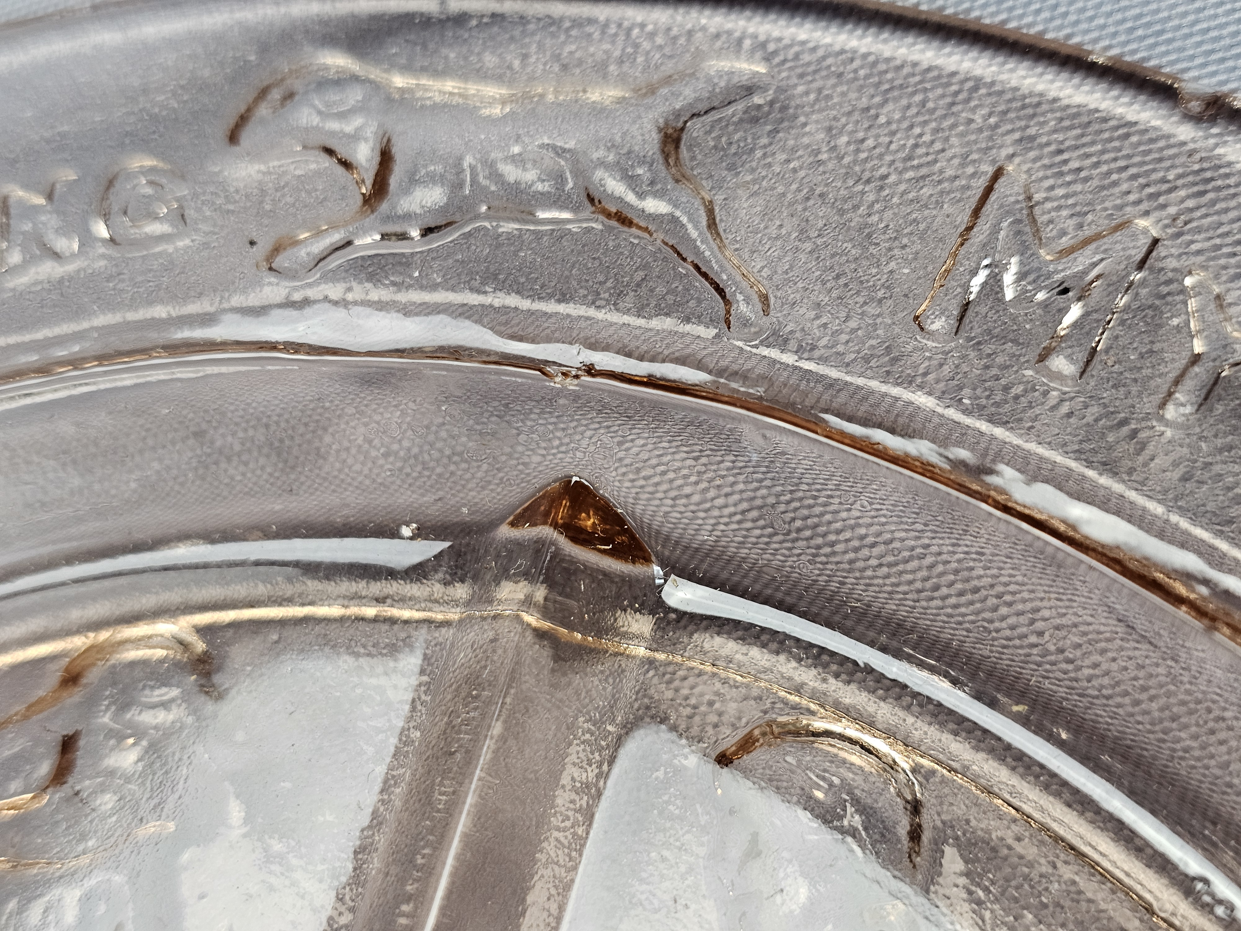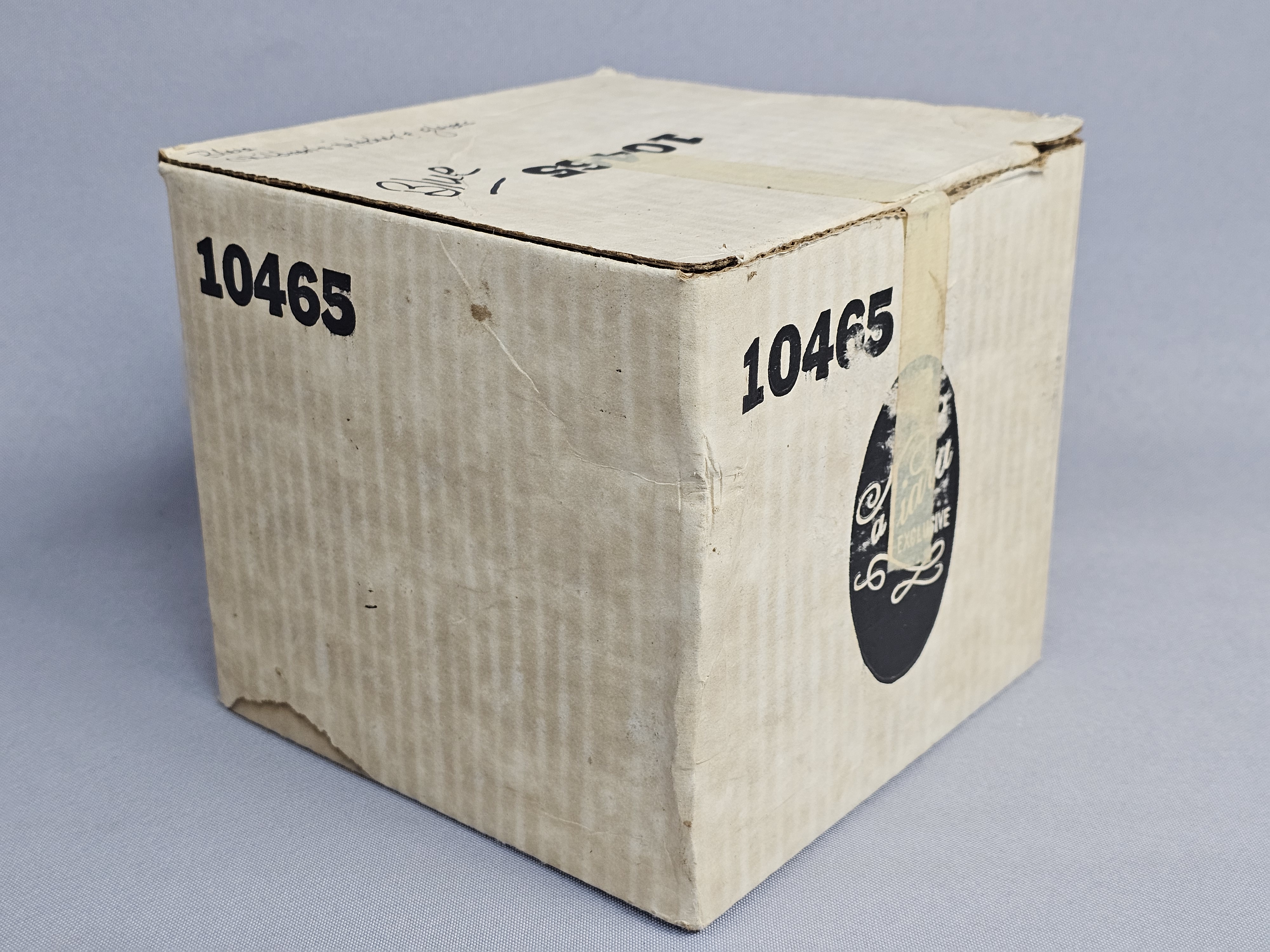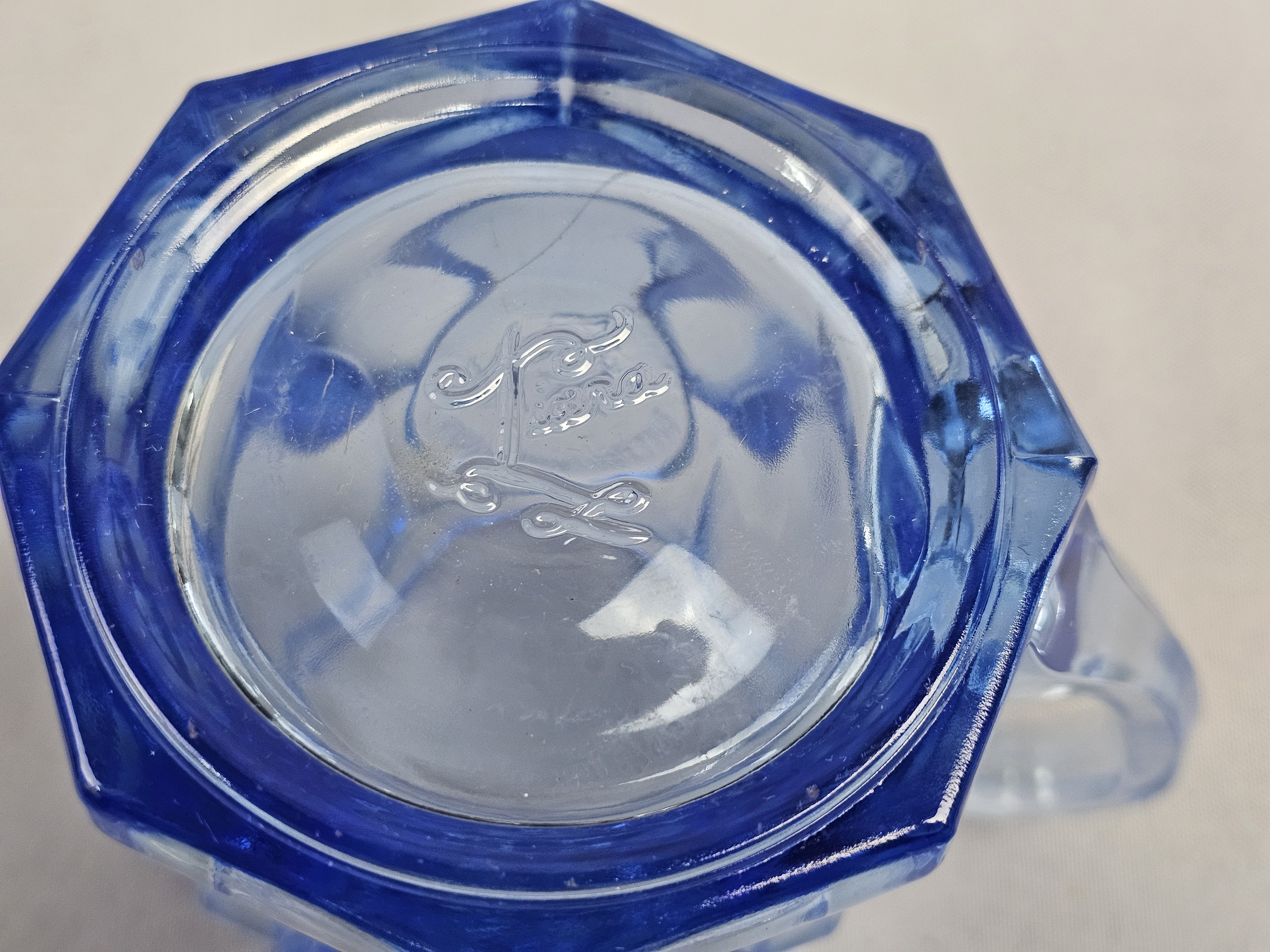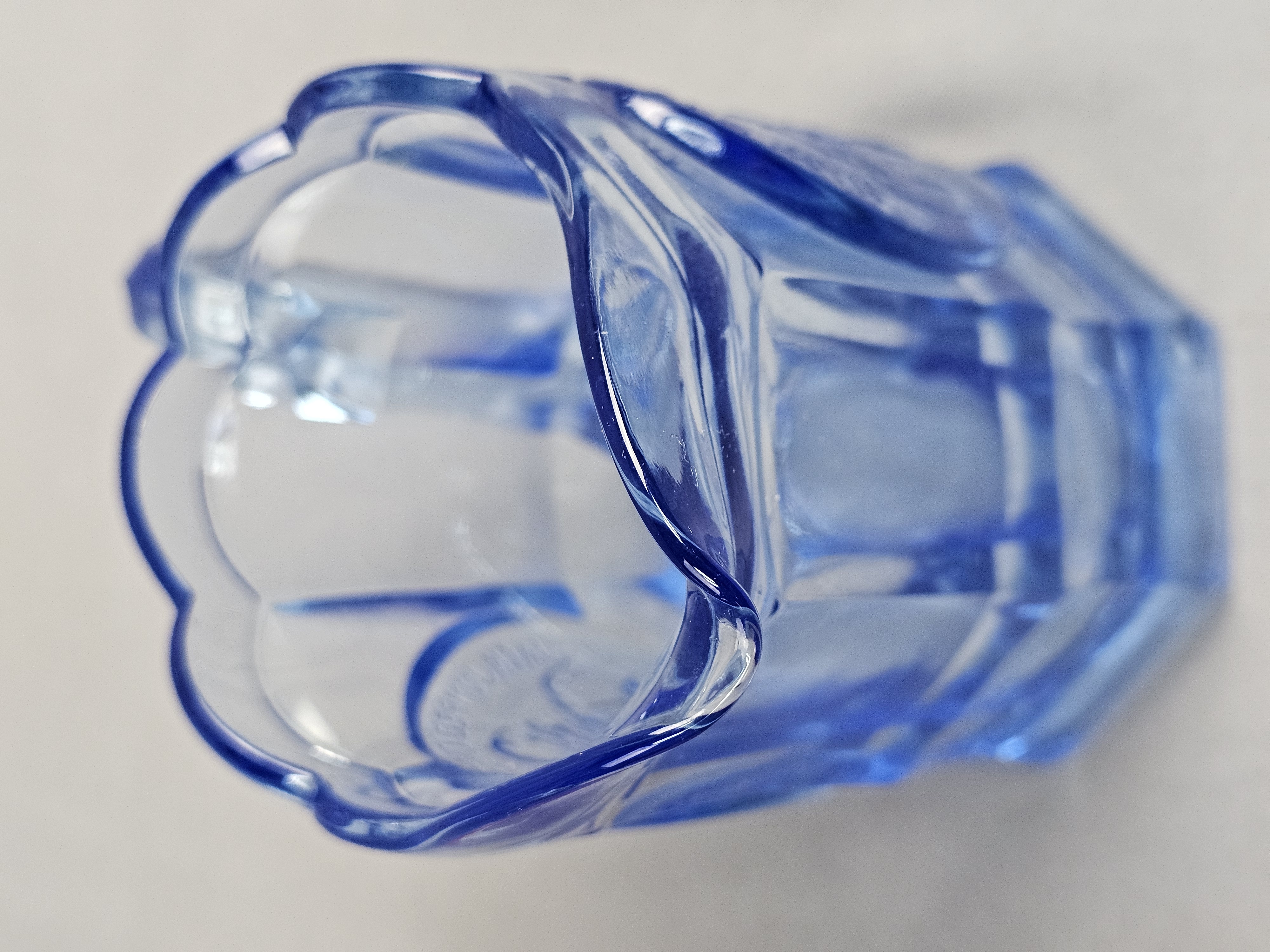 This collection of pressed glass children’s dinnerware is produced in the Nursery Rhyme pattern by Tiara Exclusives. The assortment includes translucent pink and blue pieces featuring embossed characters and text from classic nursery rhymes. The lot includes an original branded cardboard box. Pink Plates: 8 inches in diameter Blue Pitcher: 5 inches in height Blue Tumblers: 4 inches in height The blue pitcher and tumblers are in good condition with no visible chips or cracks. Two pink plates appear in good condition, while one pink plate has a chip located along an interior ridge. The original cardboard box shows shelf wear and notations.