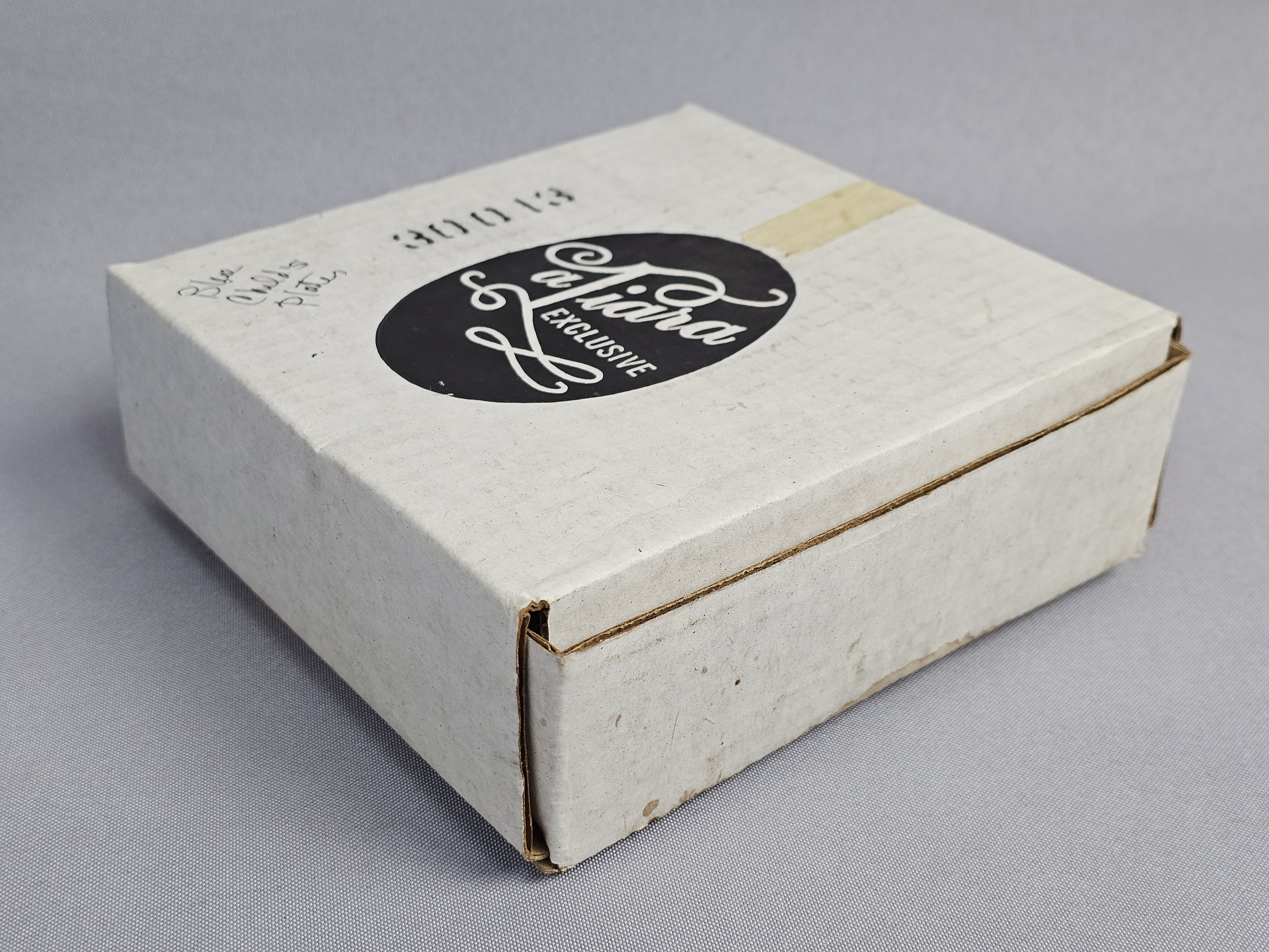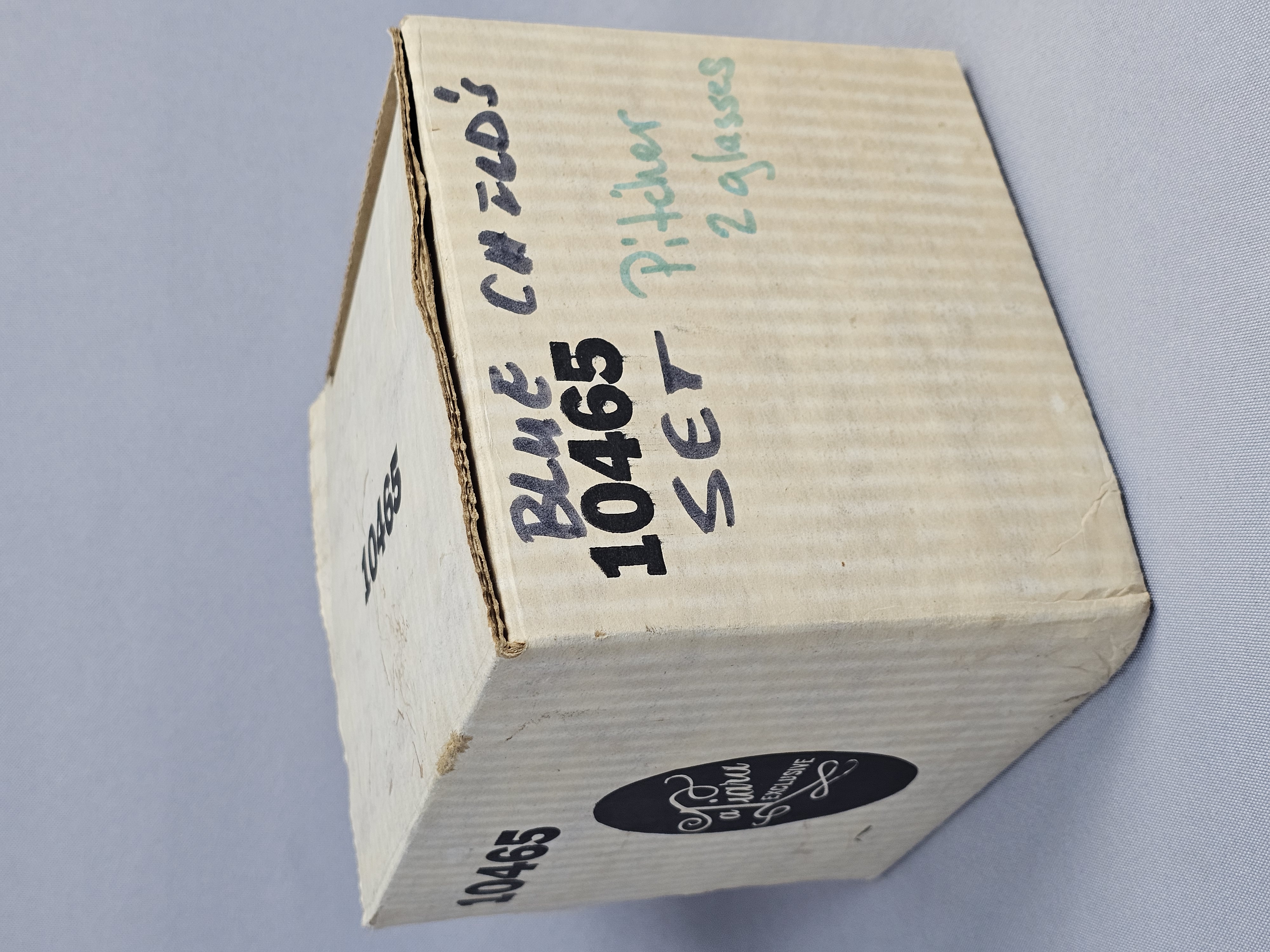 The collection comprises a small pitcher, two tumblers, and four small plates. Several pieces retain the original gold oval foil stickers reading a Tiara EXCLUSIVE. The set is accompanied by two original cardboard boxes featuring the Tiara logo and handwritten notations. Plates: 6 inches in diameter Pitcher: 5 inches tall Tumblers: 4 inches tall The set is in excellent vintage condition with no observed chips, cracks, or significant wear to the glass. The original cardboard boxes show age-related wear, light staining, and handwritten notations.